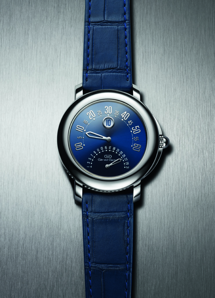 Les heures sautantes s’affichent dans un guichet à 12 heures alors que les minutes occupent un arc de cercle dans la moitié supérieure du cadran laqué bleu :