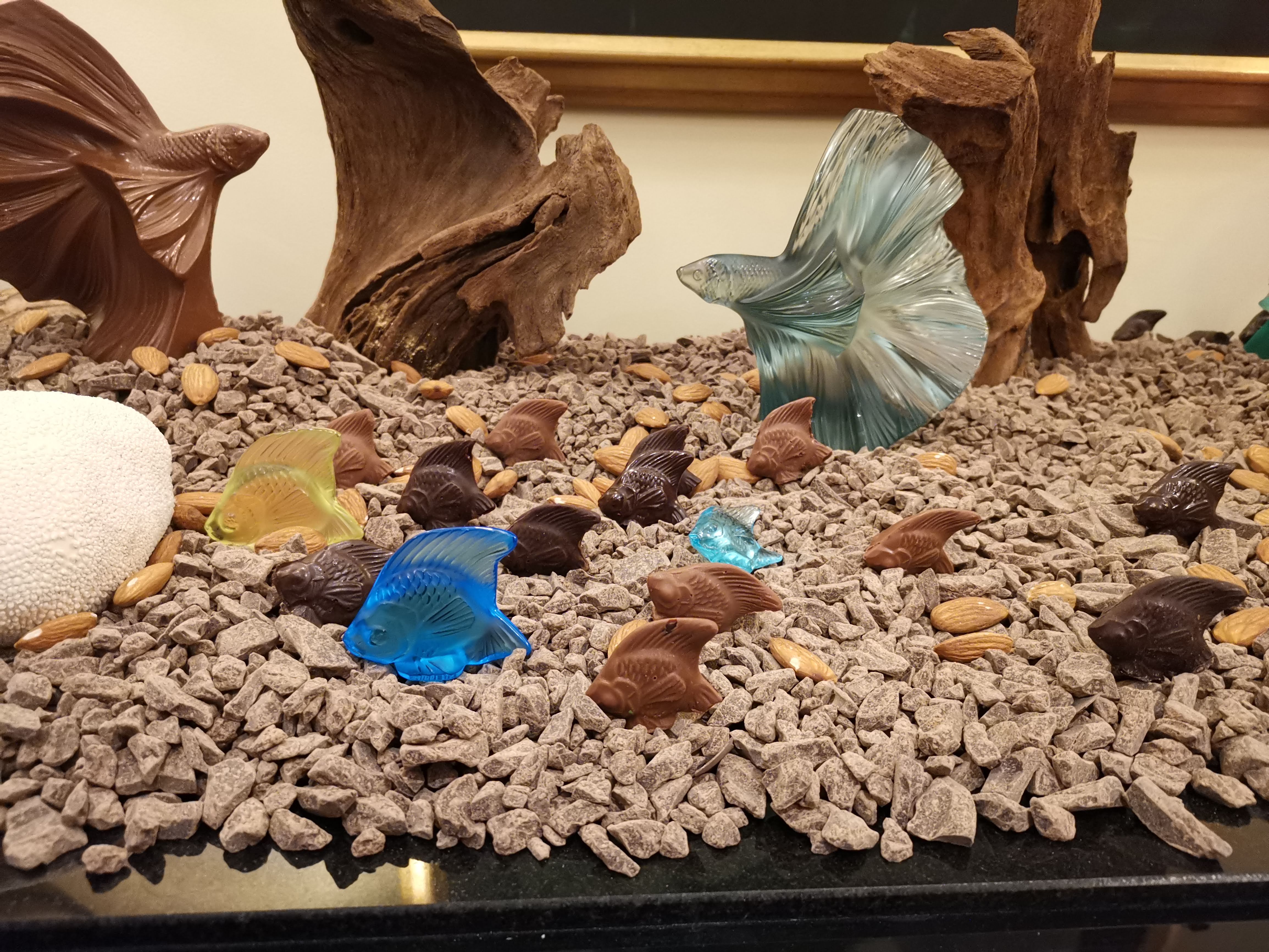 Le résultat est un poisson tout en chocolat au lait 43% de Madagascar ou chocolat noir 73% de Venezuela, garni d’un praliné aux amandes.