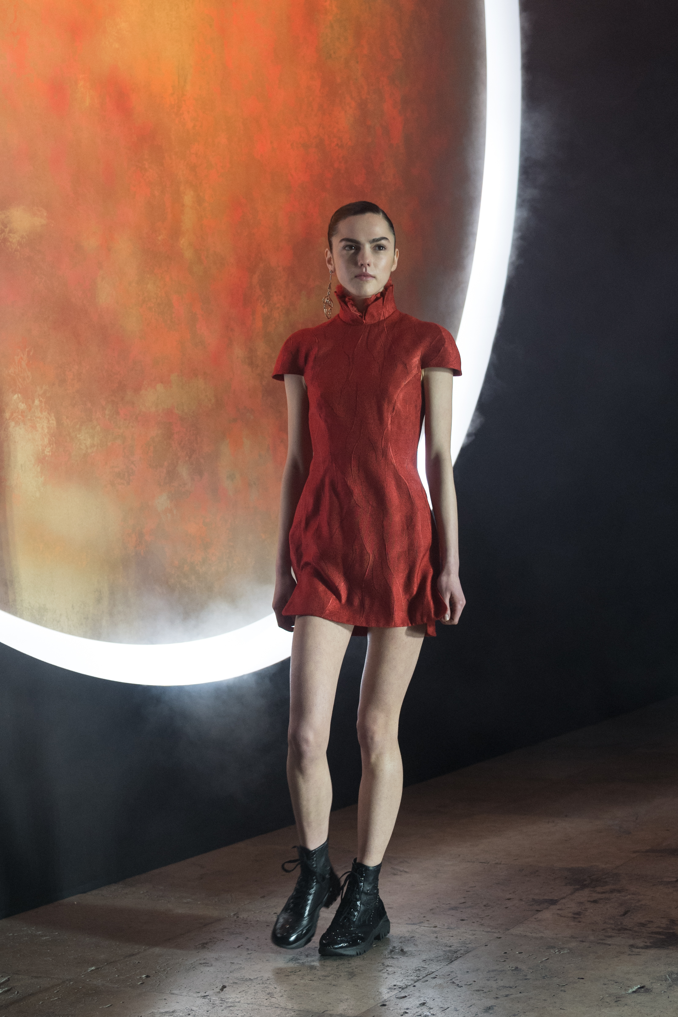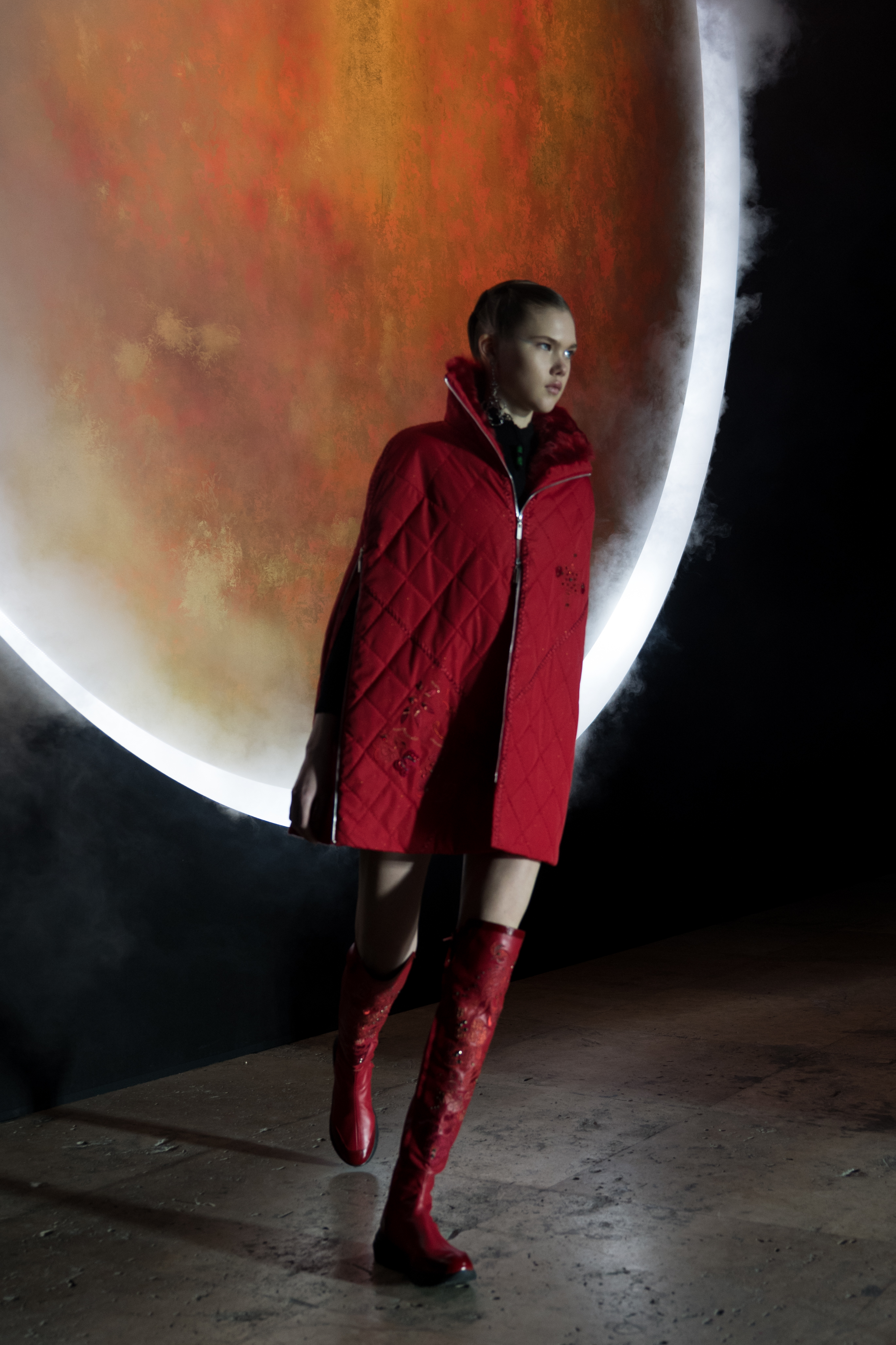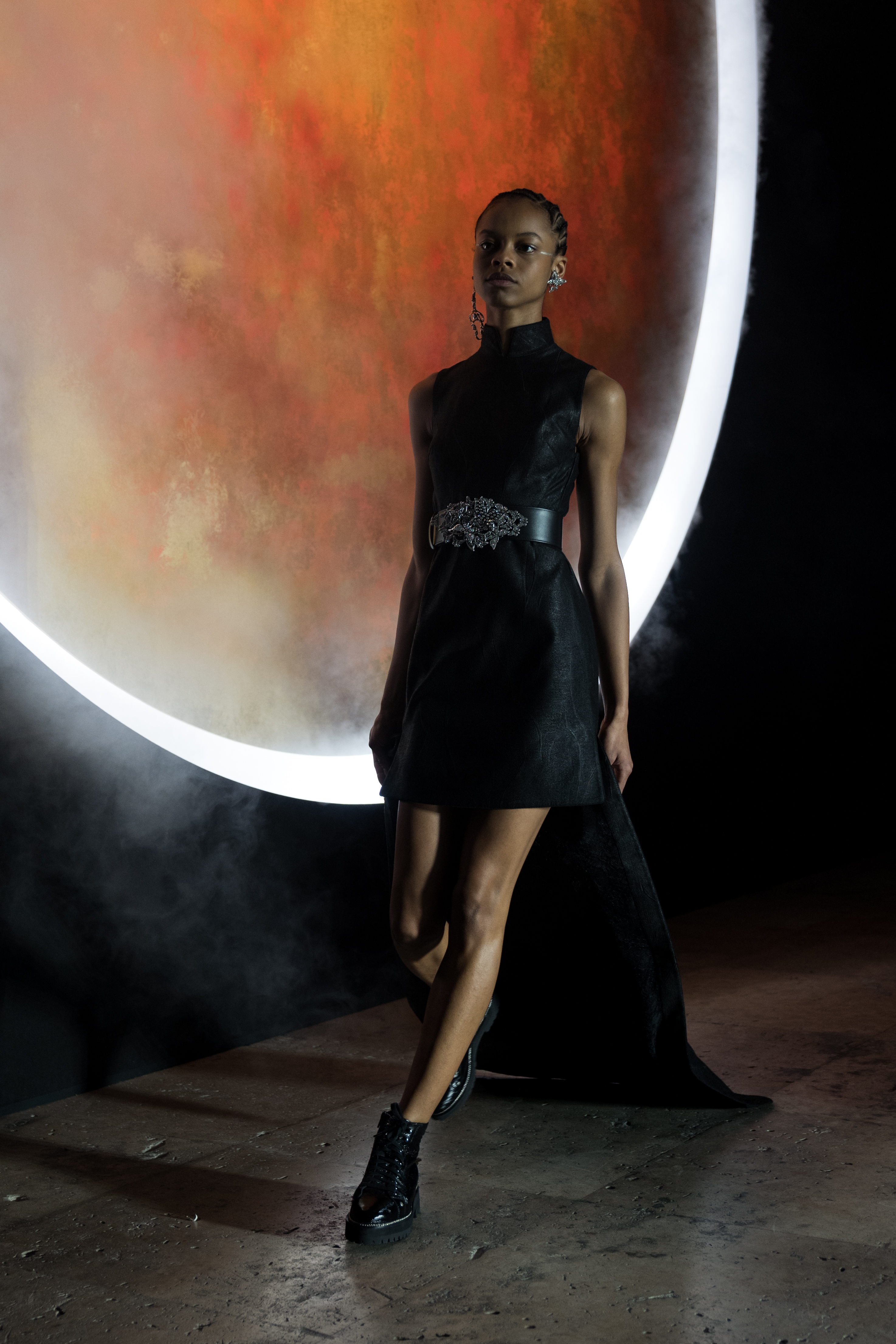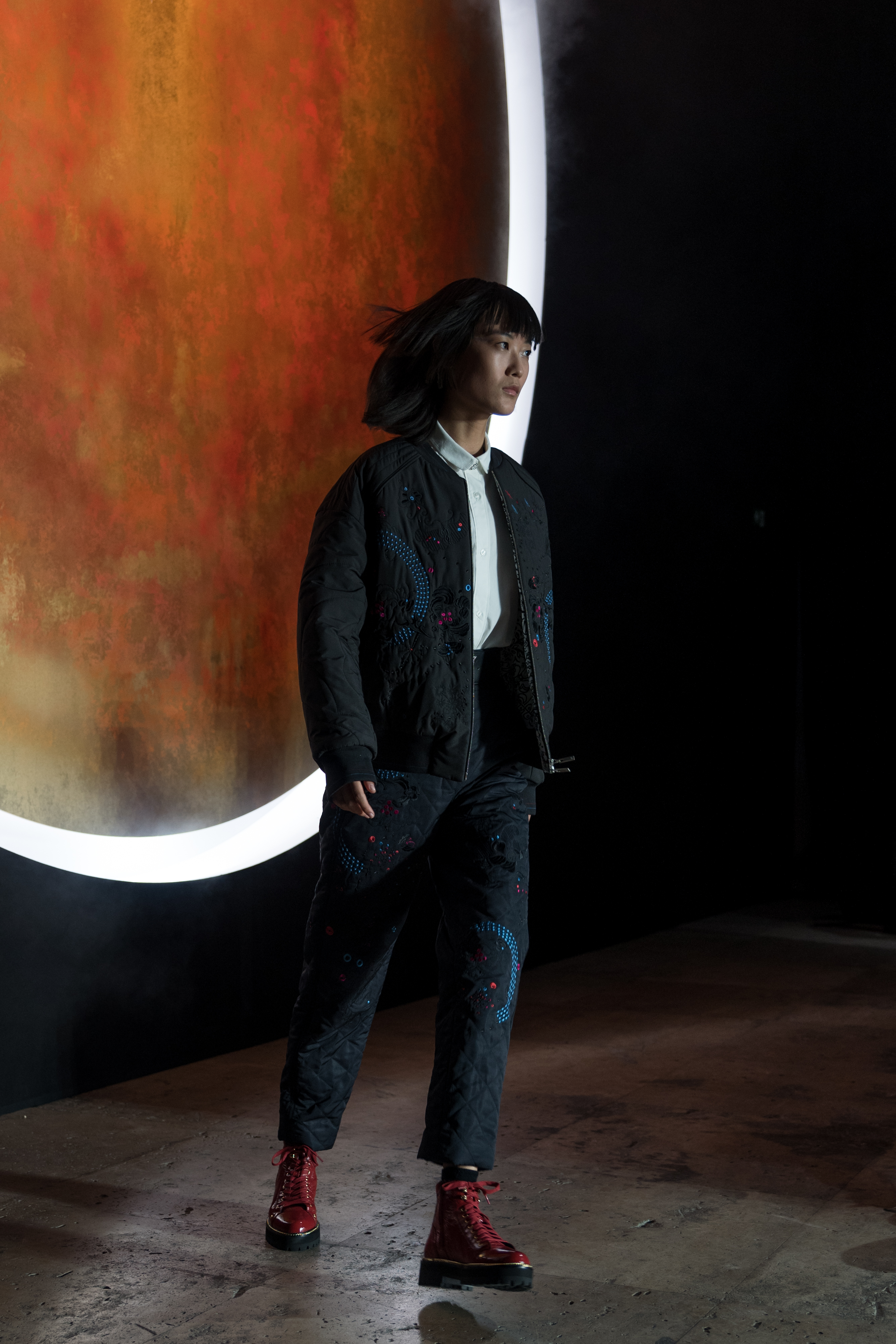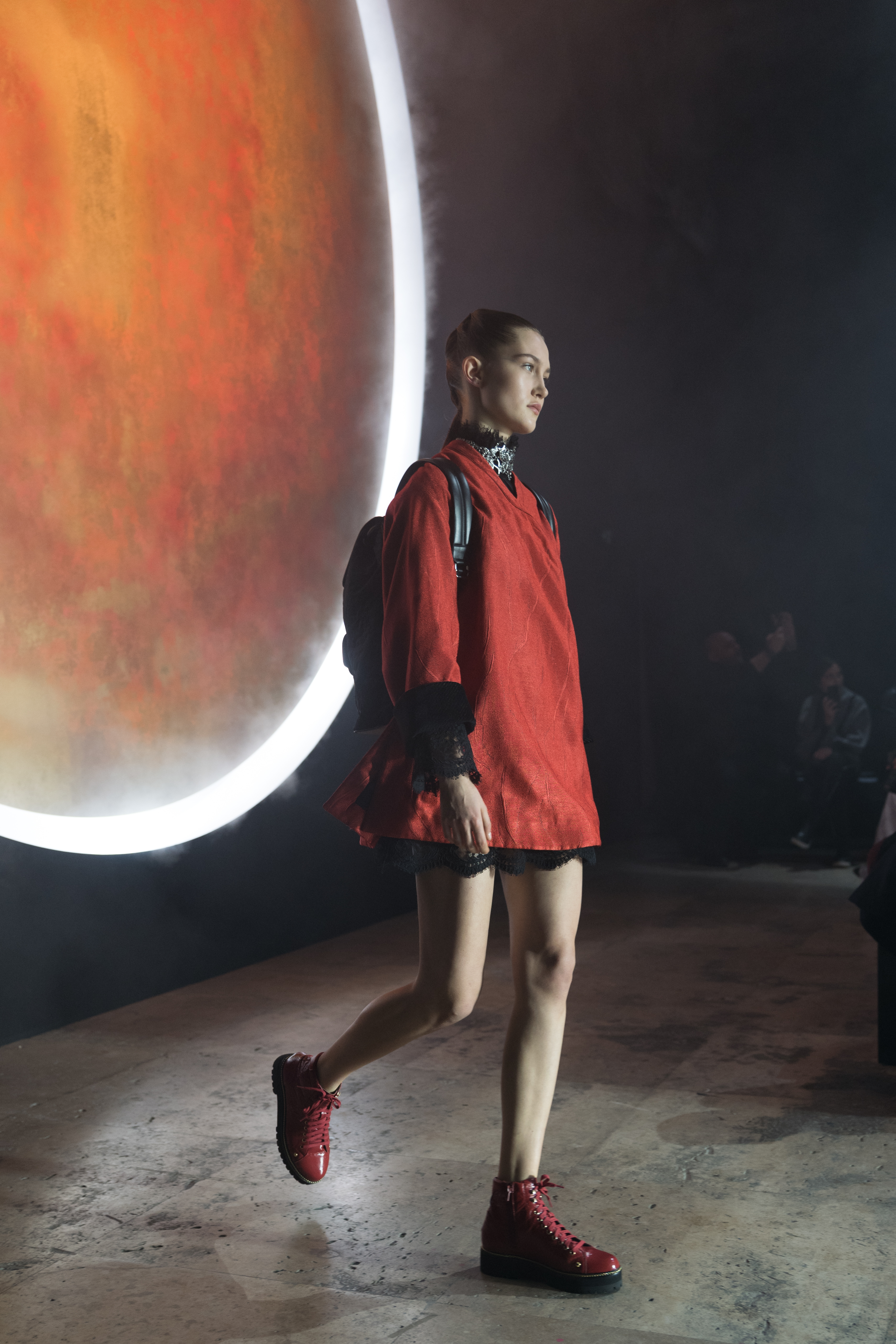 La Mythologie s’apprivoise ici à la manière d’un discours, et l’attitude devient la nouvelle arme absolue du style. Le concept « deep affection » adopté par Shiatzy Chen puise son inspiration dans l’image traditionnelle du porte-bébé des femmes Hmong Miao du sud-ouest de la Chine, exquises créatrices de textile. Chaque point et chaque fil de la broderie représentent l’attache affectueuse d’une mère pour son enfant.