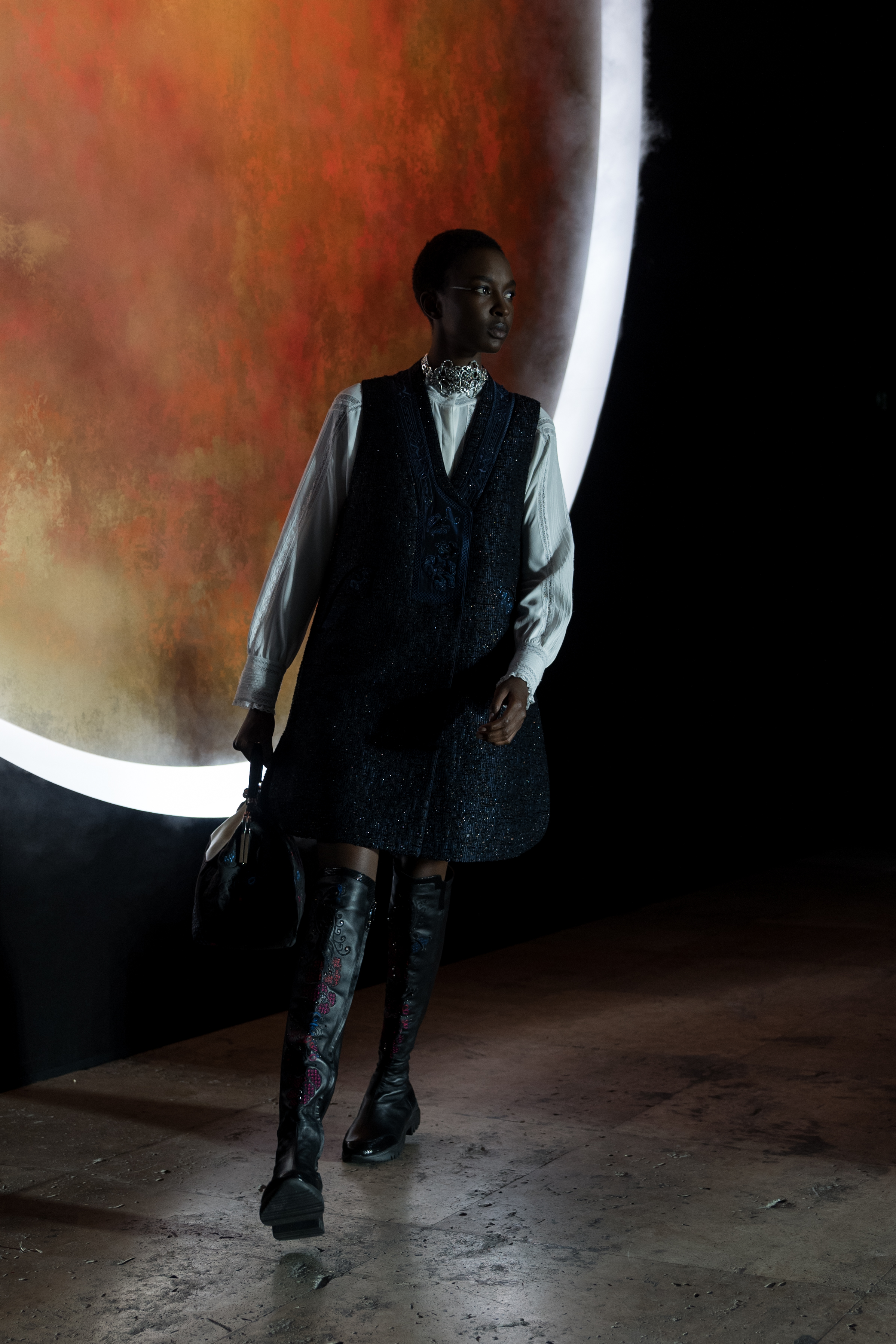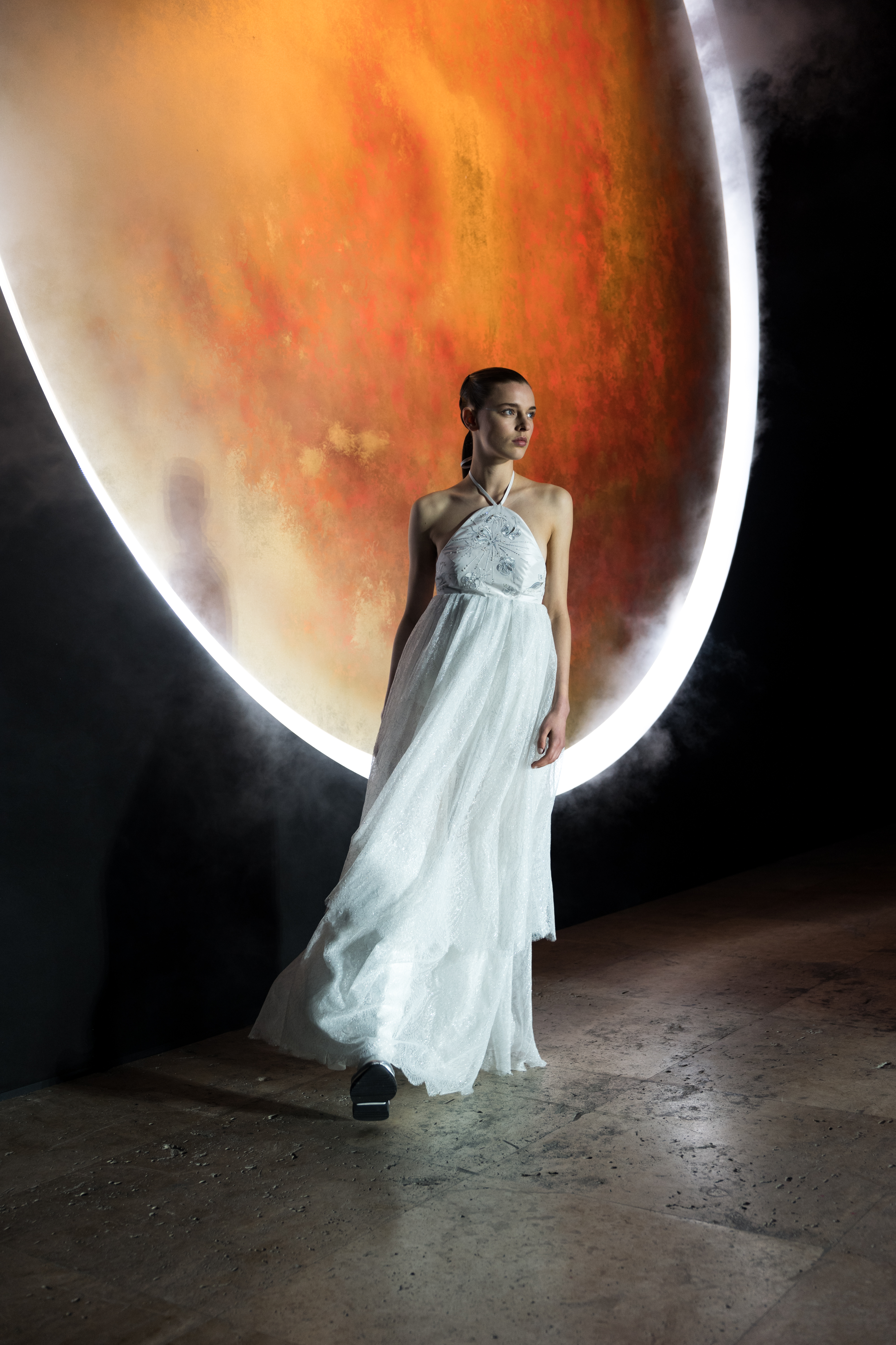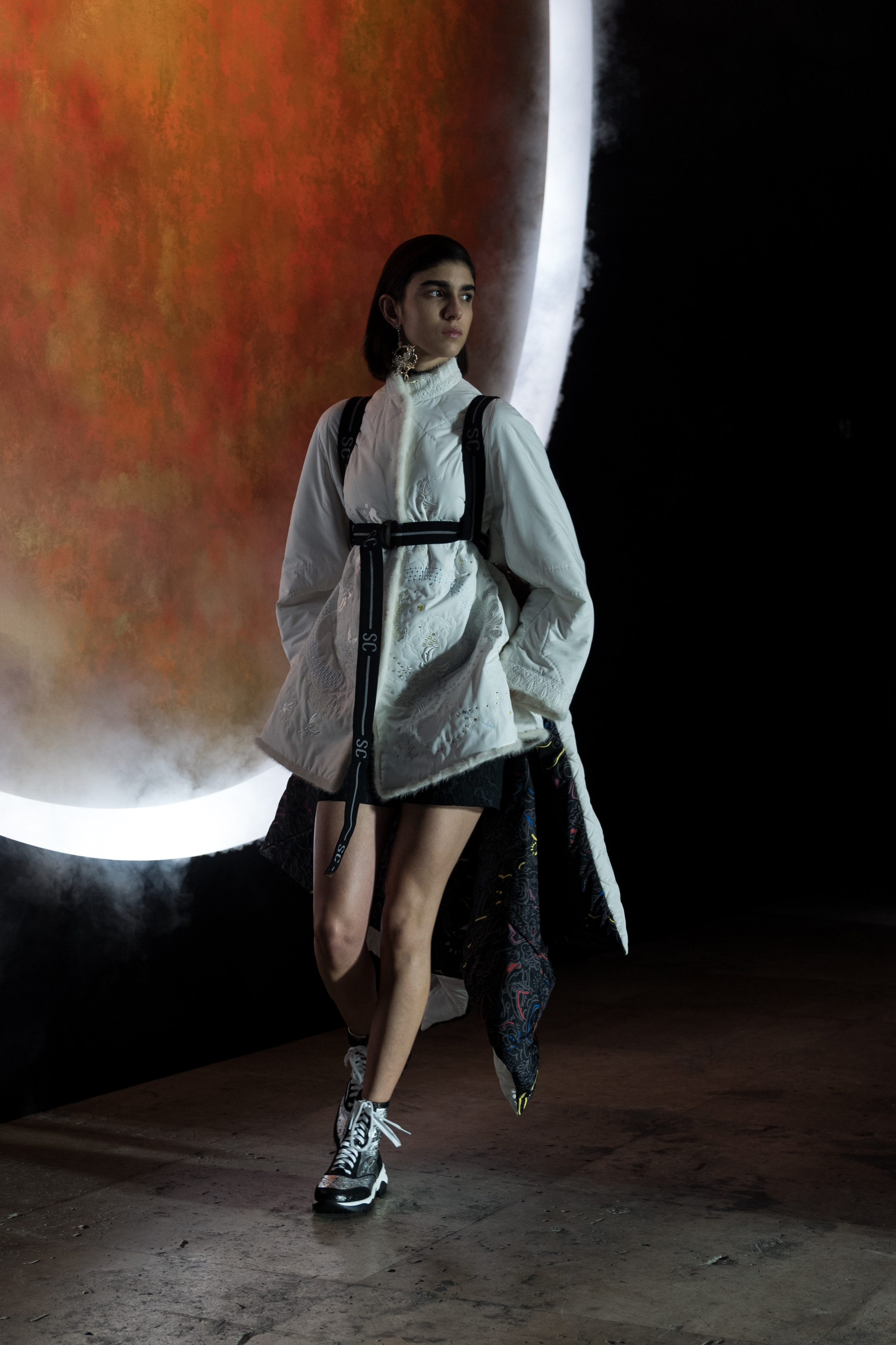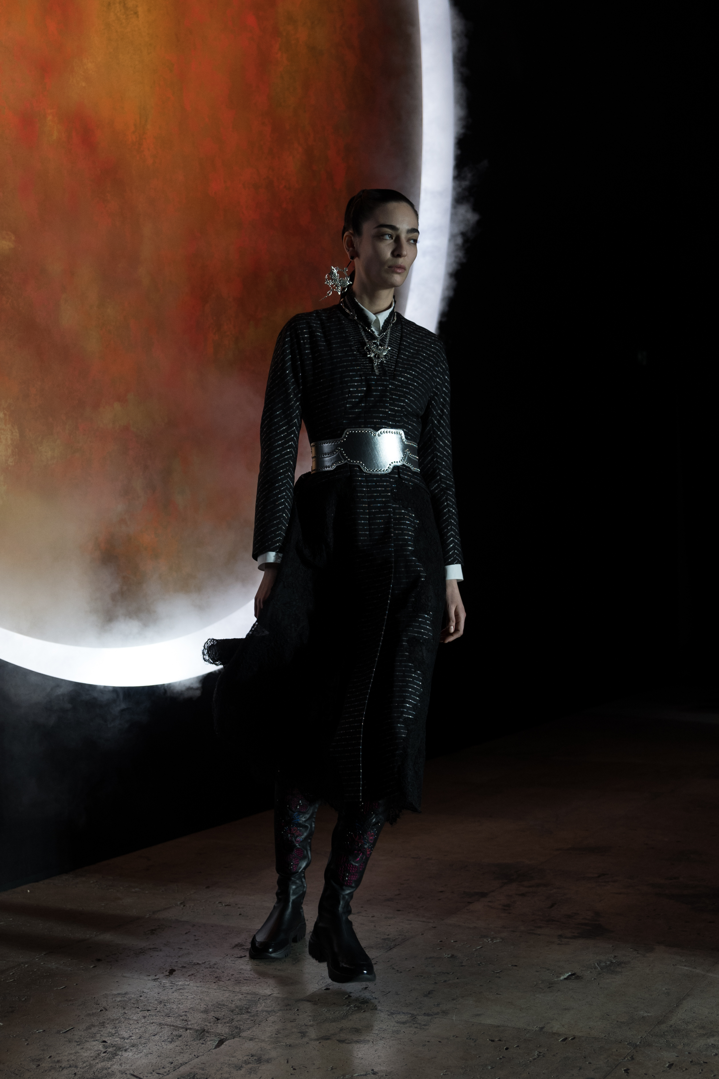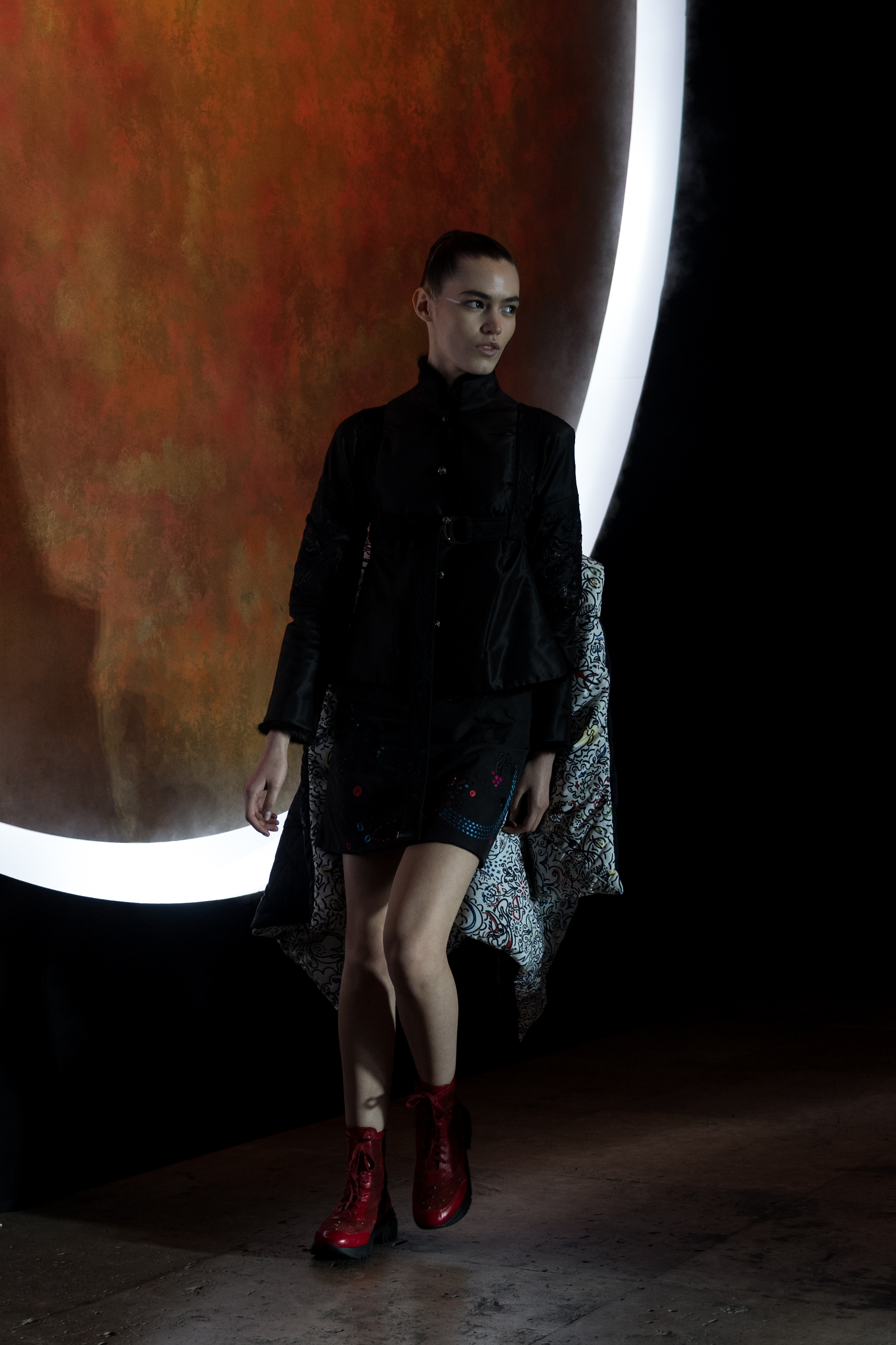 La Mythologie s’apprivoise ici à la manière d’un discours, et l’attitude devient la nouvelle arme absolue du style. Le concept « deep affection » adopté par Shiatzy Chen puise son inspiration dans l’image traditionnelle du porte-bébé des femmes Hmong Miao du sud-ouest de la Chine, exquises créatrices de textile. Chaque point et chaque fil de la broderie représentent l’attache affectueuse d’une mère pour son enfant.