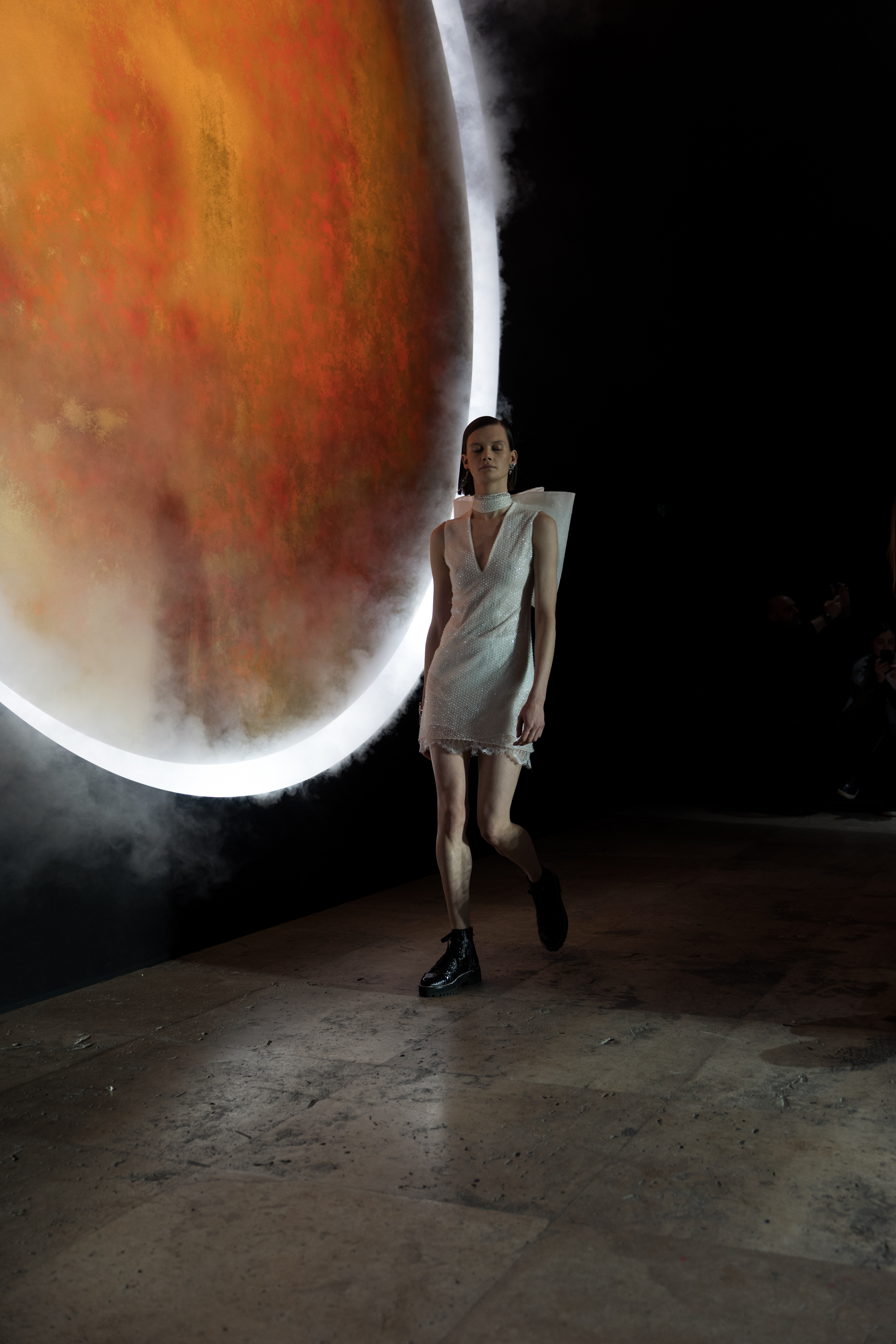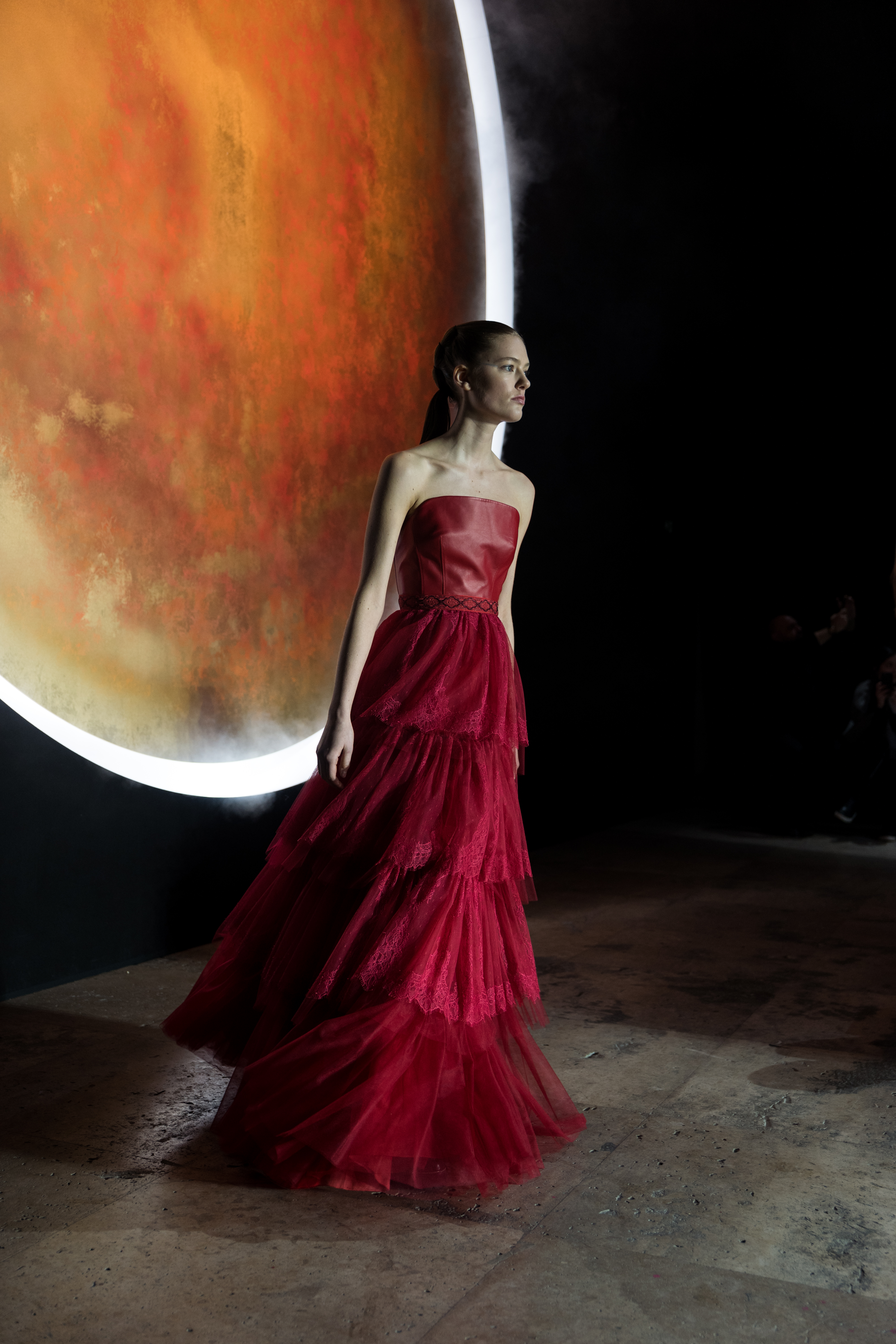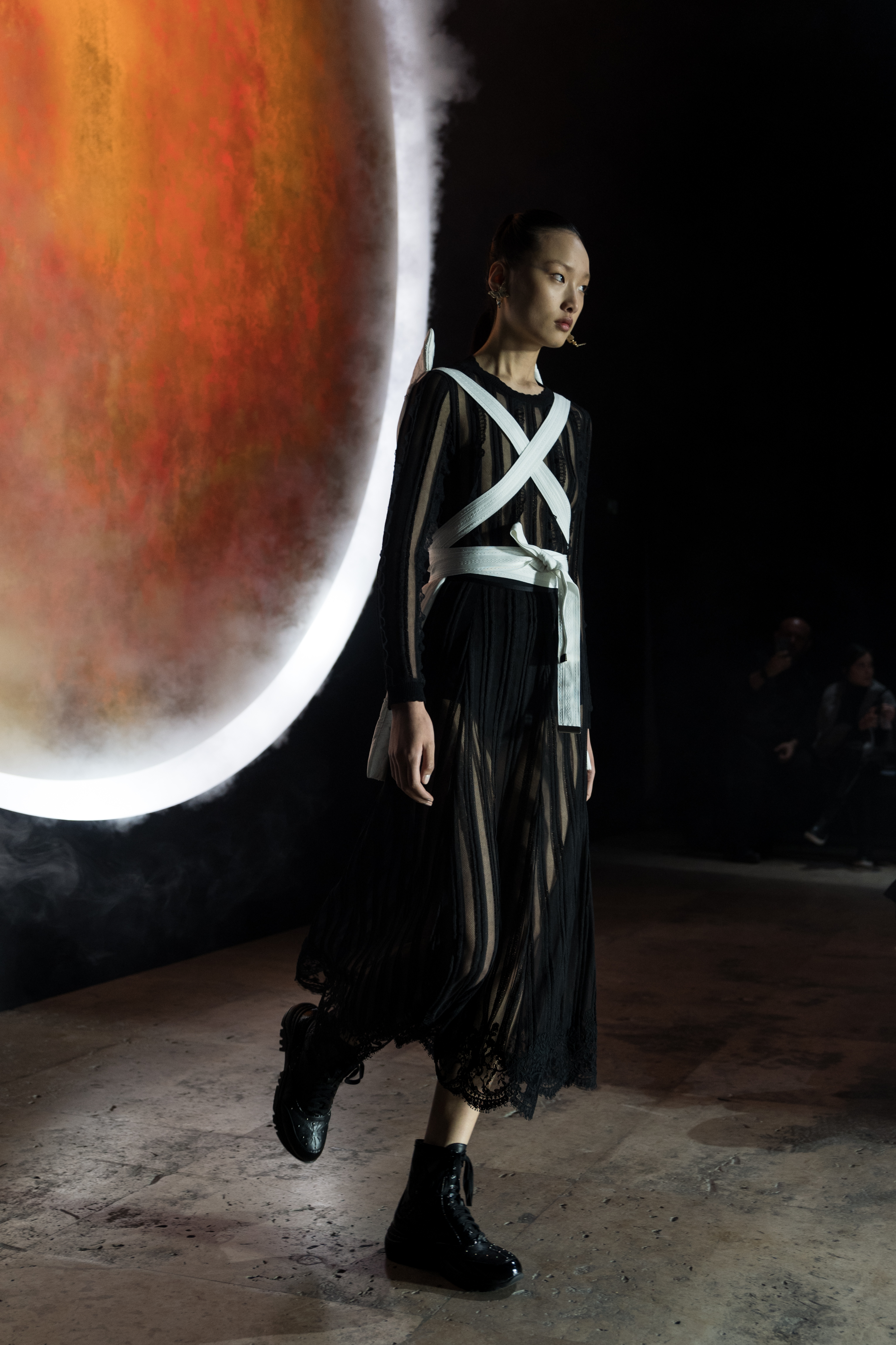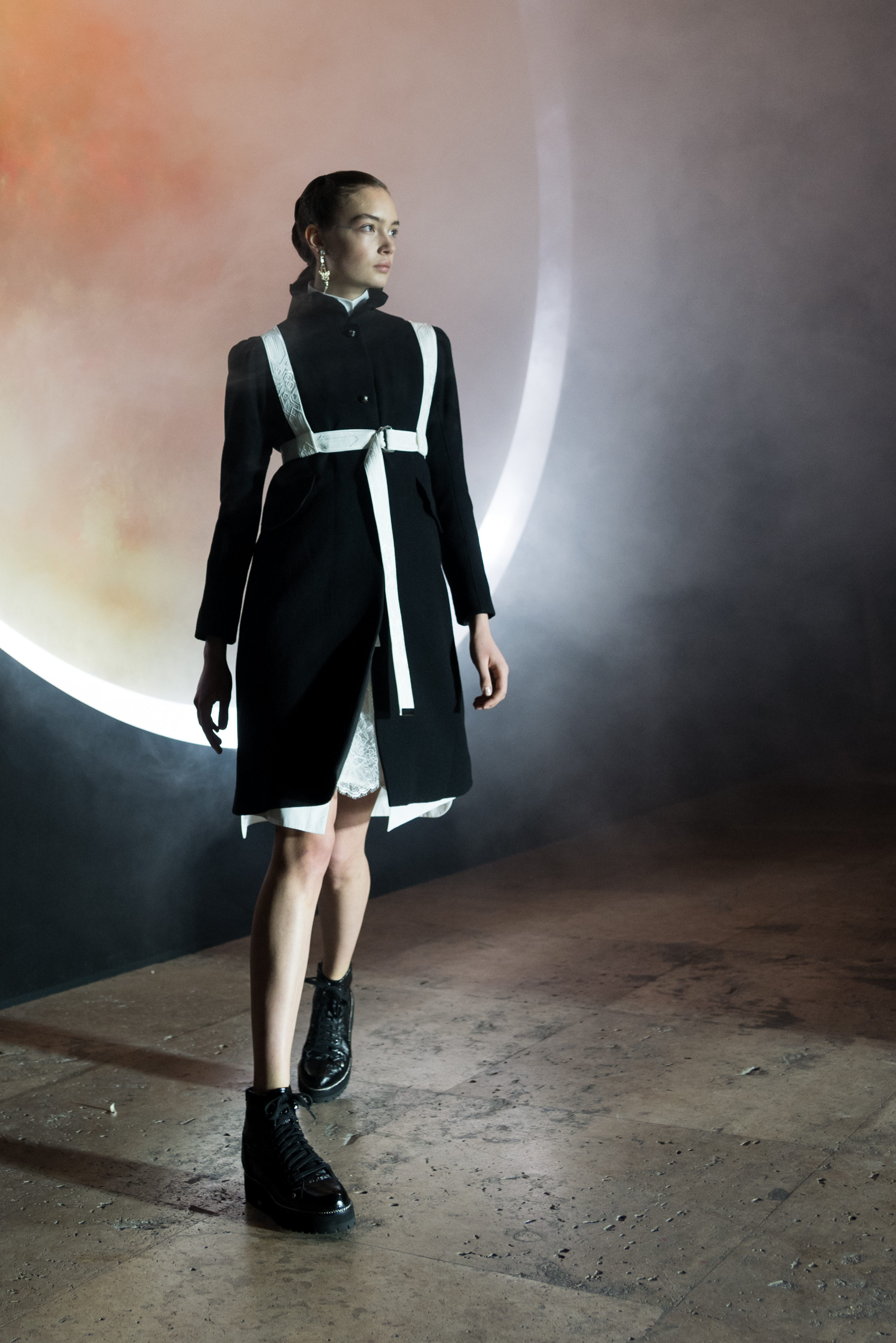 La Mythologie s’apprivoise ici à la manière d’un discours, et l’attitude devient la nouvelle arme absolue du style. Le concept « deep affection » adopté par Shiatzy Chen puise son inspiration dans l’image traditionnelle du porte-bébé des femmes Hmong Miao du sud-ouest de la Chine, exquises créatrices de textile. Chaque point et chaque fil de la broderie représentent l’attache affectueuse d’une mère pour son enfant.