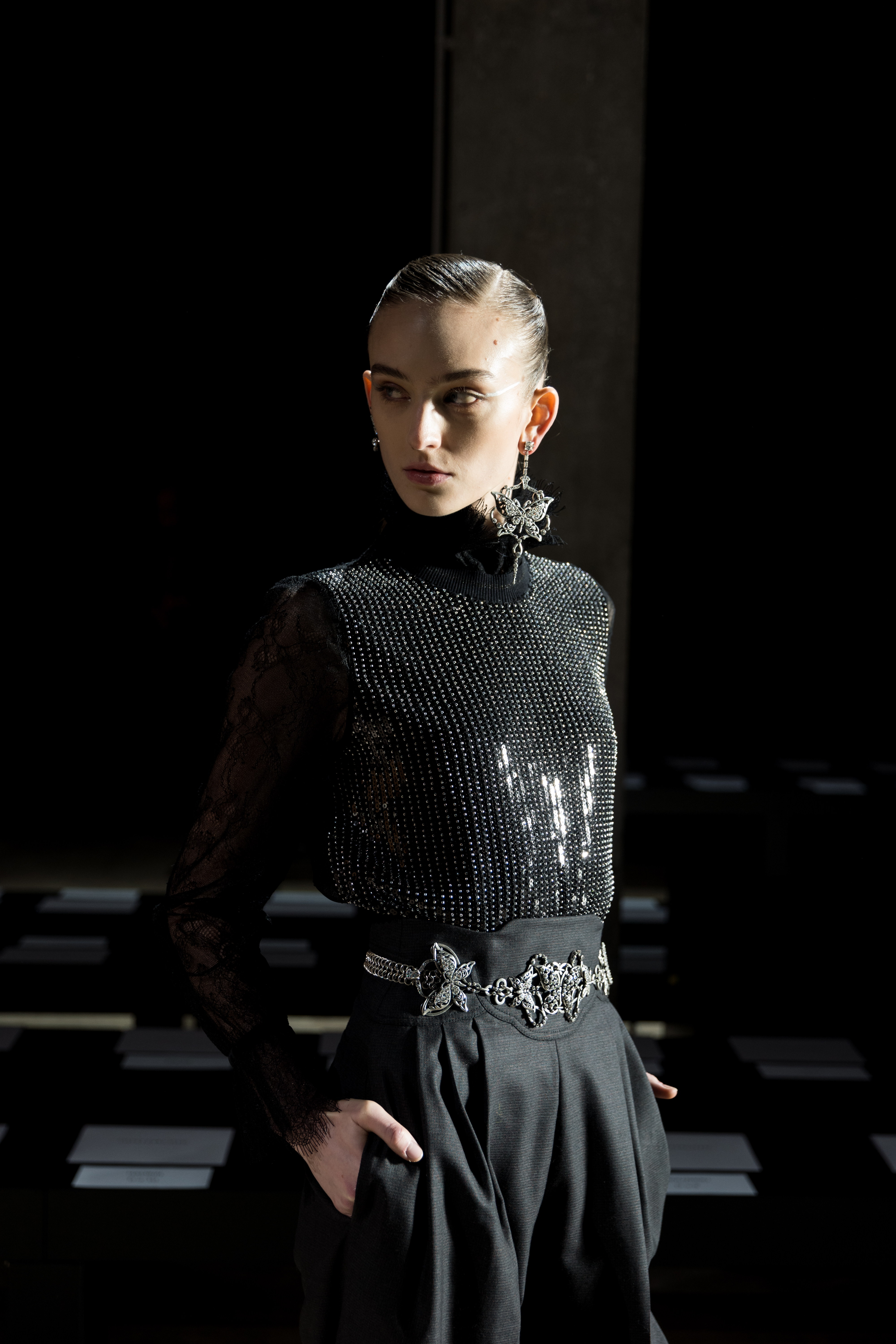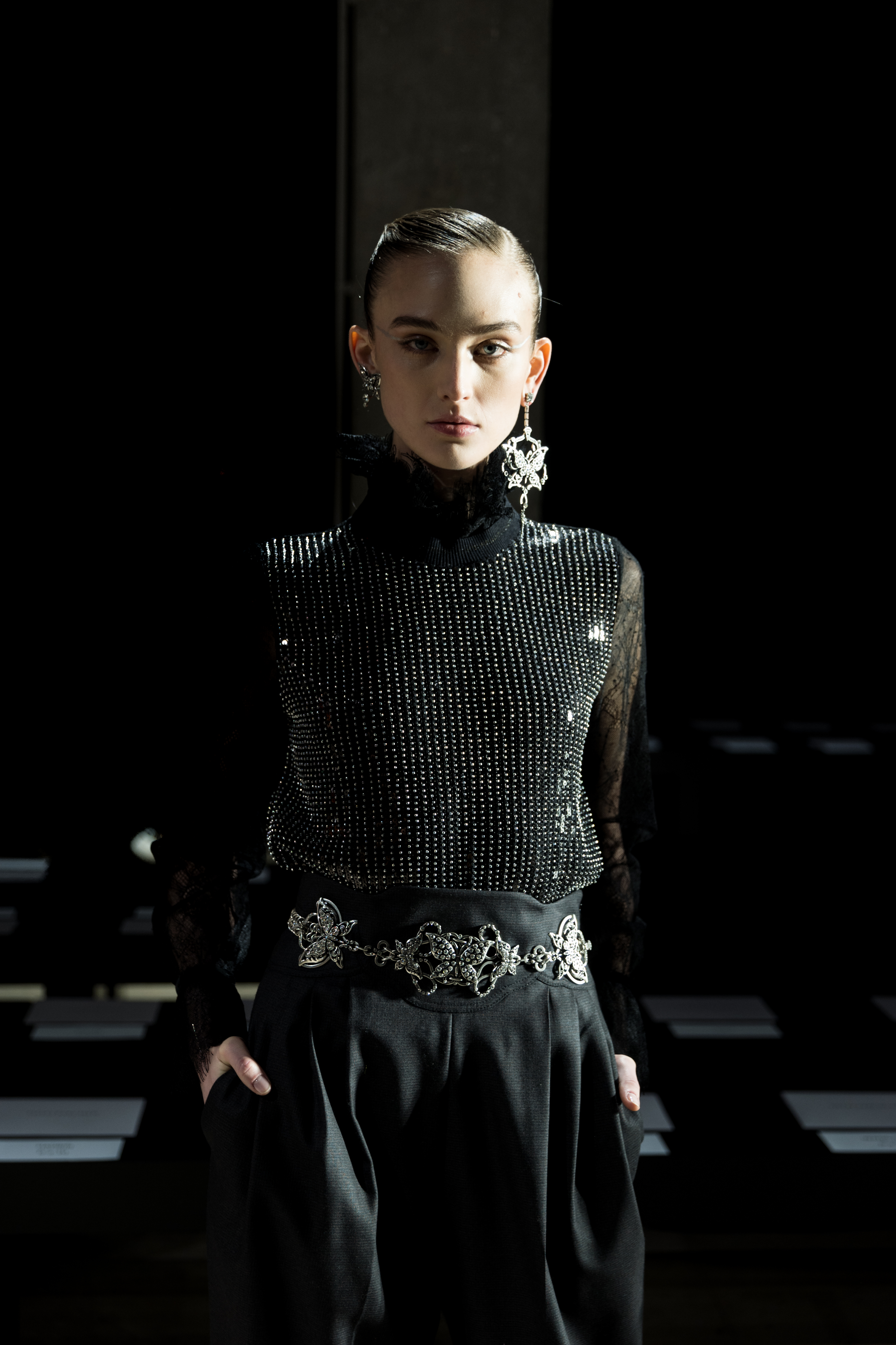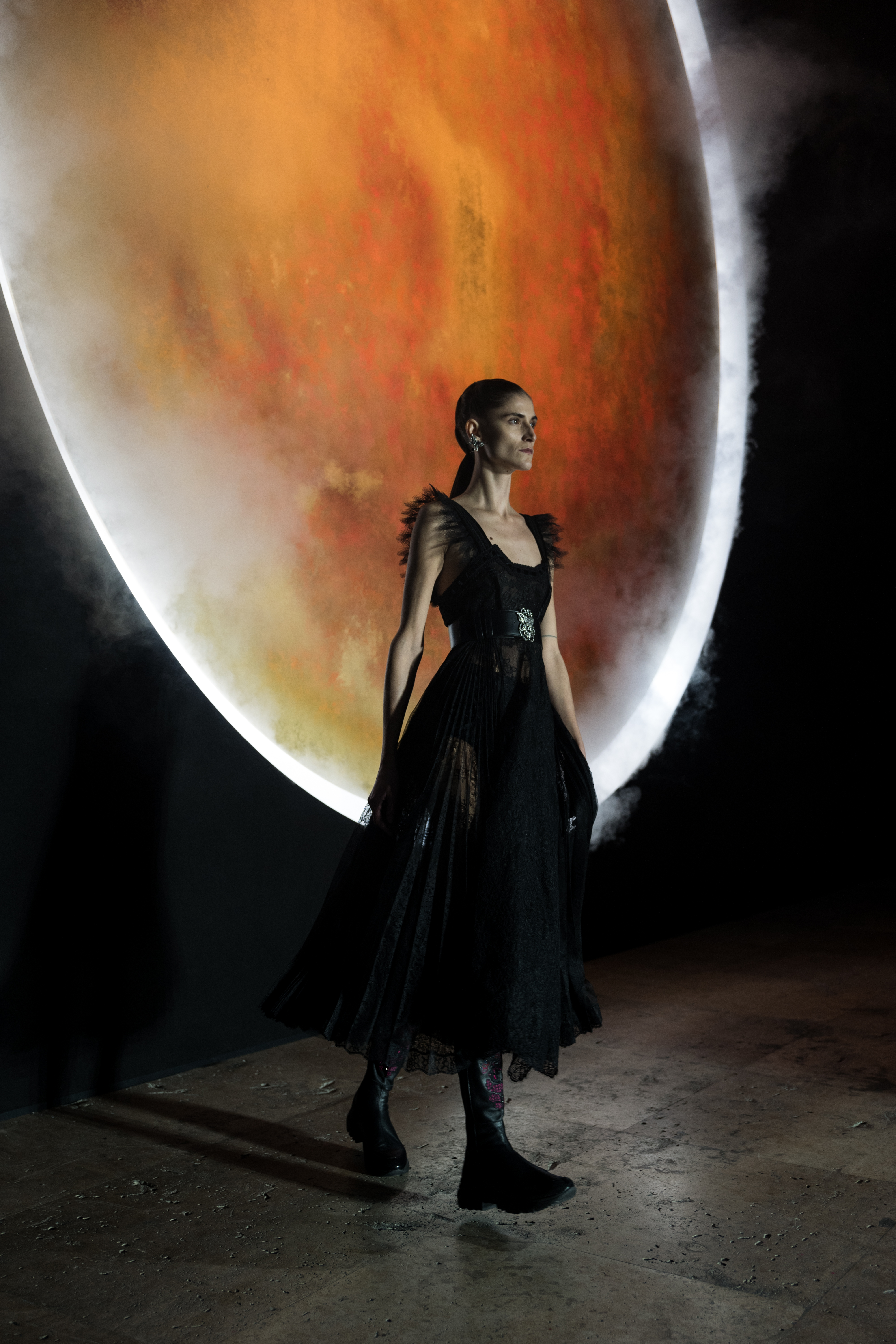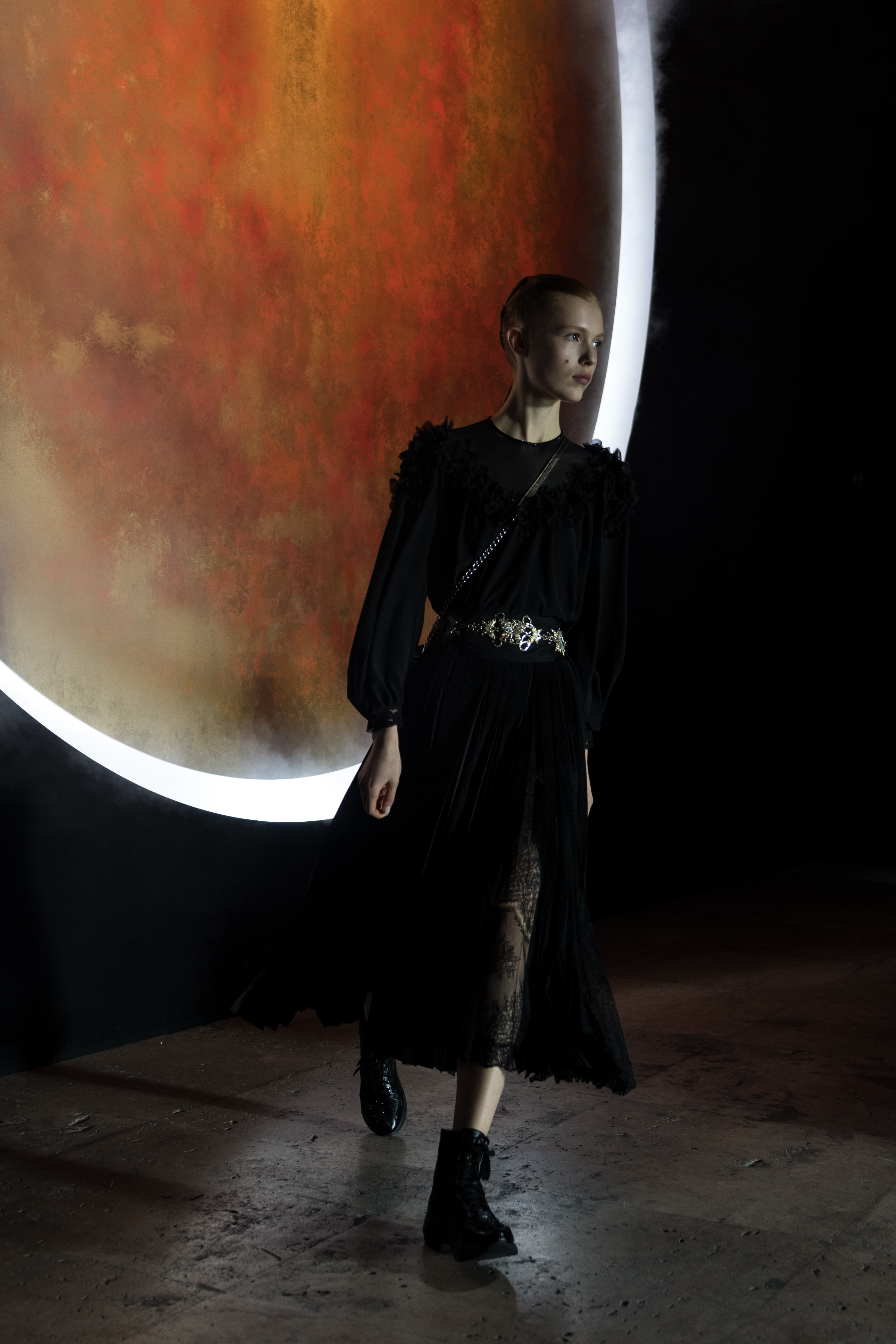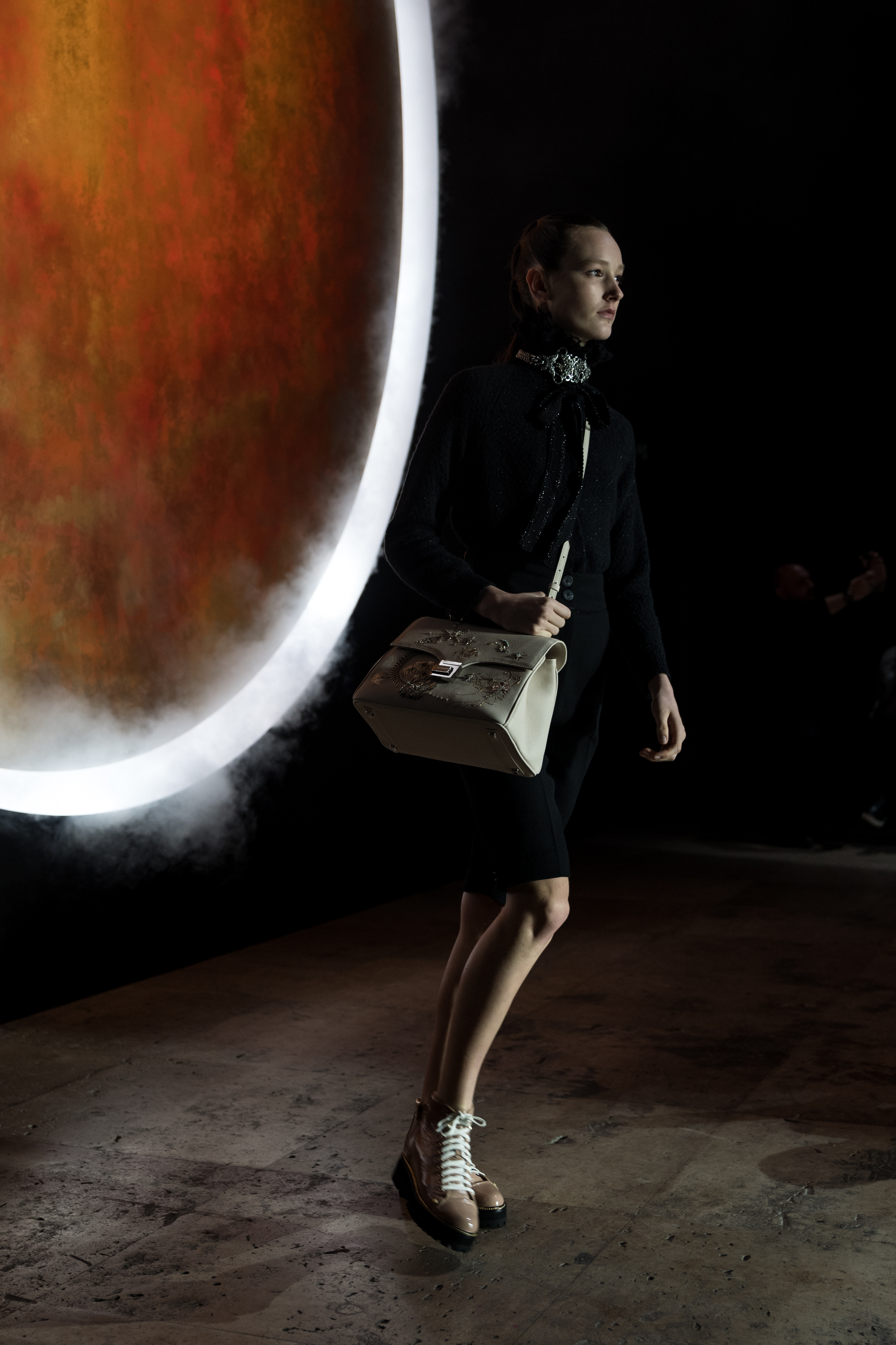 La Mythologie s’apprivoise ici à la manière d’un discours, et l’attitude devient la nouvelle arme absolue du style. Le concept « deep affection » adopté par Shiatzy Chen puise son inspiration dans l’image traditionnelle du porte-bébé des femmes Hmong Miao du sud-ouest de la Chine, exquises créatrices de textile. Chaque point et chaque fil de la broderie représentent l’attache affectueuse d’une mère pour son enfant.