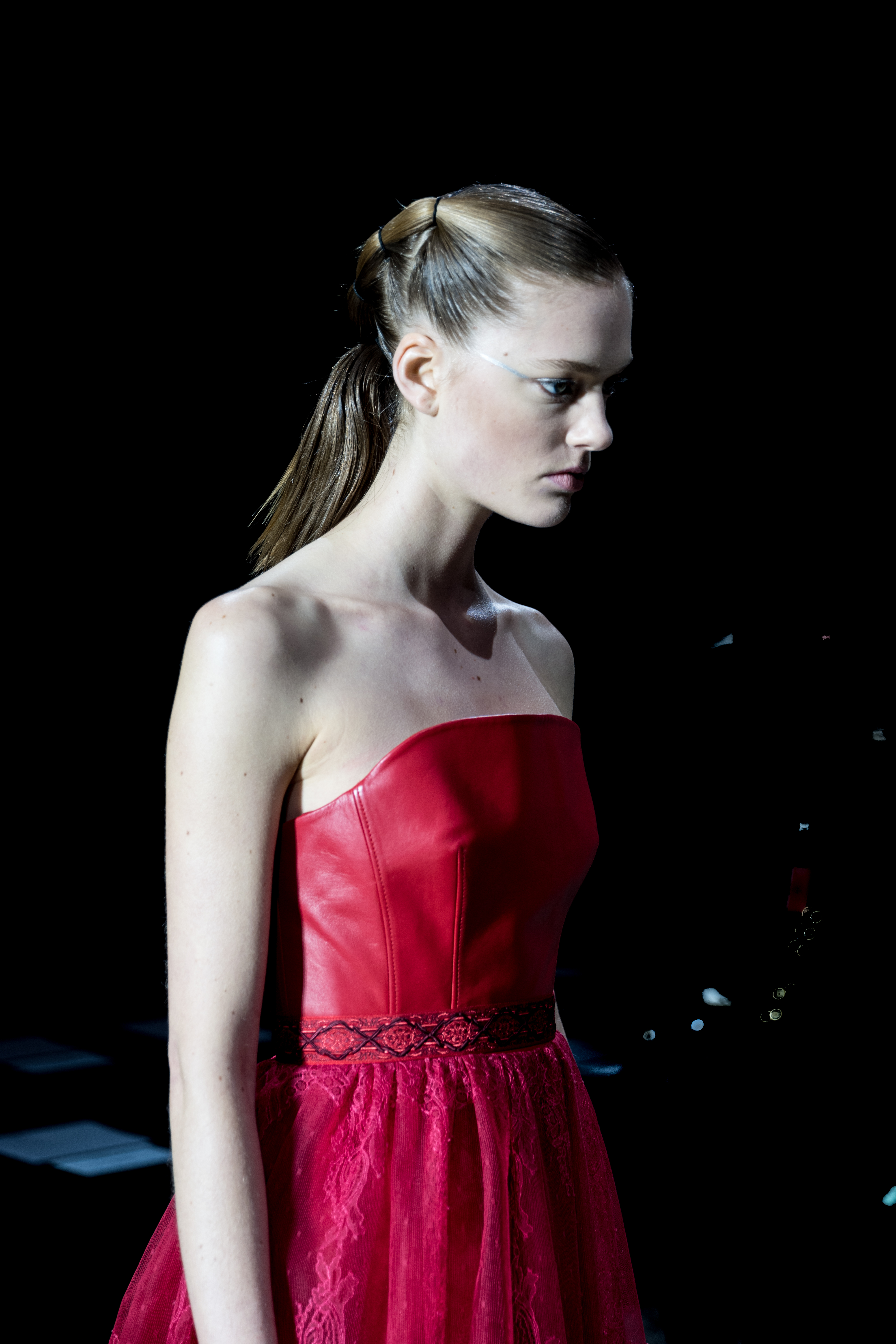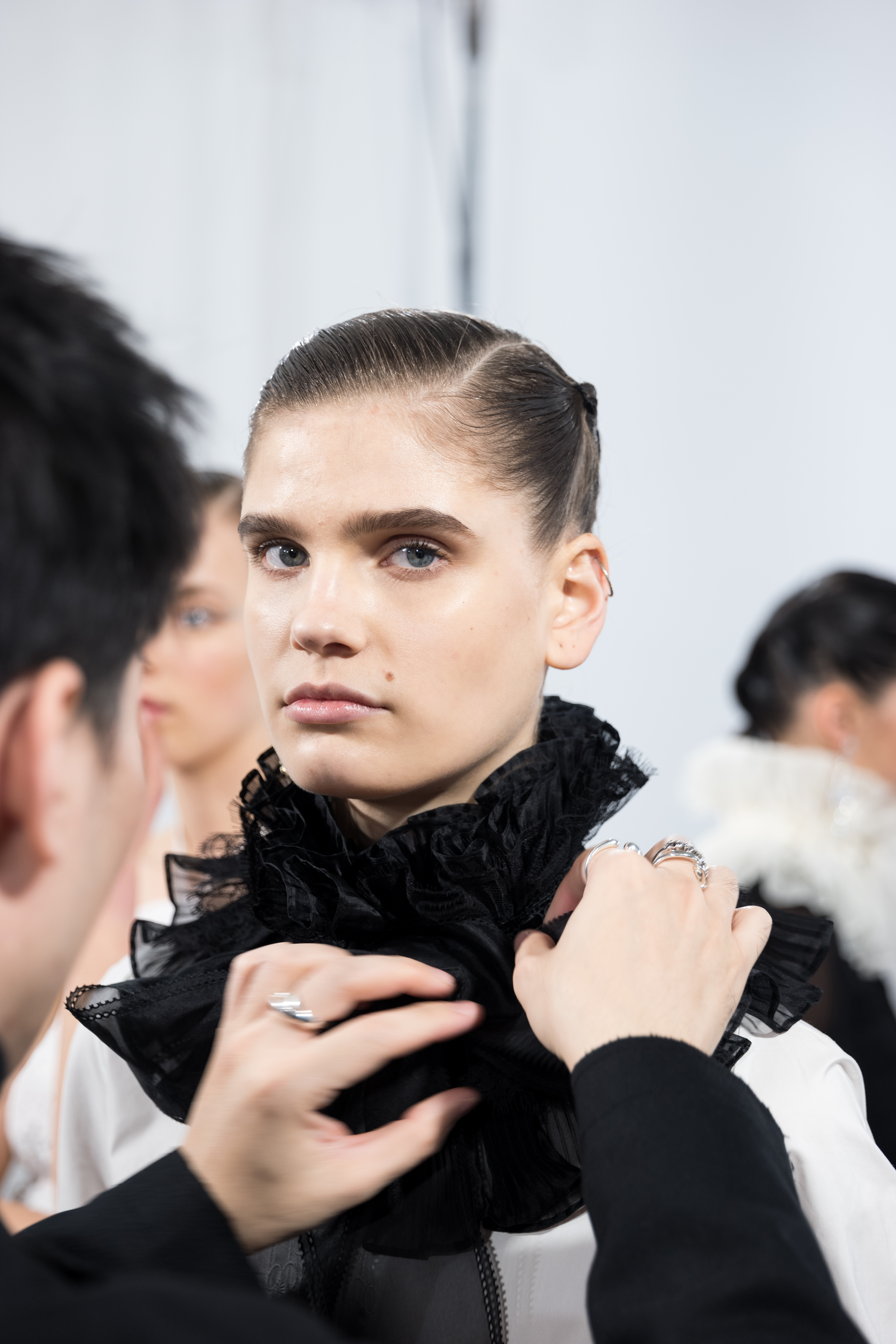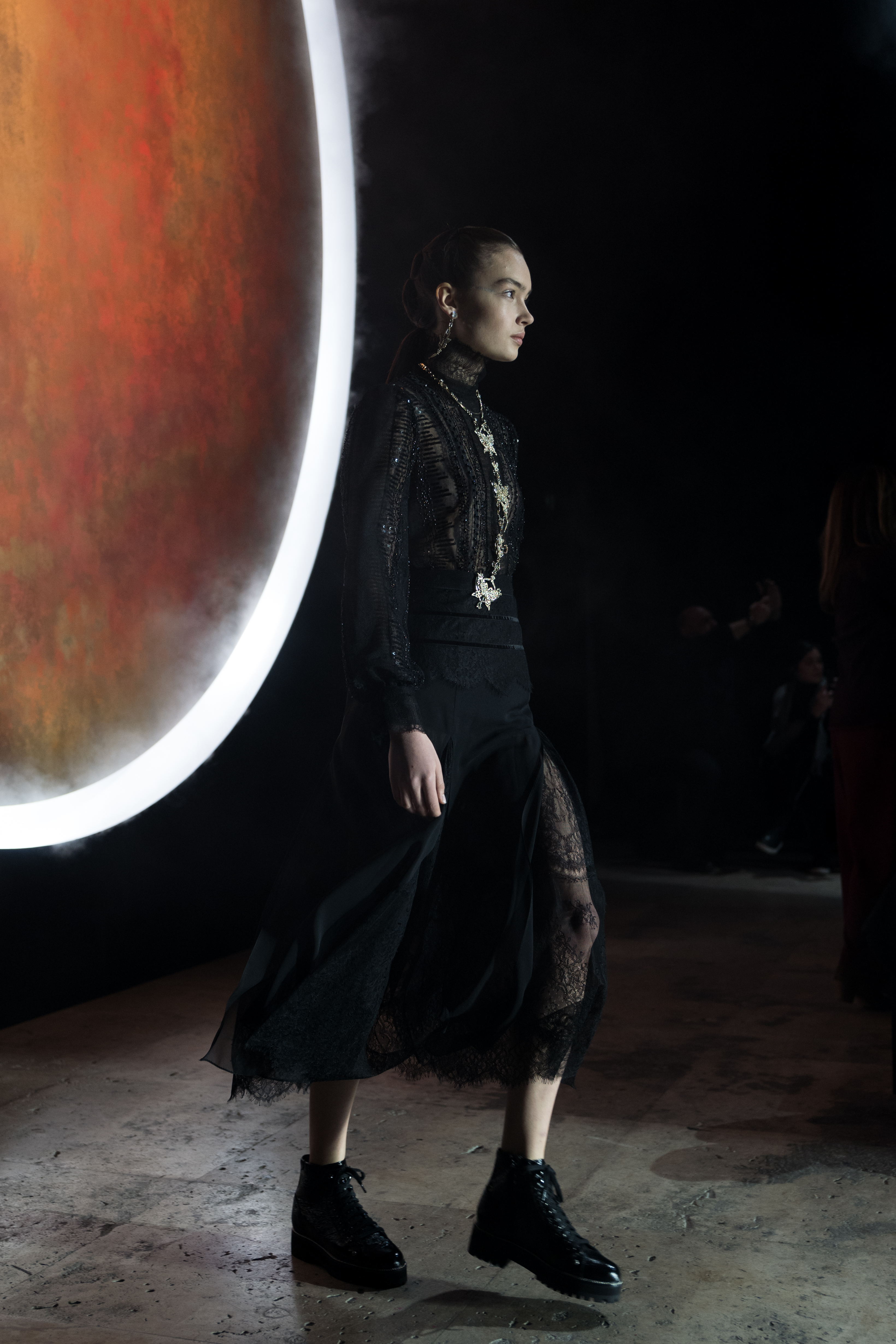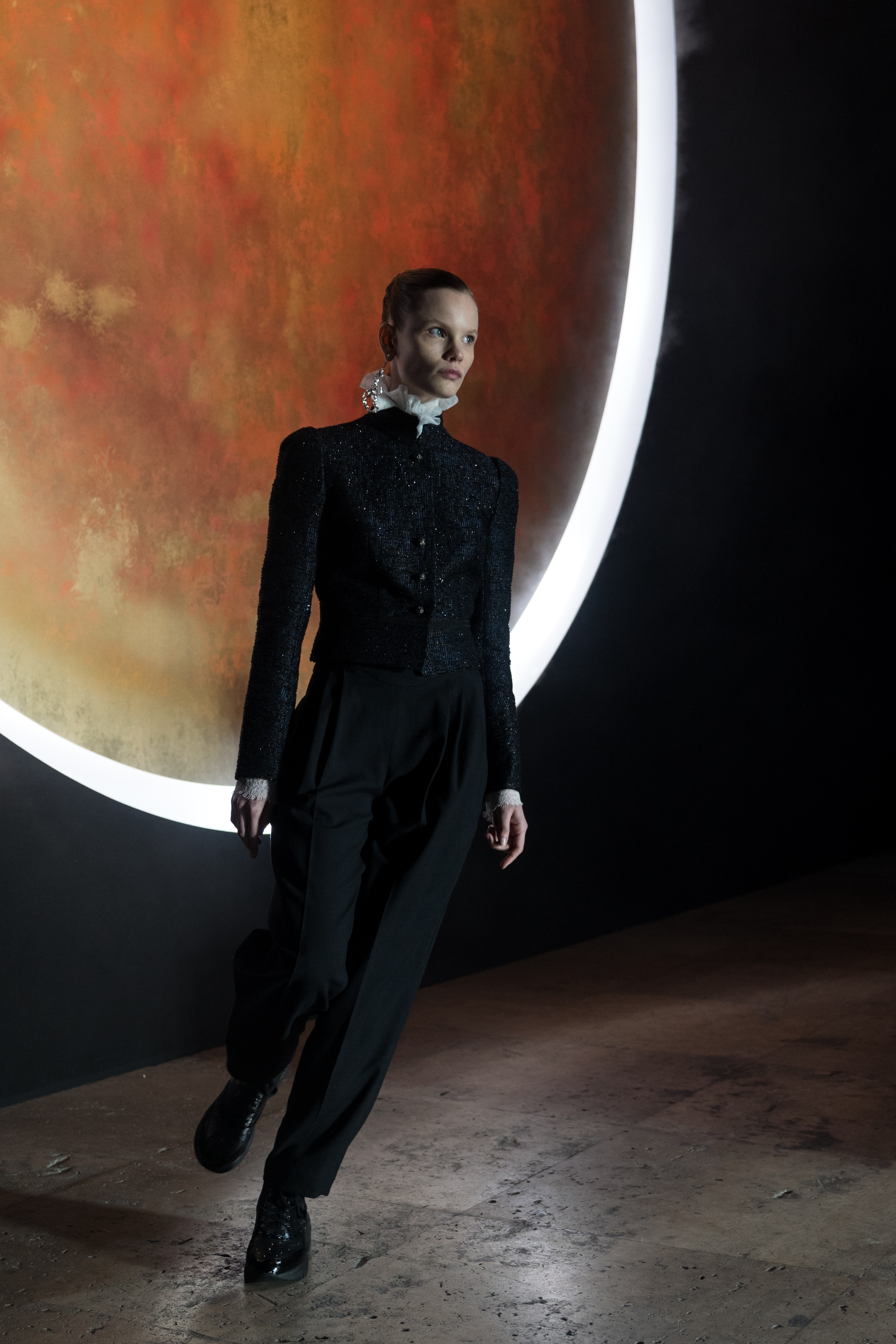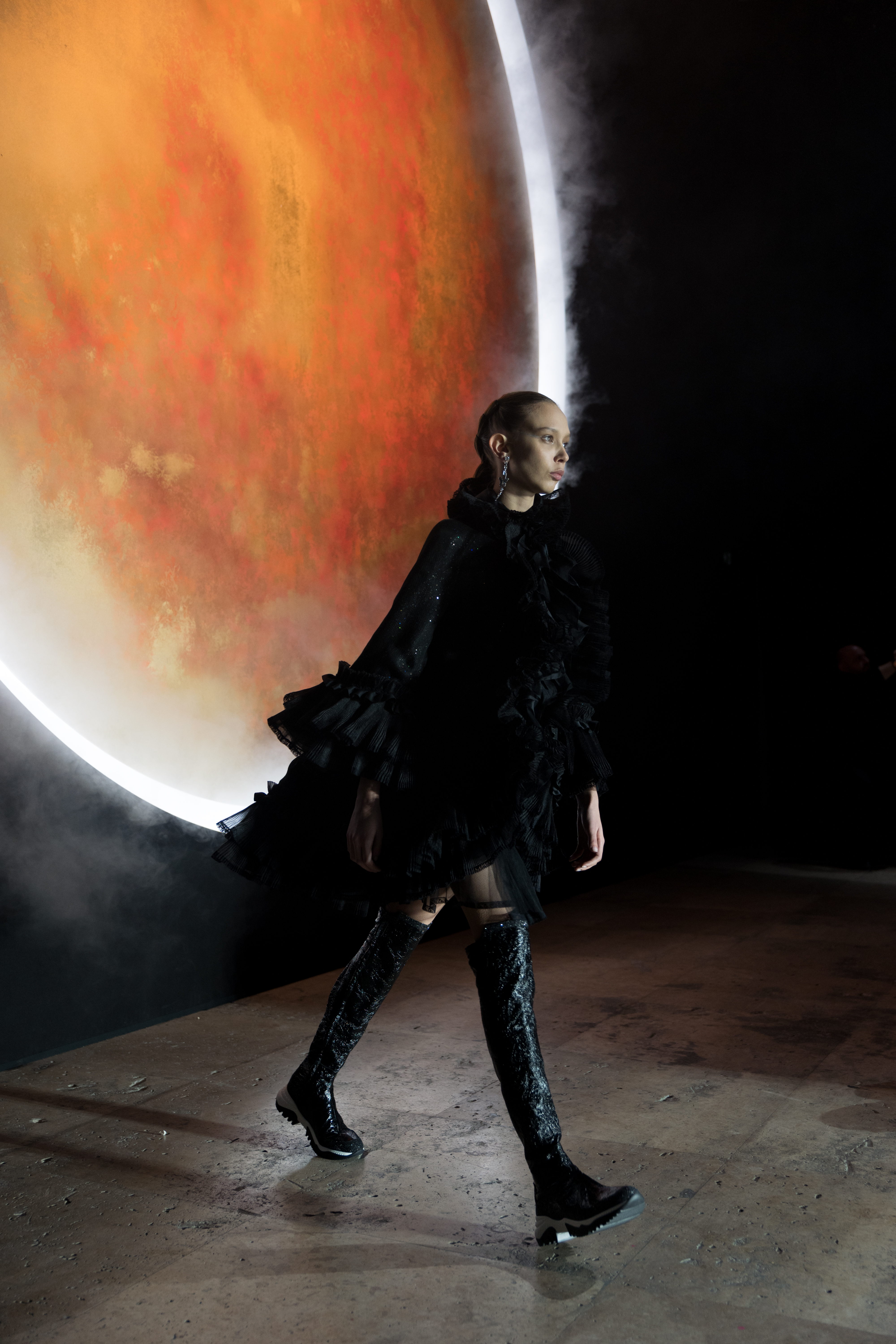 La Mythologie s’apprivoise ici à la manière d’un discours, et l’attitude devient la nouvelle arme absolue du style. Le concept « deep affection » adopté par Shiatzy Chen puise son inspiration dans l’image traditionnelle du porte-bébé des femmes Hmong Miao du sud-ouest de la Chine, exquises créatrices de textile. Chaque point et chaque fil de la broderie représentent l’attache affectueuse d’une mère pour son enfant.