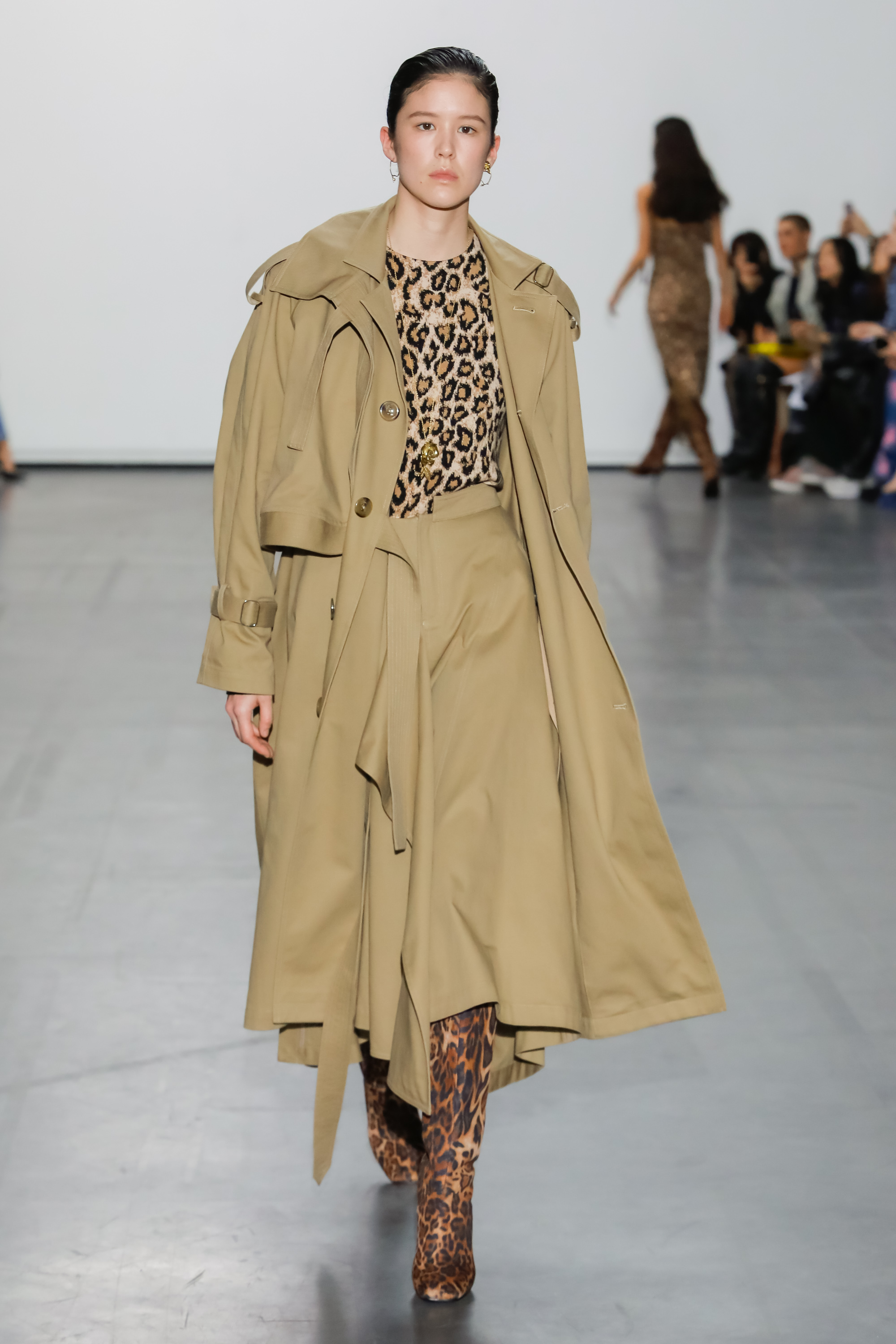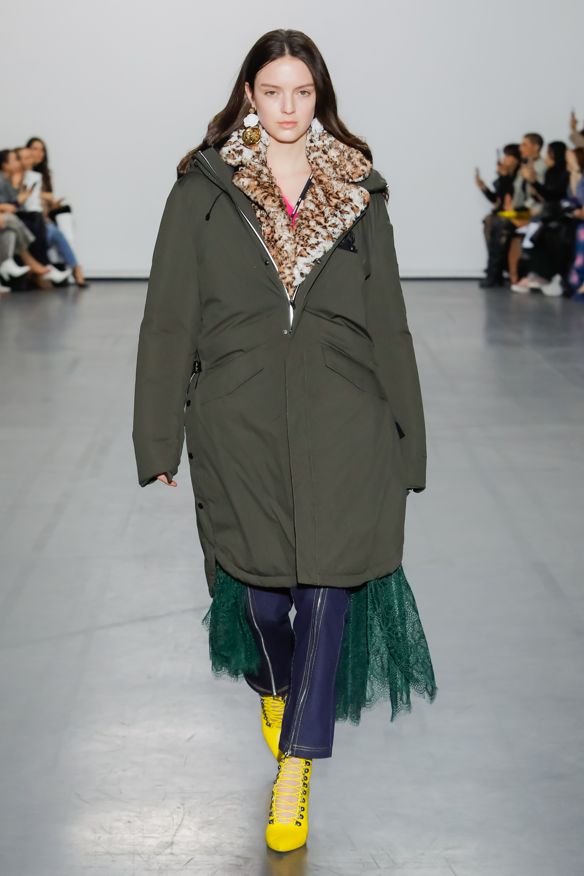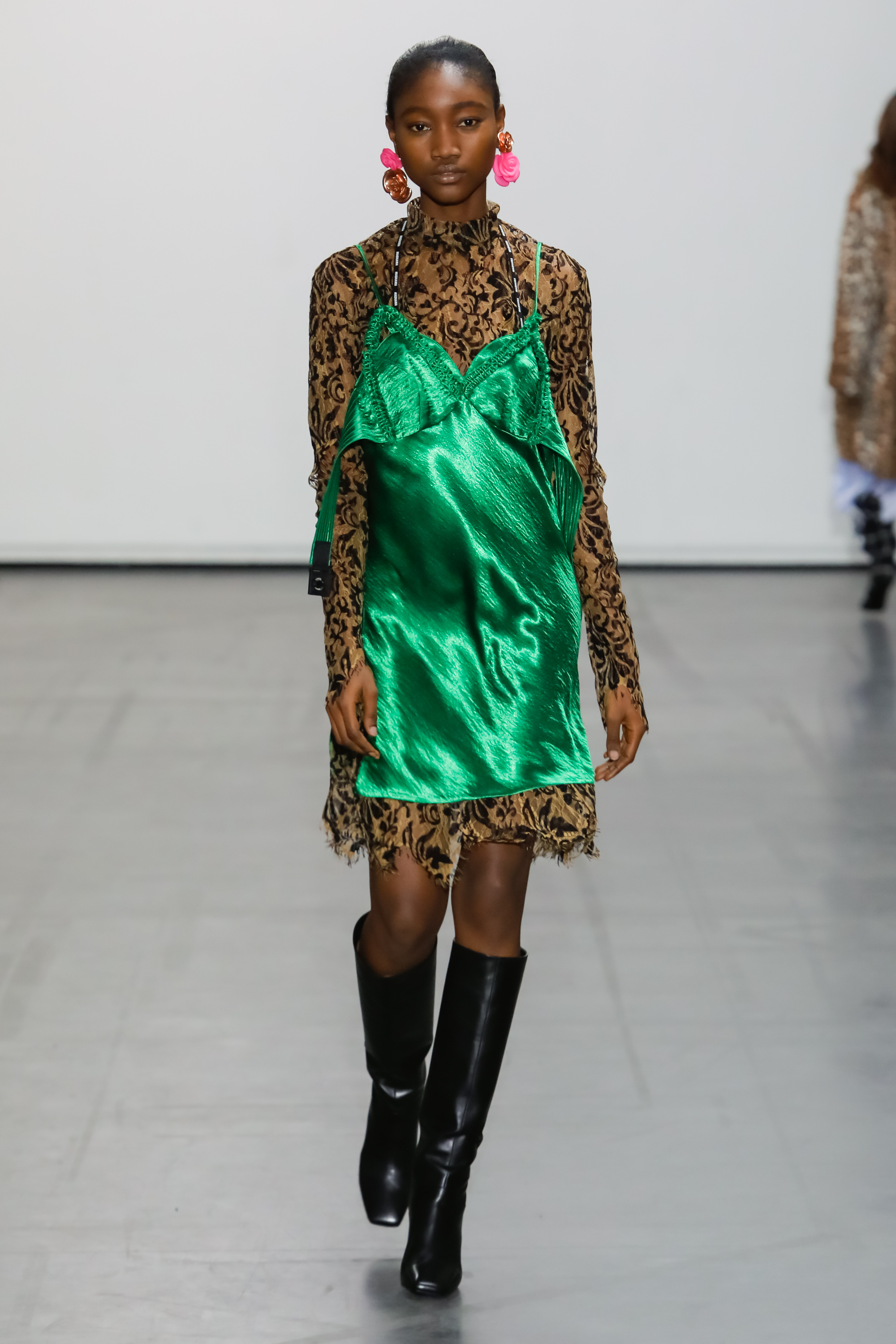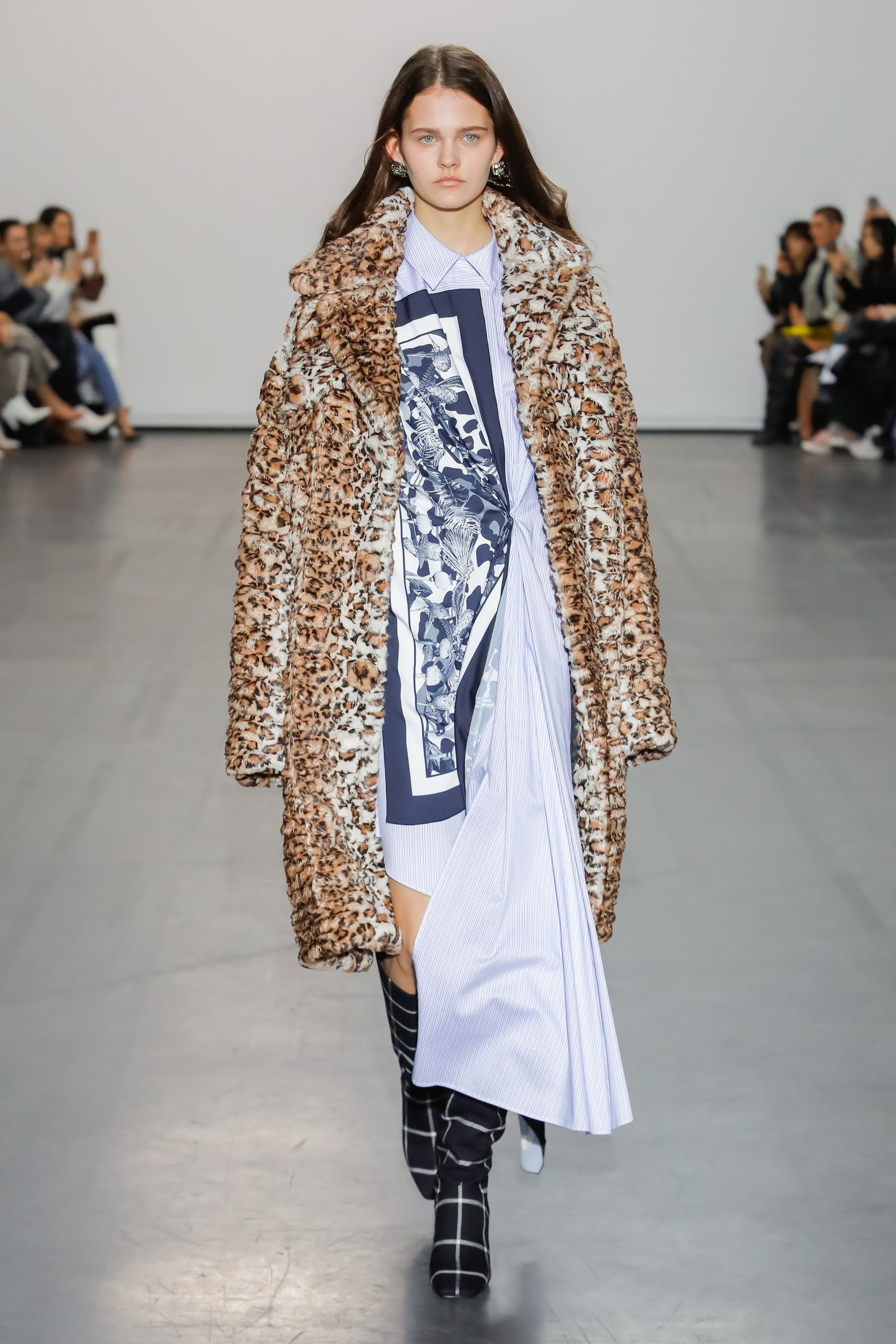 The collection examines and looks at the world from a new perspective. Fuchsia silks, jade Azalea printed knits and leopard print fake fur come together to create a surreal but life-like scene. The fabrics used in some of the outerwear pieces are made from recycled plastic bottles, using the ‘REPREVE’ technology.