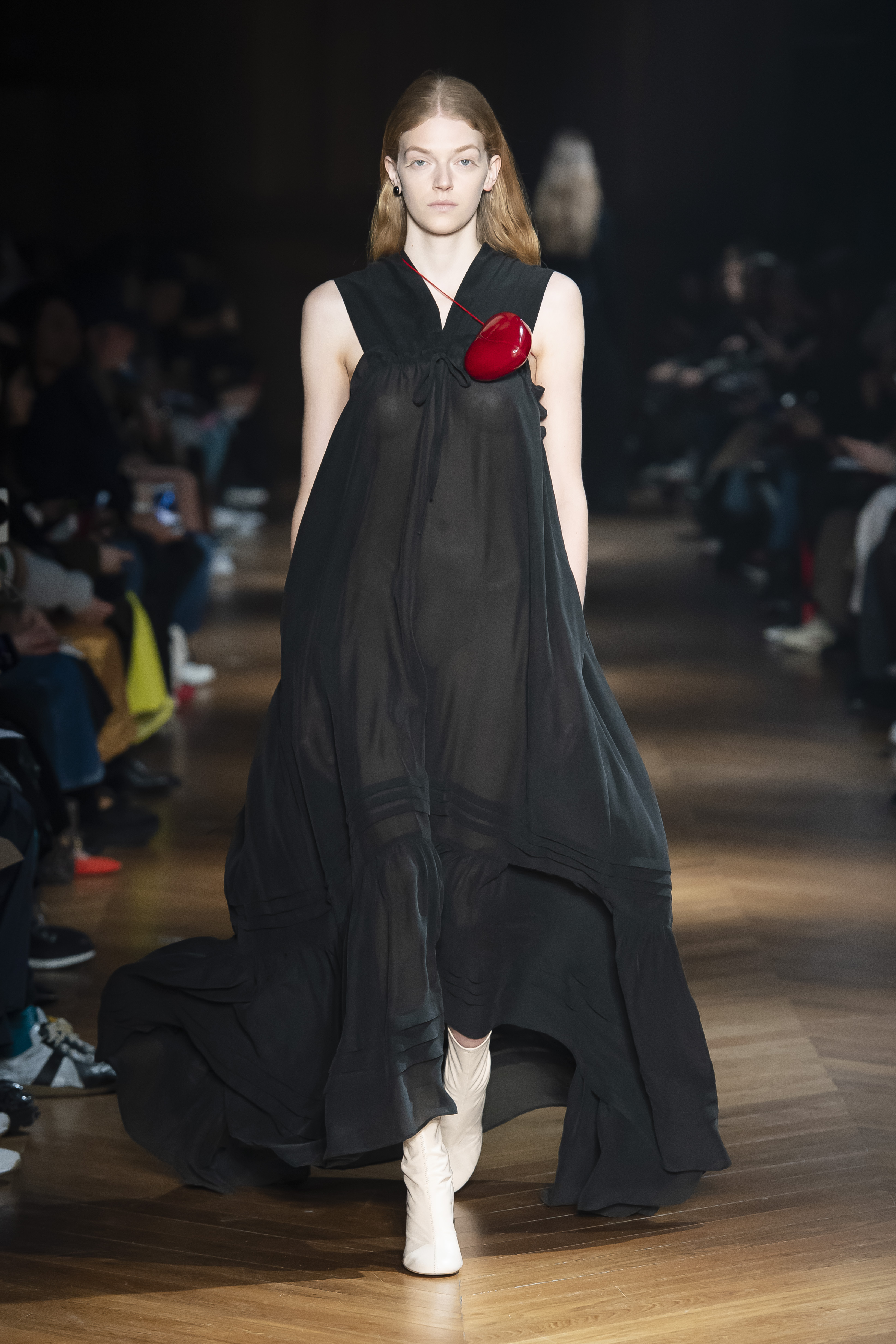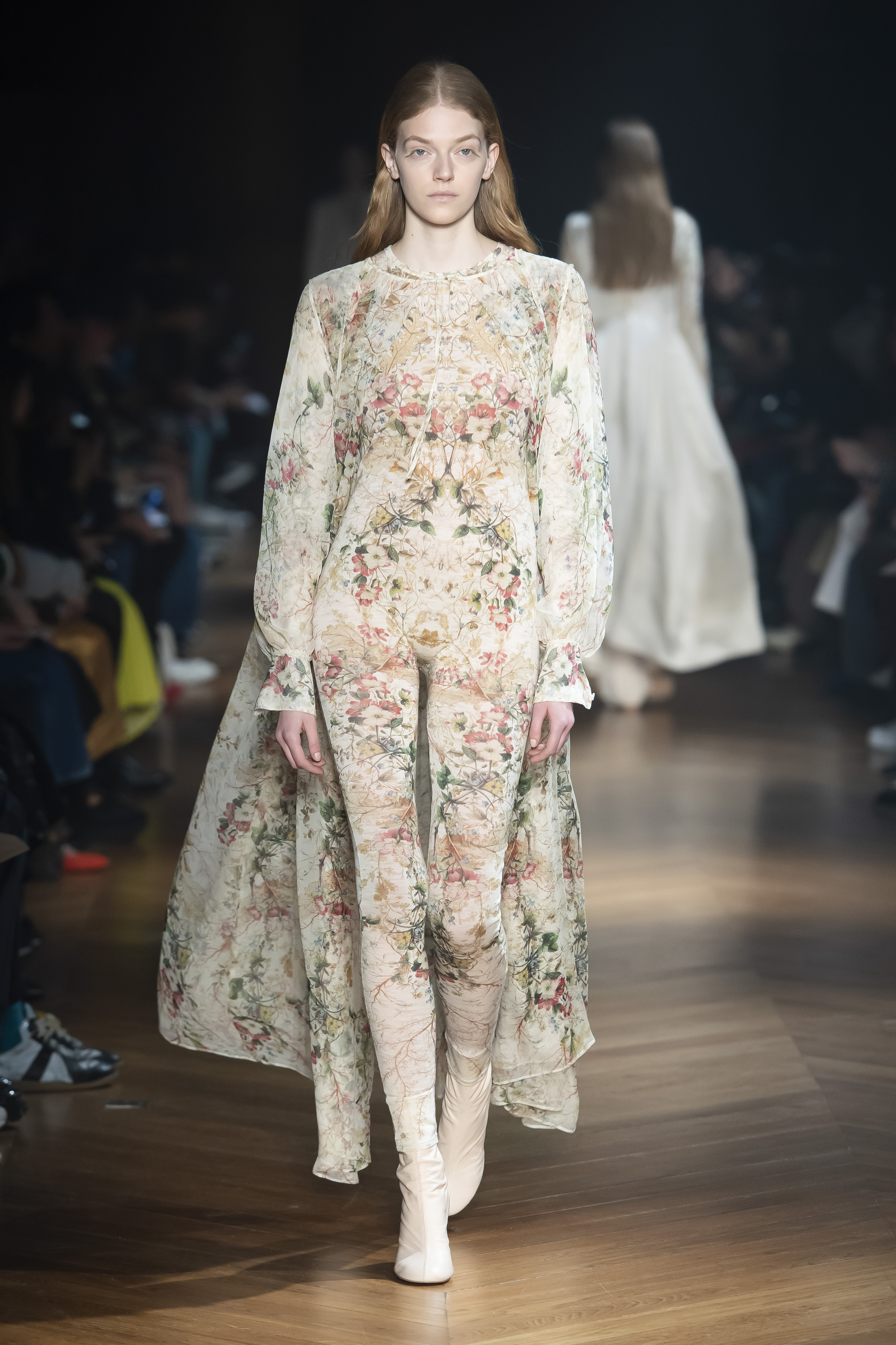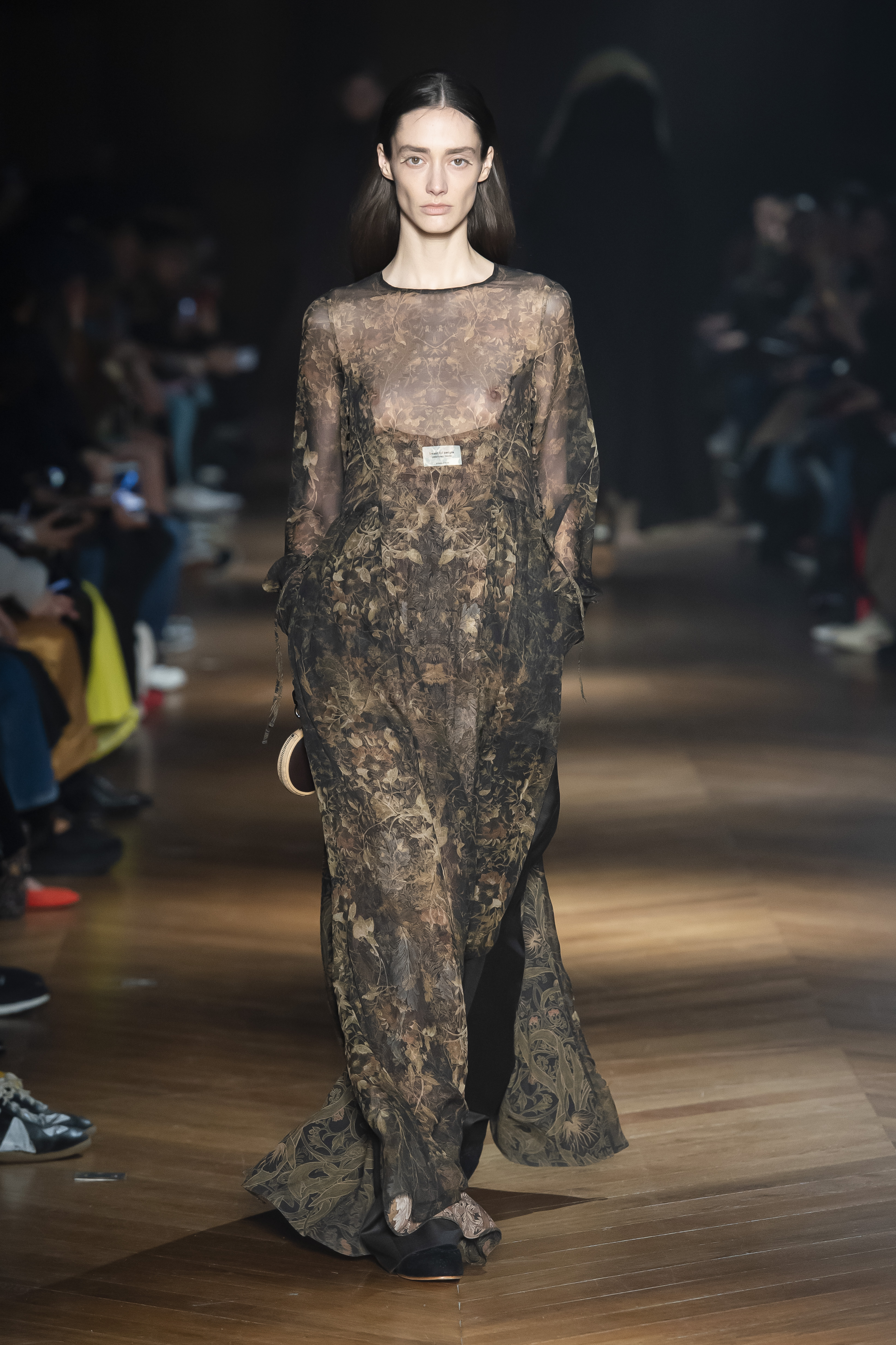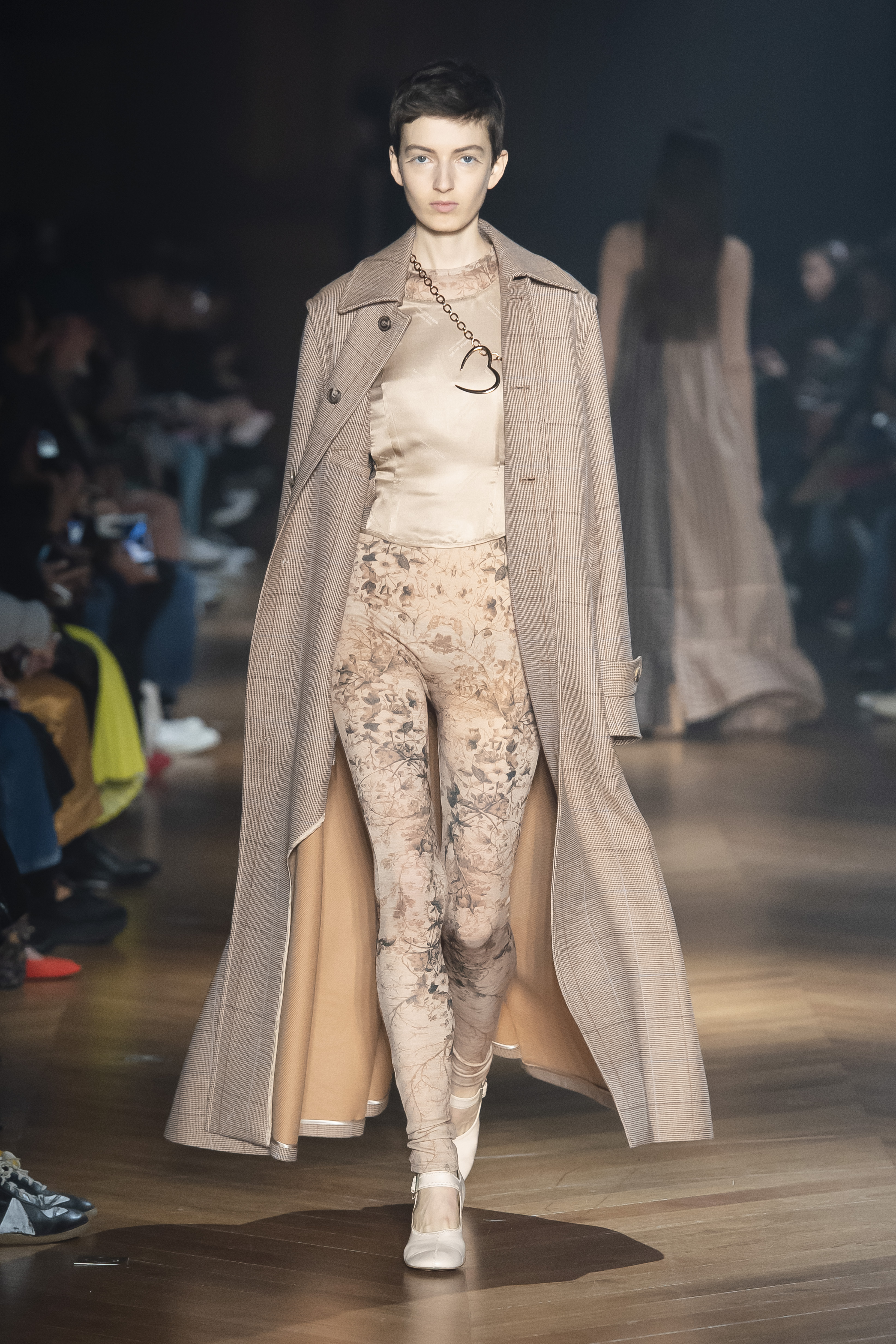 An interplay of restraint and indulgence, of covering up and revealing, for transformative pieces that can be interpreted in countless ways. The silhouette is long and fluid: coats, trenchcoats, dresses, knits draw a restrained long line that lets the body to be felt and the skin be seen. Floral and vegetal motifs are printed all over dresses or turned into jacquards on knitwear, following the patterns of what is generally hidden: the circulation and muscles systems, the internal organs. The invisible becomes visible, morphed to side C.