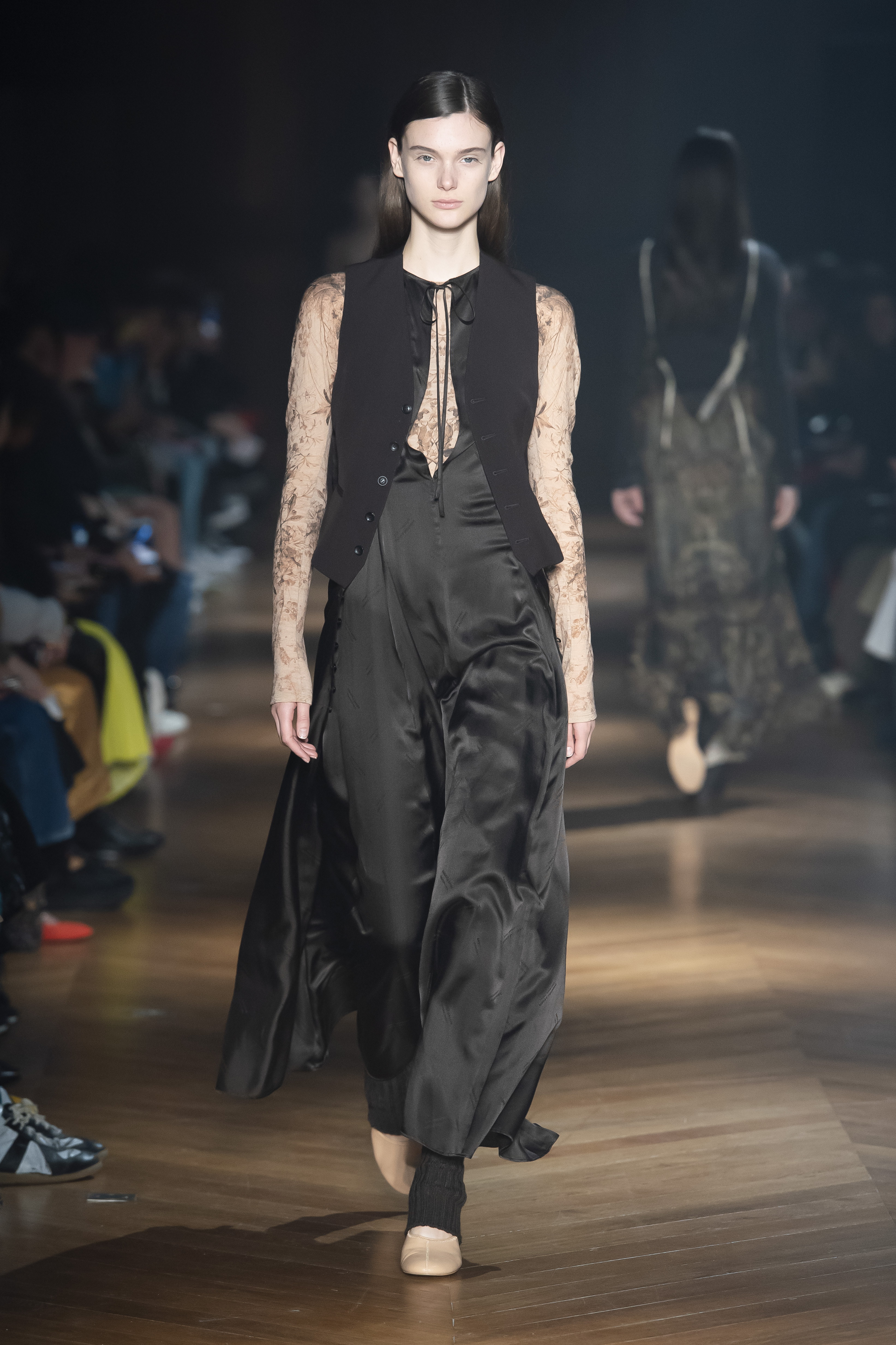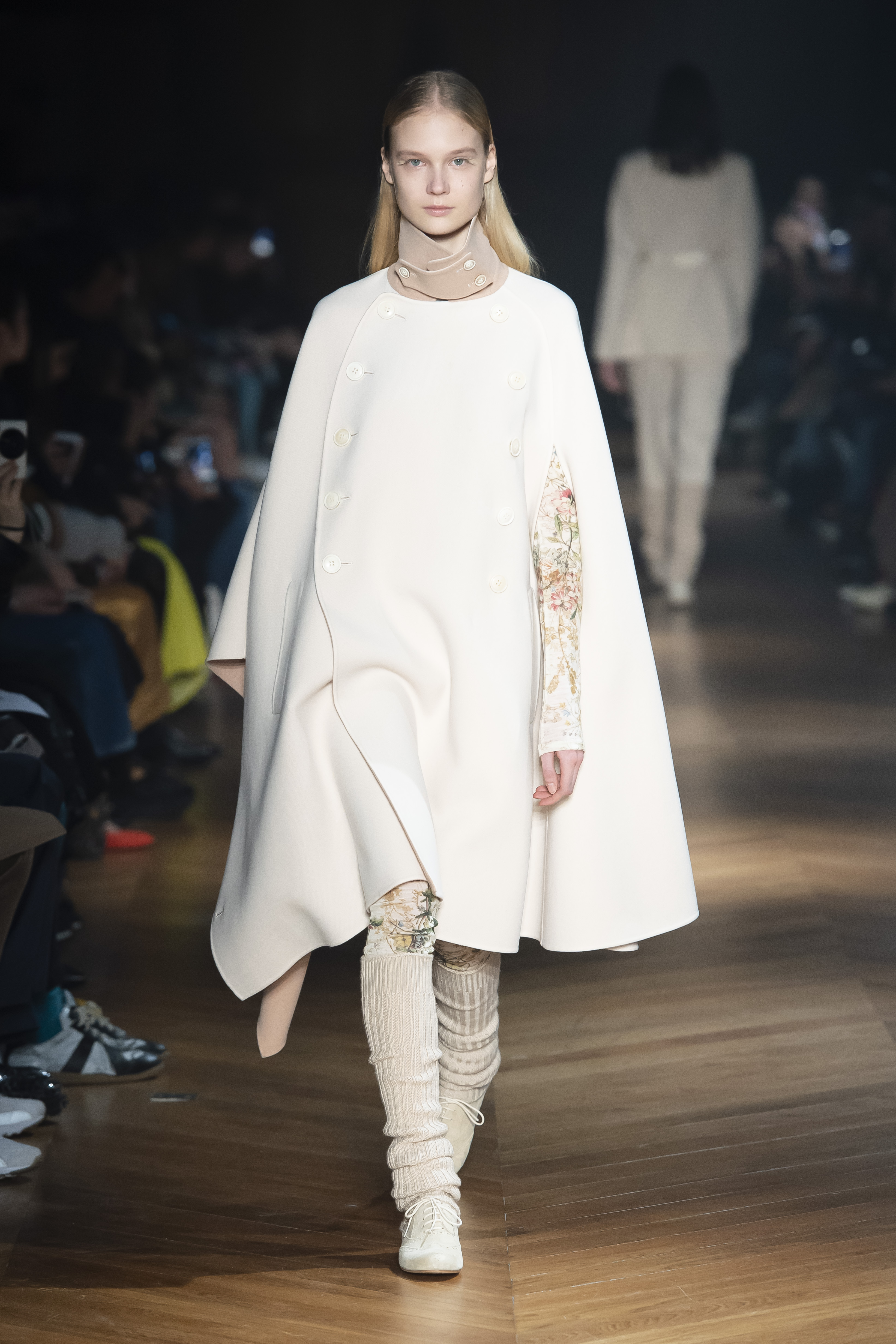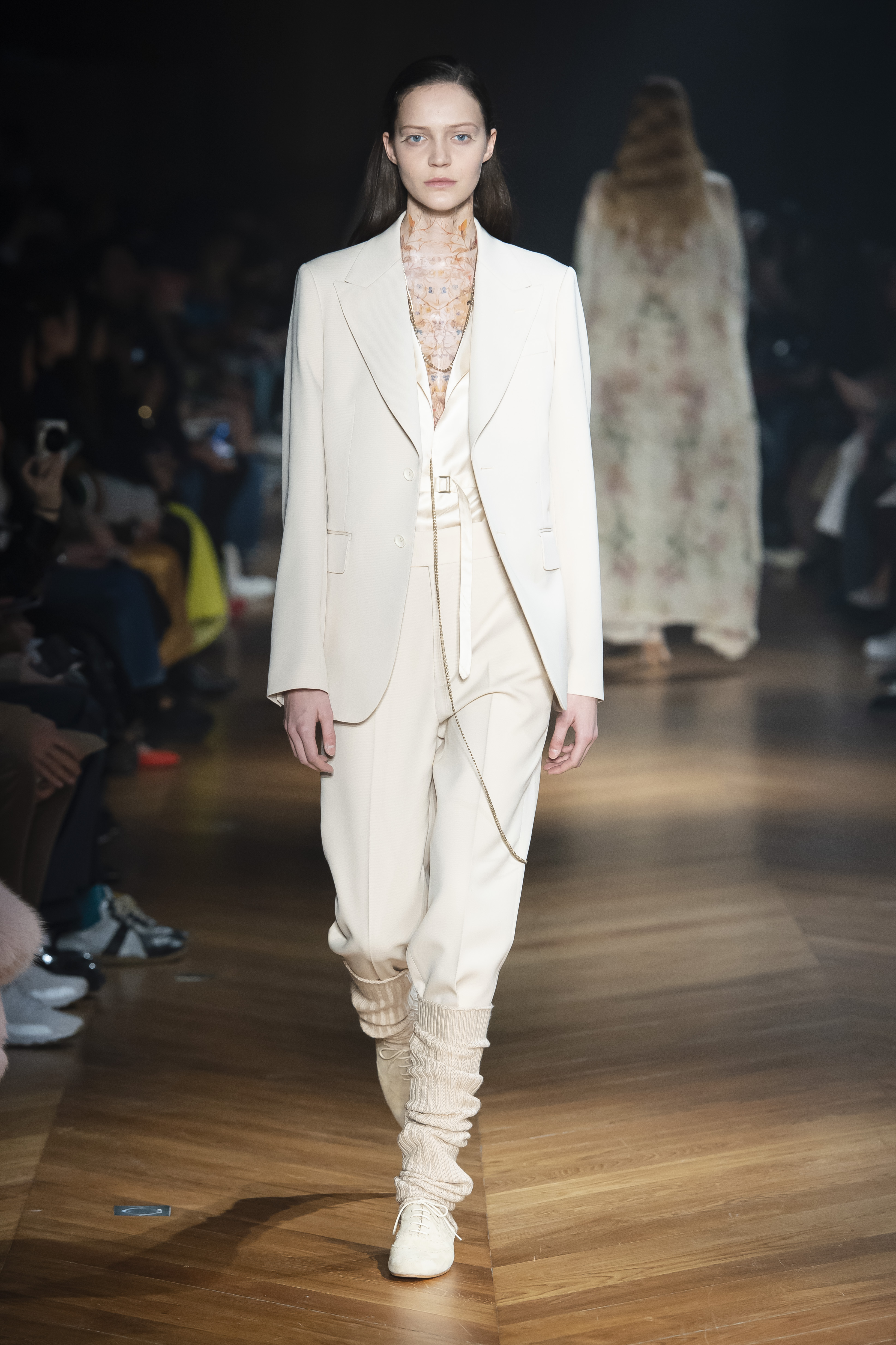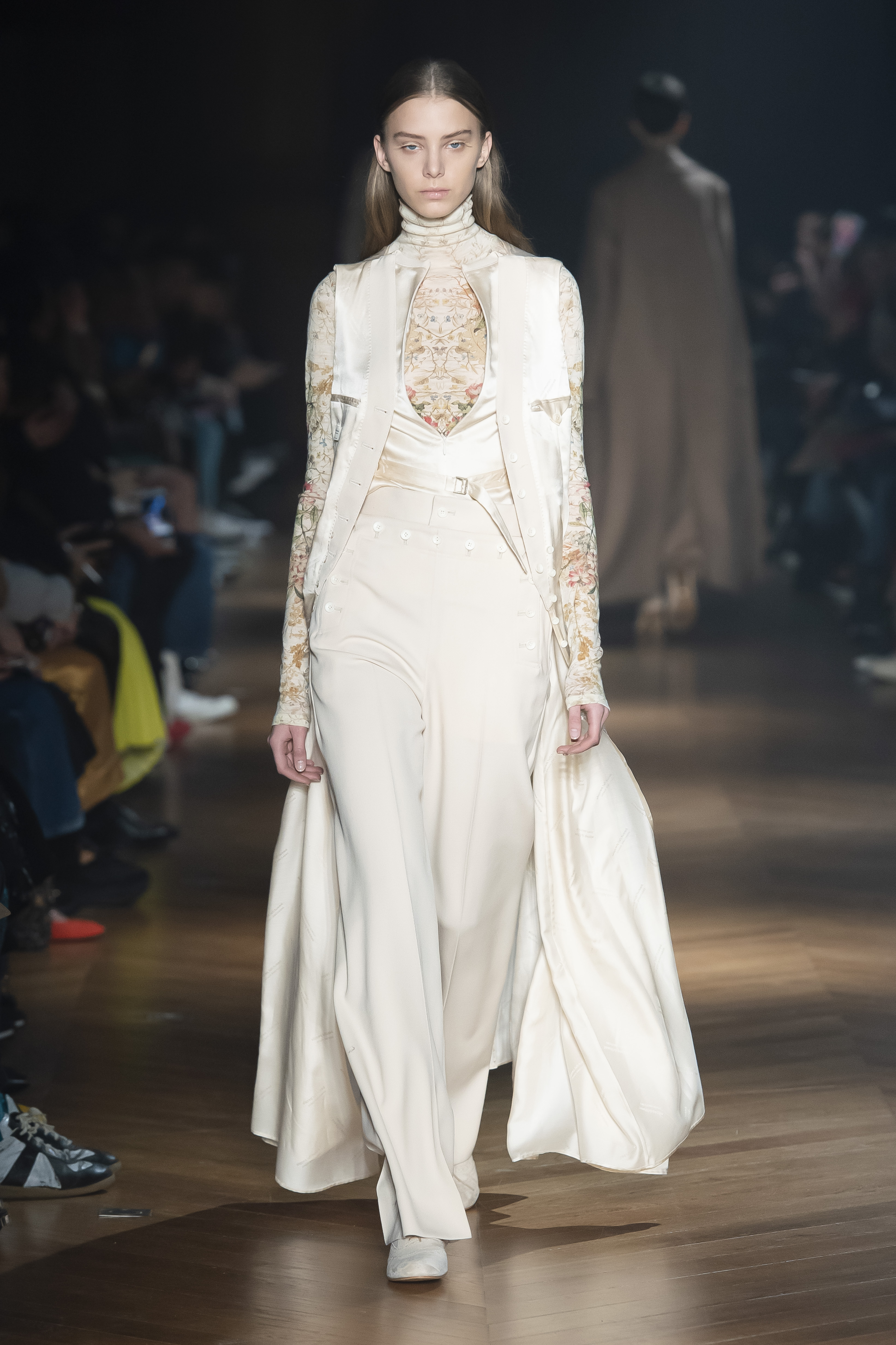 An interplay of restraint and indulgence, of covering up and revealing, for transformative pieces that can be interpreted in countless ways. The silhouette is long and fluid: coats, trenchcoats, dresses, knits draw a restrained long line that lets the body to be felt and the skin be seen. Floral and vegetal motifs are printed all over dresses or turned into jacquards on knitwear, following the patterns of what is generally hidden: the circulation and muscles systems, the internal organs. The invisible becomes visible, morphed to side C.