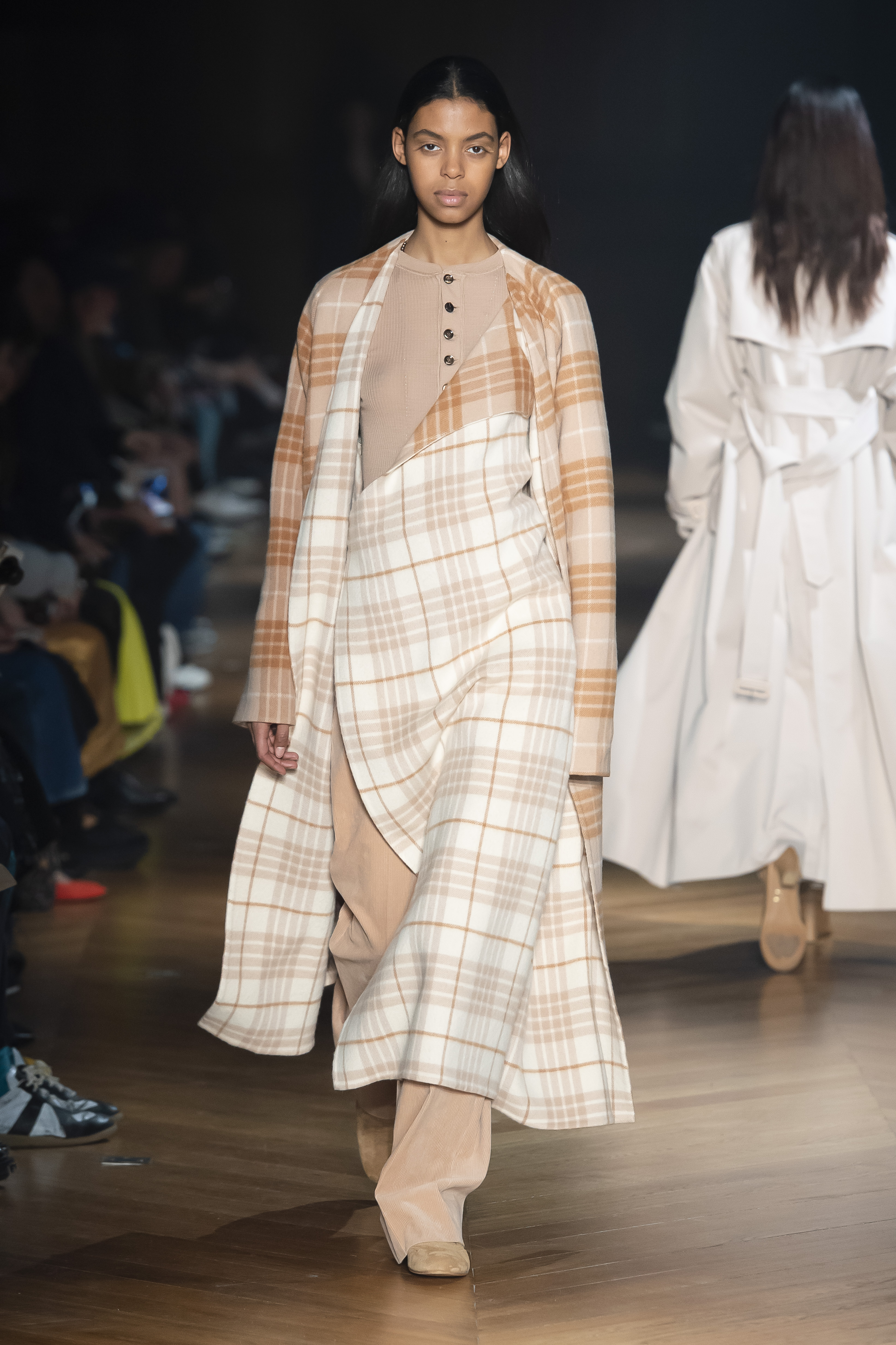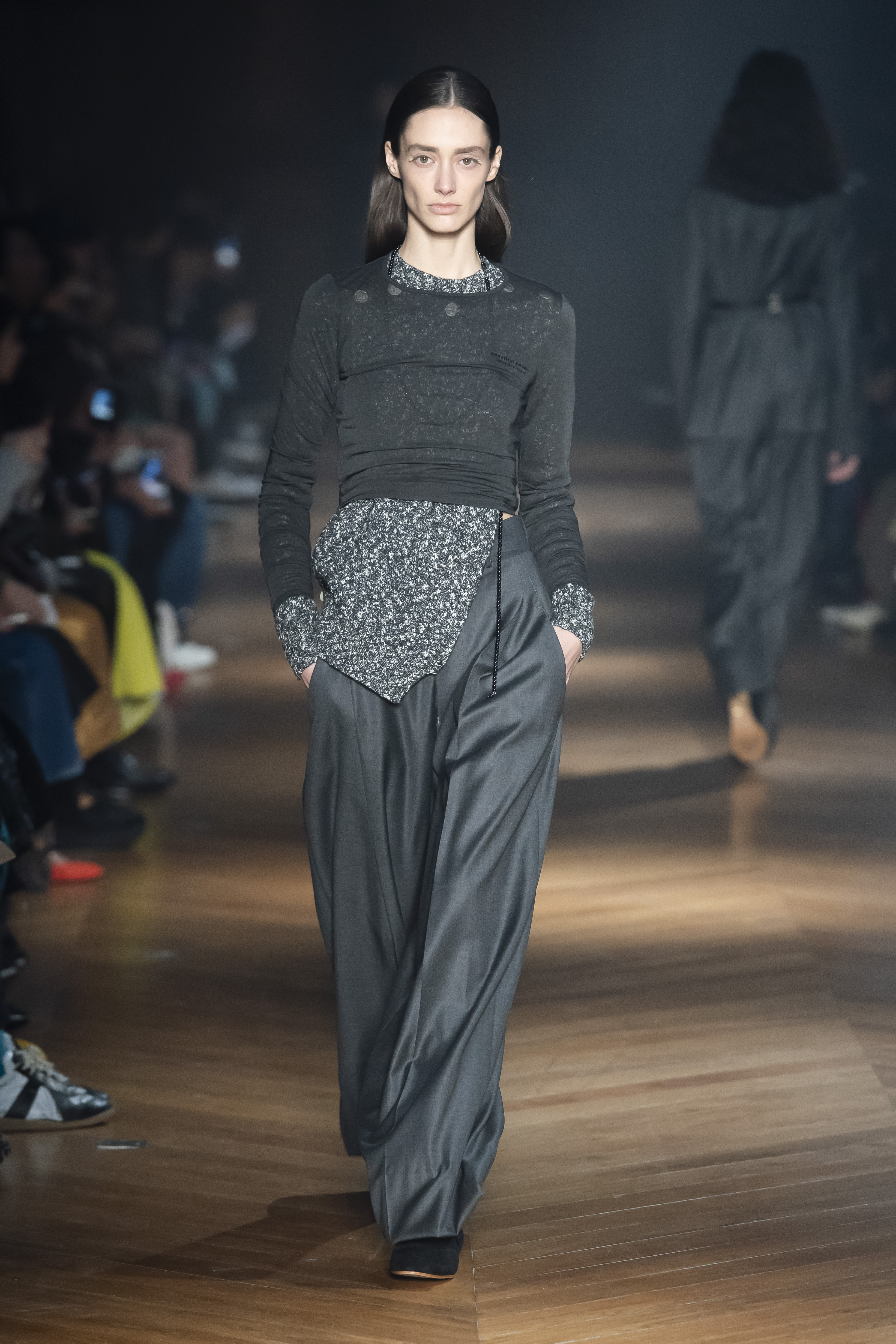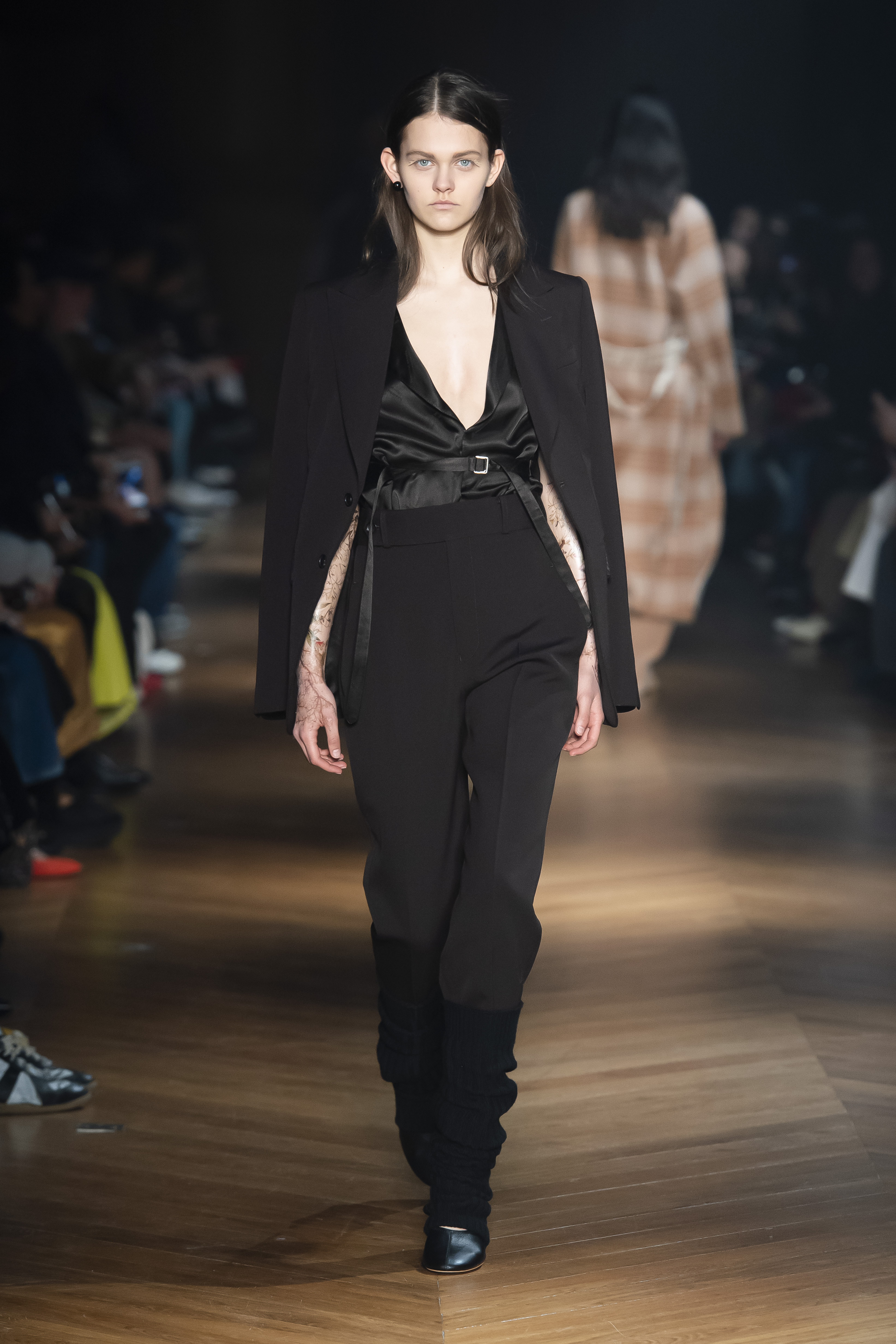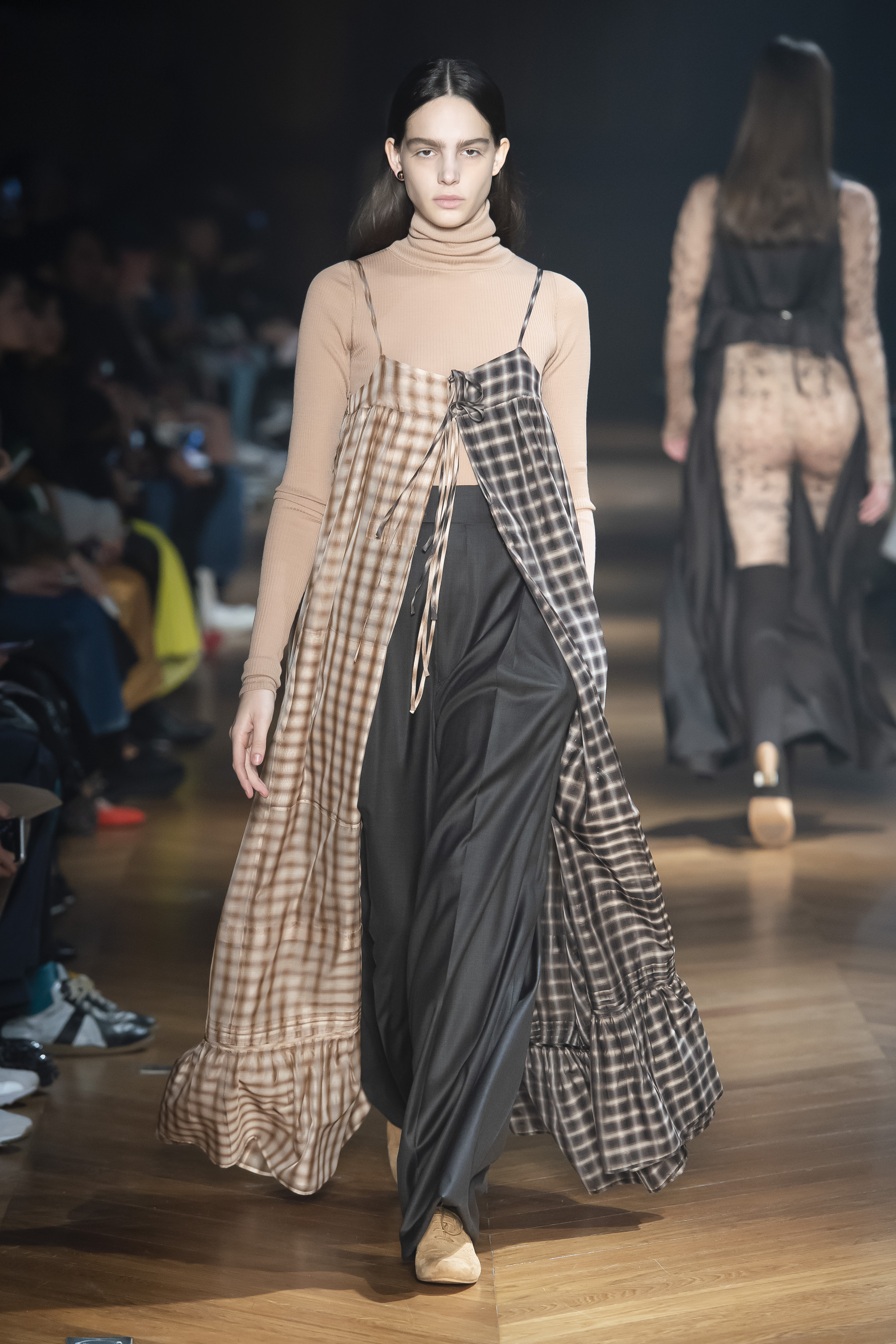 The interiors of the garments are the focus of the attention. What is normally hidden comes to the front. The body finds a new place, standing between the lining and the garment, as the back linings are peeled and worn, and the side seams are left open to let interior and exterior flip.