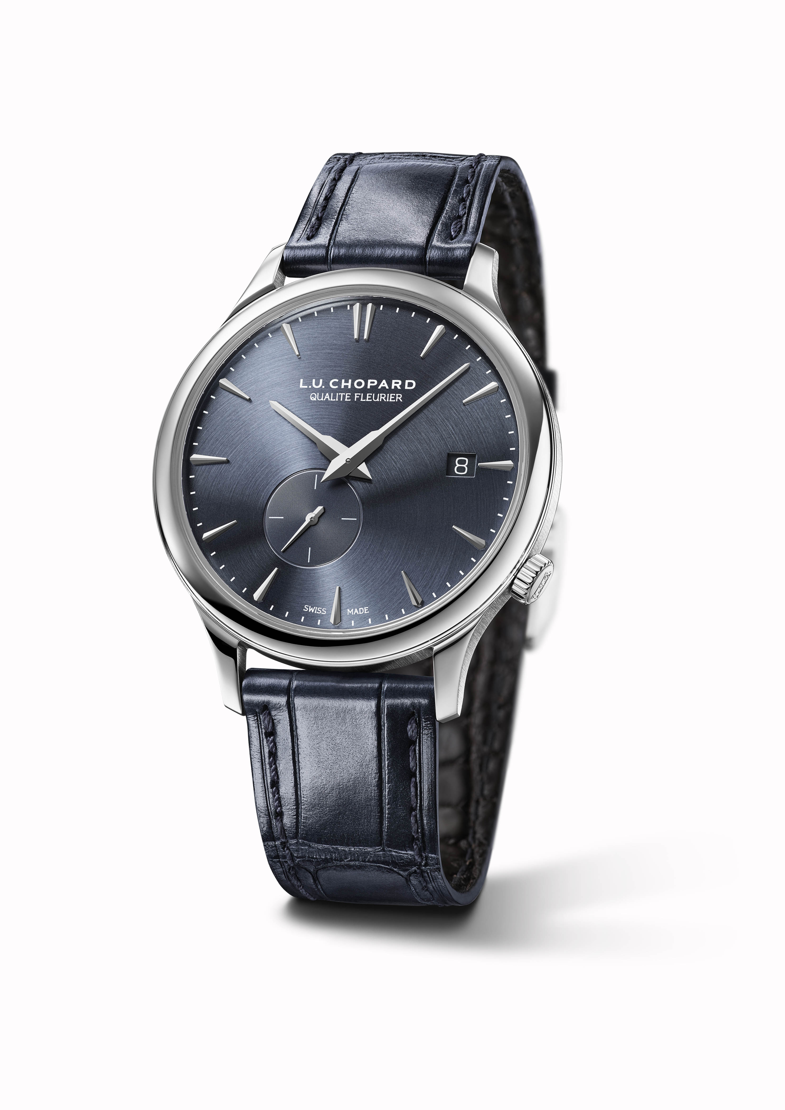Dans le langage esthétique de la collection L.U.C, les textures à la surface des cadrans sont immuablement centrées sur le logo L.U.Chopard, disposé à midi. Ici, le point de convergence visuelle se déplace sur la petite seconde à 7 heures. L’effet d’aspiration du regard est amplifié par le satiné circulaire qui rayonne depuis ce sous-cadran et sur toute la surface bleu-gris du cadran du garde-temps L.U.C XPS Twist QF. Autre transgression, cette pièce est la seule de la collection L.U.C à ne pas présenter de chiffres arabes à midi : le 12 y est plutôt représenté par un double index facetté.