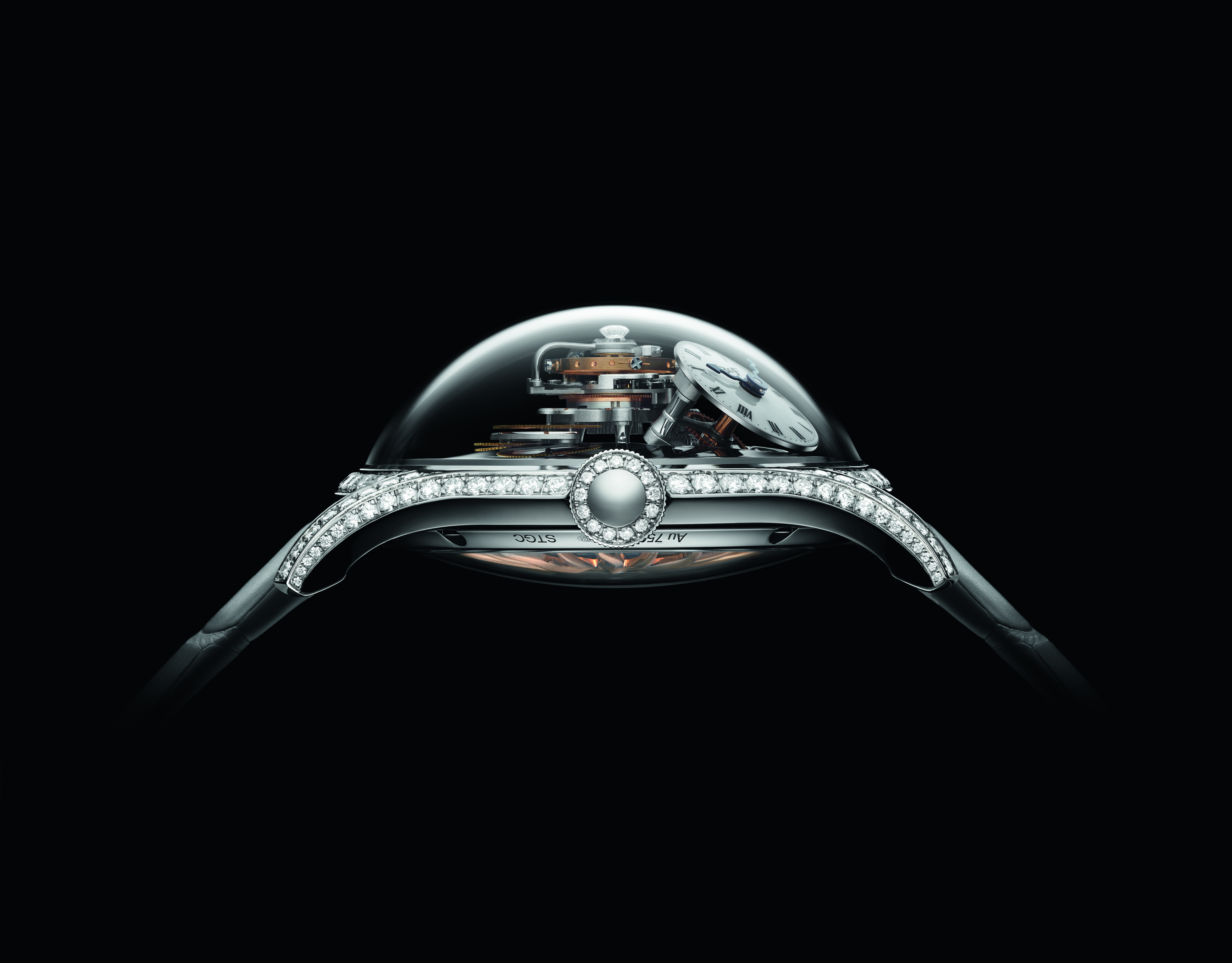 un sous-cadran délicat paré d’aiguilles serpentines donne l’heure, mais seulement à celle qui porte la montre ; une indication très intime de l’heure. Sous le boîtier élancé en or blanc 18 carats, la source d’énergie du mouvement automatique composé de 280 composants : un rotor en forme de soleil, offrant une réserve de marche généreuse