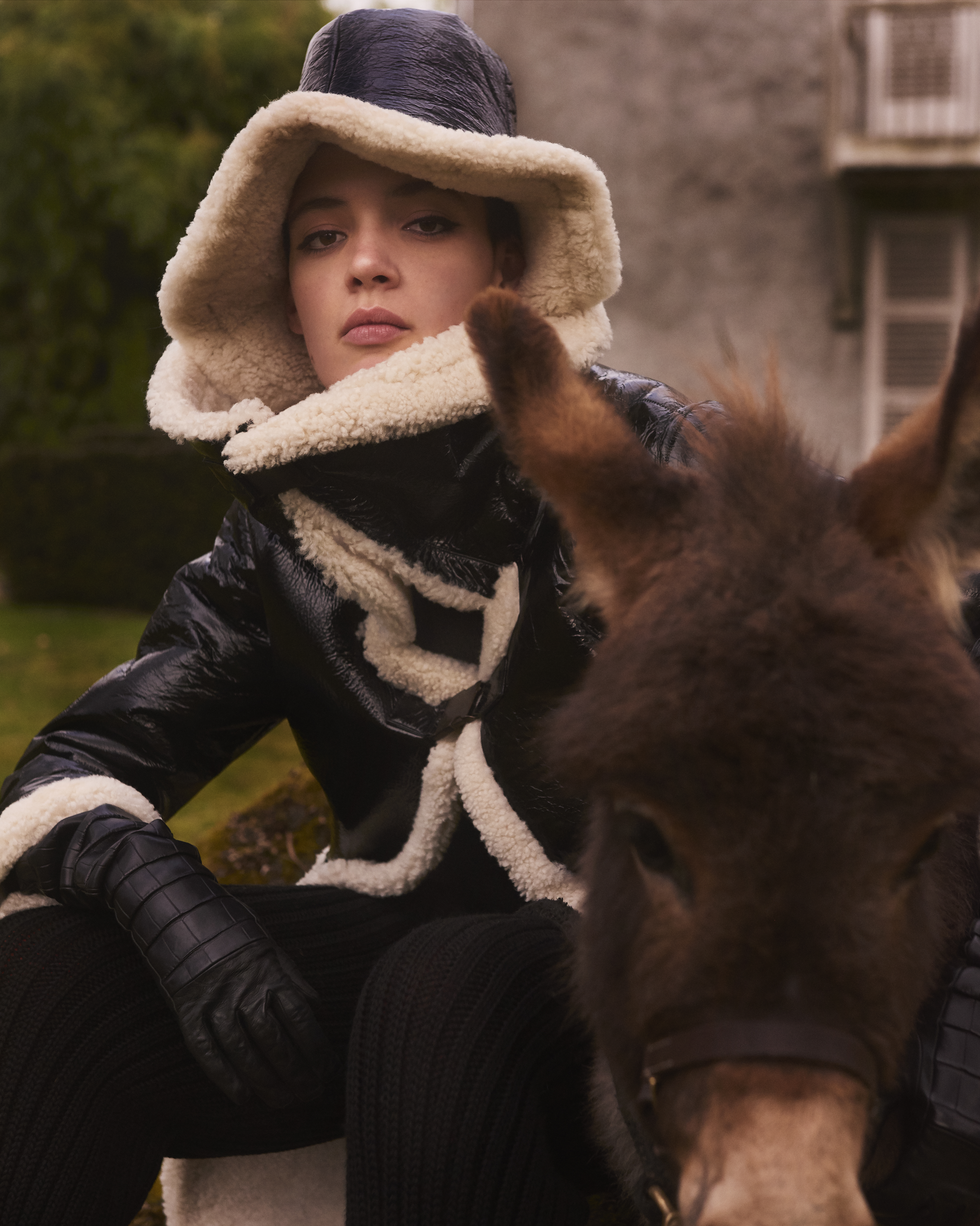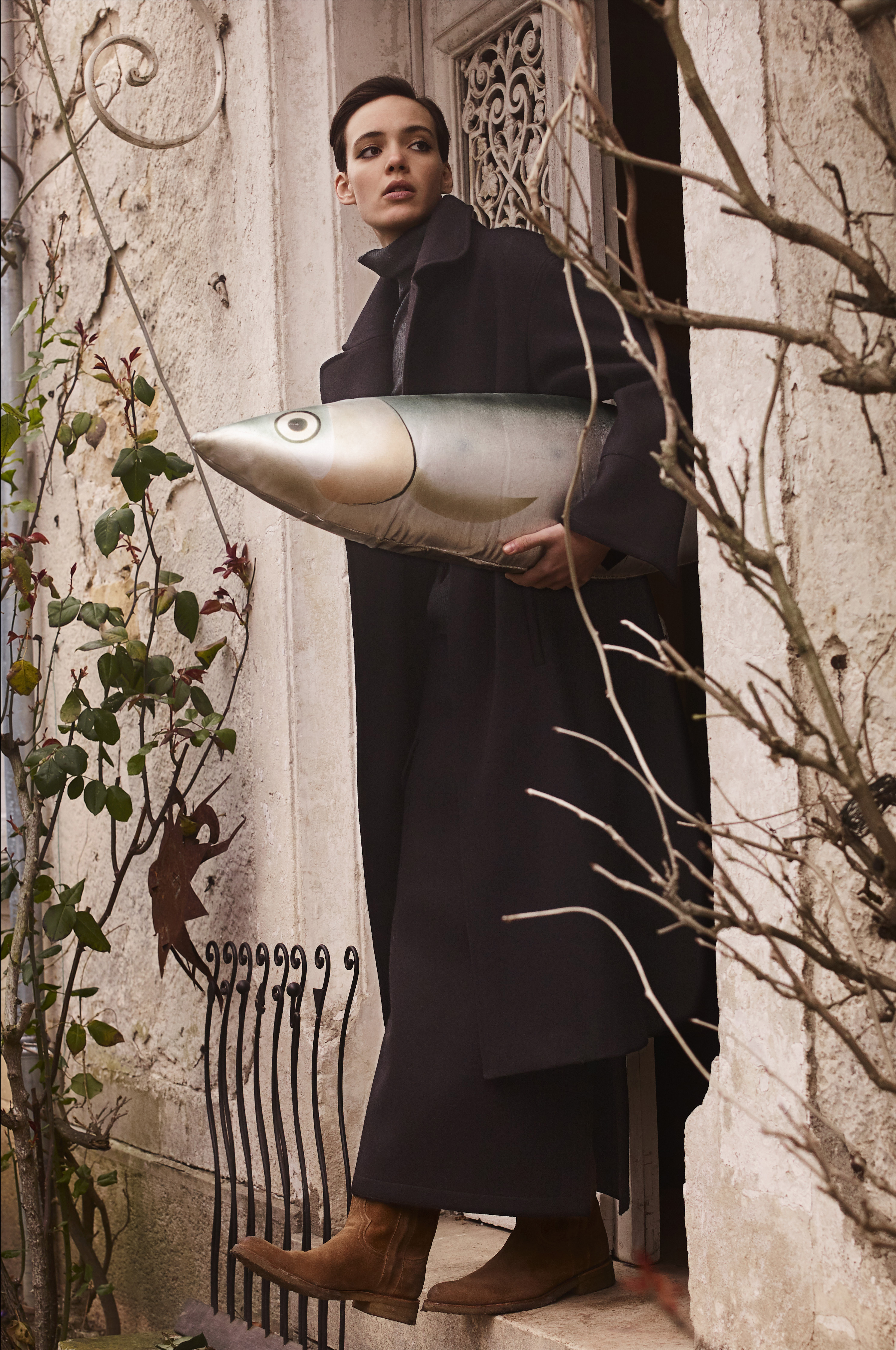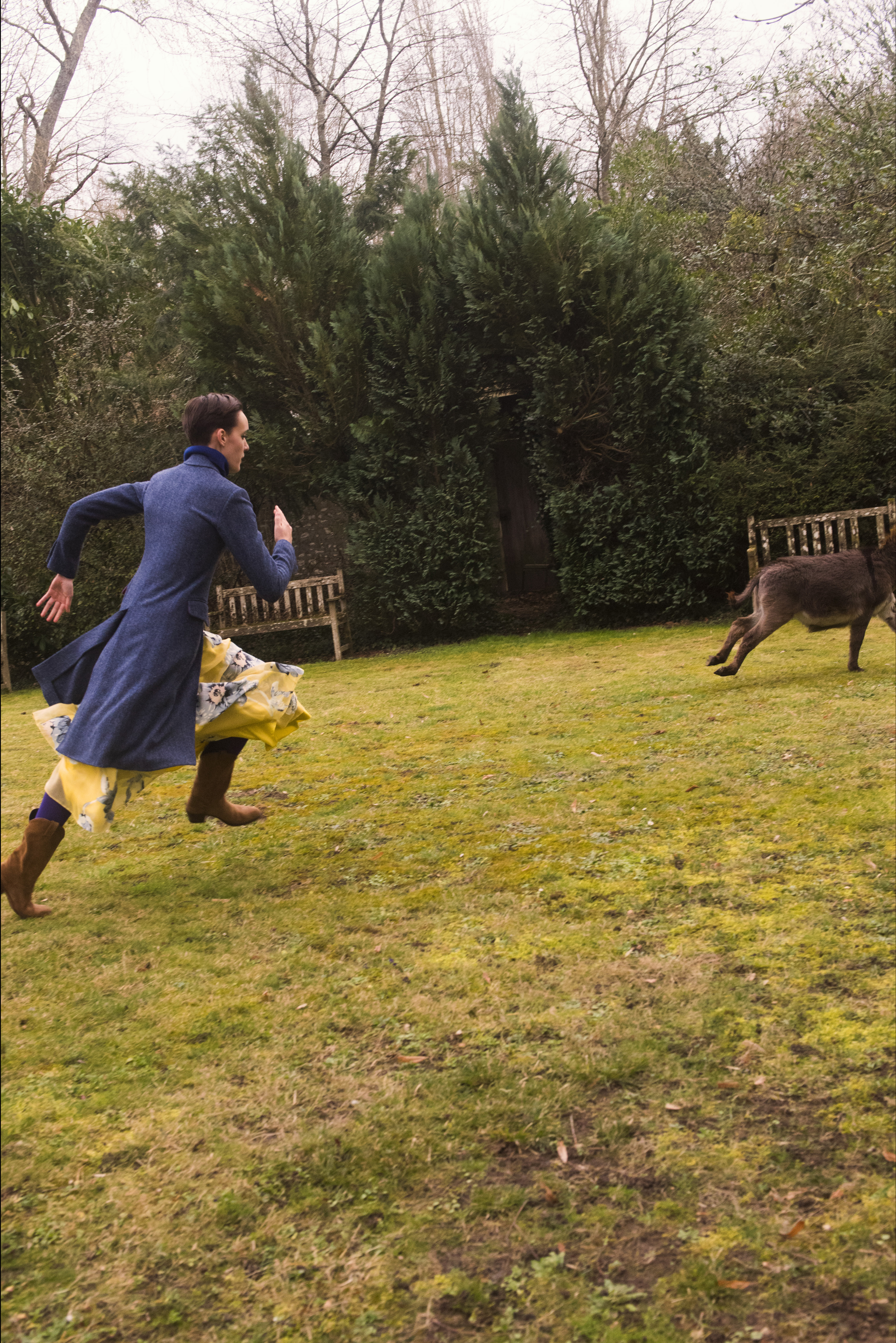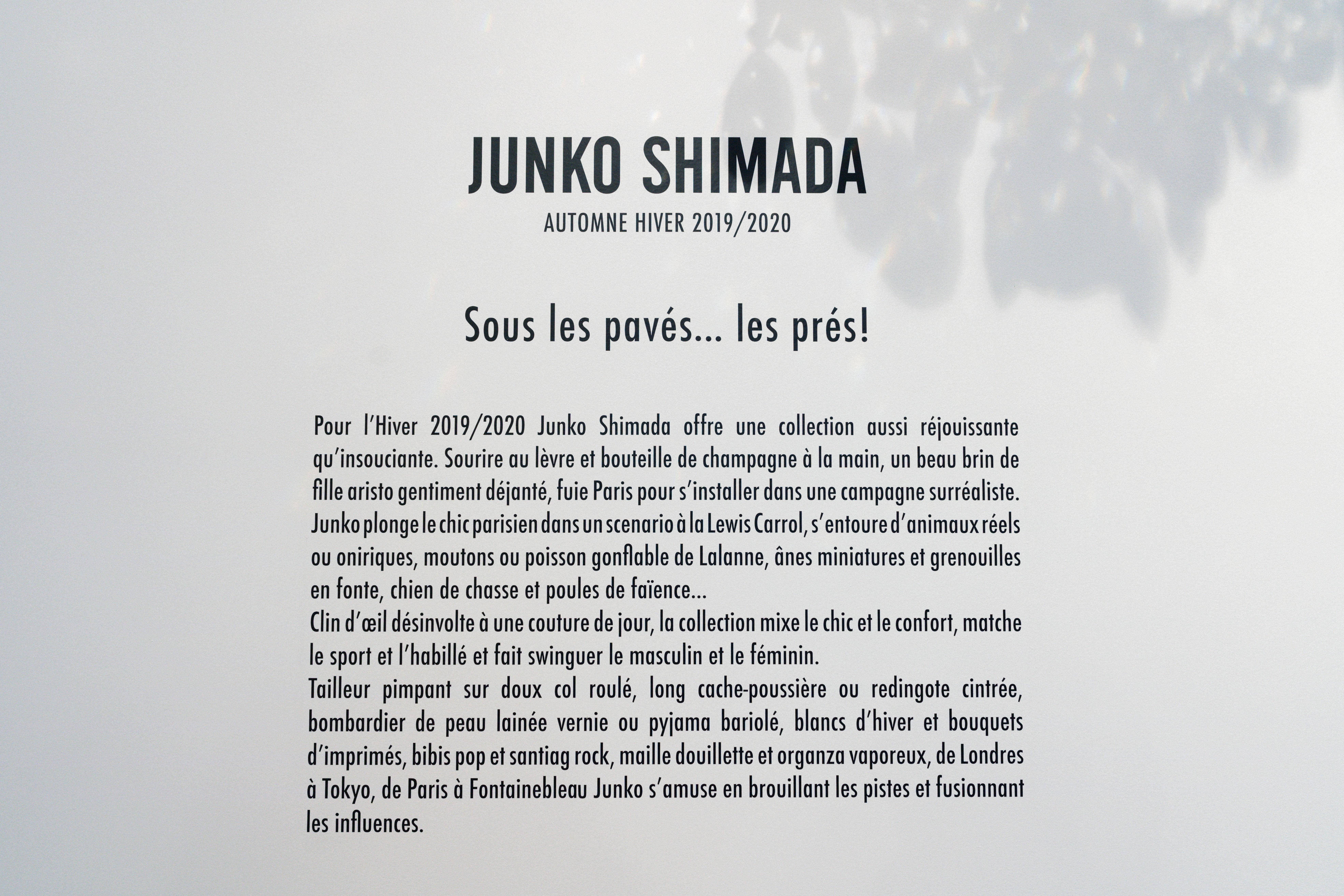 Pourl’Hiver 2019/2020 JunkoShimada offre une collection aussi réjouissante qu’insouciante.Sourireau lèvre et bouteille de champagne à la main,un beau brin de fille aristogentiment déjanté, fuitParis pour s’installer dans une campagne surréaliste.Junko plonge le chic parisiendans un scenario à la Lewis Carrol, s’entoure d’animaux réels ou oniriques, moutons ou poisson gonflablede Lalanne, ânes miniatures etgrenouilles en fonte, chien de chasse et poules de faïence…Clin d’œil désinvolte à une couture de jour, la collection mixe le chic et le confort, matche le sport et l’habillé et fait swinguer le masculin et le féminin.Tailleur pimpant sur doux col roulé, longcache-poussière ou redingote cintrée, bombardier de peau lainée vernie ou pyjama bariolé, blancs d’hiver et bouquets d’imprimés,bibis pop et santiag rock, maille douillette et organza vaporeux, de Londres à Tokyo, de Paris à Fontainebleau Junko s’amuse en brouillant les pistes et fusionnant les influences.