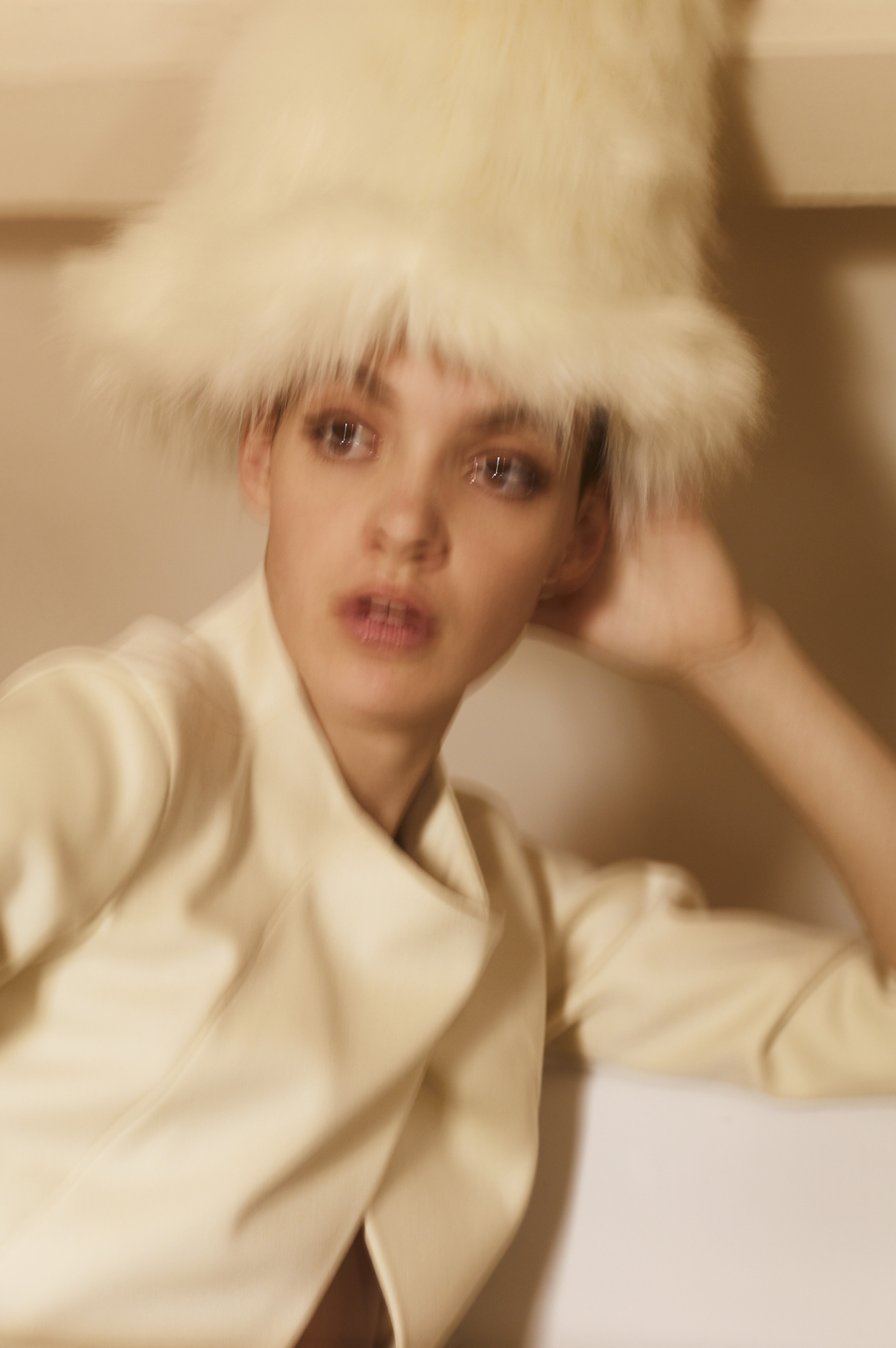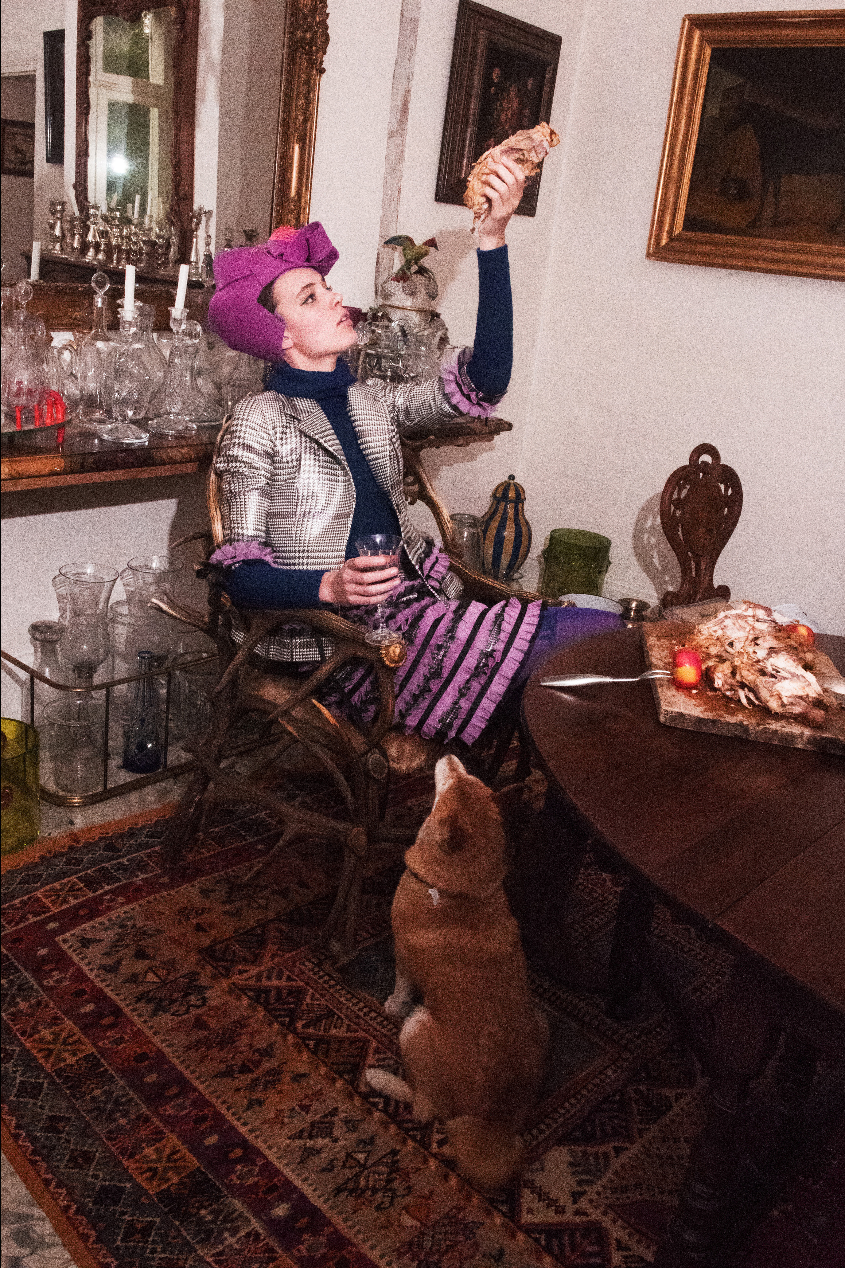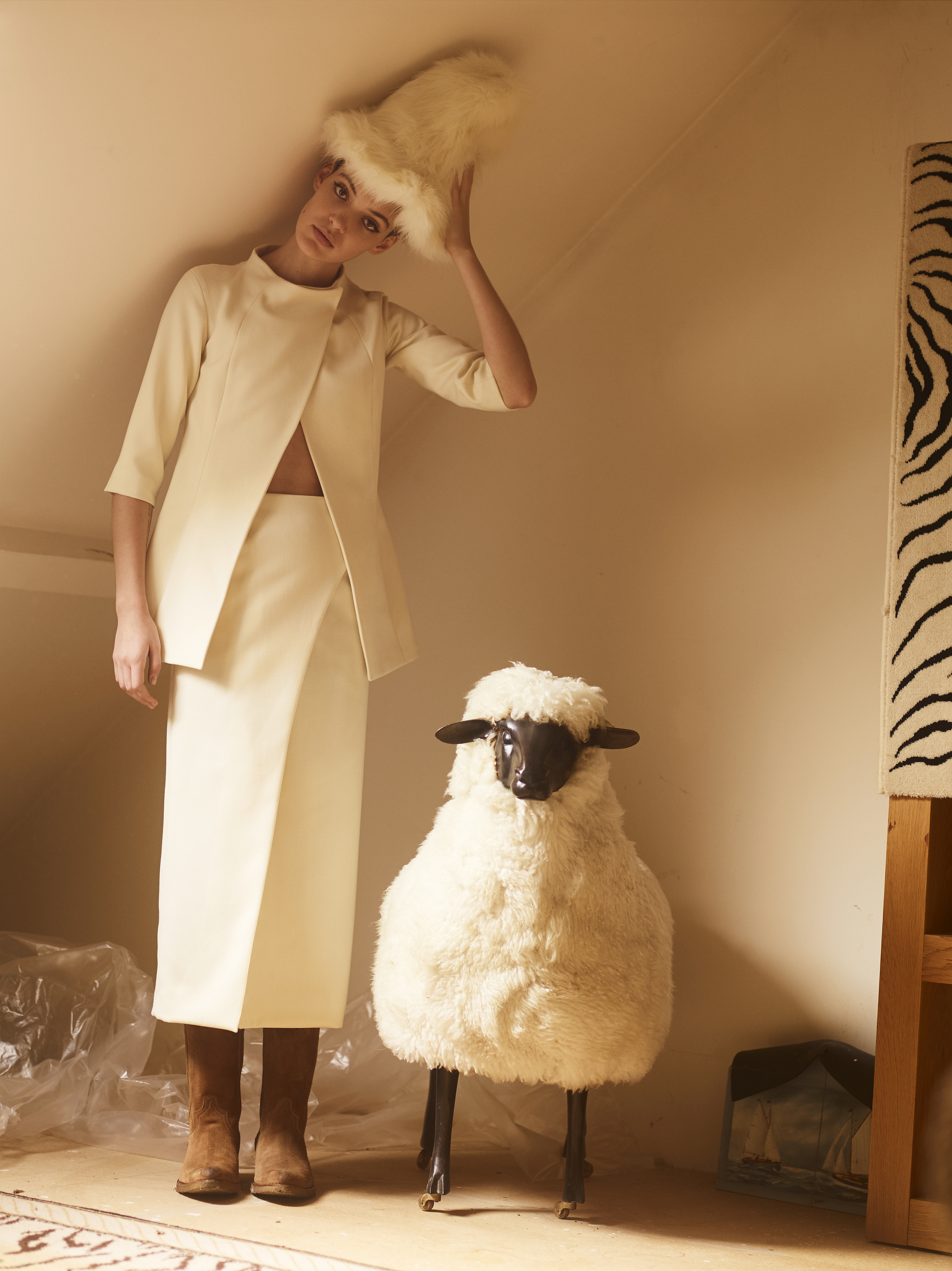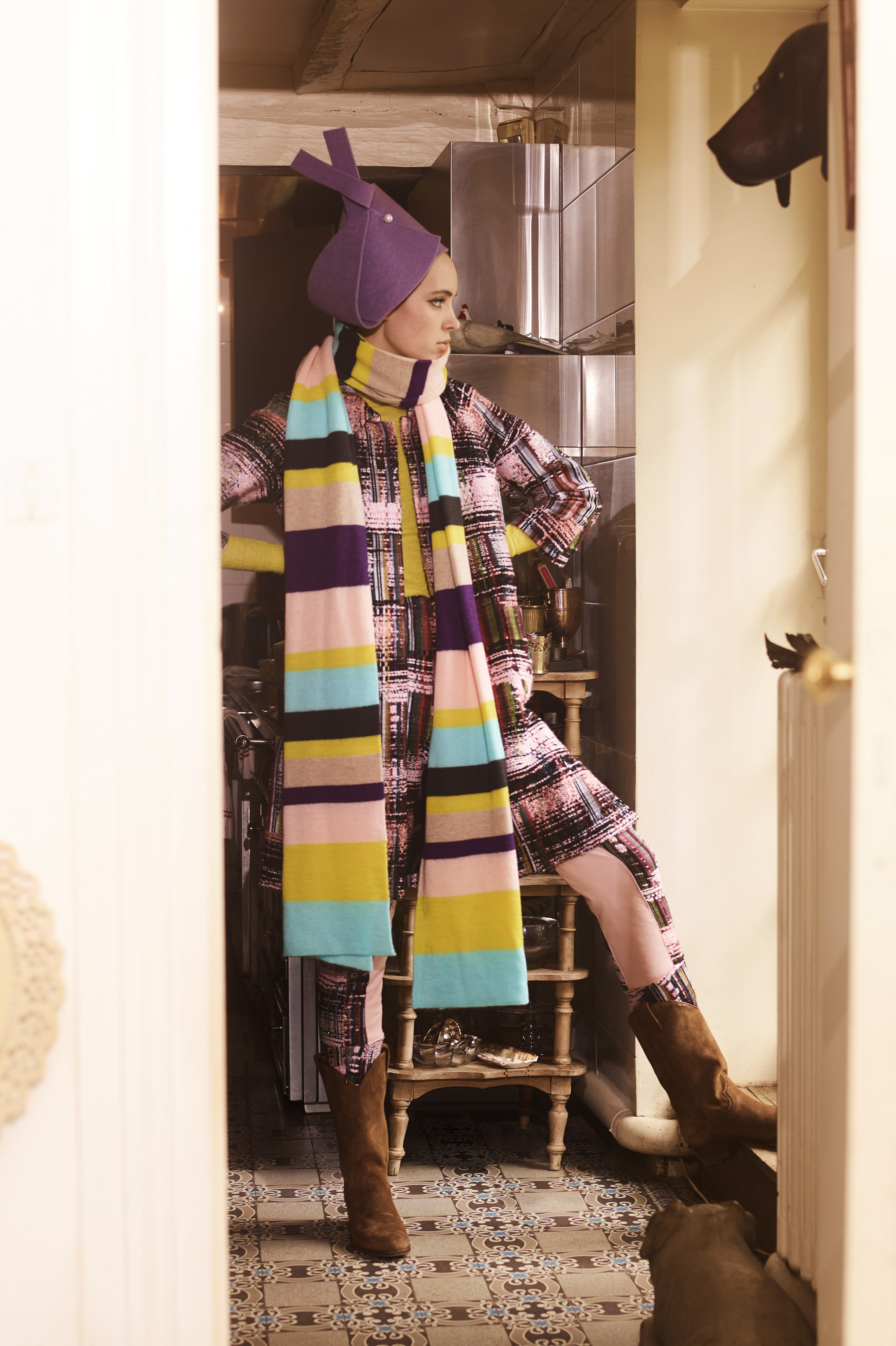 Pourl’Hiver 2019/2020 JunkoShimada offre une collection aussi réjouissante qu’insouciante.Sourireau lèvre et bouteille de champagne à la main,un beau brin de fille aristogentiment déjanté, fuitParis pour s’installer dans une campagne surréaliste.Junko plonge le chic parisiendans un scenario à la Lewis Carrol, s’entoure d’animaux réels ou oniriques, moutons ou poisson gonflablede Lalanne, ânes miniatures etgrenouilles en fonte, chien de chasse et poules de faïence…Clin d’œil désinvolte à une couture de jour, la collection mixe le chic et le confort, matche le sport et l’habillé et fait swinguer le masculin et le féminin.Tailleur pimpant sur doux col roulé, longcache-poussière ou redingote cintrée, bombardier de peau lainée vernie ou pyjama bariolé, blancs d’hiver et bouquets d’imprimés,bibis pop et santiag rock, maille douillette et organza vaporeux, de Londres à Tokyo, de Paris à Fontainebleau Junko s’amuse en brouillant les pistes et fusionnant les influences.