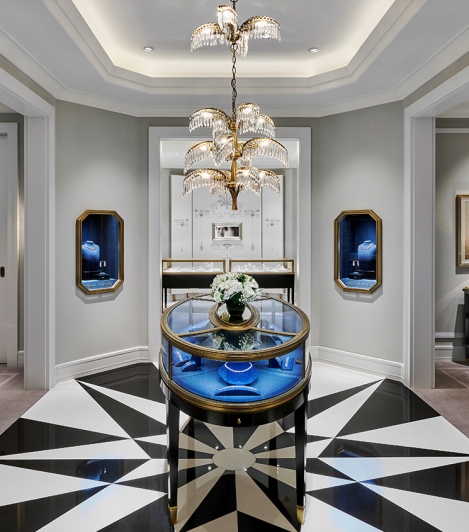 Ce nouveau salon offre un espace accessible à la fois depuis l’intérieur de l’hôtel et l’Avenue des Beaux-Arts. Il développe sur 124 mètres carrés une variation contemporaine du style Winston traditionnel. Pensé pour évoquer l’élégance et l’intimité d’une résidence privée, il s’ouvre sur un vaste hall d’entrée en marbre, décoré d’un somptueux motif noir et blanc en étoile, abritant une vaste vitrine centrale éclairée par un lustre réalisé en exclusivité. La décoration intérieure s’inspire de la palette grise signature de la Maison à laquelle viennent s’ajouter des meubles sur mesure en laque et bronze vieilli. Des espaces dédiés mettent en valeur la diversité des pièces exceptionnelles de Harry Winston et permettent aux clients de bénéficier en toute discrétion de l’expérience hautement personnalisée qui a fait la renommée de la Maison. Une salle de vente privée est également disponible pour vivre ce moment en toute intimité.