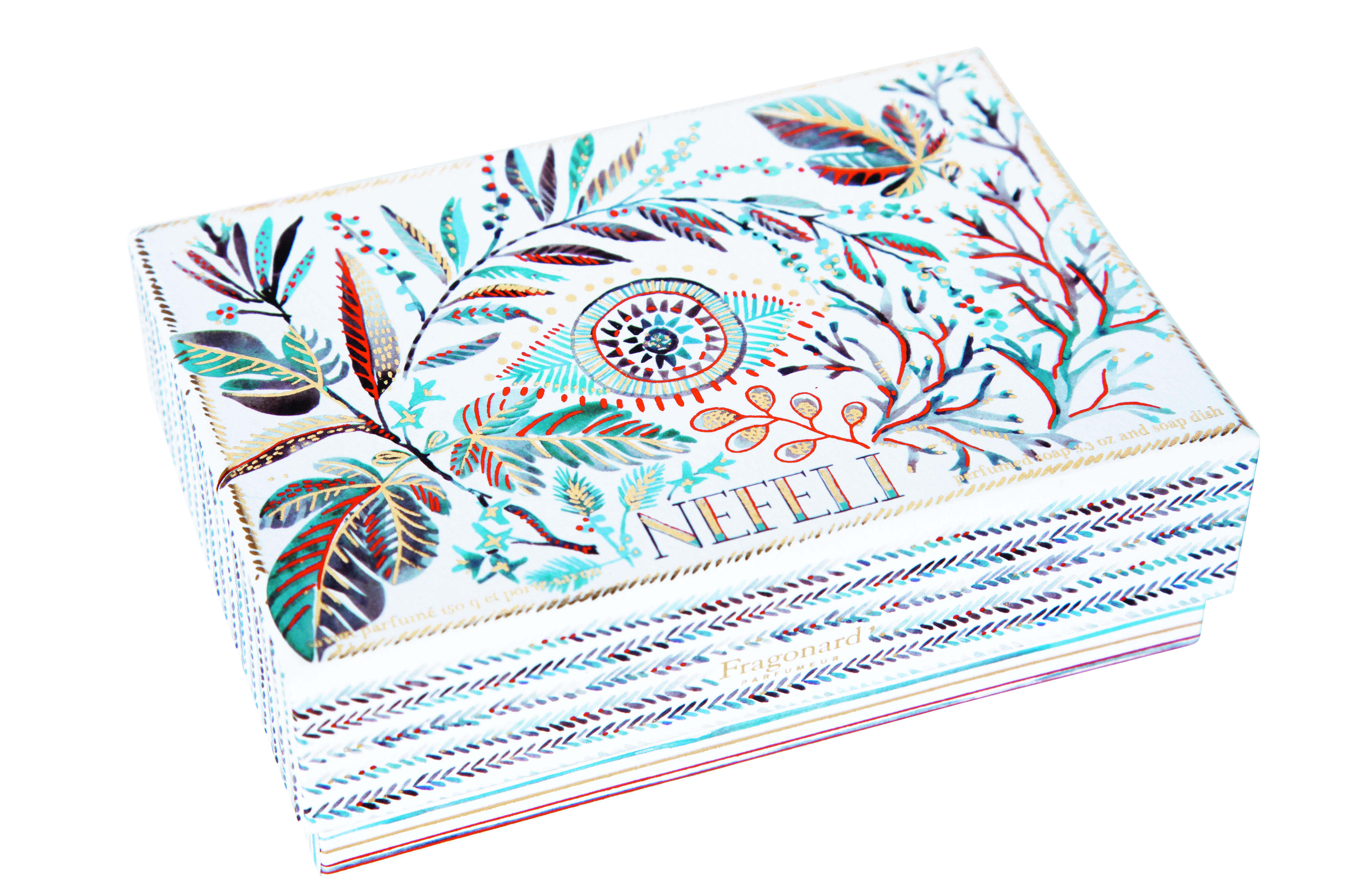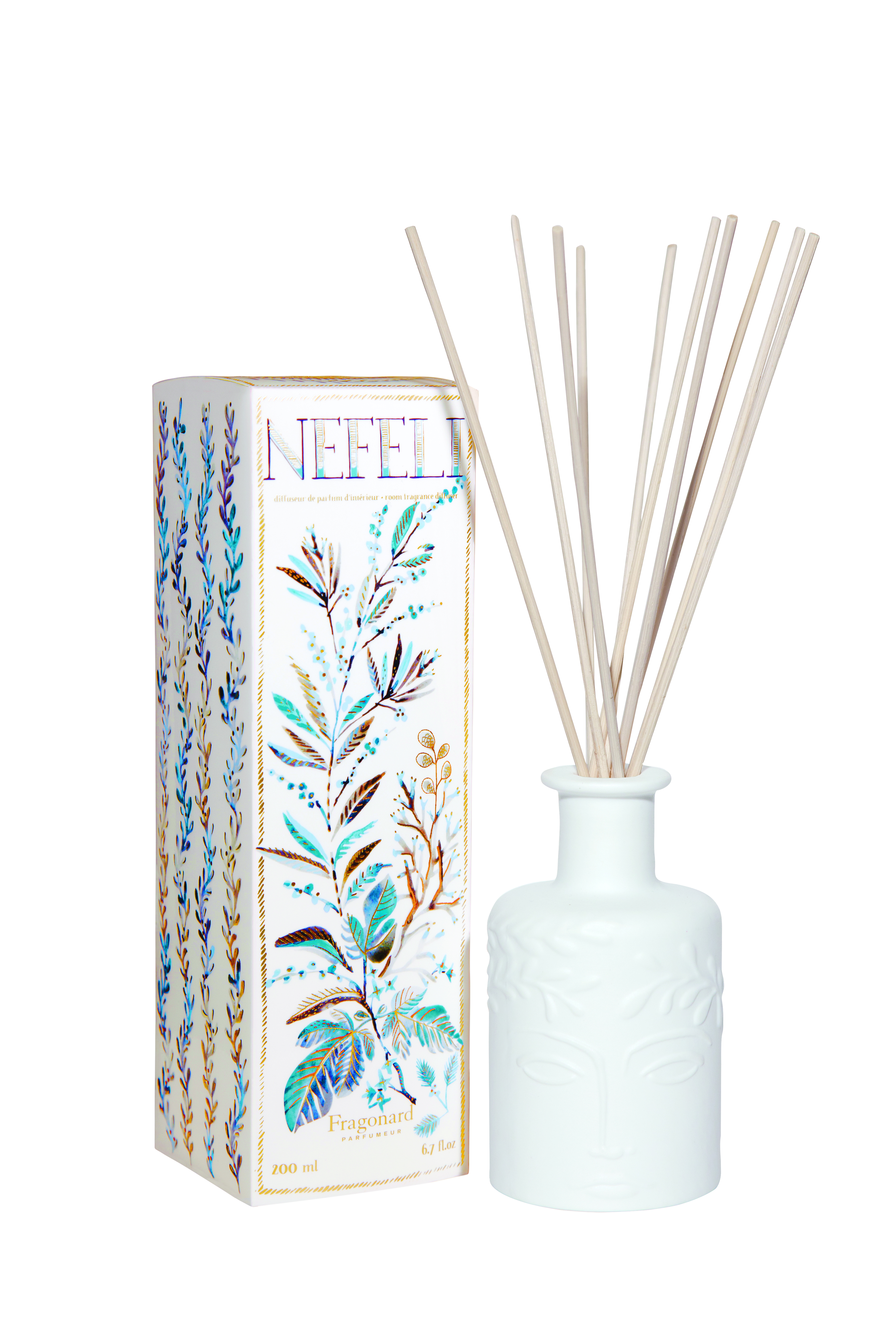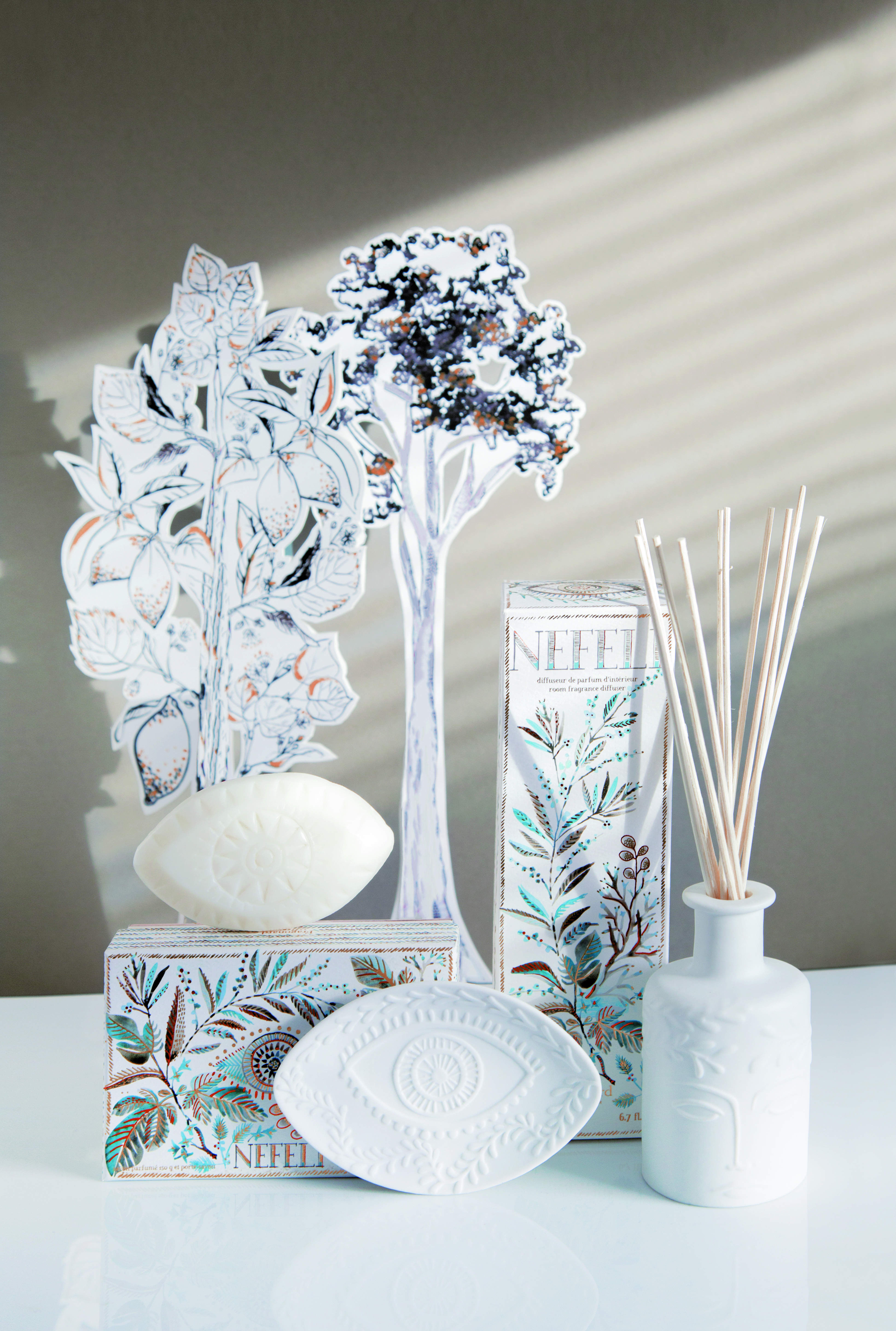 Alliant notes hespéridées (bergamote, orange amère, néroli) aux notes vertes et aromatiques (feuilles et bois de figuier, cardamome, galbanum), Néféli porte en son cœur une douceur florale évanescente de rose, tilleul et ylang-ylang. Une fragrance divine déclinée en diffuseur et savon.