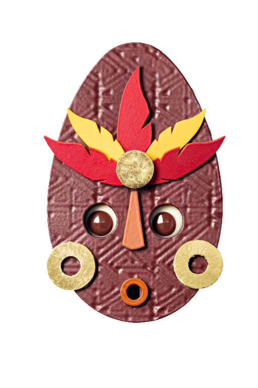 Brésil, Java, Ghana… Les terroirs jettent le masque. Où que l’on aille, les oeufs superposent leurs origines à des contrastes gourmands. Ils redécouvrent la plasticité de la matière. La logique du périple fait la lumière sur les inclinaisons naurelles du cacao. Les goûts épicés, fruités ou ronds posent les conditions d’un chocolat primitif, craquelé ou tatoué. Tandis que les pralinés fondants incitent à plonger dans l’immensité gourmande. Bas les masques, sur une fête pascale chatoyante et colorée. La chasse aux oeufs peut commencer.