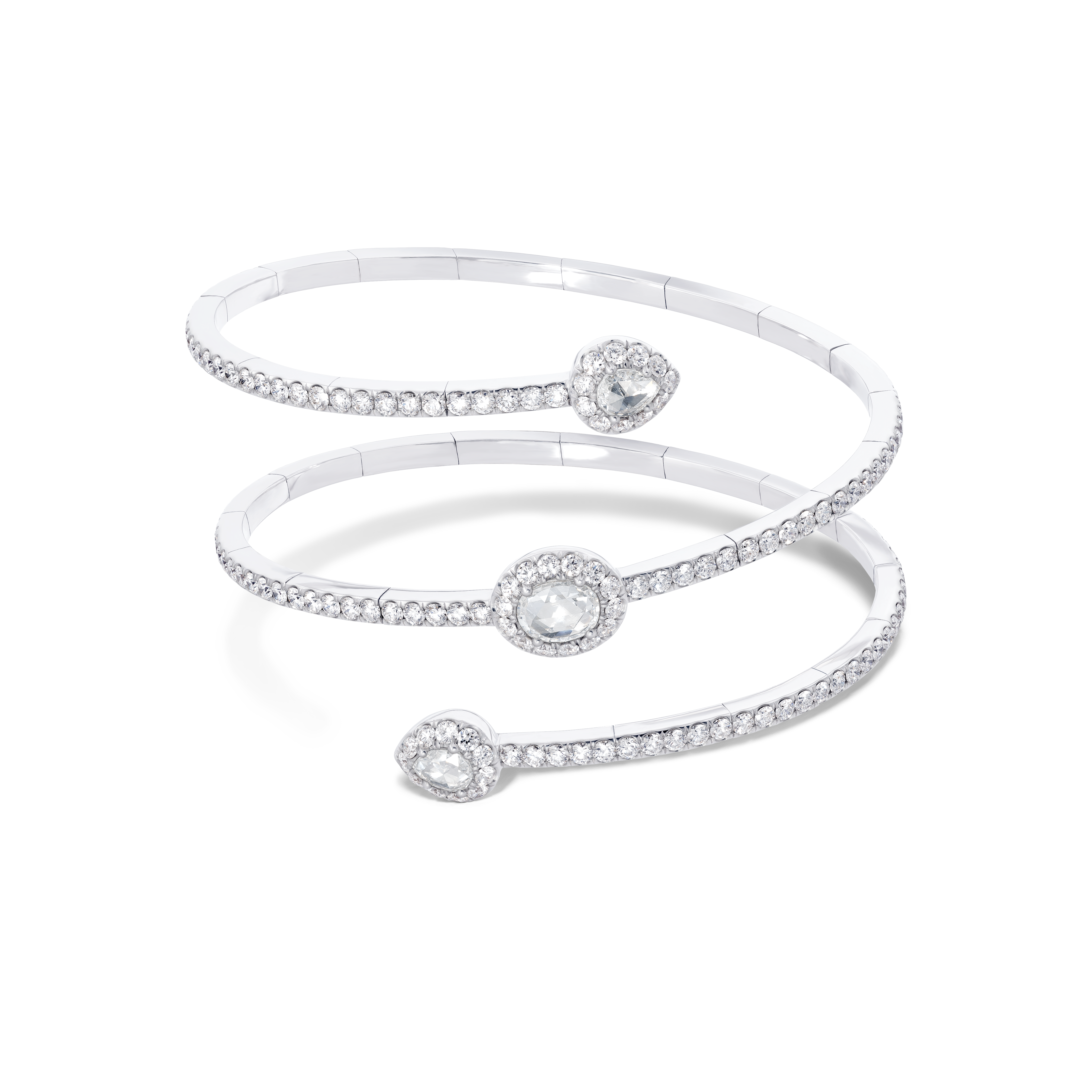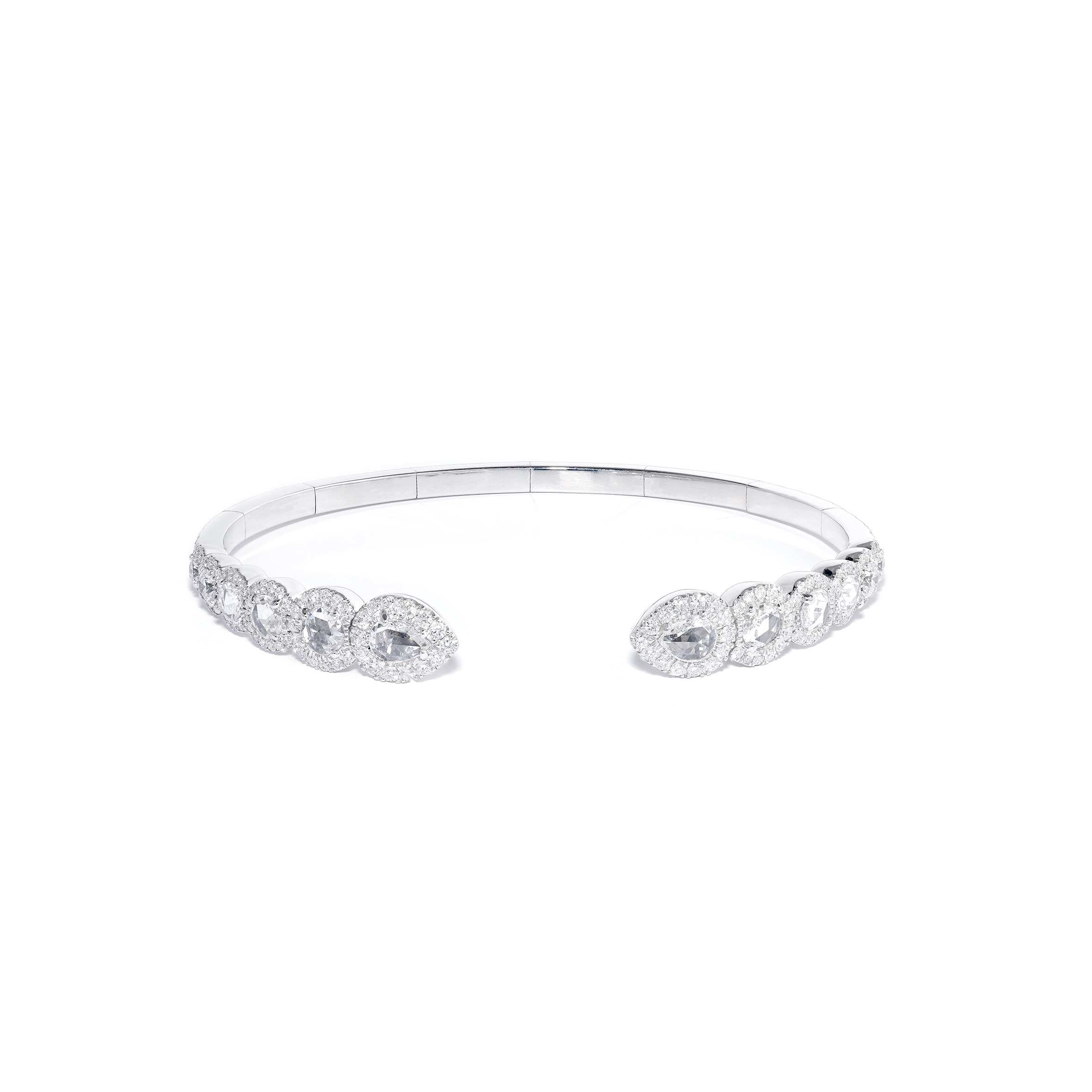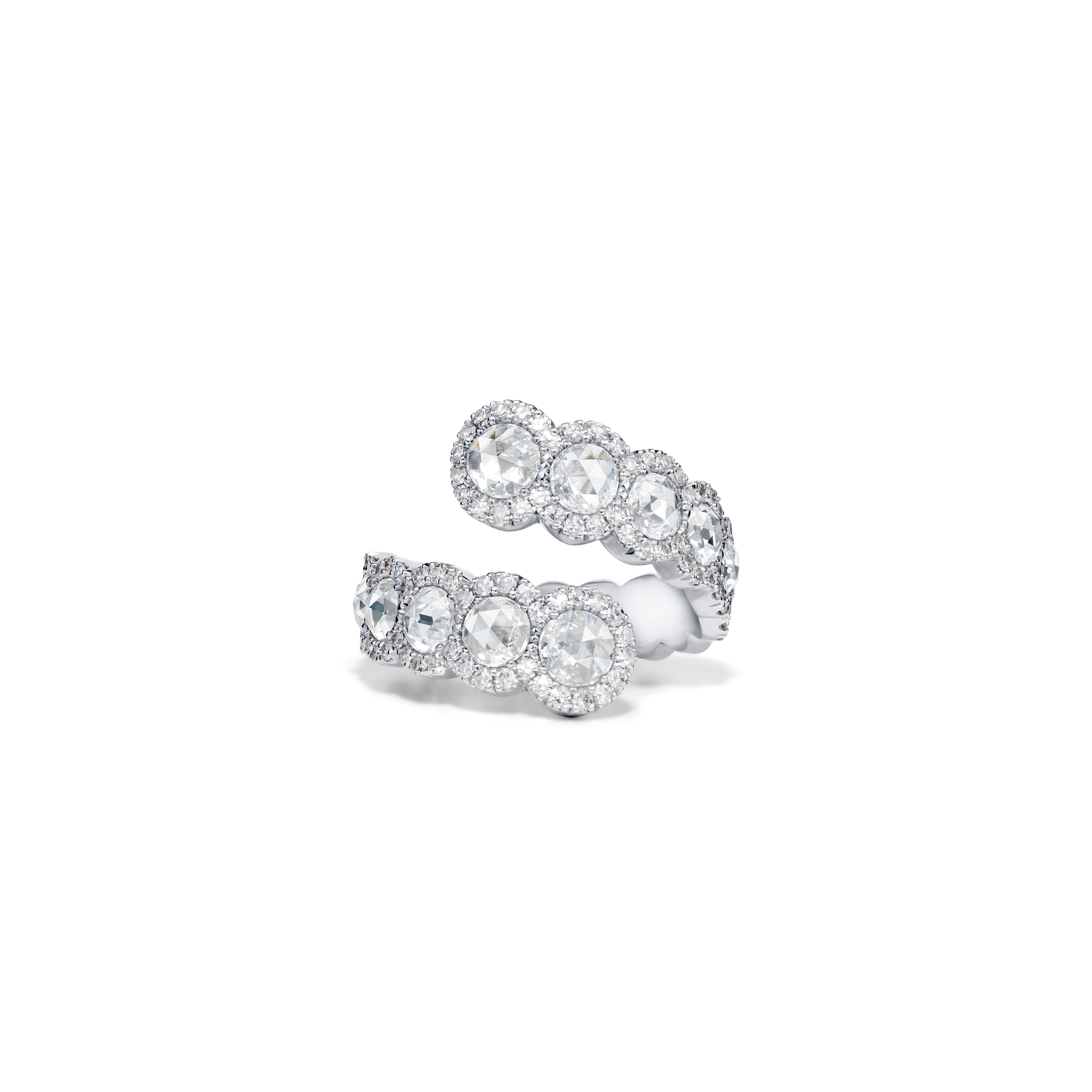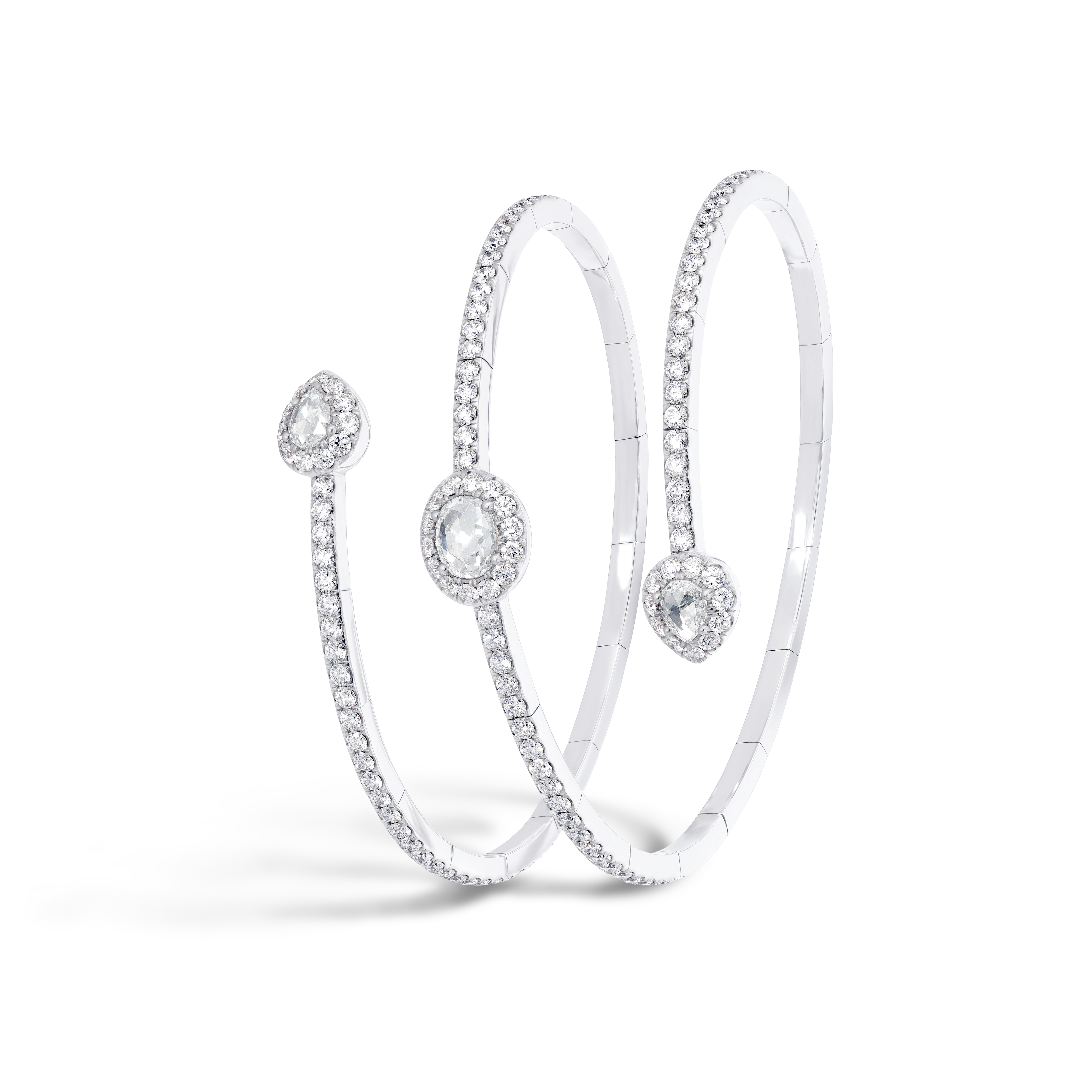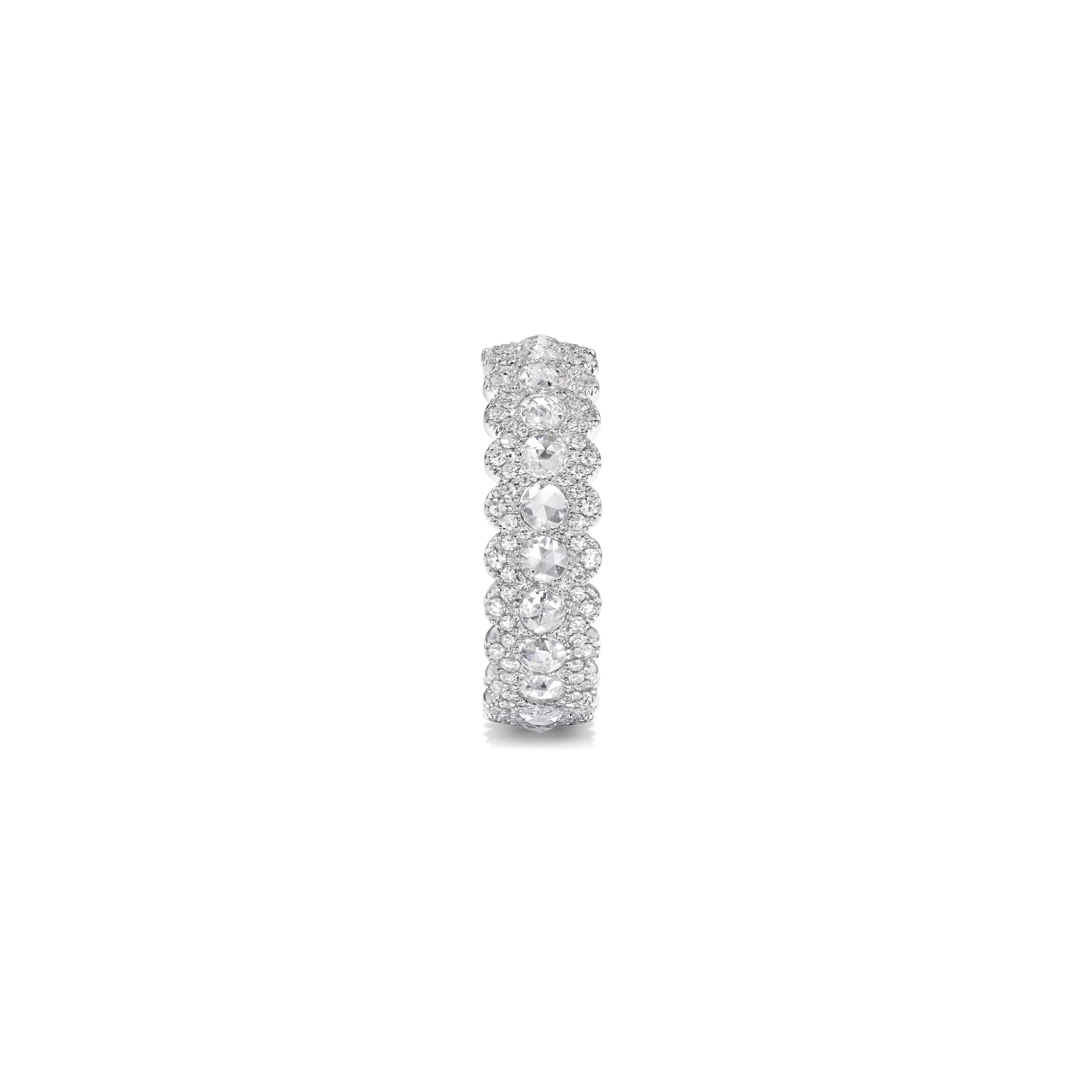 Les nouveaux modèles de la collection Rose Cut se composent: de créoles de trois tailles différentes; de cinq bagues: l’une une interprétation délicate du modèle iconique de la bague rose cut, deux autres bagues avec un design en toi et moi et les deux dernières bagues de style plus contemporain. Une paire de boucles d’oreilles subtile avec un trio de diamants taille rose; trois magnifiques bracelets souples, chacun légèrement différent mais toujours avec le diamant taille rose à l’honneur et un sautoir en cascade complètent cette collection.
