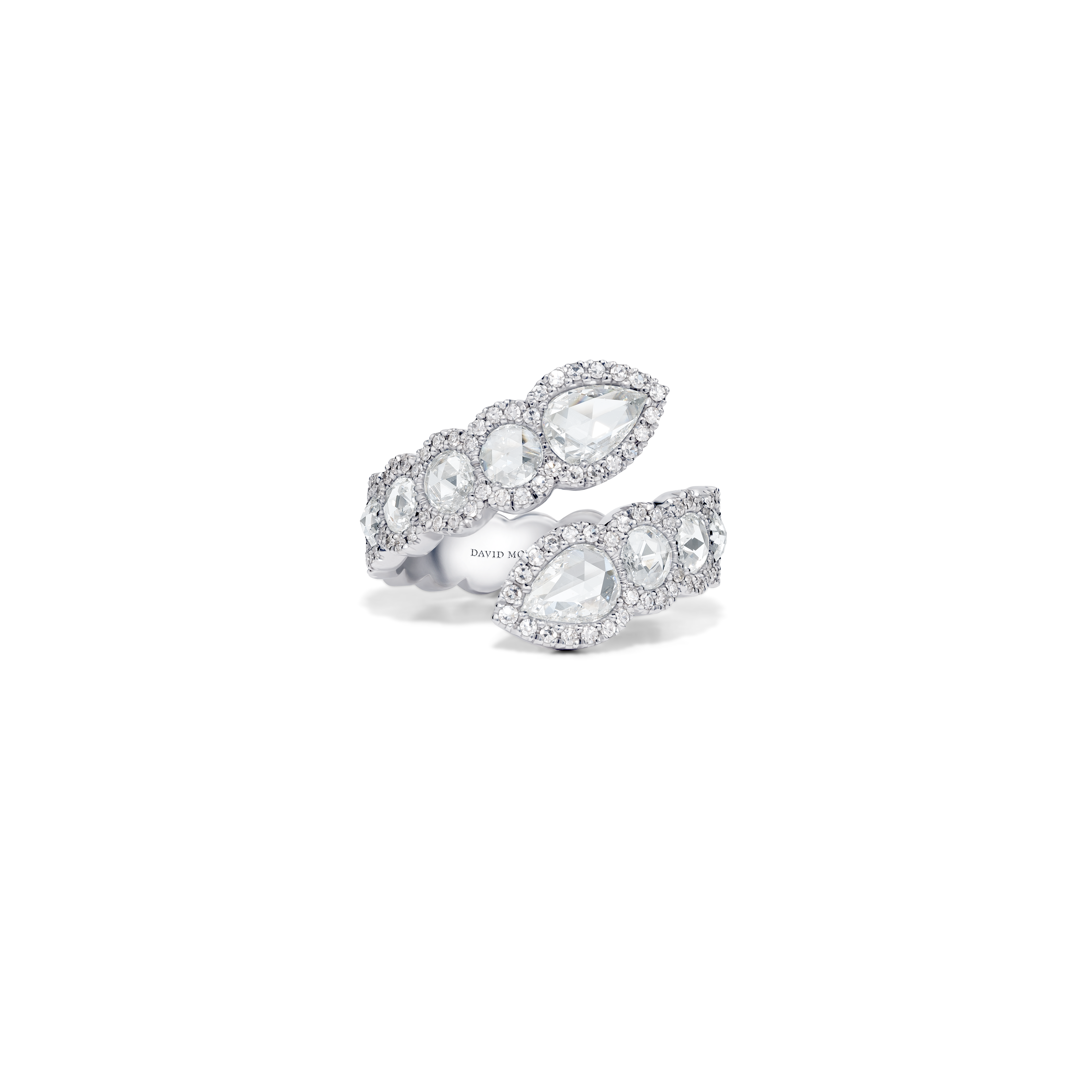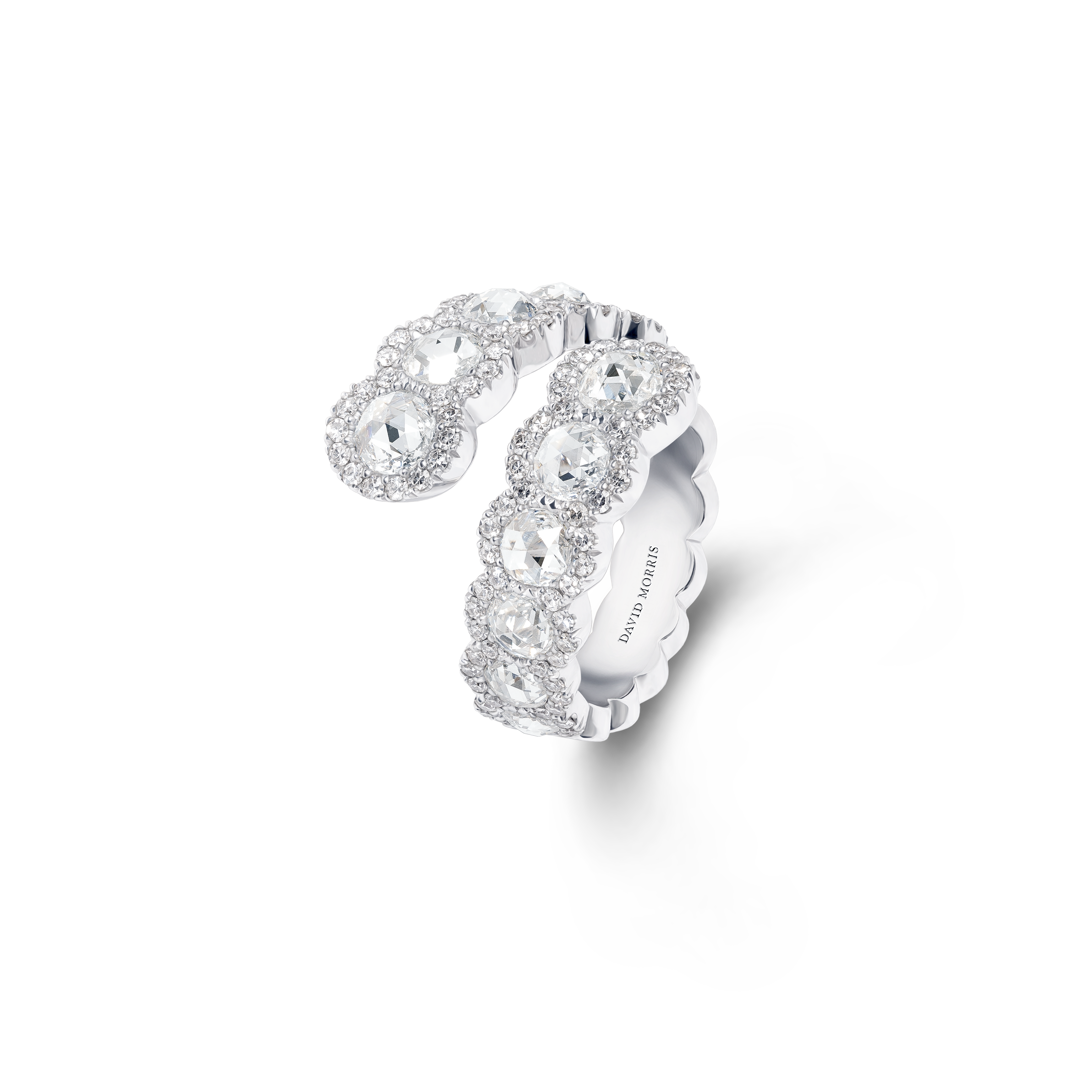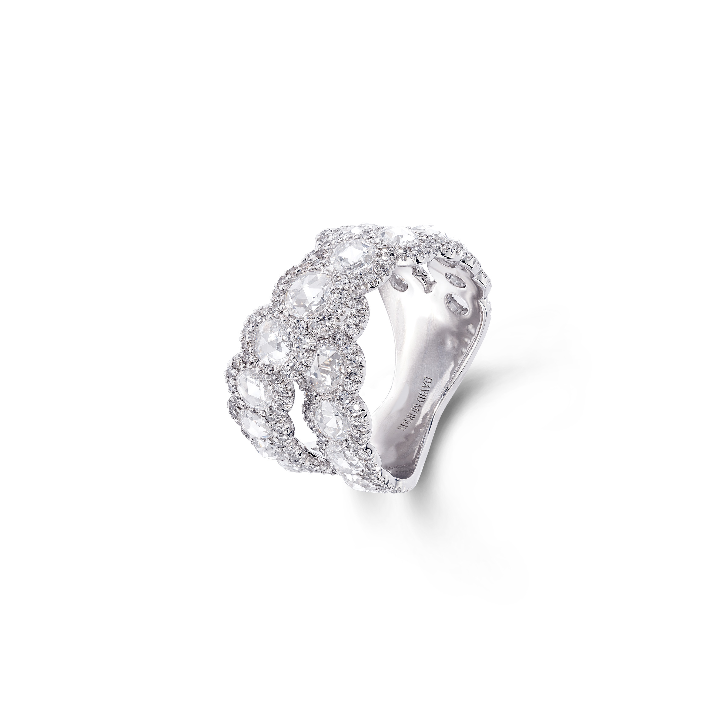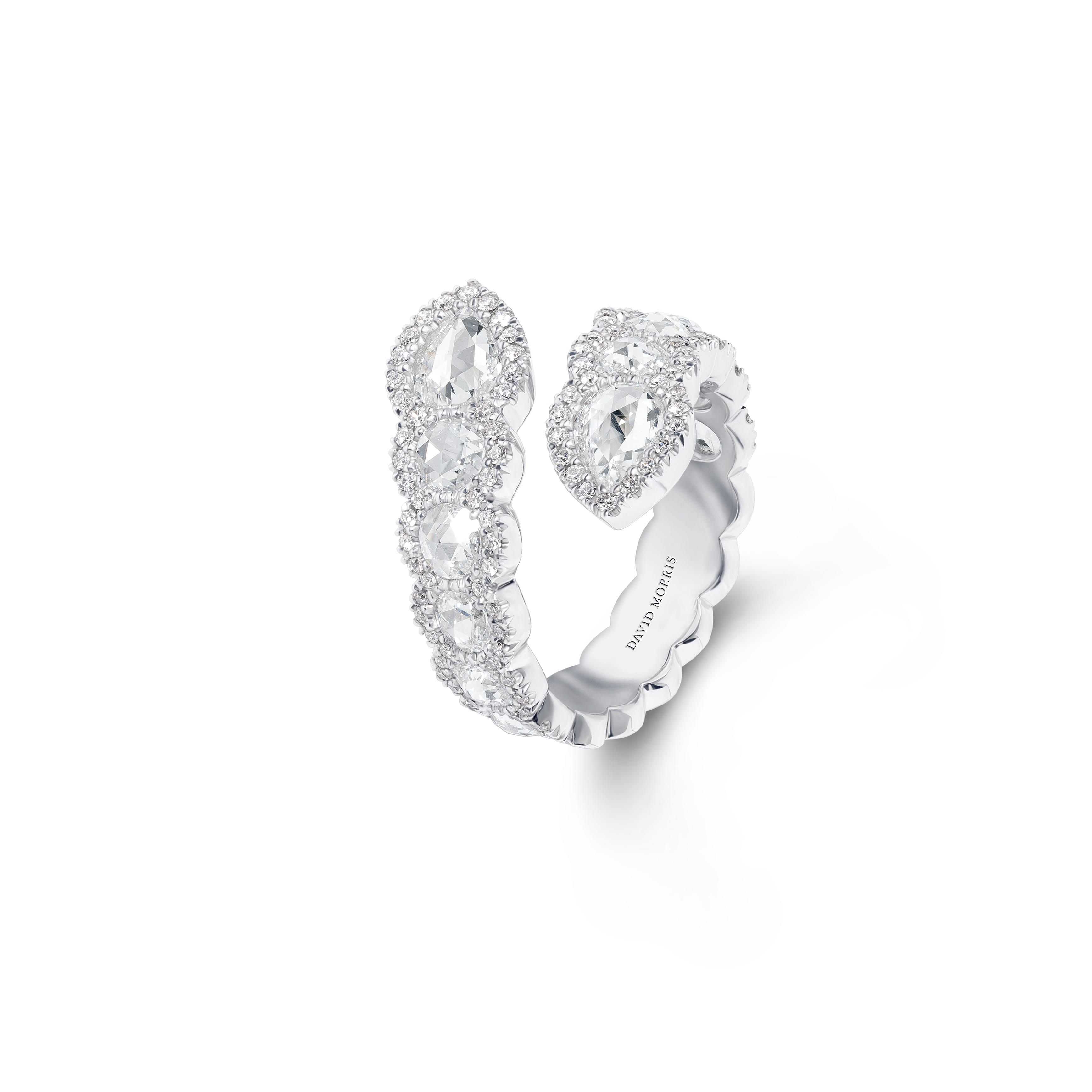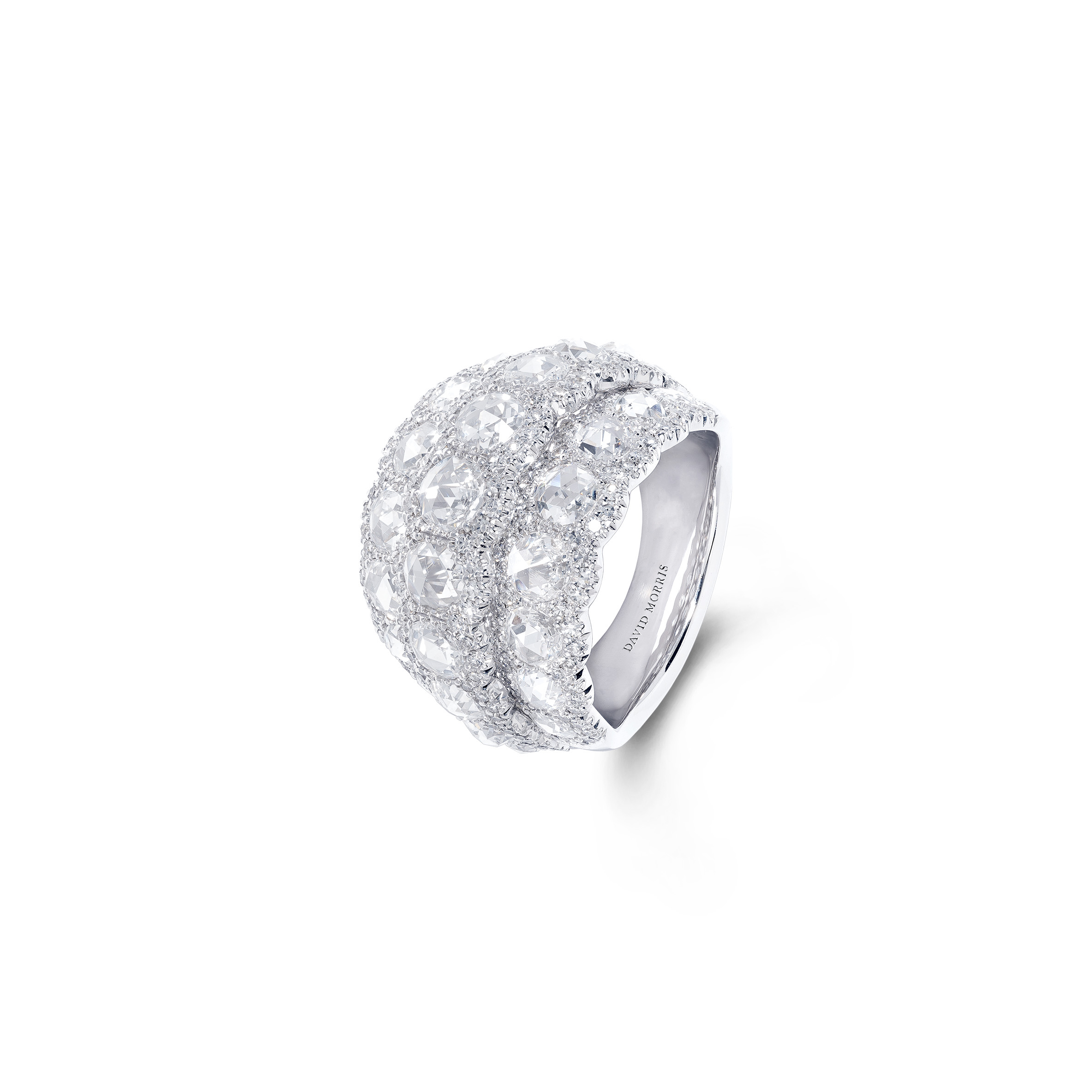 Ces diamants féminins et translucides sont taillés de telle manière qu’ils sont plats à la base et qu’ils possèdent de multiples facettes. Magnifiquement contrastées par le micro sertissage des diamants, signature exclusive de David Morris, ces pierres précieuses ont été transformées en bijoux uniques et contemporains.
