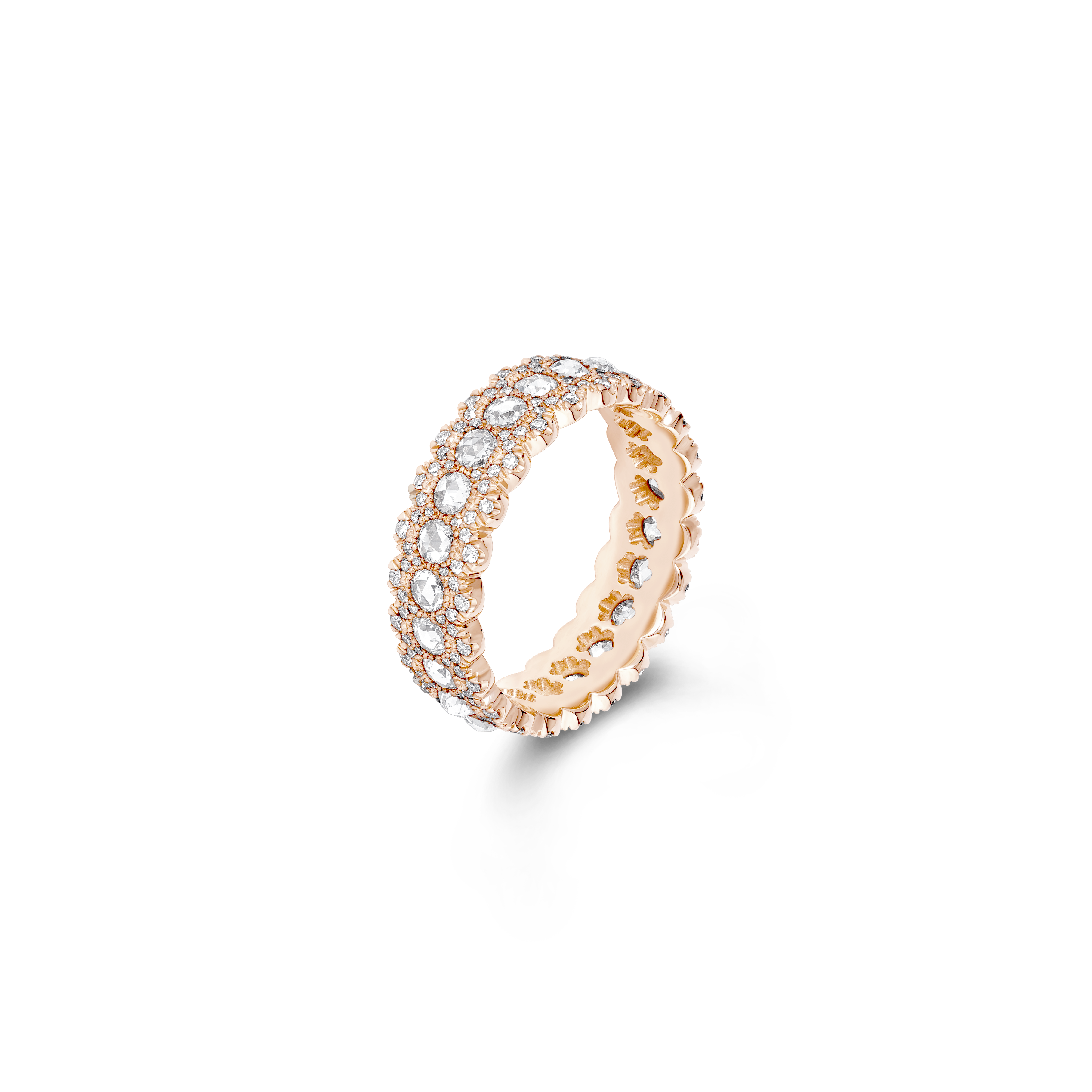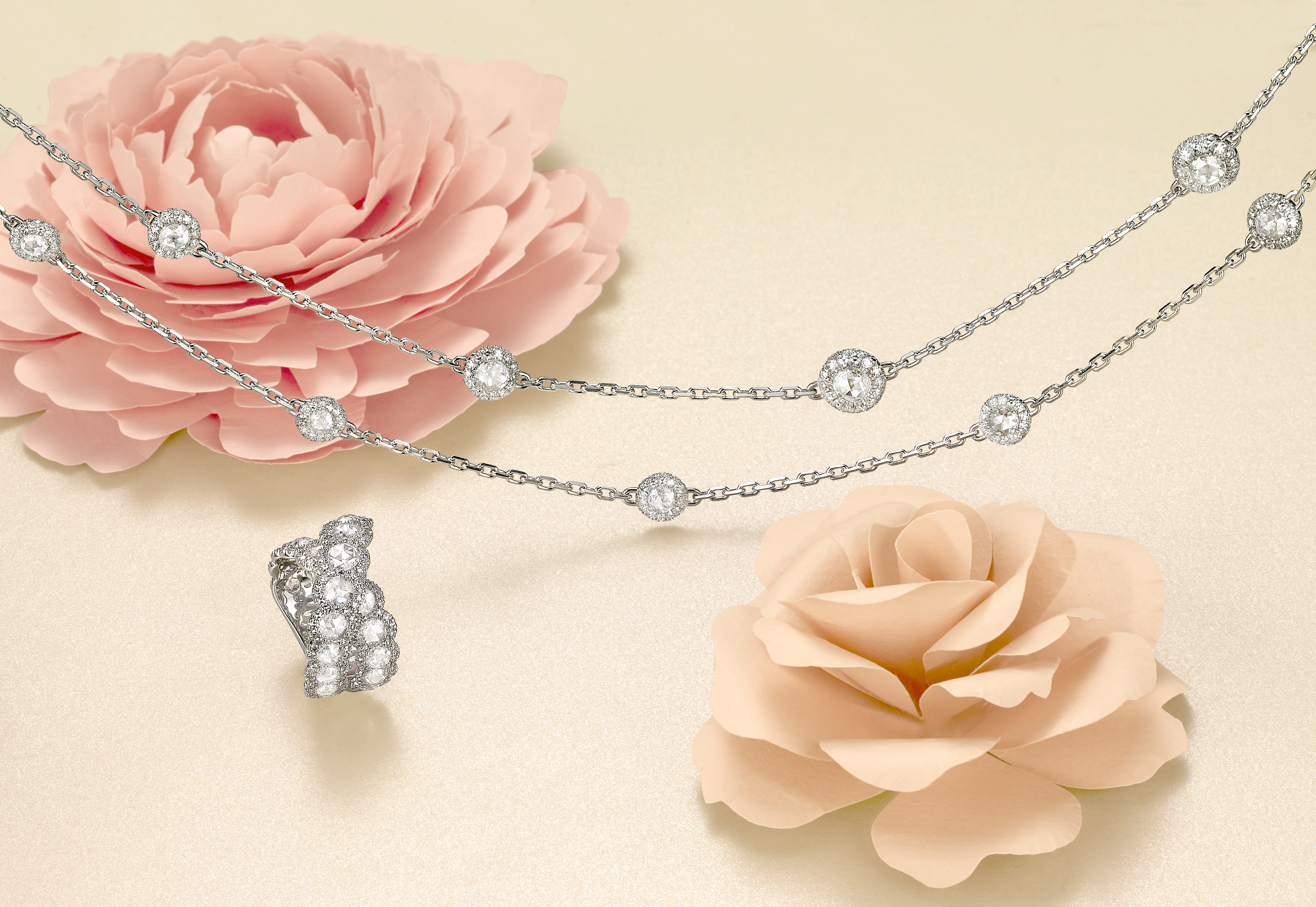 Chaque pièce de dentelle faite à la main raconte une histoire à travers ses fils tissés. Le design romantique et le toucher délicat de ce tissu précieux ont inspiré les nouvelles créations de la collection Rose Cut. Découverts pour la première fois au XVIe siècle en Inde, les diamants taille rose étaient les plus en vogue pendant l’époque victorienne, où ils étaient admirés pour leur ressemblance avec les pétales d’une rose qui s’ouvraient délicatement.