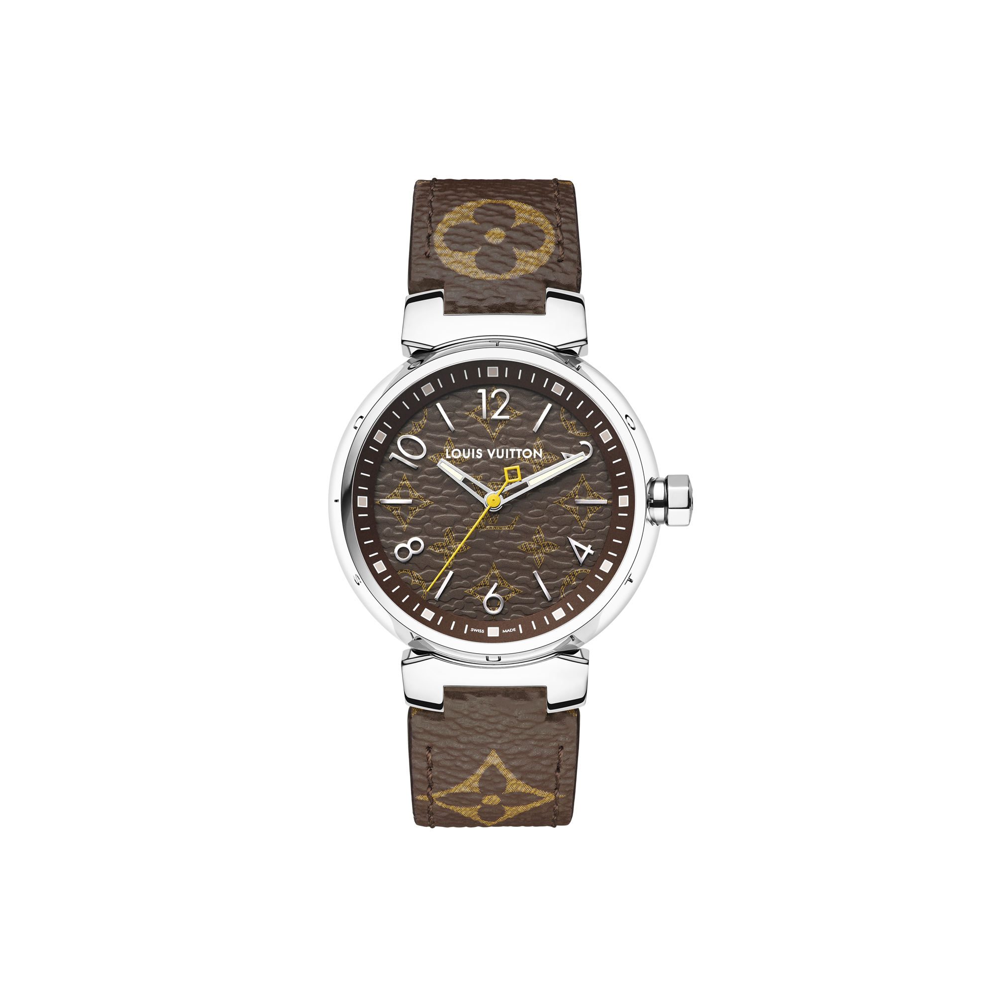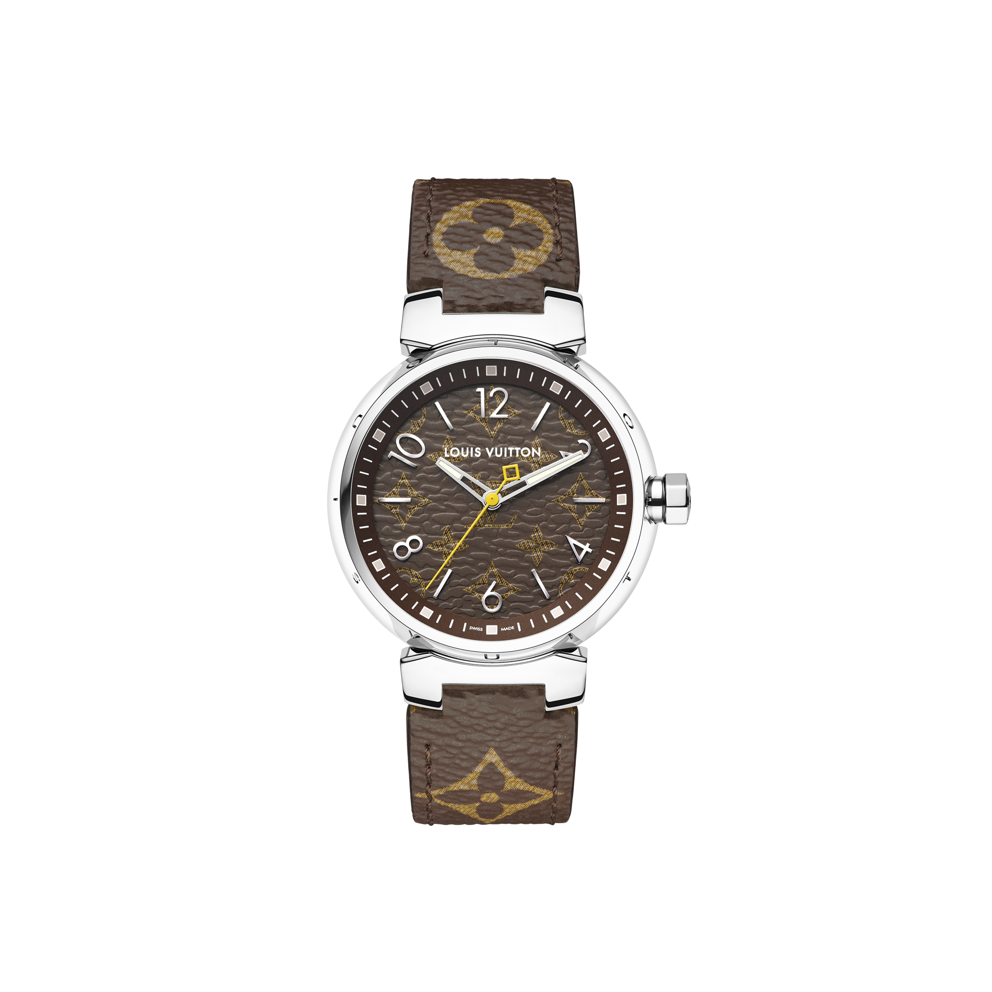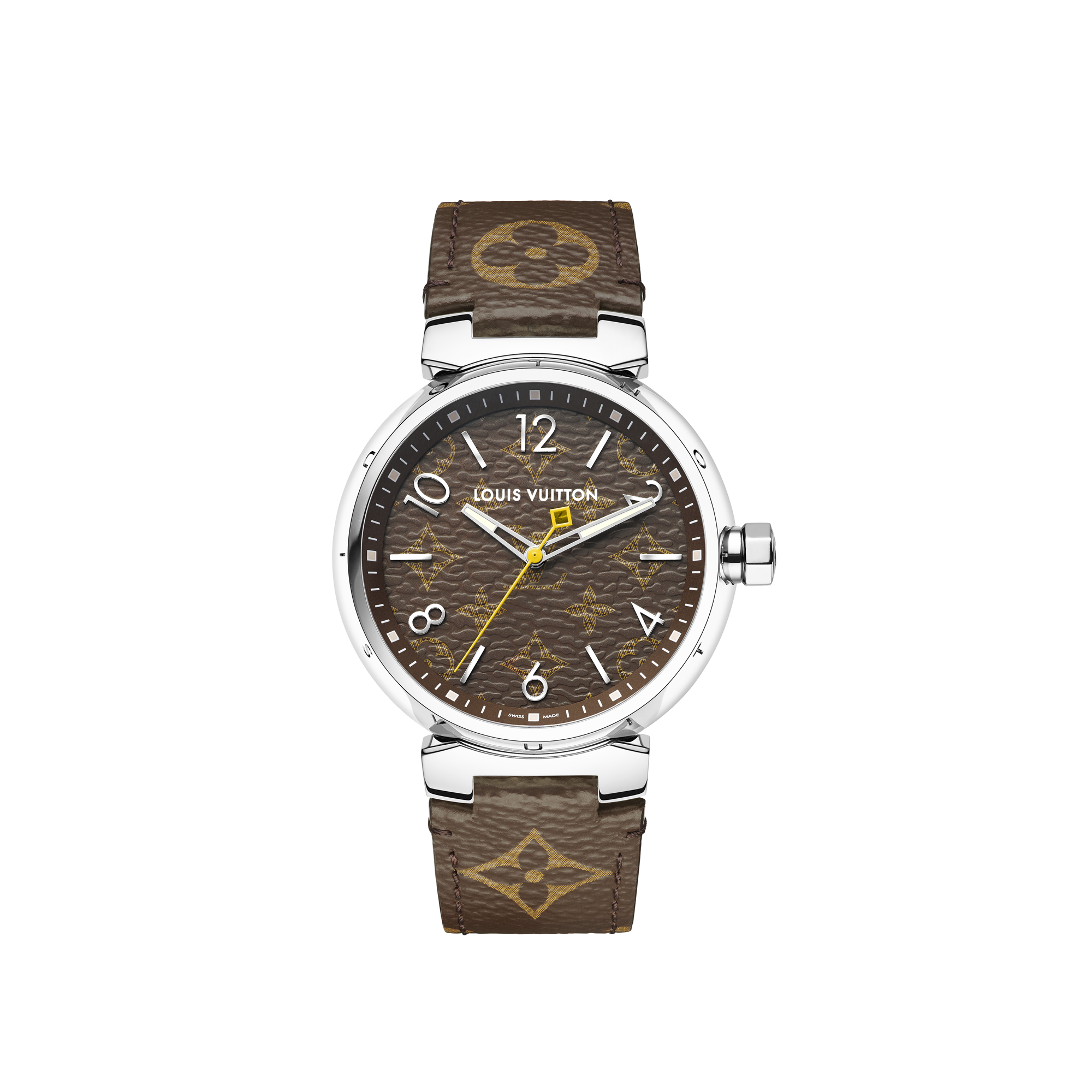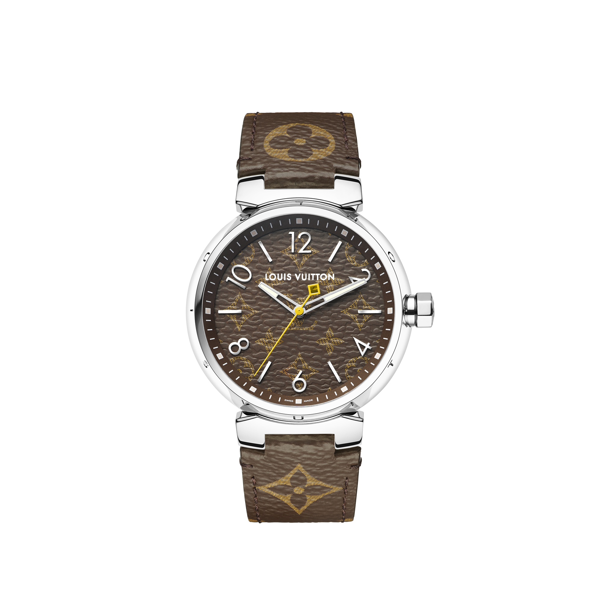 En 2002, Louis Vuitton marque son entrée dans l’univers horloger par la création de la montre Tambour, une forme de montre inédite dans l’horlogerie qui va intégrer dans son design toutes les valeurs de la Maison : les 12 lettres Louis Vuitton gravées dans le boîtier en face de chaque heure, le brun du cadran inspiré du célèbre Monogram ou encore le jaune des aiguilles des secondes rappelant le fil ciré des sacs Maison. Au-delà des multiples références – du modèle simple quartz trois aiguilles aux grandes complications –, Tambour va devenir un principe d’identité, une signature, alliant une allure intemporelle et des performances techniques renouvelées.