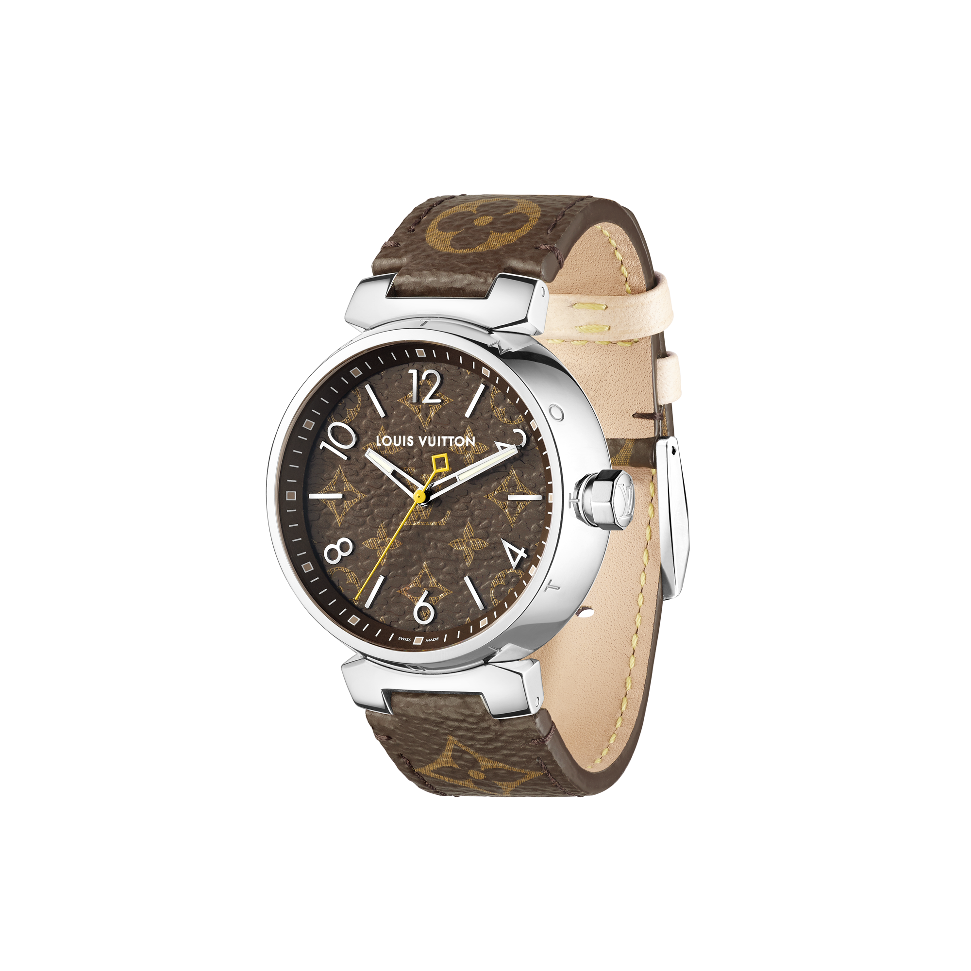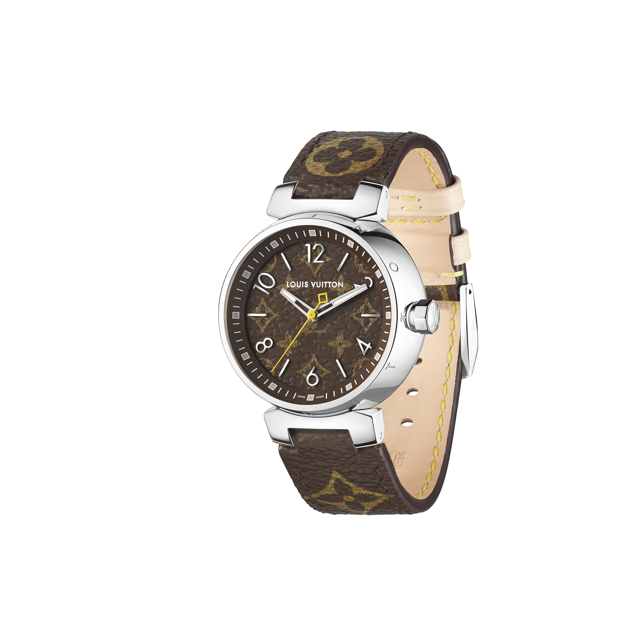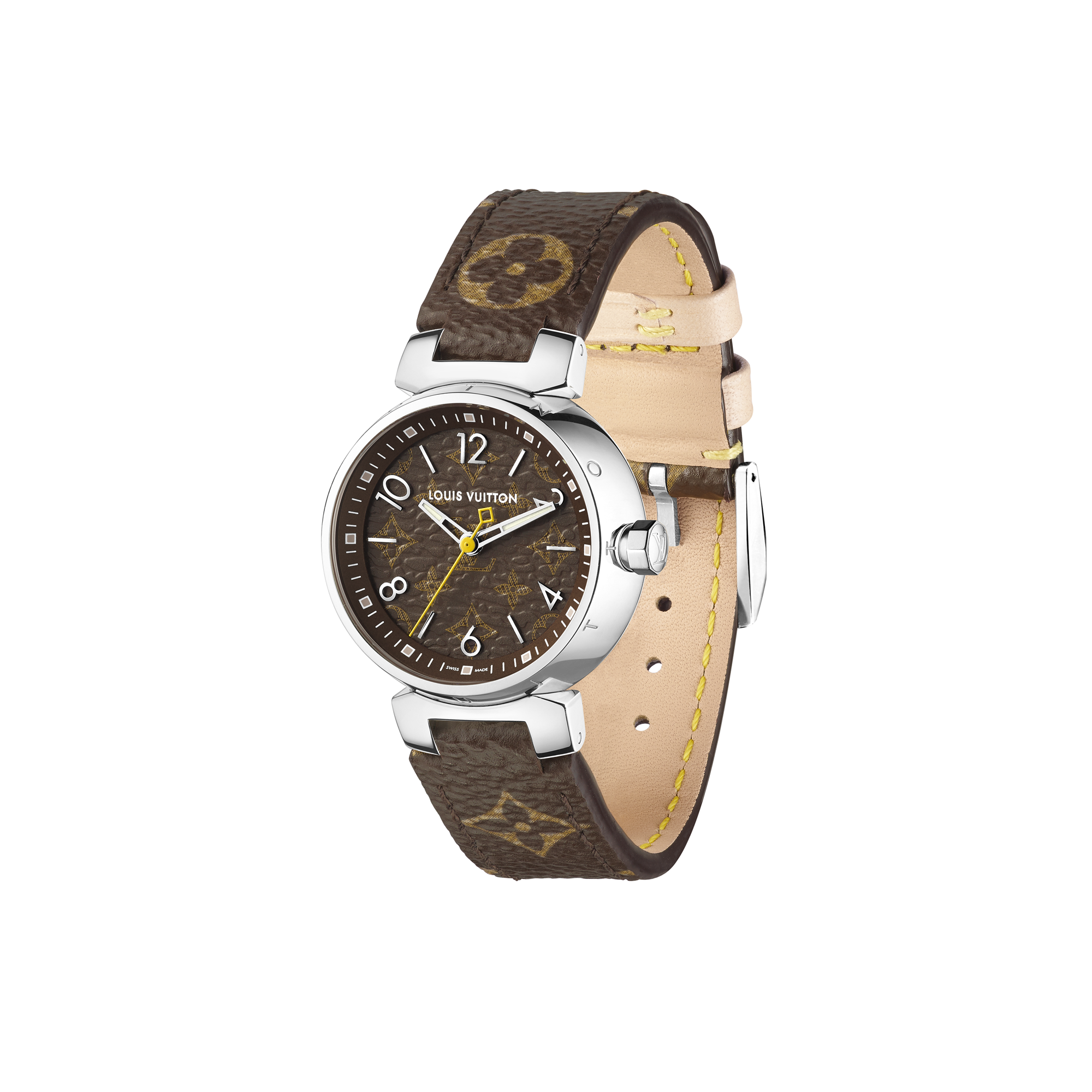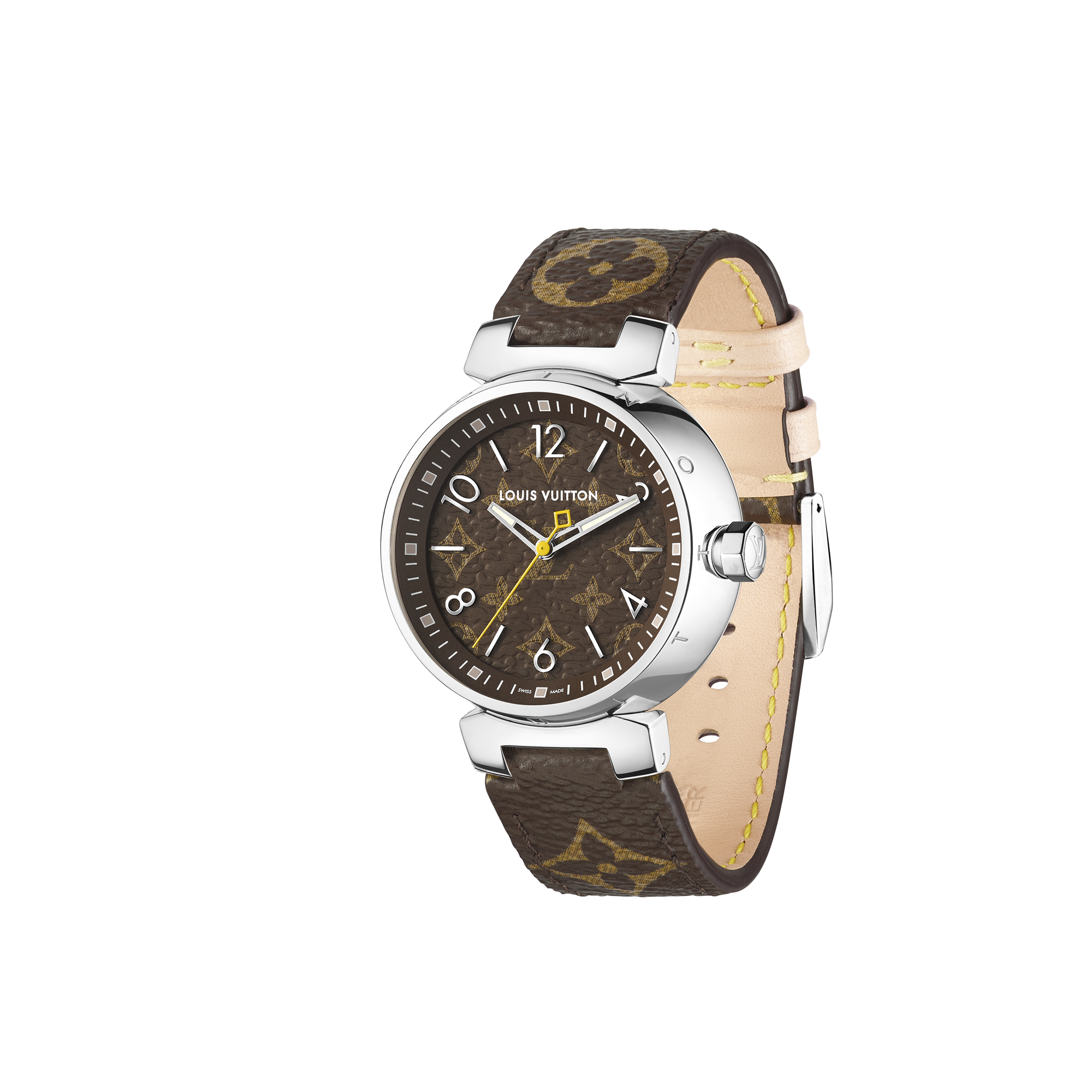 En 2002, Louis Vuitton marque son entrée dans l’univers horloger par la création de la montre Tambour, une forme de montre inédite dans l’horlogerie qui va intégrer dans son design toutes les valeurs de la Maison : les 12 lettres Louis Vuitton gravées dans le boîtier en face de chaque heure, le brun du cadran inspiré du célèbre Monogram ou encore le jaune des aiguilles des secondes rappelant le fil ciré des sacs Maison. Au-delà des multiples références – du modèle simple quartz trois aiguilles aux grandes complications –, Tambour va devenir un principe d’identité, une signature, alliant une allure intemporelle et des performances techniques renouvelées.