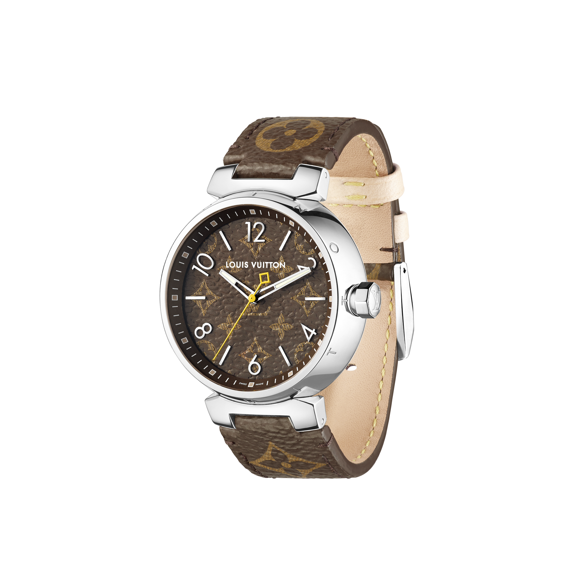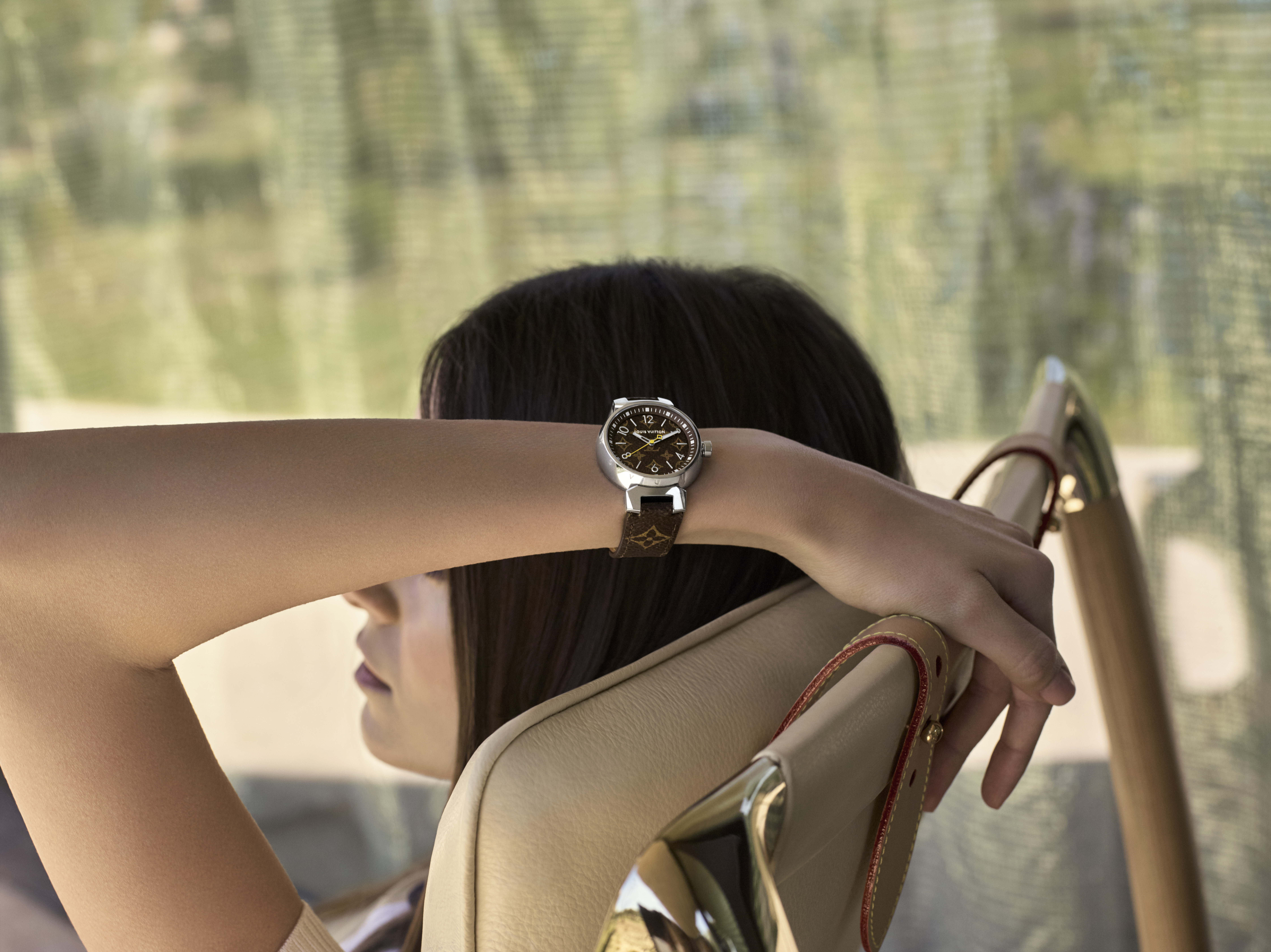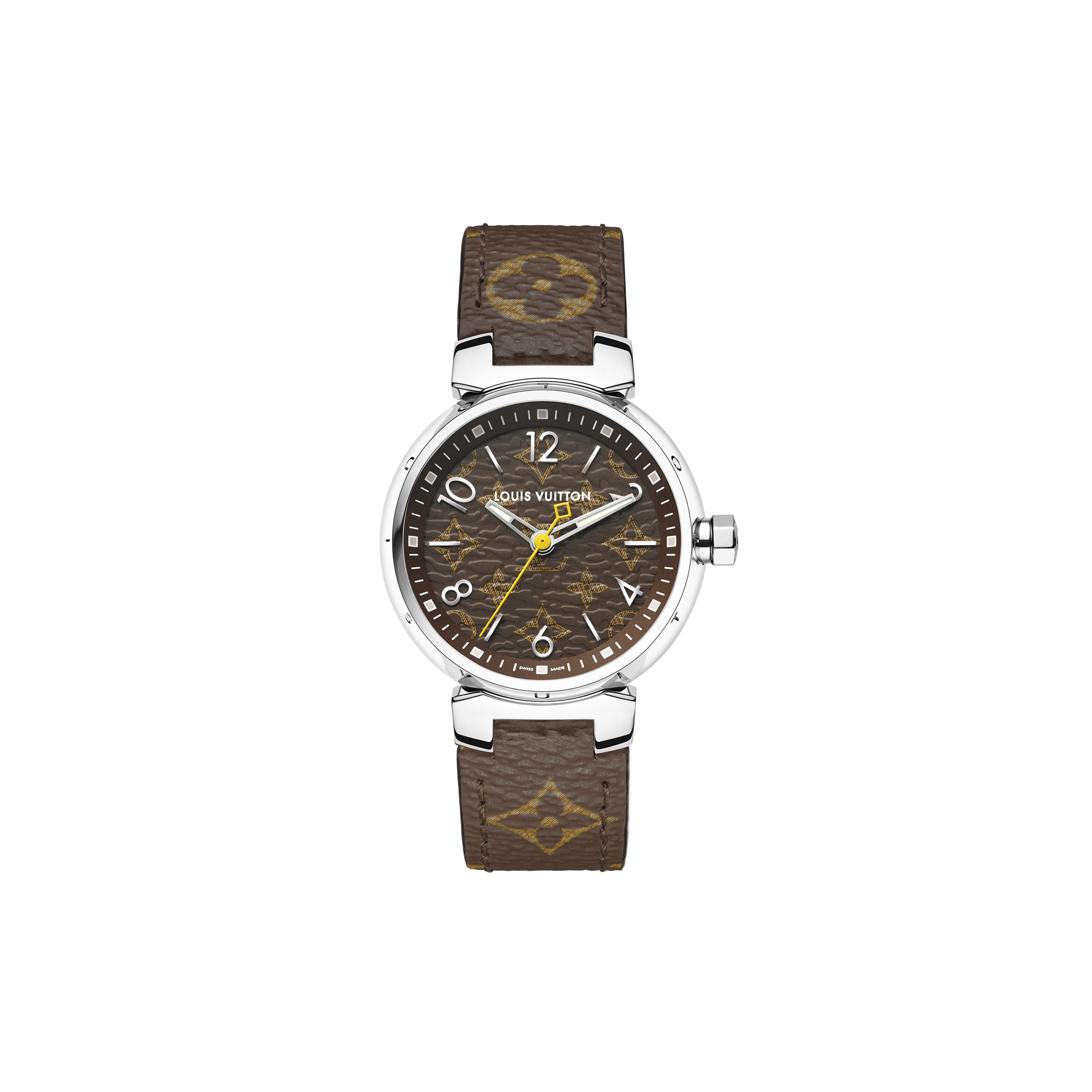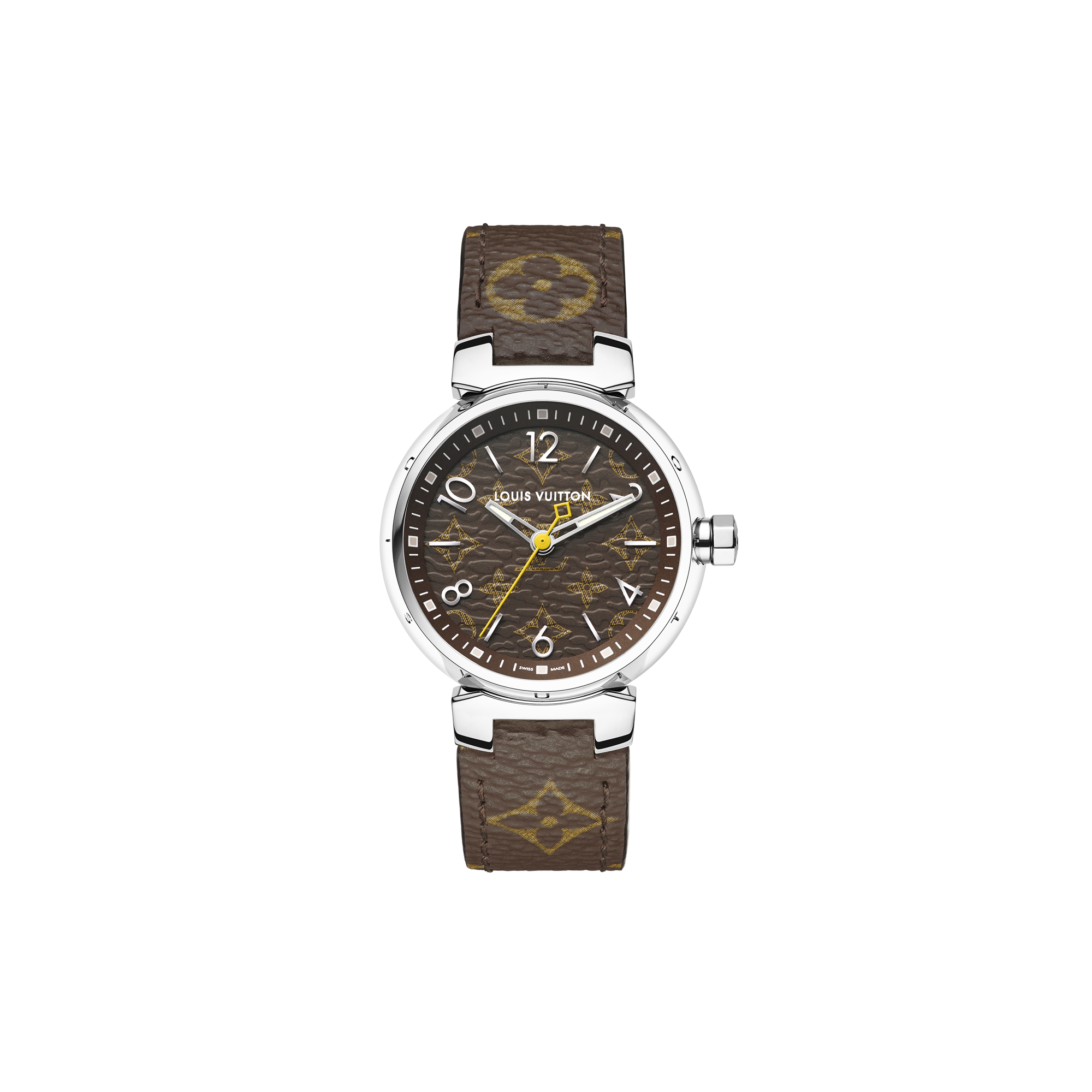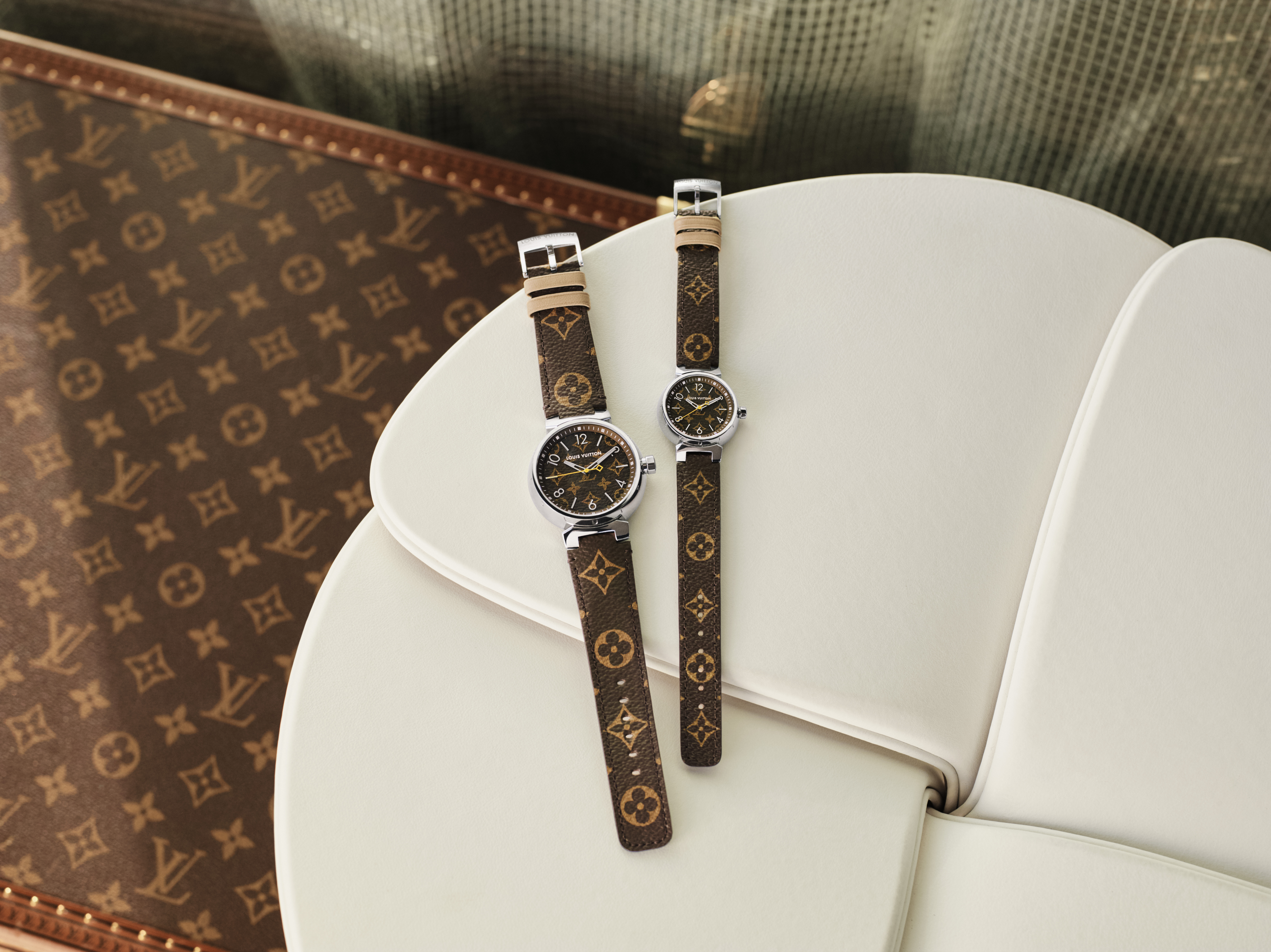 En 2002, Louis Vuitton marque son entrée dans l’univers horloger par la création de la montre Tambour, une forme de montre inédite dans l’horlogerie qui va intégrer dans son design toutes les valeurs de la Maison : les 12 lettres Louis Vuitton gravées dans le boîtier en face de chaque heure, le brun du cadran inspiré du célèbre Monogram ou encore le jaune des aiguilles des secondes rappelant le fil ciré des sacs Maison. Au-delà des multiples références – du modèle simple quartz trois aiguilles aux grandes complications –, Tambour va devenir un principe d’identité, une signature, alliant une allure intemporelle et des performances techniques renouvelées.