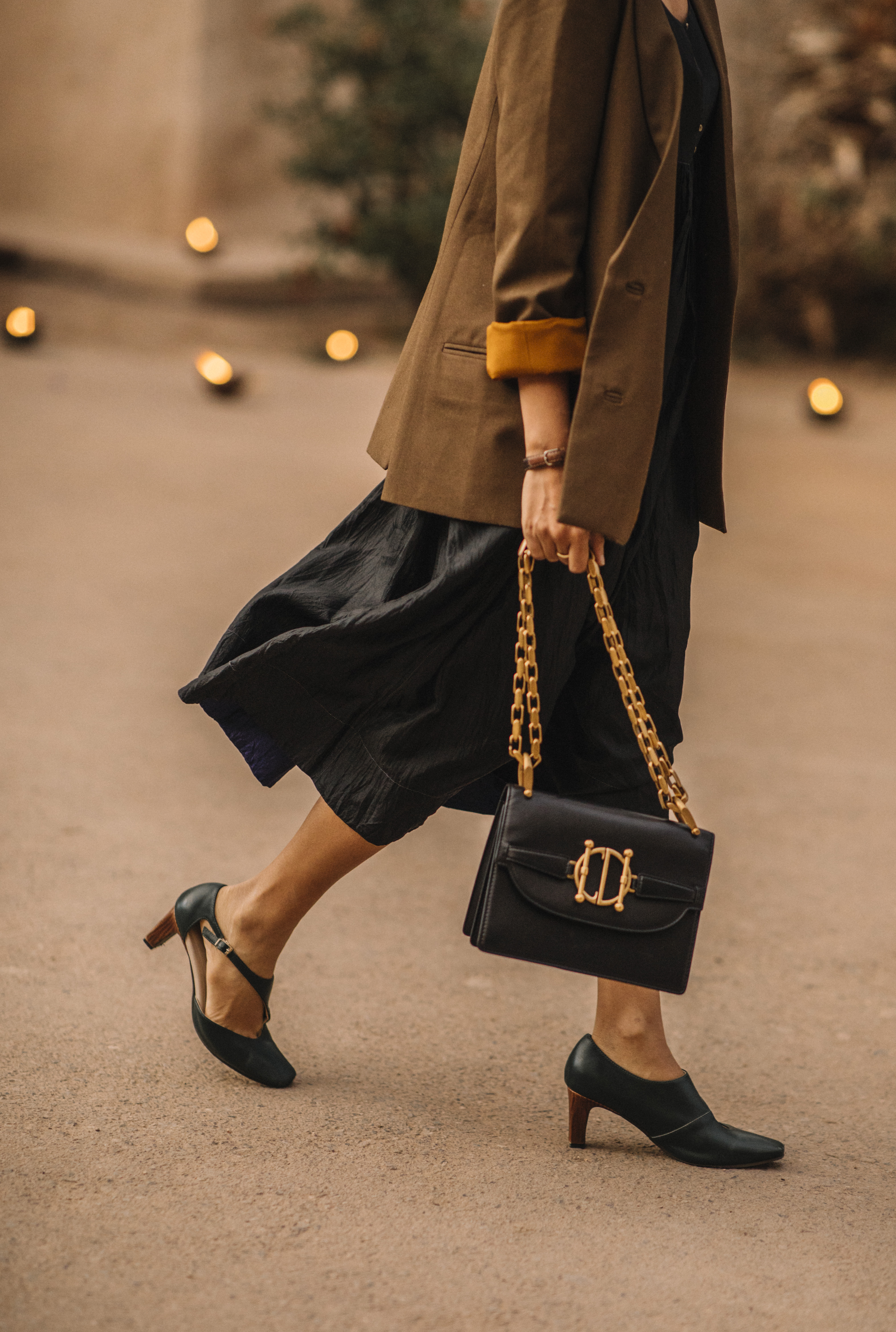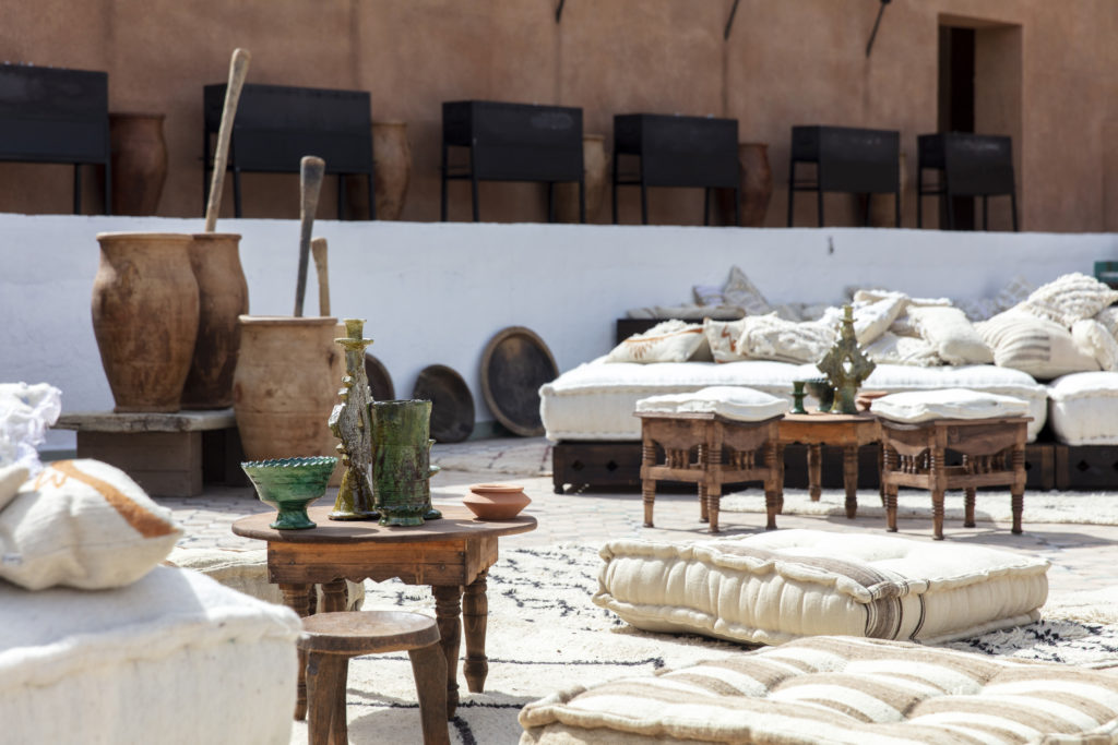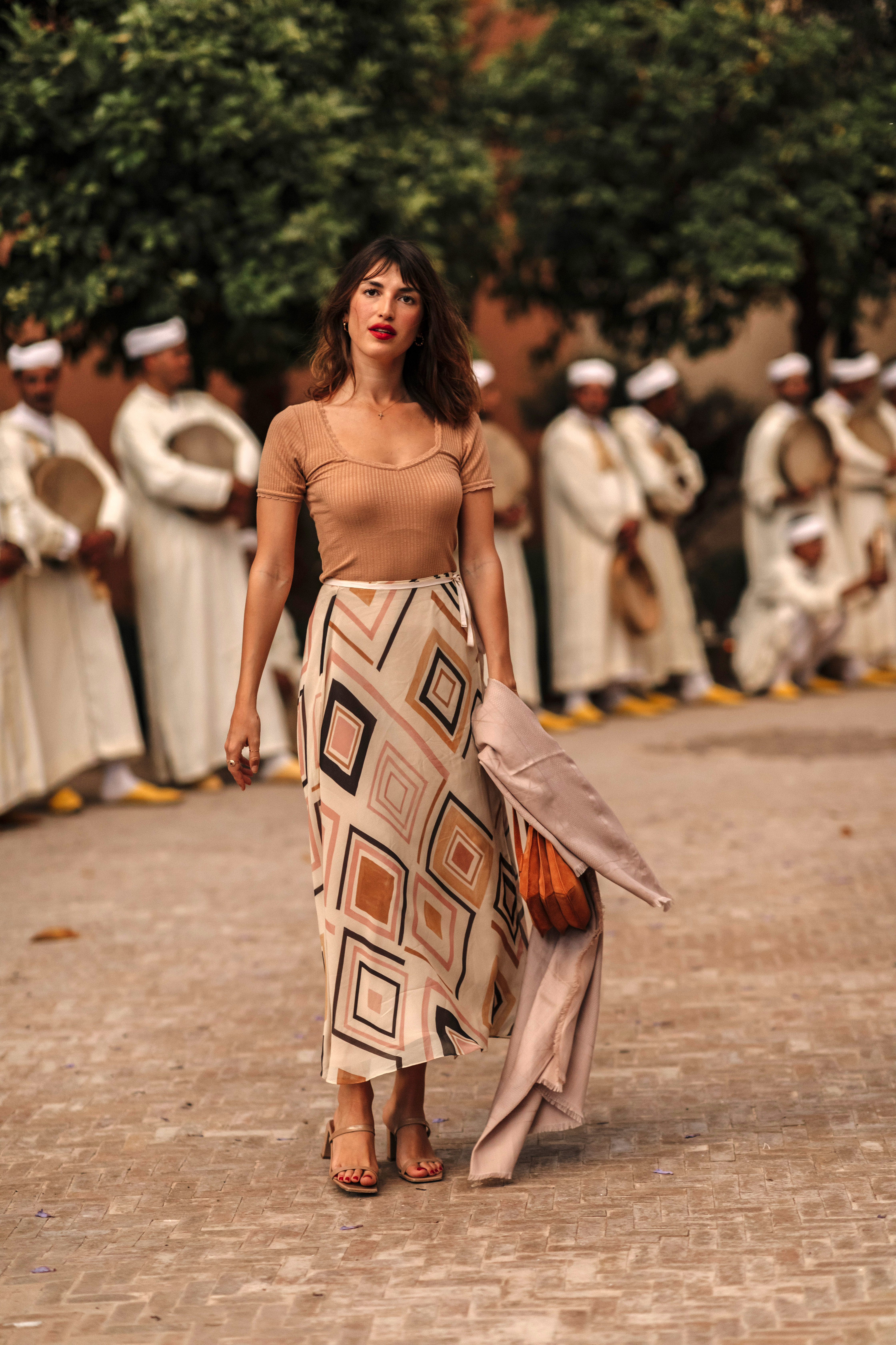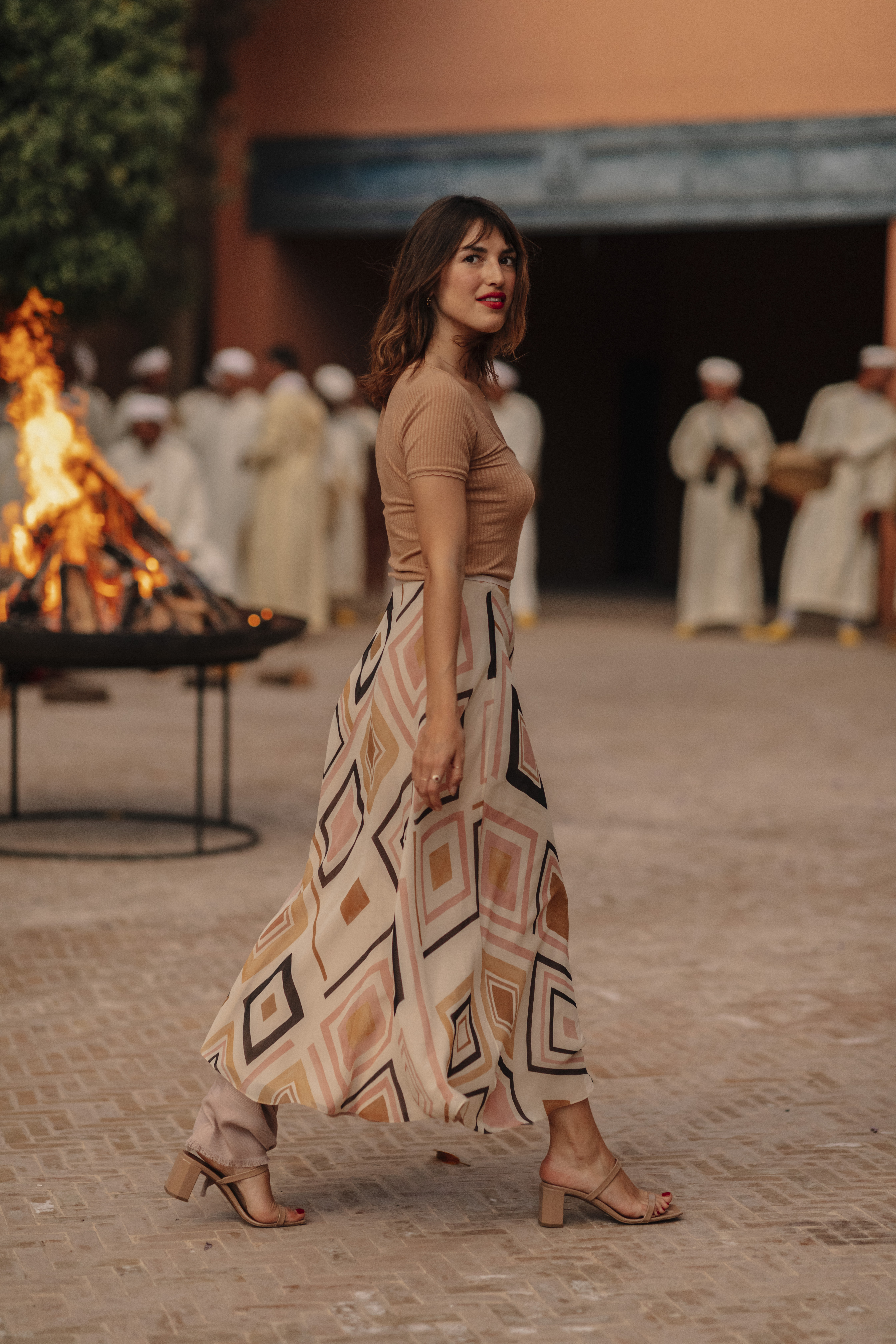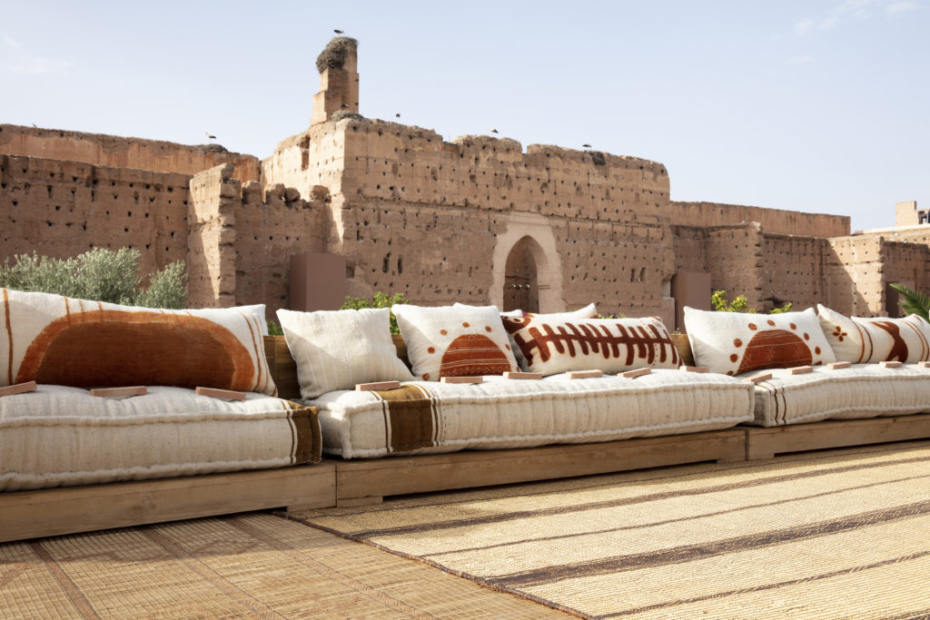 Autre belle rencontre culturelle – pour la scénographie et un manteau de la collection – celle de Sumano, association préservant le savoir-faire ancestral de tisserandes et de potières du Maroc. Coussins revêtus de tissages artisanaux peints au henné et décor rehaussé de poteries en céramique ont ainsi ponctué l’architecture d’exception du palais El Badi, somptueux écrin du défilé.