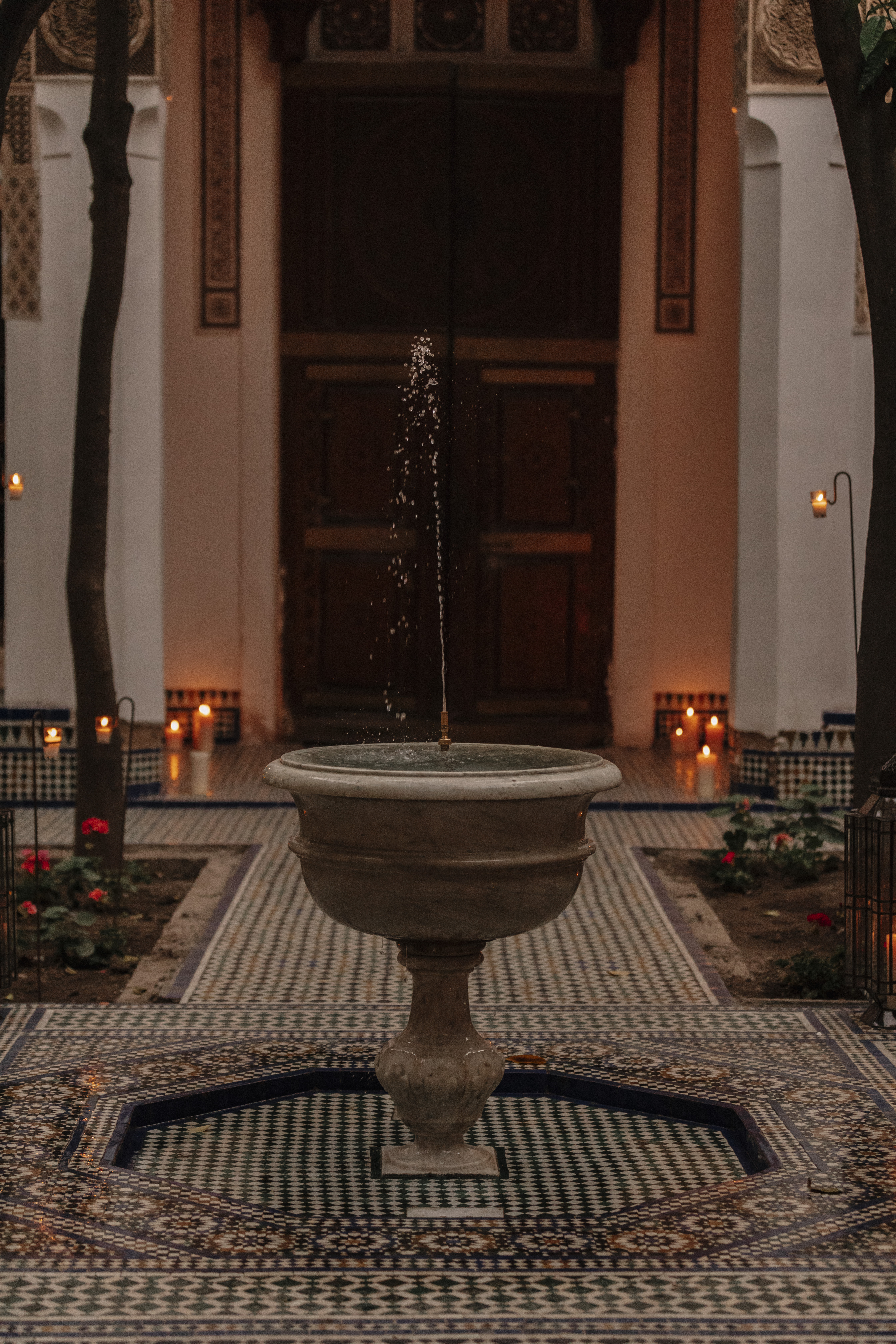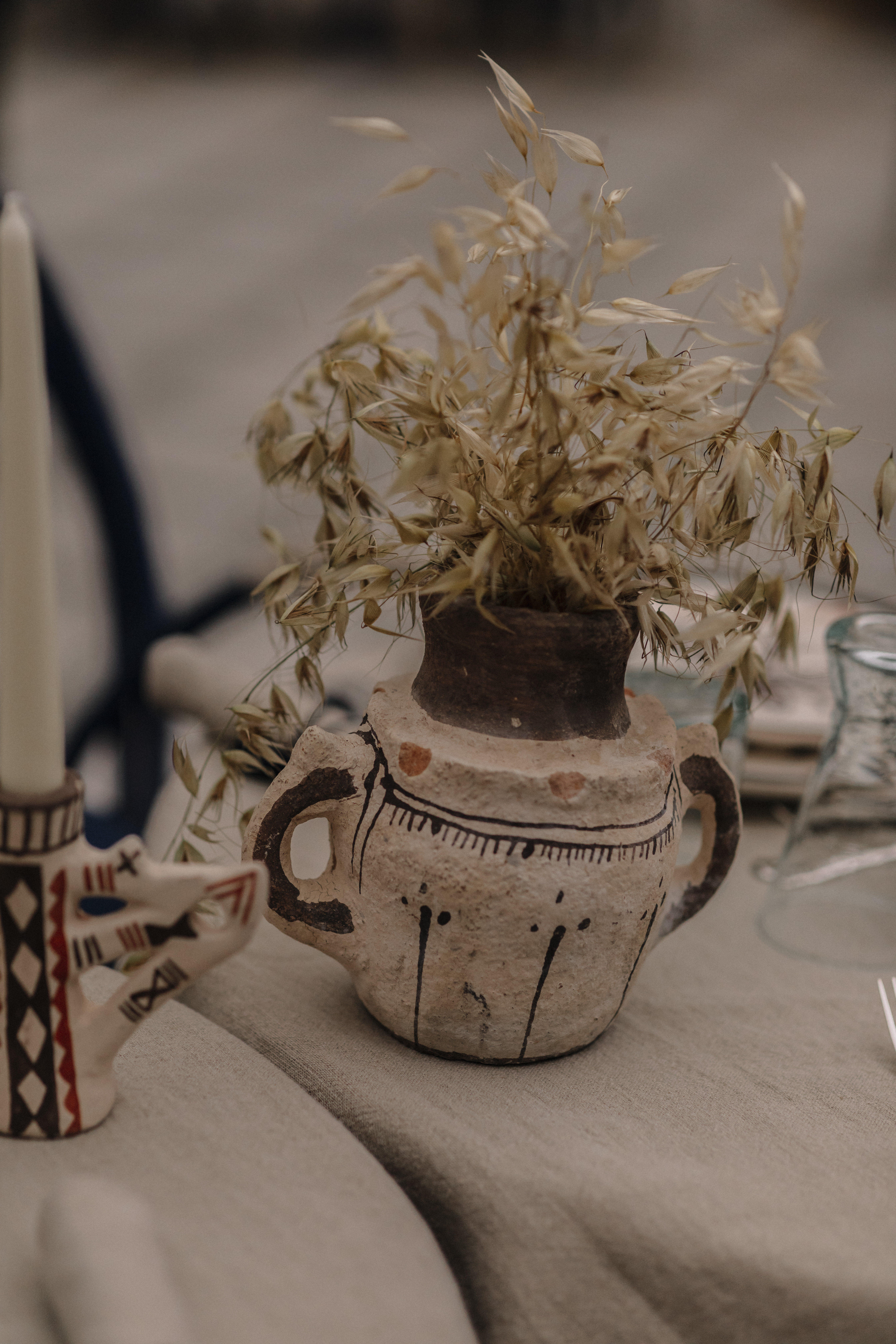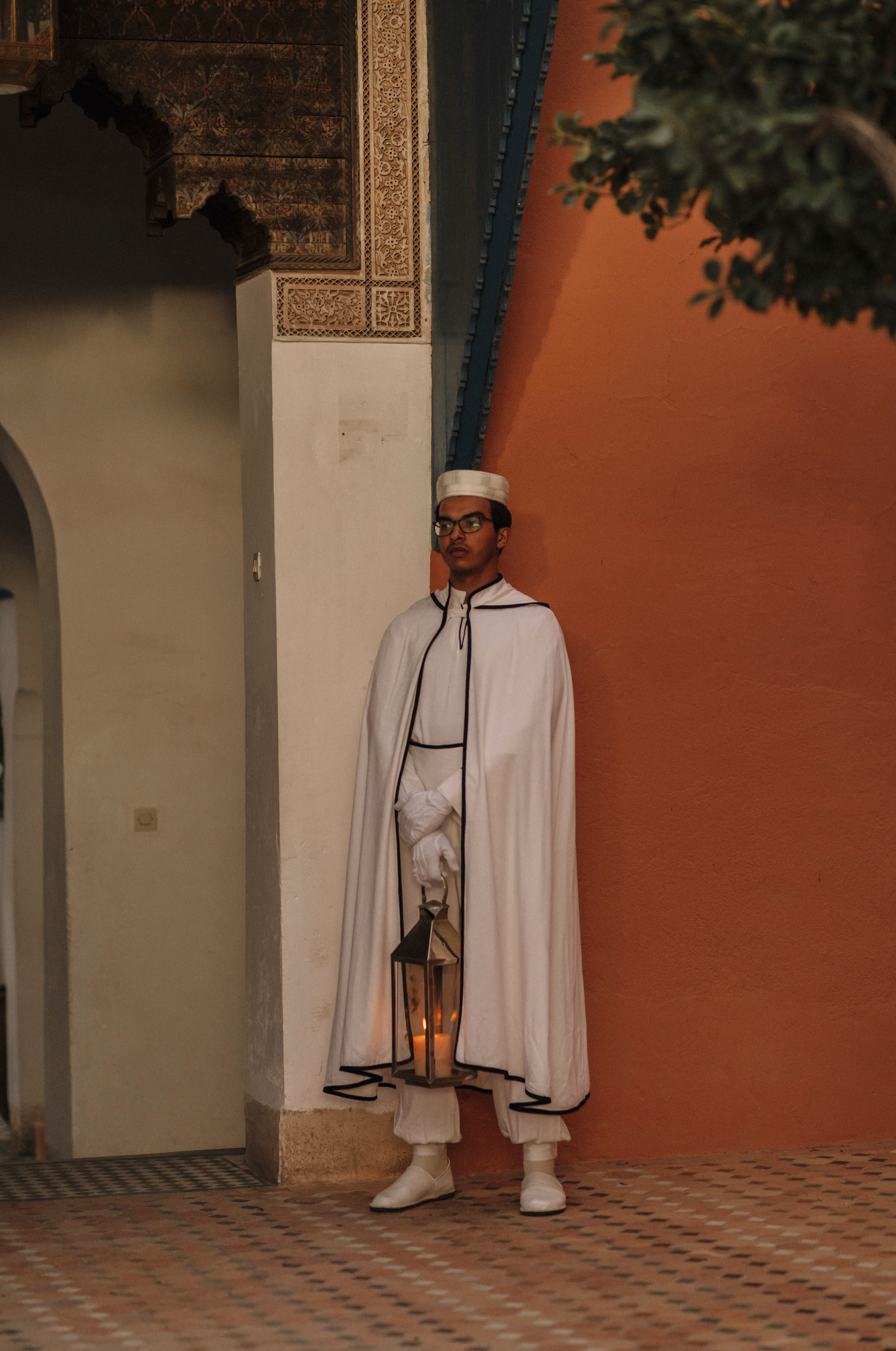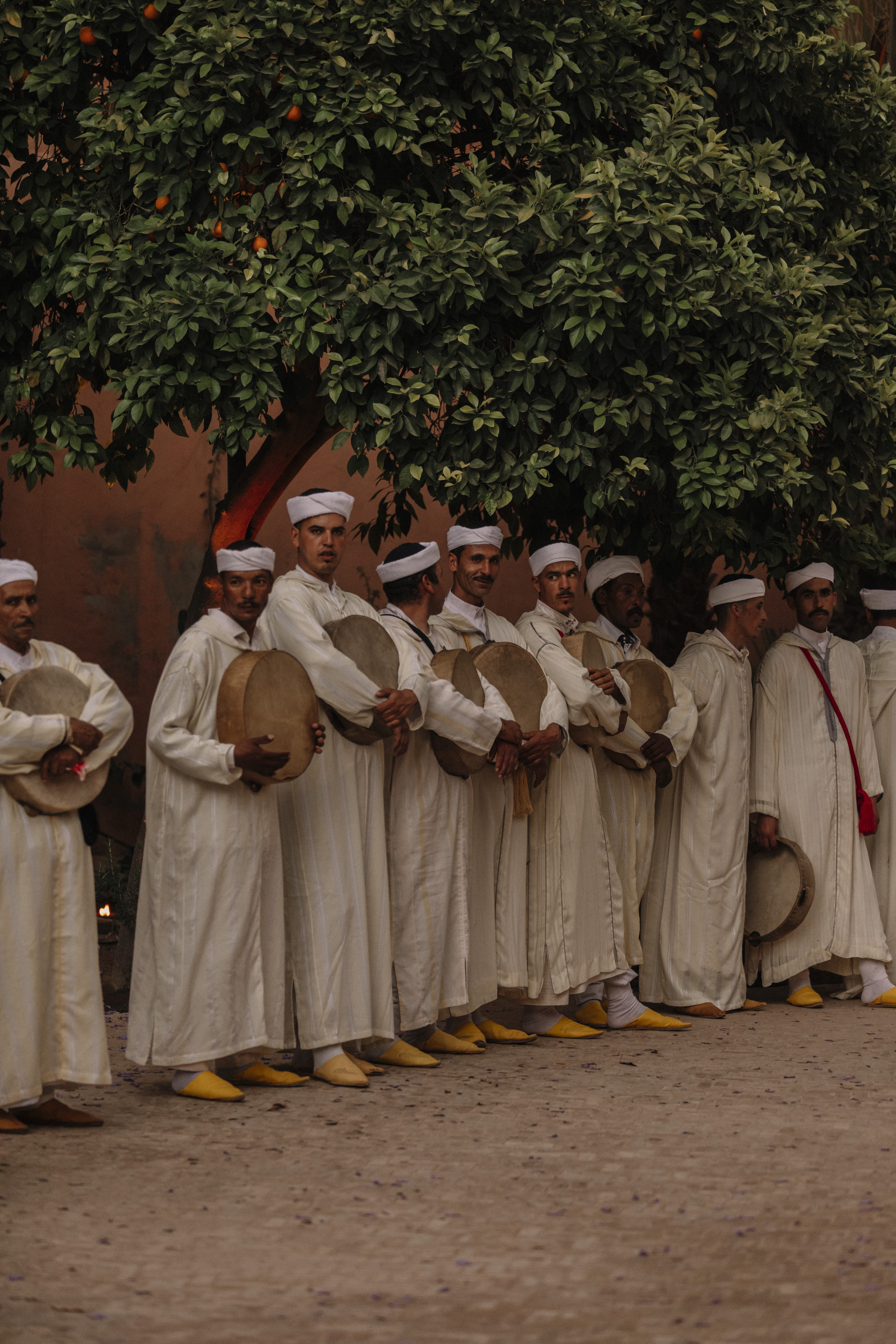 Autre belle rencontre culturelle – pour la scénographie et un manteau de la collection – celle de Sumano, association préservant le savoir-faire ancestral de tisserandes et de potières du Maroc. Coussins revêtus de tissages artisanaux peints au henné et décor rehaussé de poteries en céramique ont ainsi ponctué l’architecture d’exception du palais El Badi, somptueux écrin du défilé.