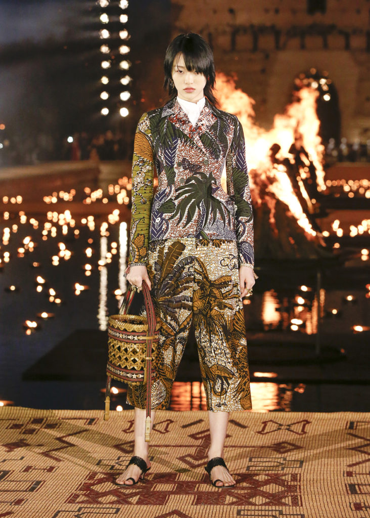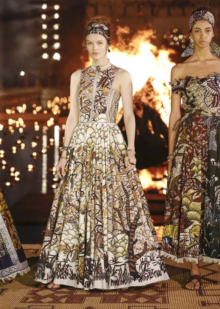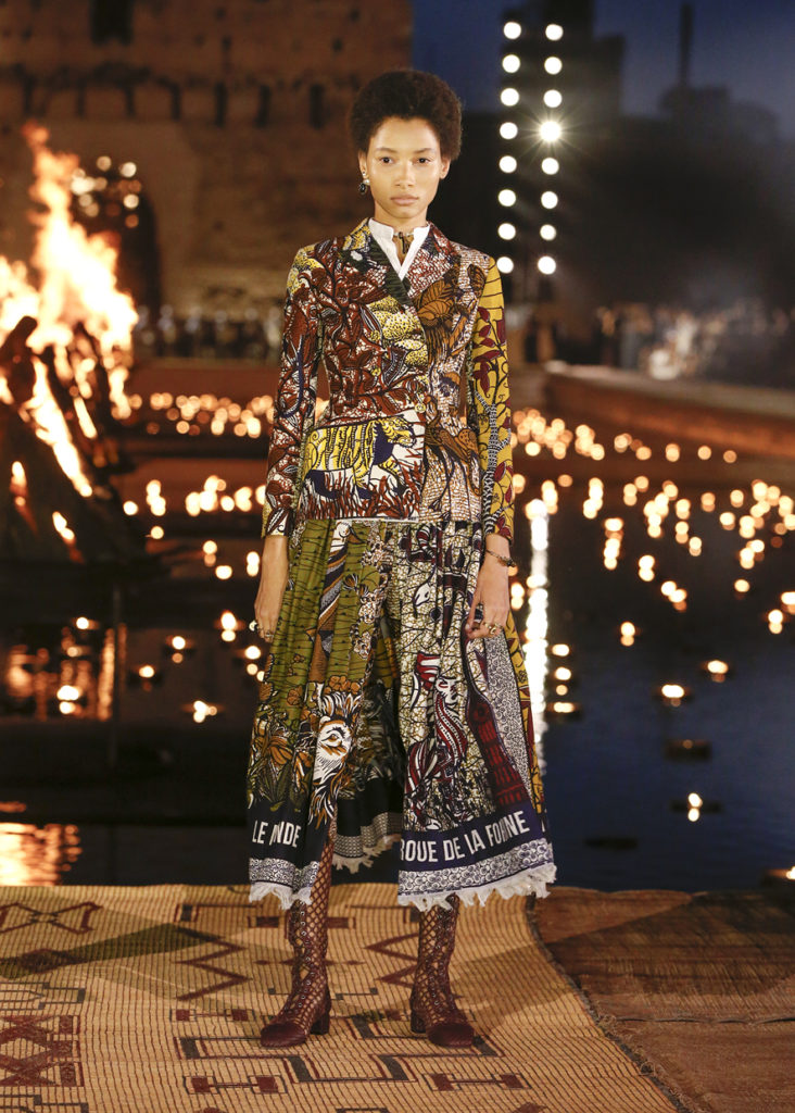 Pour ce défilé, Maria Grazia Chiuri, accompagnée de l’anthropologue Anne Grosfilley, spécialiste mondiale du wax, a collaboré avec l’entreprise Uniwax, en Côte d’Ivoire, dont le studio a réinterprété deux motifs chers à la Maison : la toile de Jouy et les cartes du tarot, donnant ainsi lieu à une édition spéciale autour d’un wax 100 % africain (les cotons étant cultivés, filés et imprimés en Afrique).