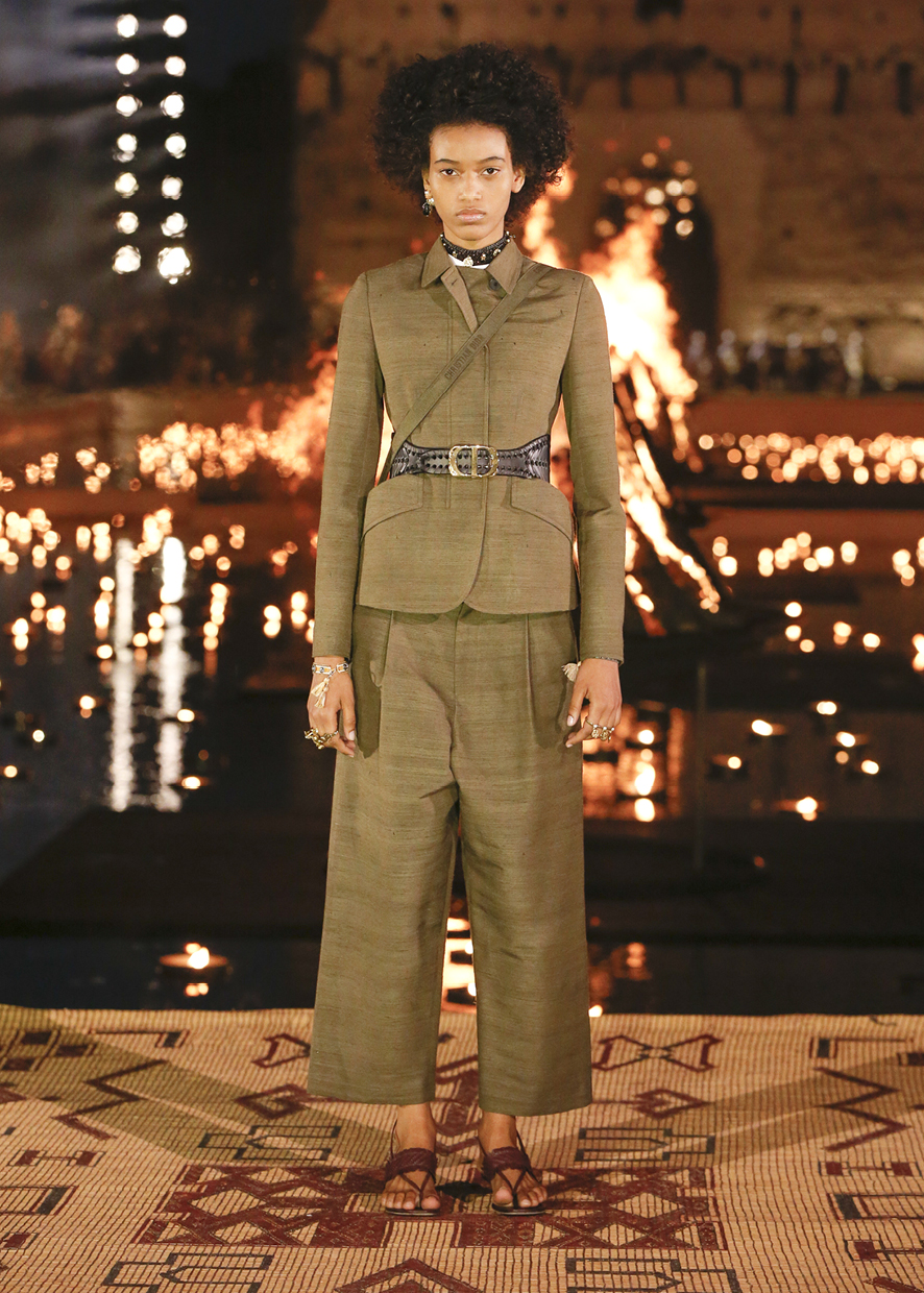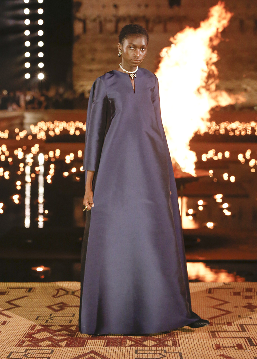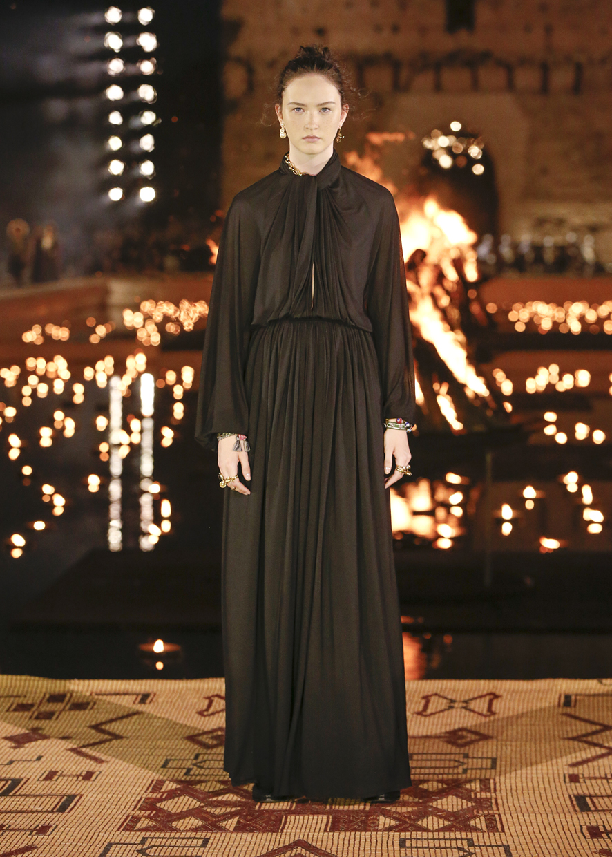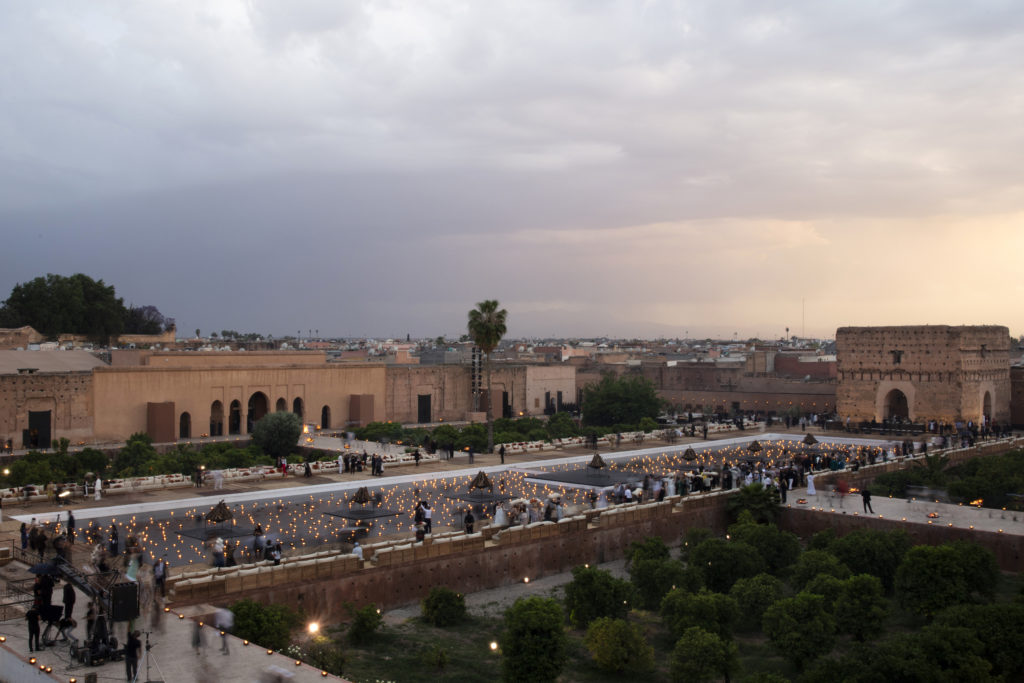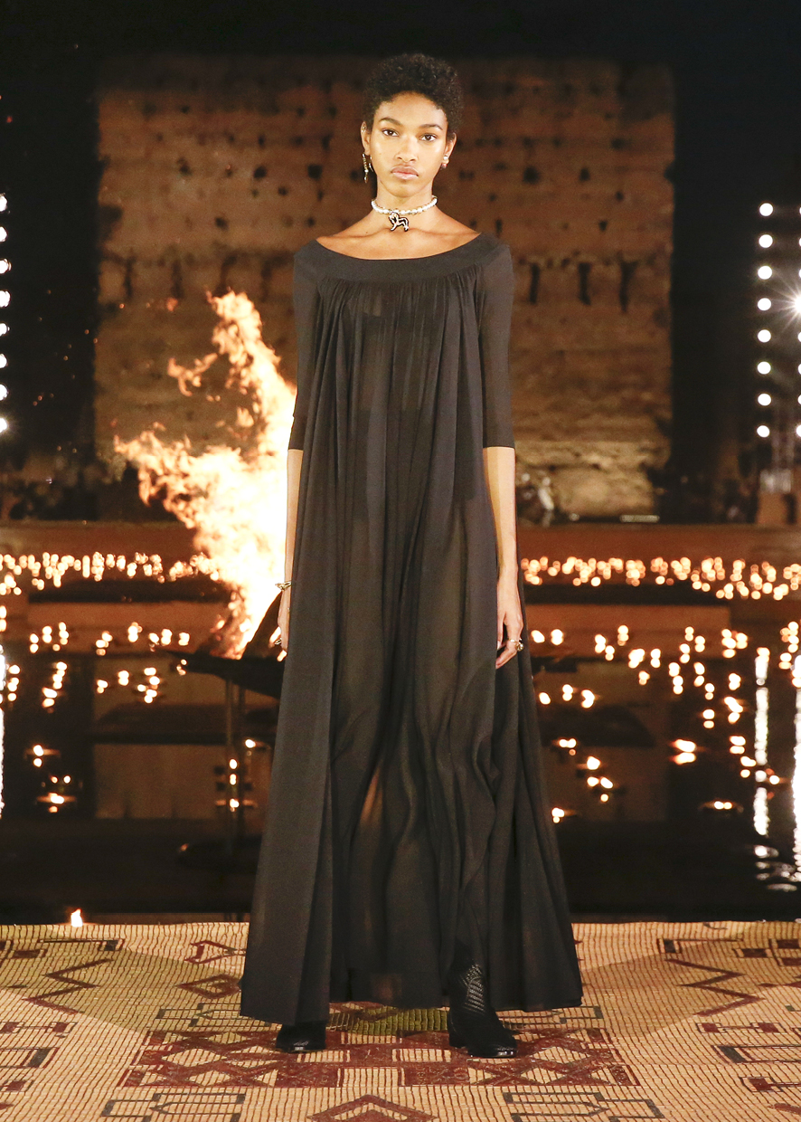 Autre belle rencontre culturelle – pour la scénographie et un manteau de la collection – celle de Sumano, association préservant le savoir-faire ancestral de tisserandes et de potières du Maroc. Coussins revêtus de tissages artisanaux peints au henné et décor rehaussé de poteries en céramique ont ainsi ponctué l’architecture d’exception du palais El Badi, somptueux écrin du défilé.