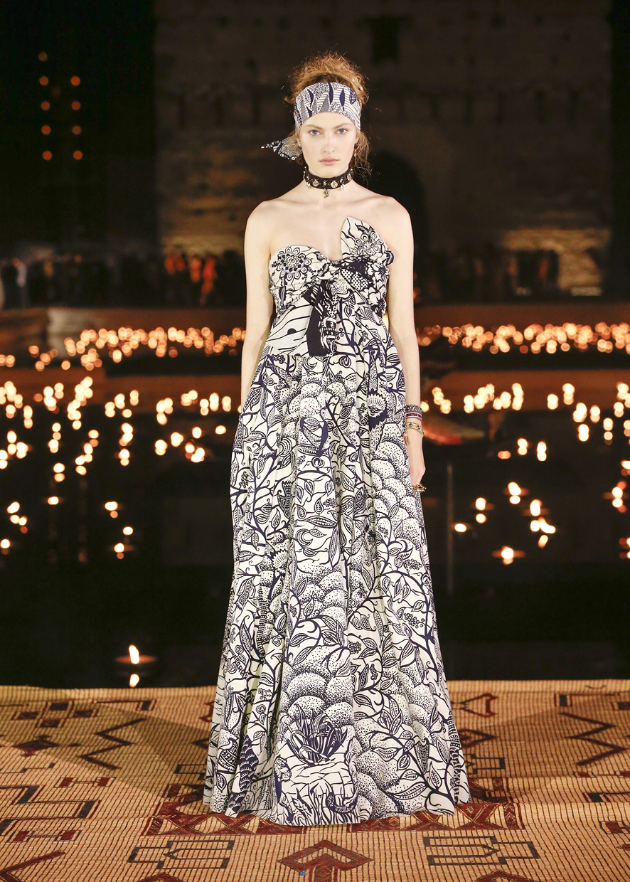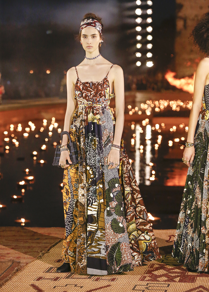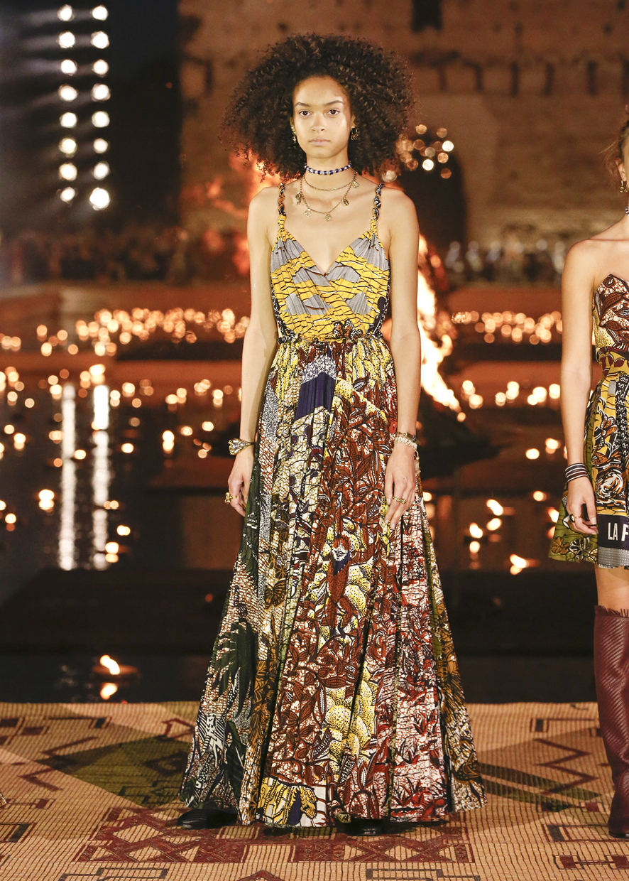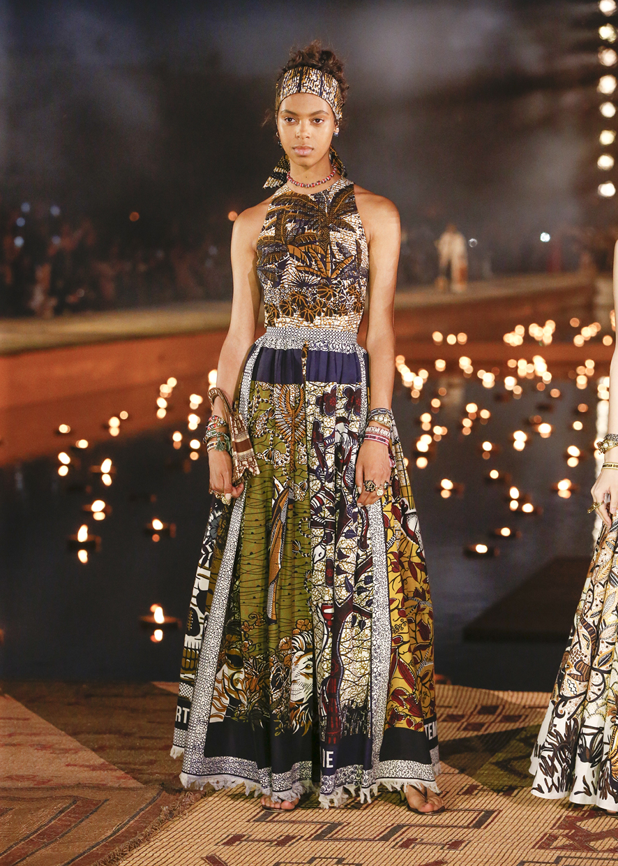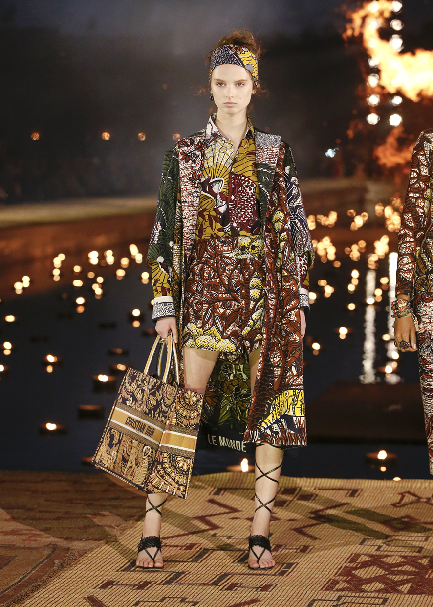 Pour ce défilé, Maria Grazia Chiuri, accompagnée de l’anthropologue Anne Grosfilley, spécialiste mondiale du wax, a collaboré avec l’entreprise Uniwax, en Côte d’Ivoire, dont le studio a réinterprété deux motifs chers à la Maison : la toile de Jouy et les cartes du tarot, donnant ainsi lieu à une édition spéciale autour d’un wax 100 % africain (les cotons étant cultivés, filés et imprimés en Afrique).