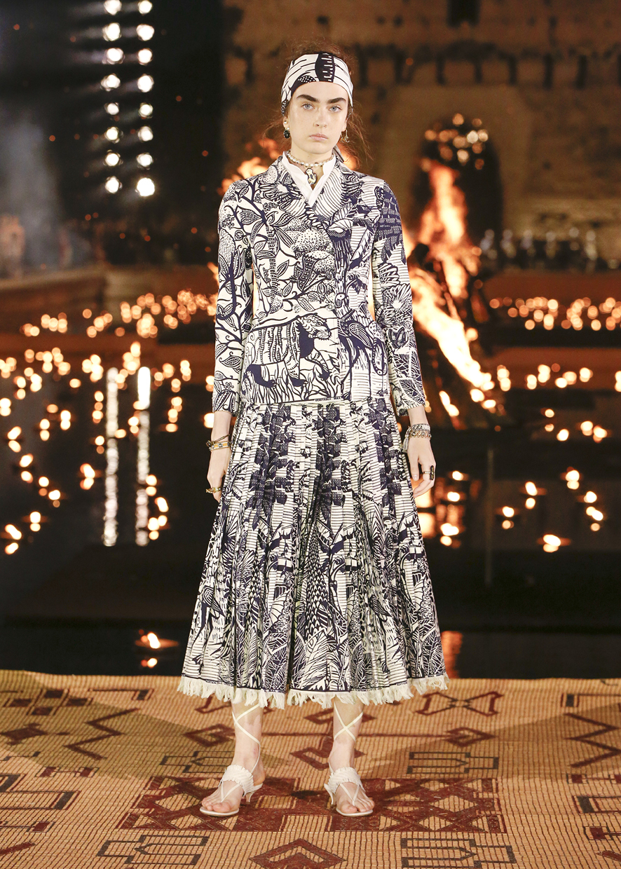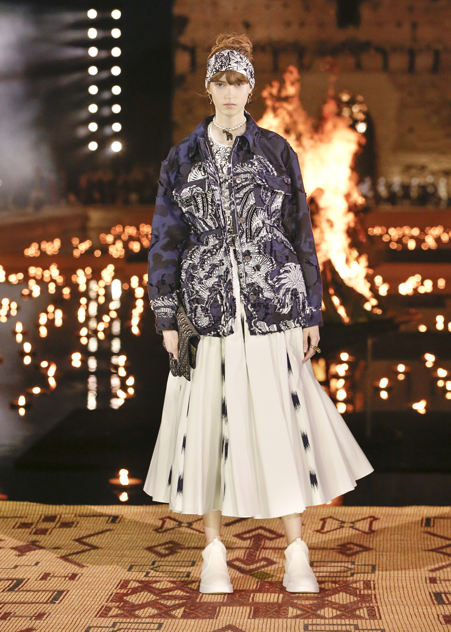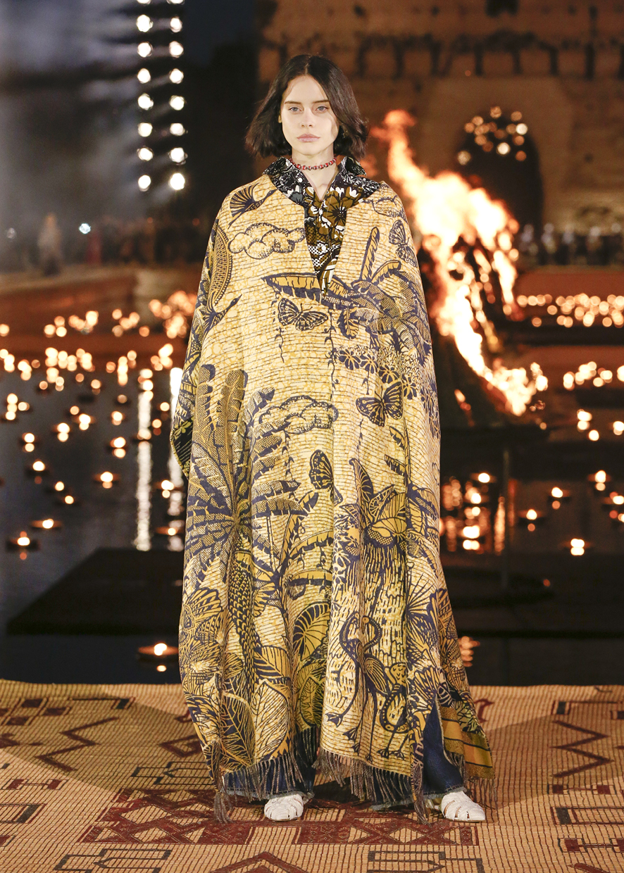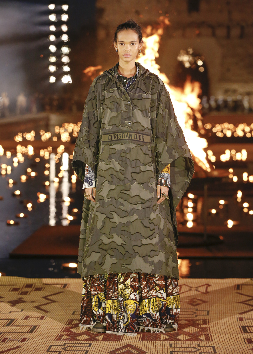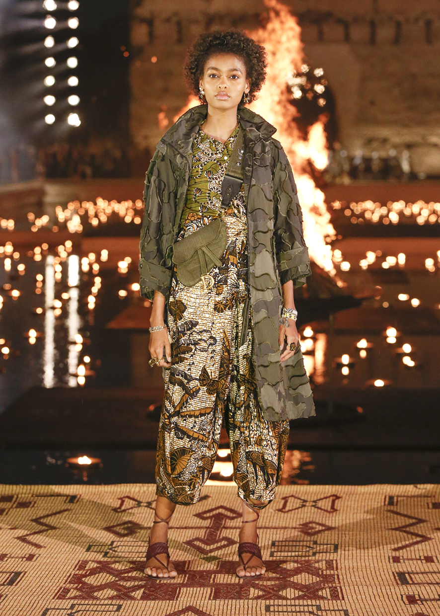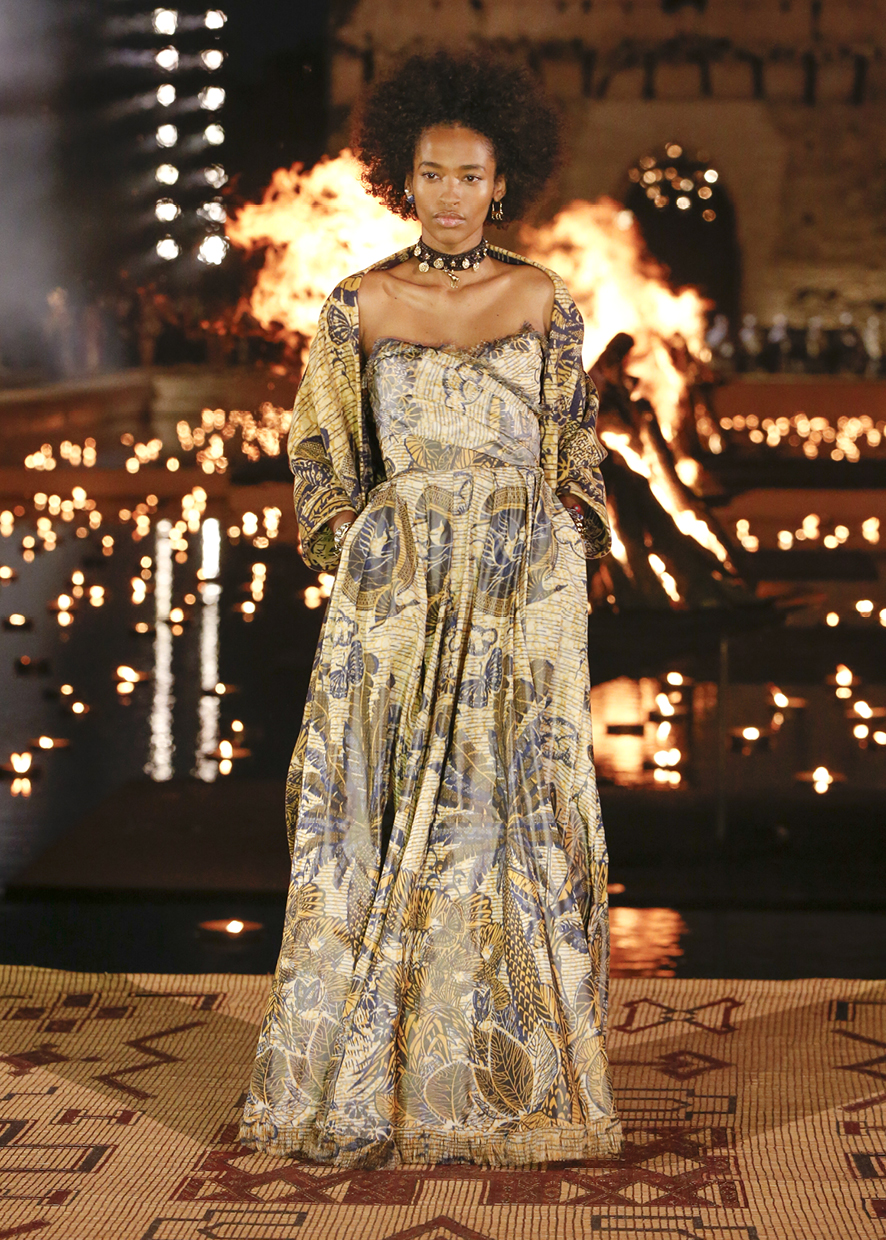 Pour ce défilé, Maria Grazia Chiuri, accompagnée de l’anthropologue Anne Grosfilley, spécialiste mondiale du wax, a collaboré avec l’entreprise Uniwax, en Côte d’Ivoire, dont le studio a réinterprété deux motifs chers à la Maison : la toile de Jouy et les cartes du tarot, donnant ainsi lieu à une édition spéciale autour d’un wax 100 % africain (les cotons étant cultivés, filés et imprimés en Afrique).