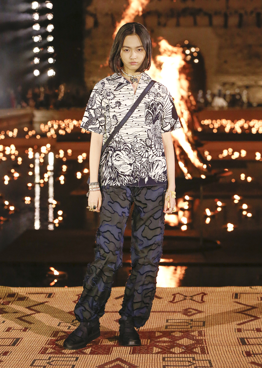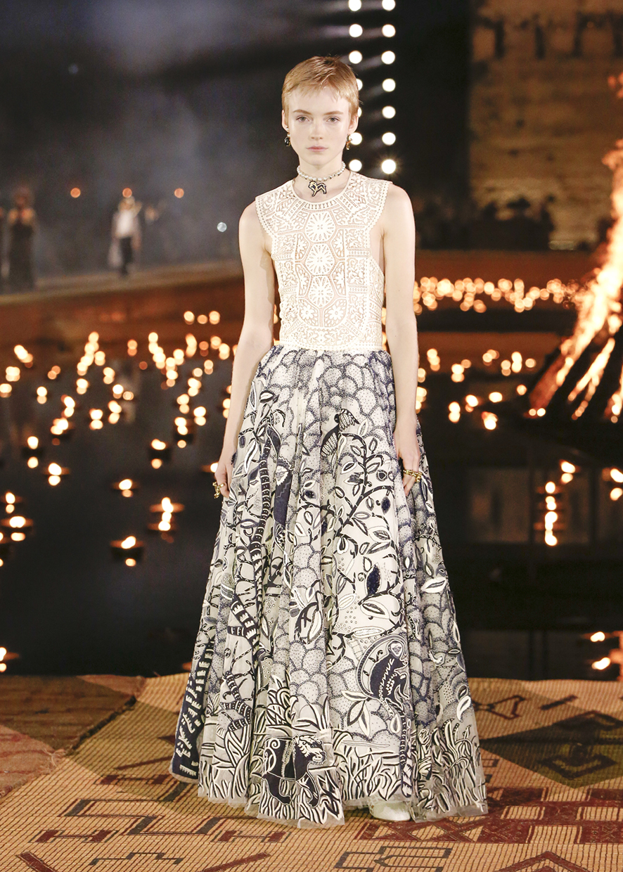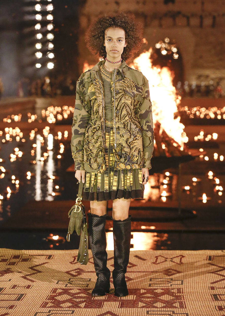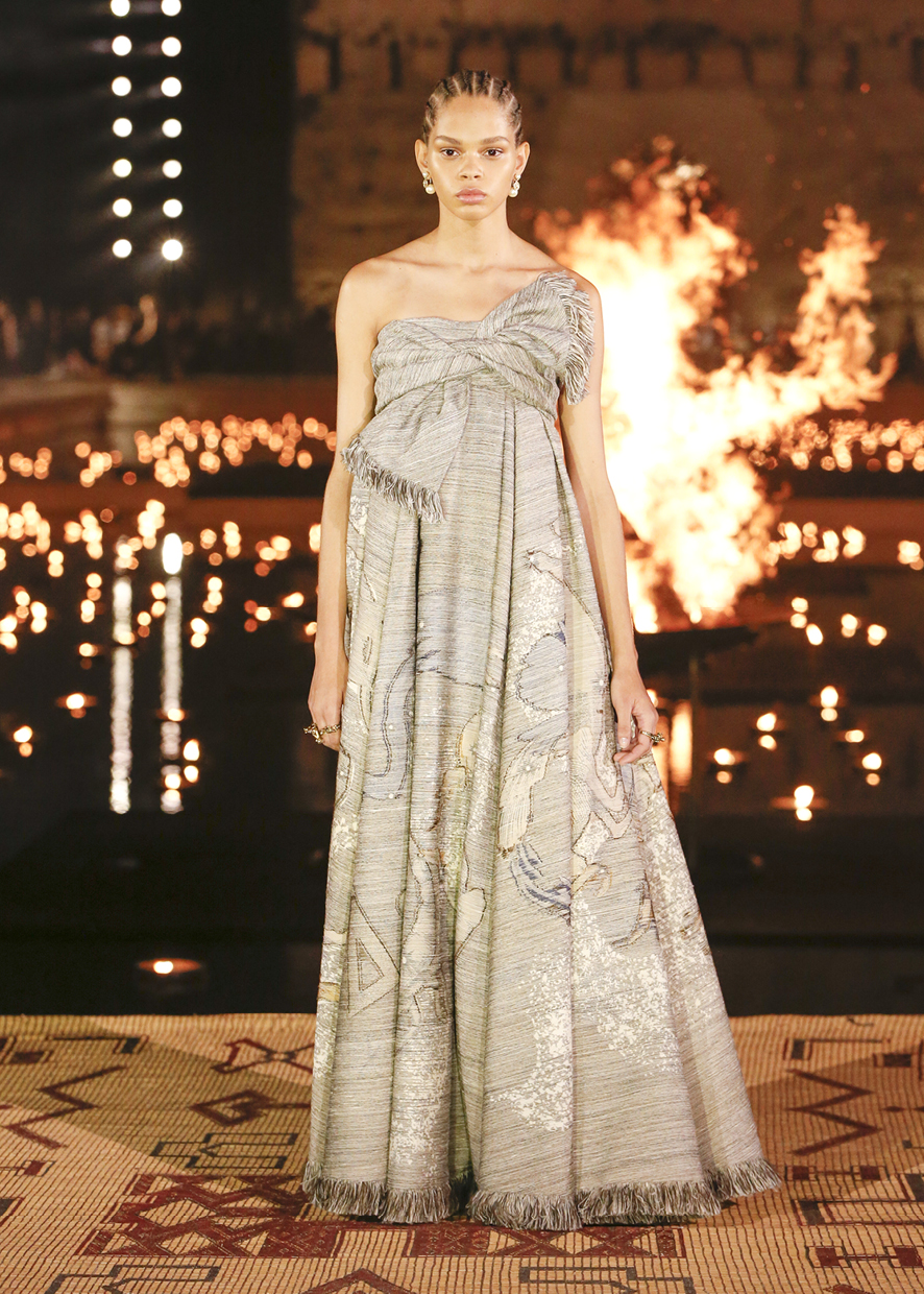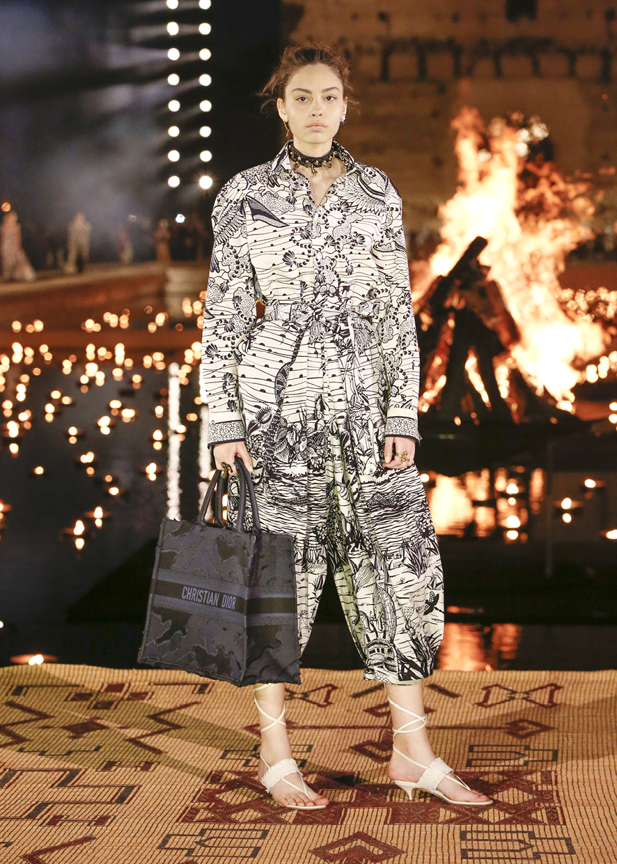 Pour ce défilé, Maria Grazia Chiuri, accompagnée de l’anthropologue Anne Grosfilley, spécialiste mondiale du wax, a collaboré avec l’entreprise Uniwax, en Côte d’Ivoire, dont le studio a réinterprété deux motifs chers à la Maison : la toile de Jouy et les cartes du tarot, donnant ainsi lieu à une édition spéciale autour d’un wax 100 % africain (les cotons étant cultivés, filés et imprimés en Afrique).