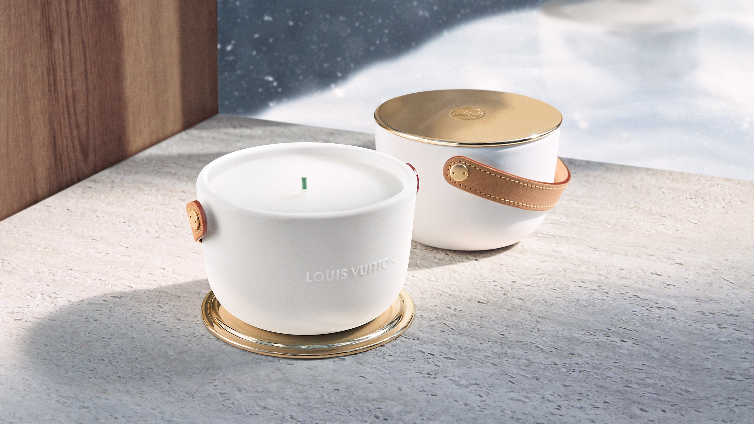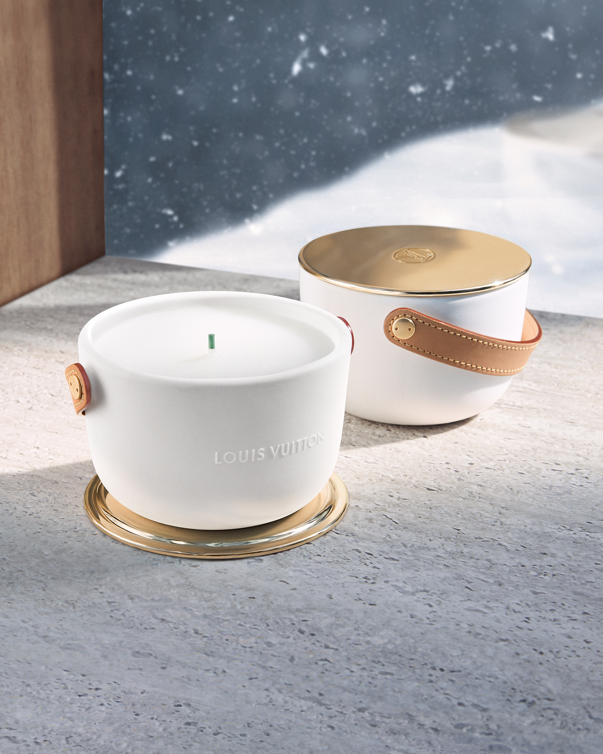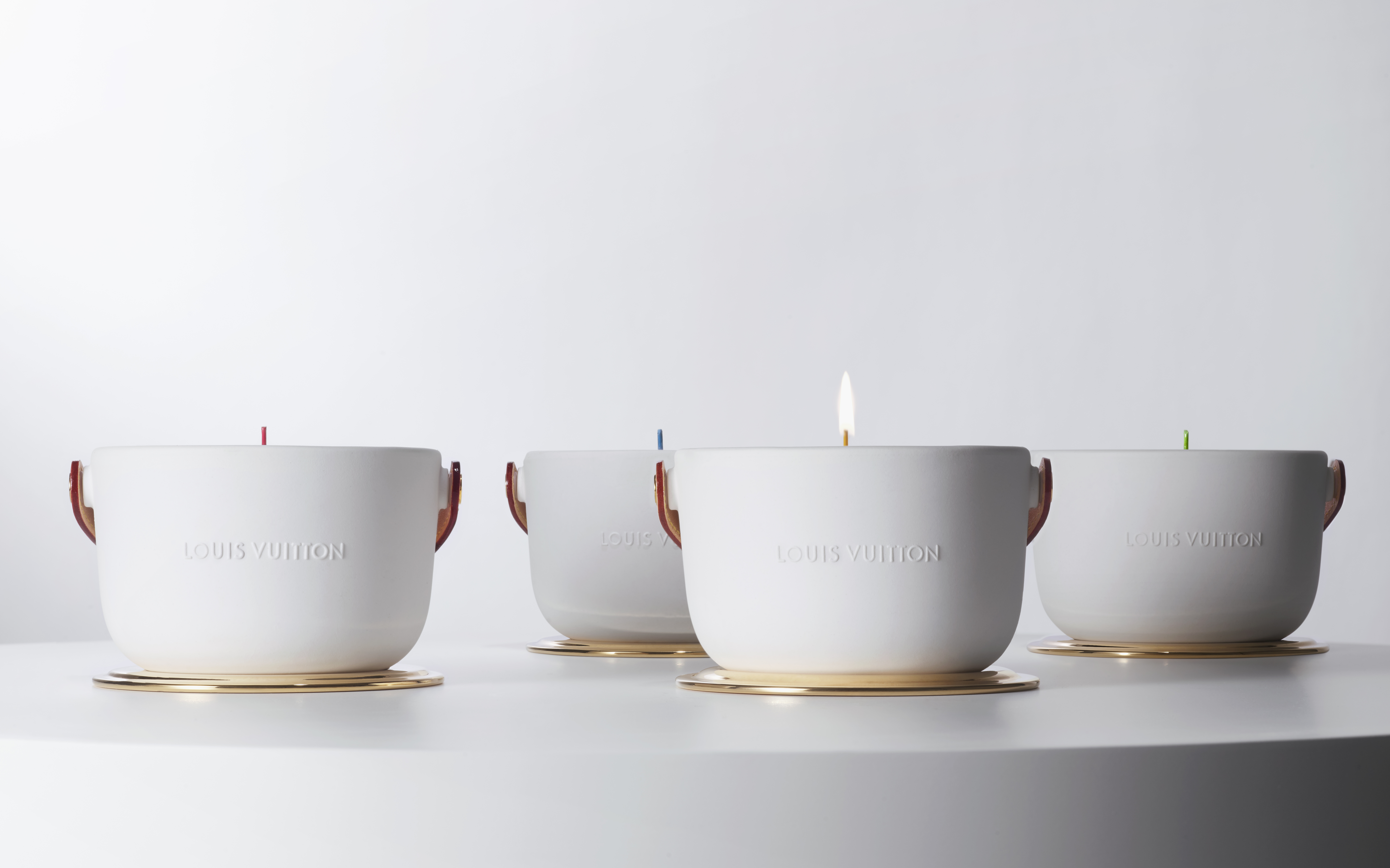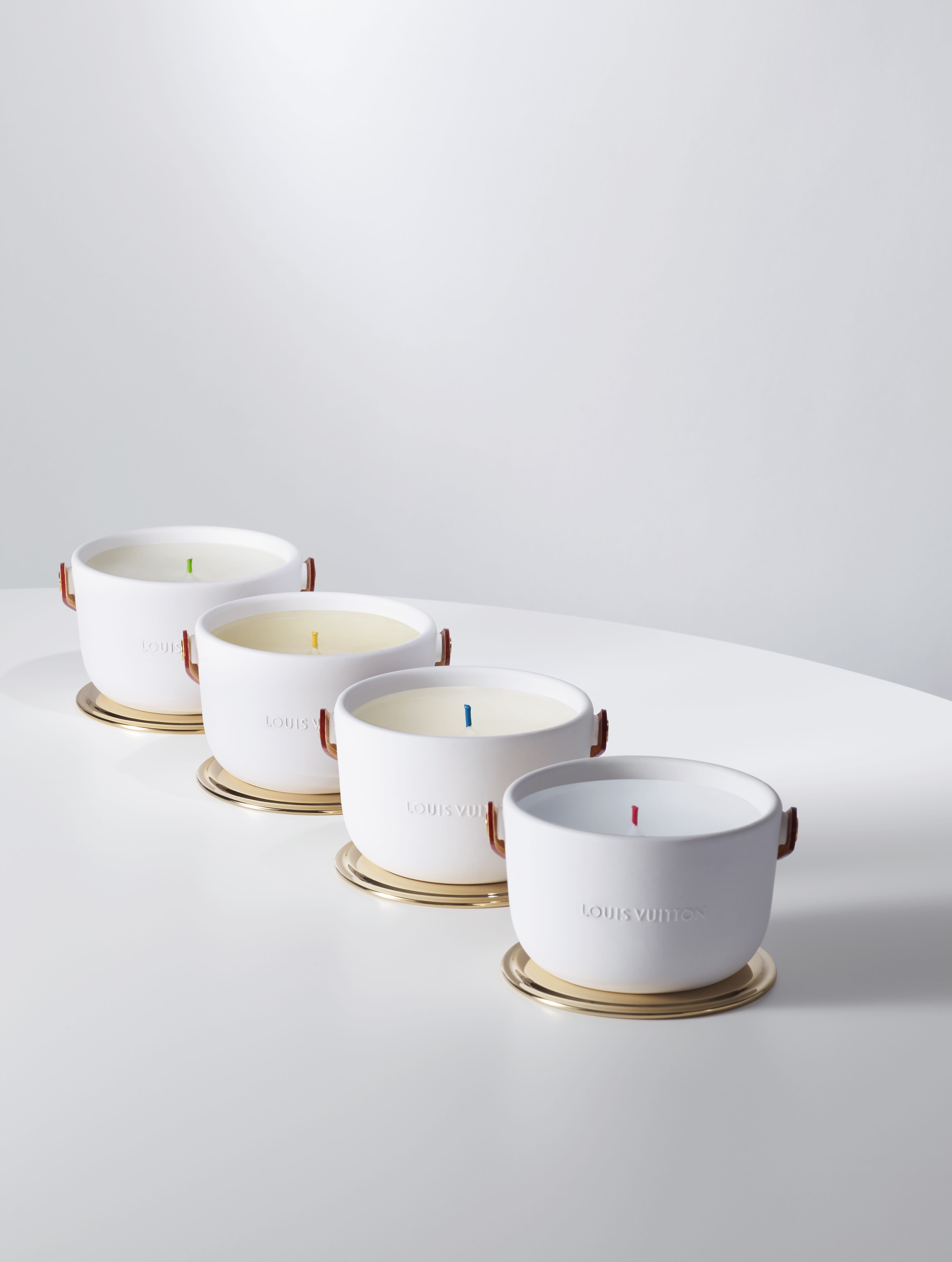 Louis Vuitton lance mi-mai le grand format (1,1 kg avec 4 mèches) des bougies parfumées L’Air du Jardin, Île Blanche, Feuilles d’Or et Dehors Il Neige, créées par le Maître ParfumeurJacques Cavallier Belletrud.