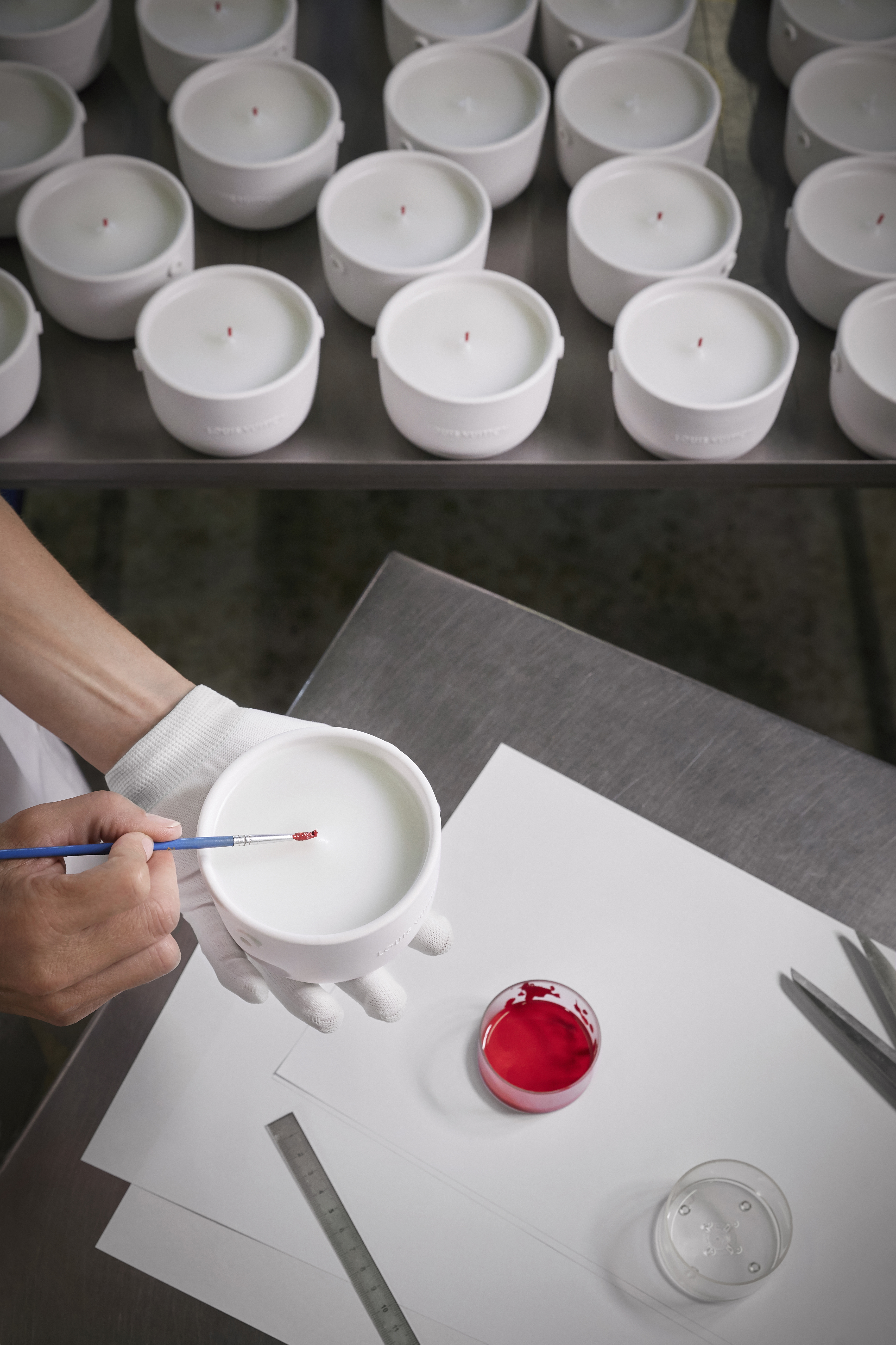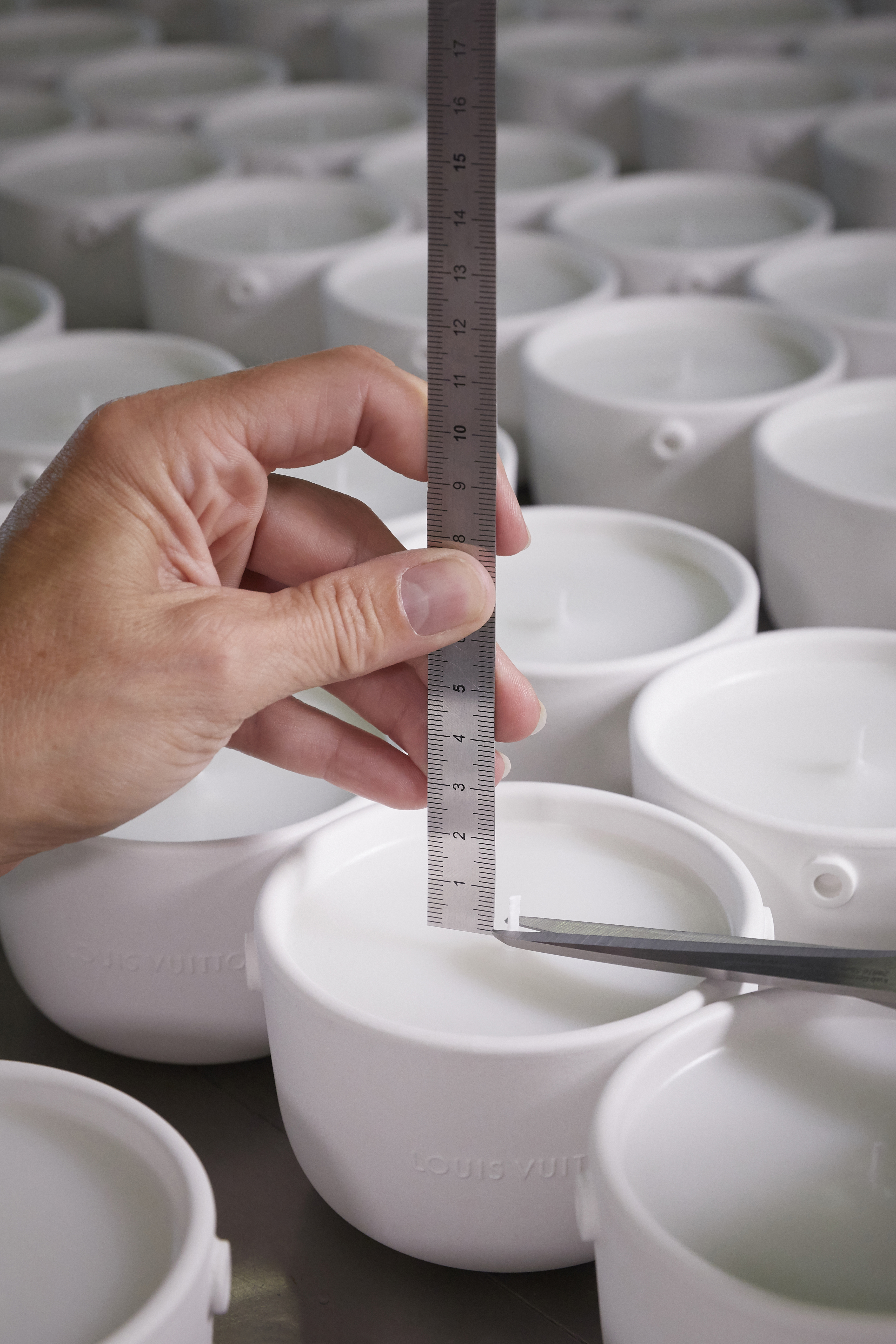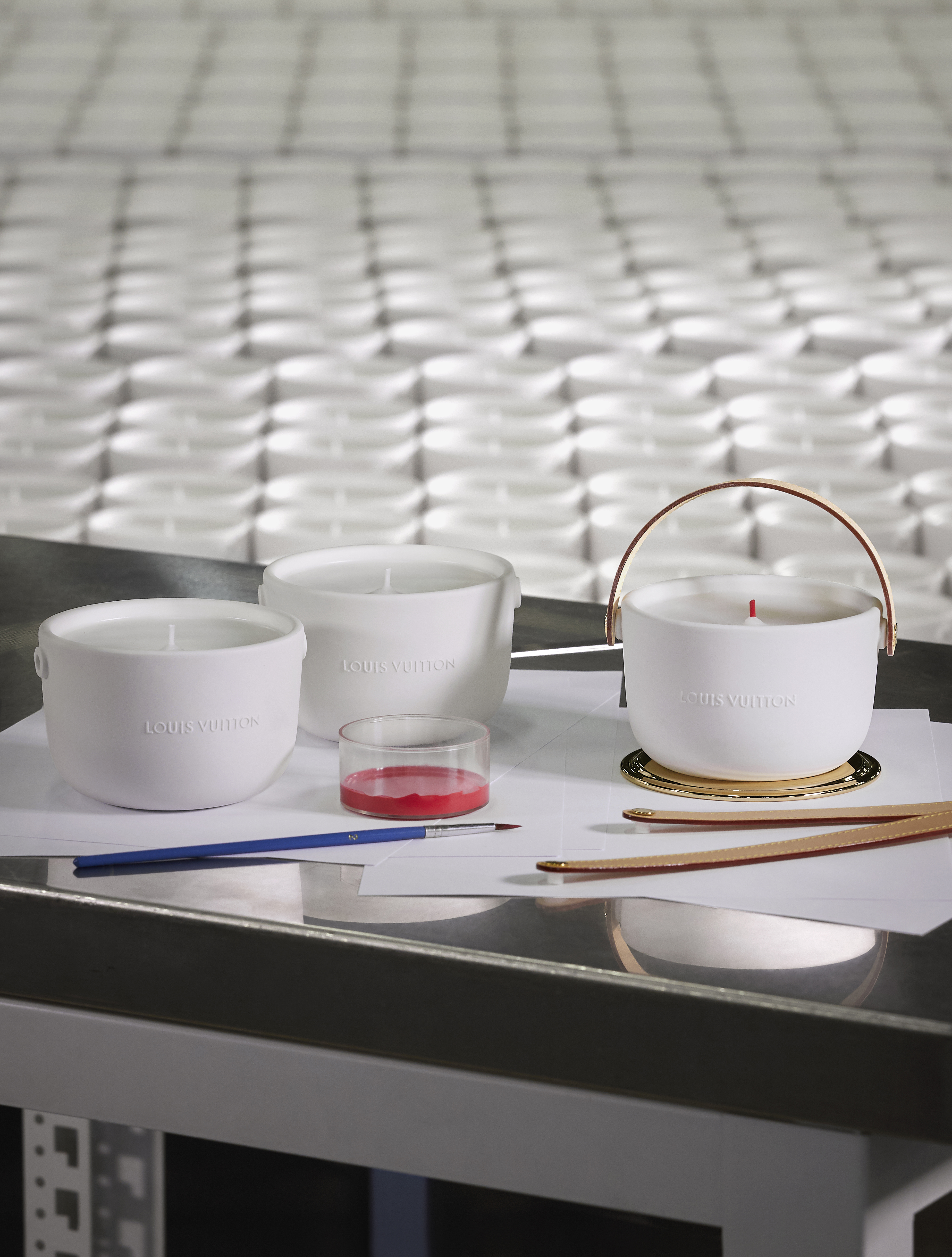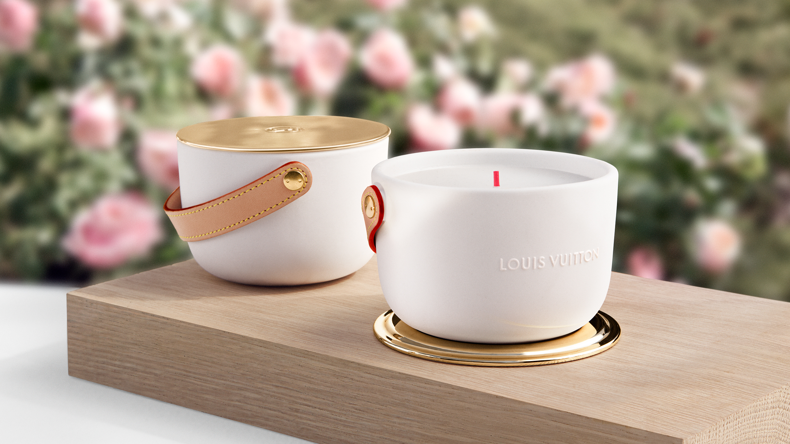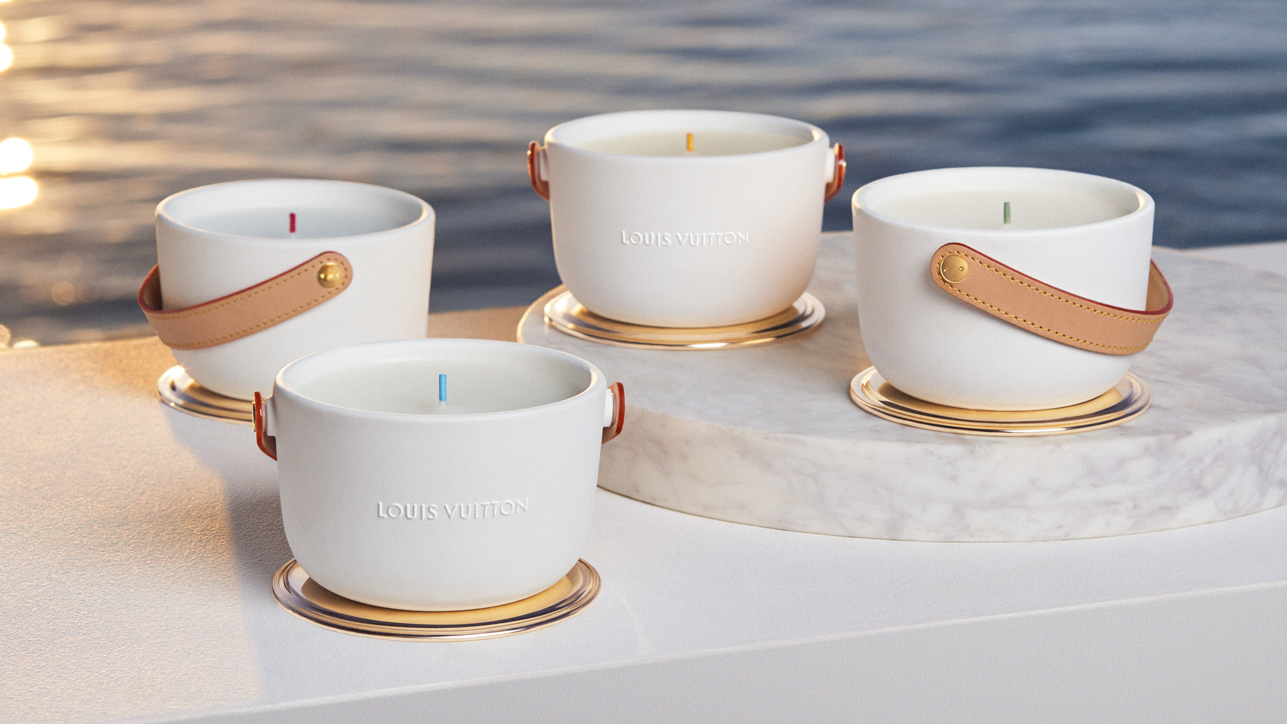 Louis Vuitton lance mi-mai le grand format (1,1 kg avec 4 mèches) des bougies parfumées L’Air du Jardin, Île Blanche, Feuilles d’Or et Dehors Il Neige, créées par le Maître ParfumeurJacques Cavallier Belletrud.