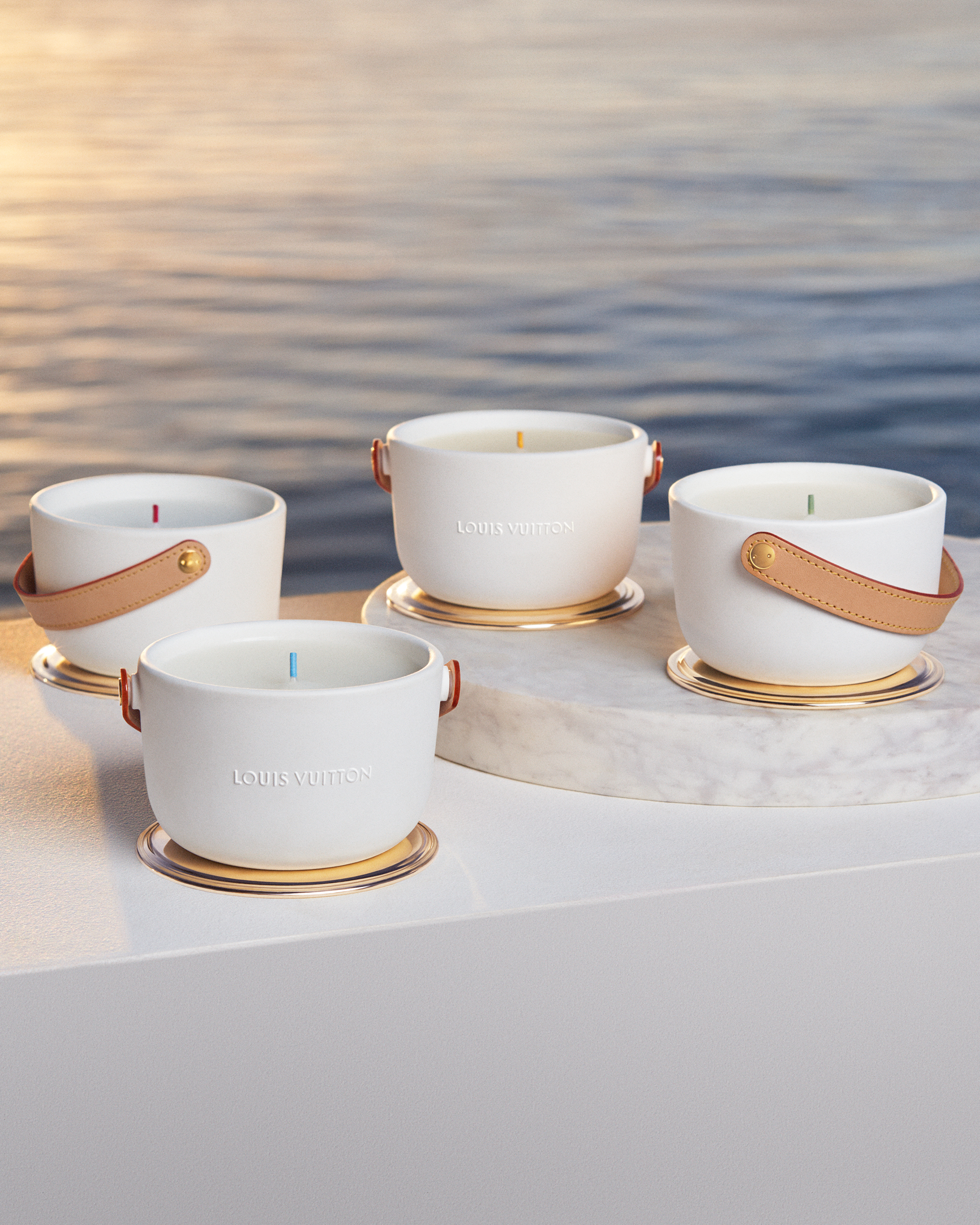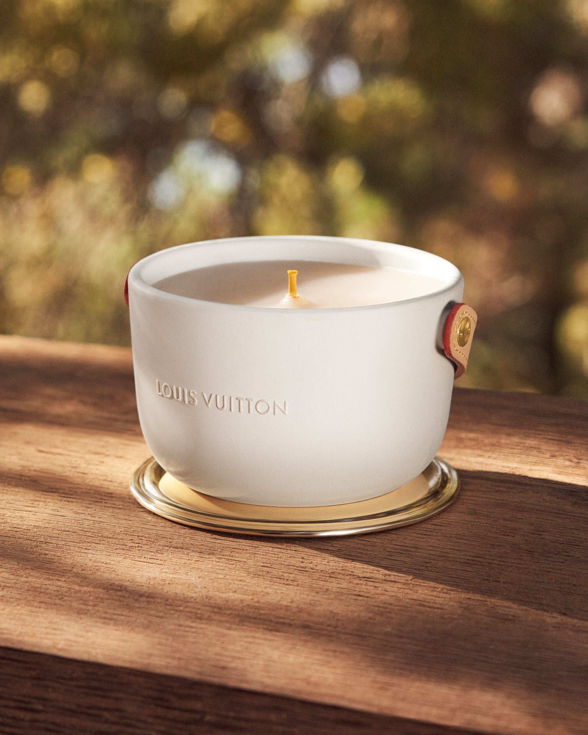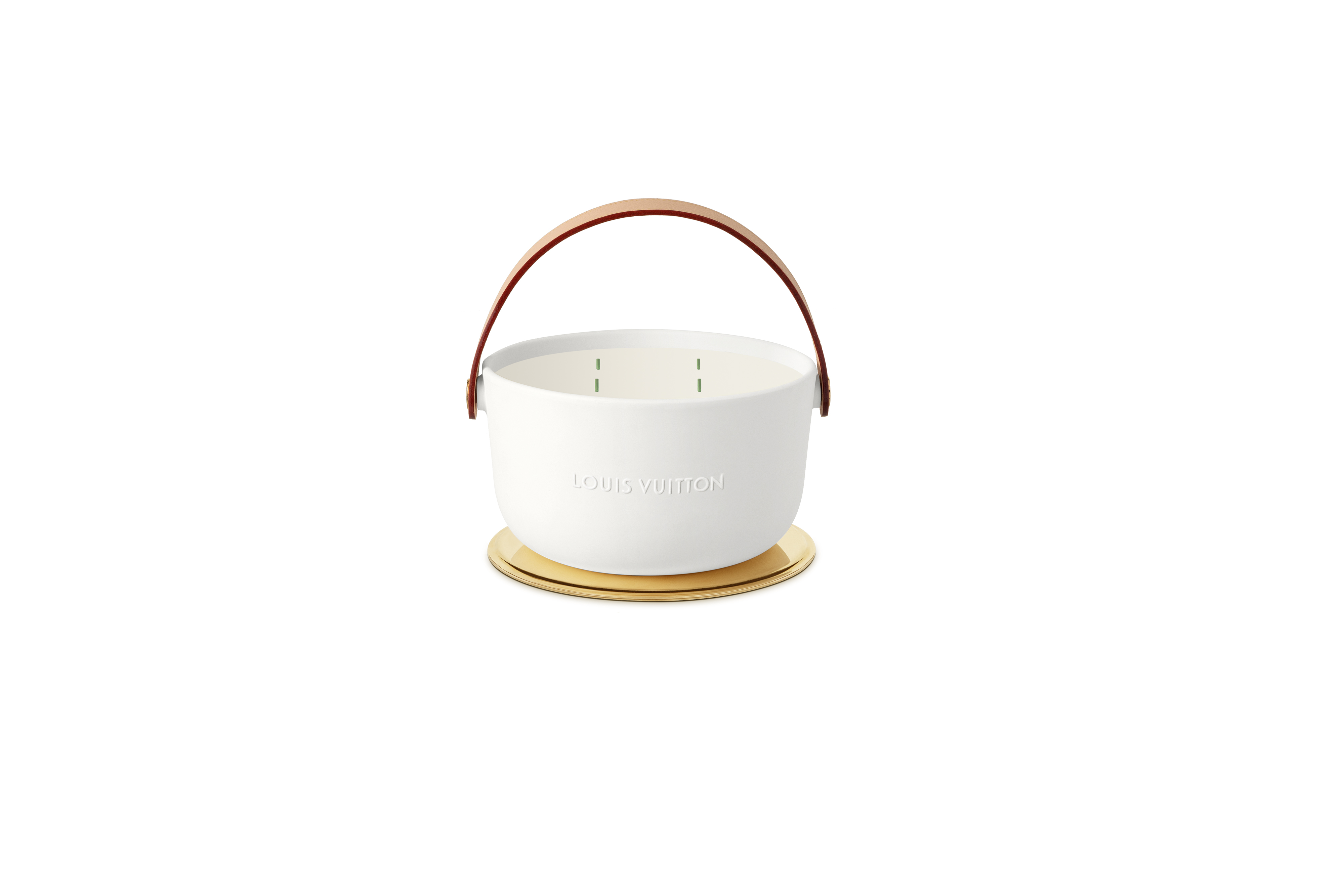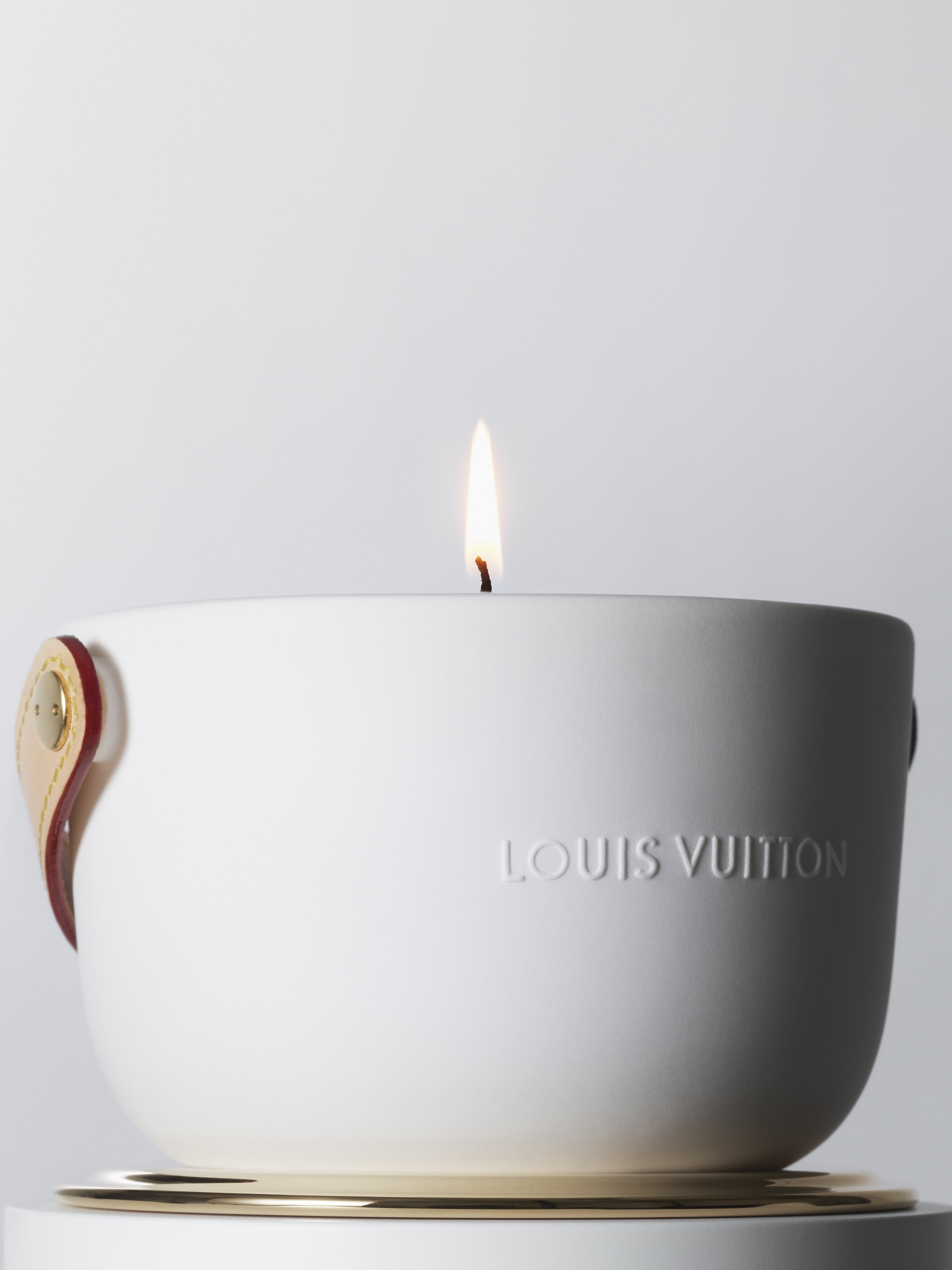 Logées dans des céramiques audacieuses signées du designer Marc Newson, ces bougies nomades à quatre mèches d’1,1kg se transportent aisément d’une pièce à l’autre grâce à leur anse en cuir naturel piqué à la main et accroché par un rivetage en métal. Confectionnée dans les ateliers de la Maison, l’anse en cuir naturel, signature emblématique de Louis Vuitton, vient donner son caractère nomade au produit sous sa forme première. Témoin de l’histoire du produit, ce cuir délicat acquiert une patine ambrée unique, propre à chacun, ainsi qu’une main plus souple avec le temps. Pour faire l’expérience du voyage olfactif, il faut soulever le couvercle de métal doré qui recouvre la bougie puis le placer en-dessous en guise de socle. On découvre alors la cire parfumée ainsi que les quatre mèches colorées à la main chez un artisan cirier, à Grasse.