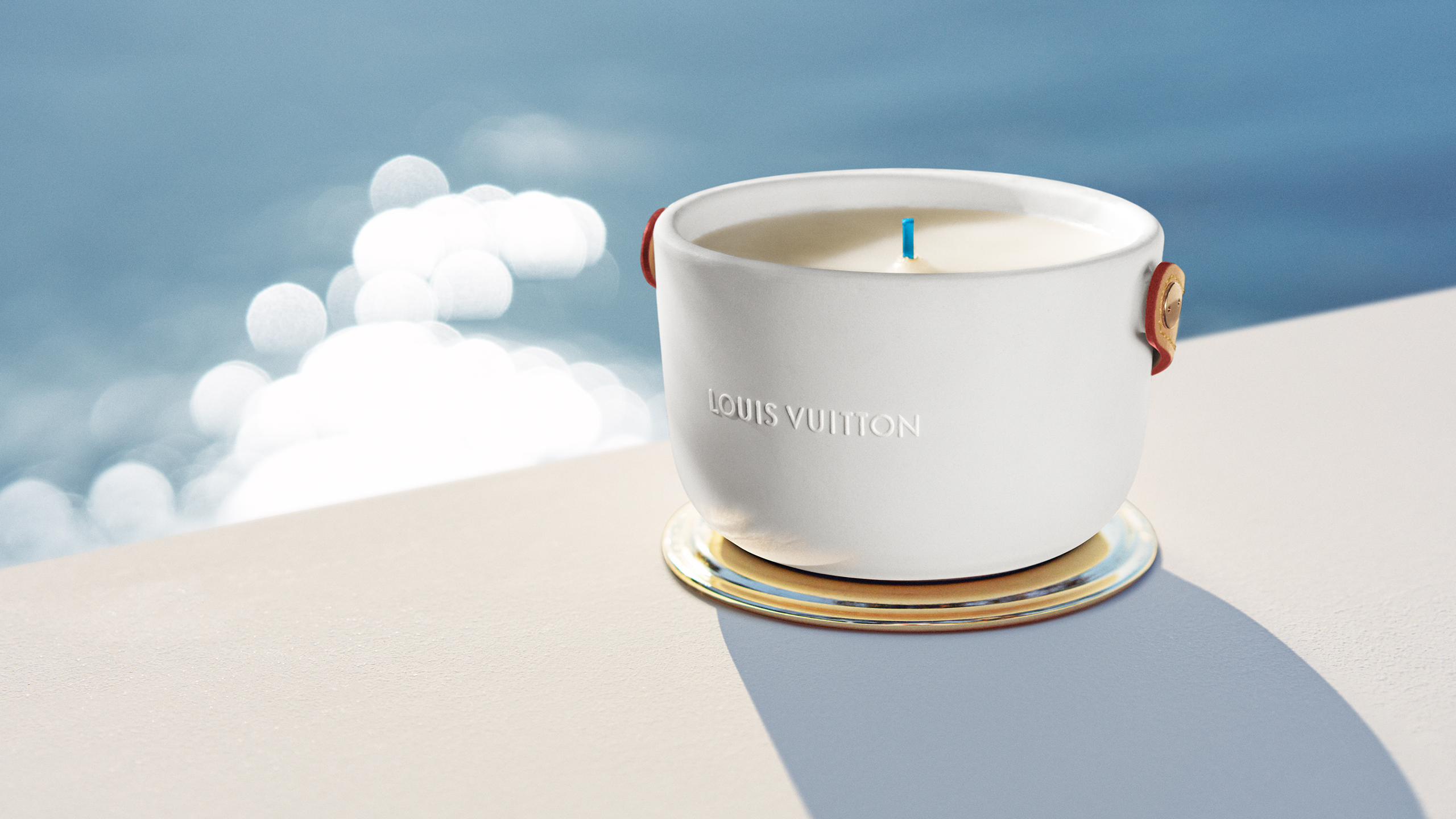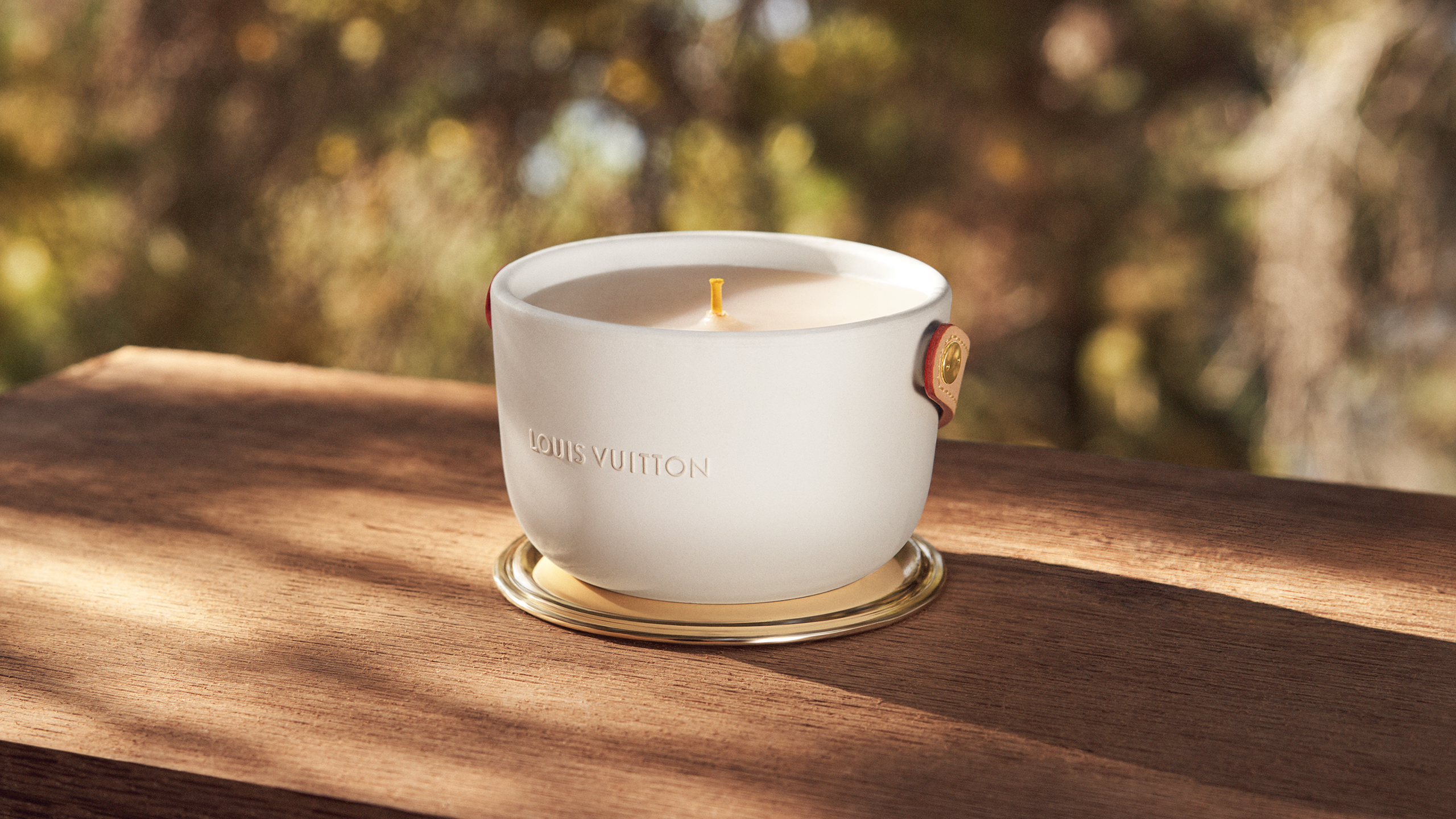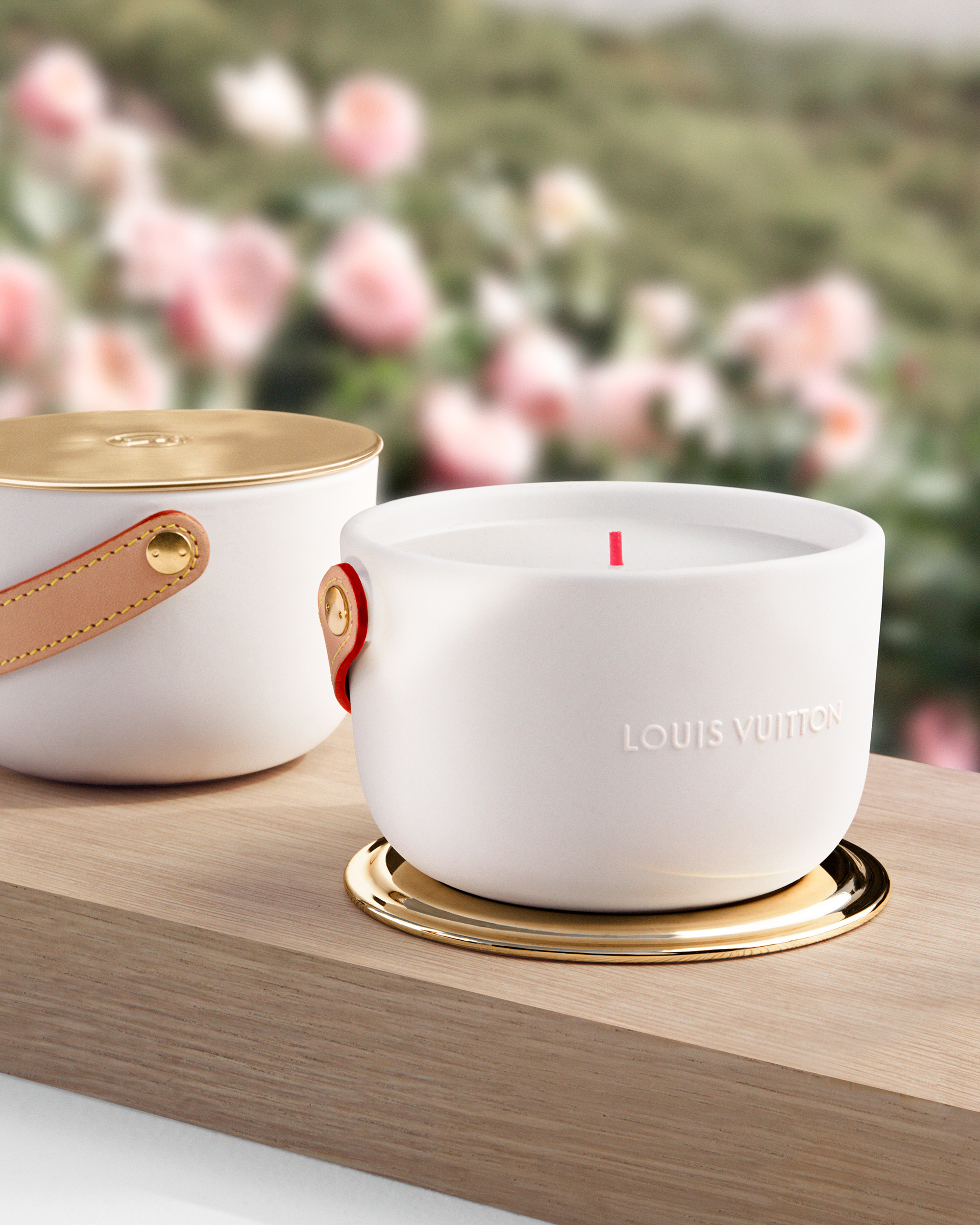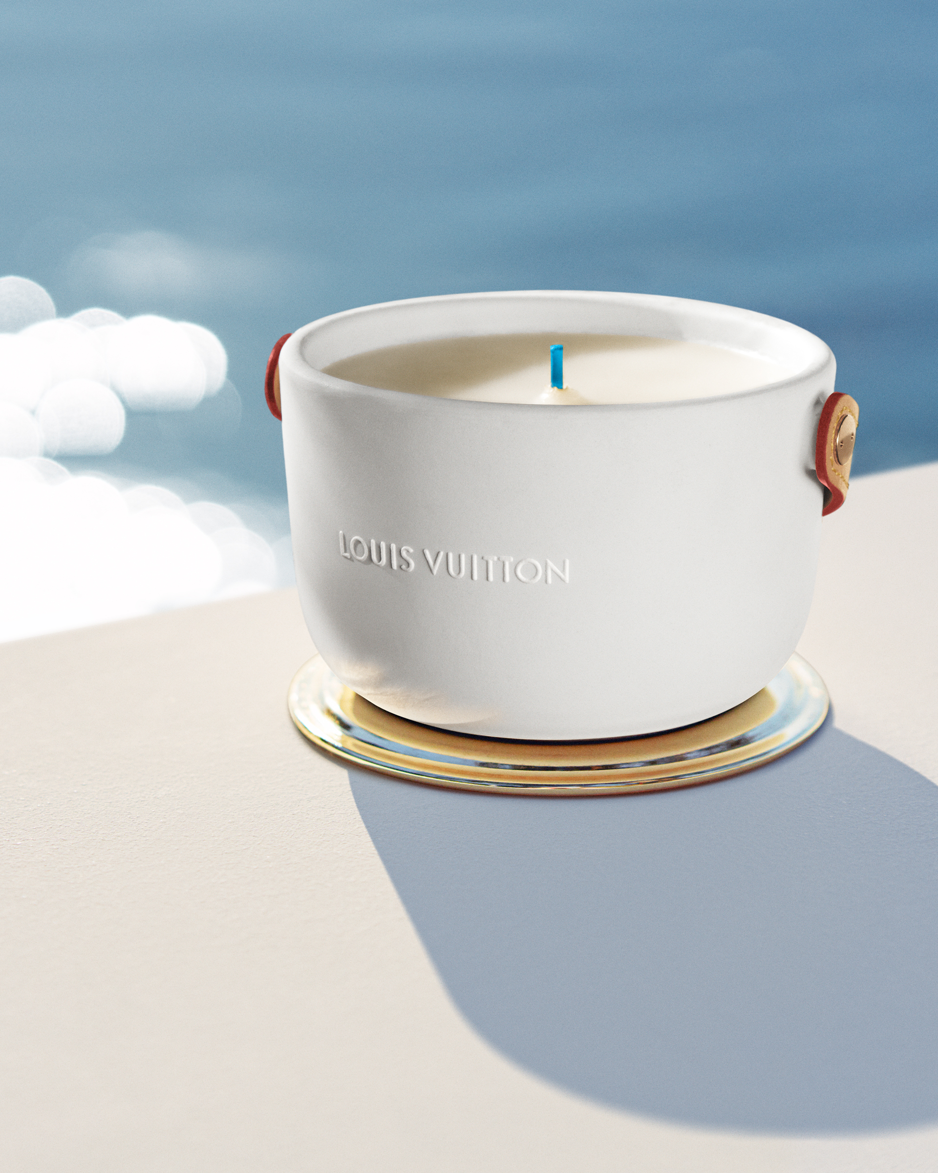 Logées dans des céramiques audacieuses signées du designer Marc Newson, ces bougies nomades à quatre mèches d’1,1kg se transportent aisément d’une pièce à l’autre grâce à leur anse en cuir naturel piqué à la main et accroché par un rivetage en métal. Confectionnée dans les ateliers de la Maison, l’anse en cuir naturel, signature emblématique de Louis Vuitton, vient donner son caractère nomade au produit sous sa forme première. Témoin de l’histoire du produit, ce cuir délicat acquiert une patine ambrée unique, propre à chacun, ainsi qu’une main plus souple avec le temps. Pour faire l’expérience du voyage olfactif, il faut soulever le couvercle de métal doré qui recouvre la bougie puis le placer en-dessous en guise de socle. On découvre alors la cire parfumée ainsi que les quatre mèches colorées à la main chez un artisan cirier, à Grasse.