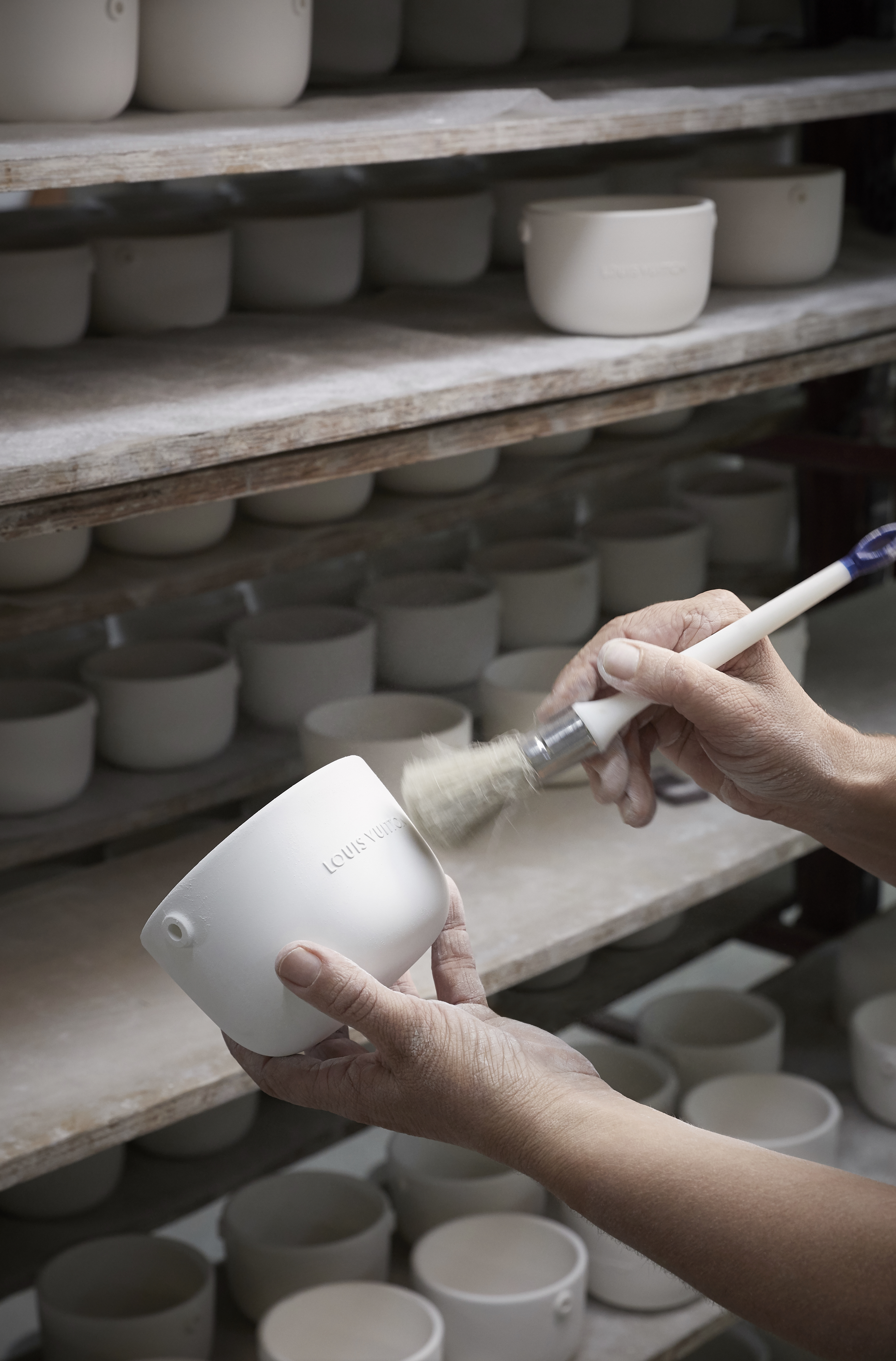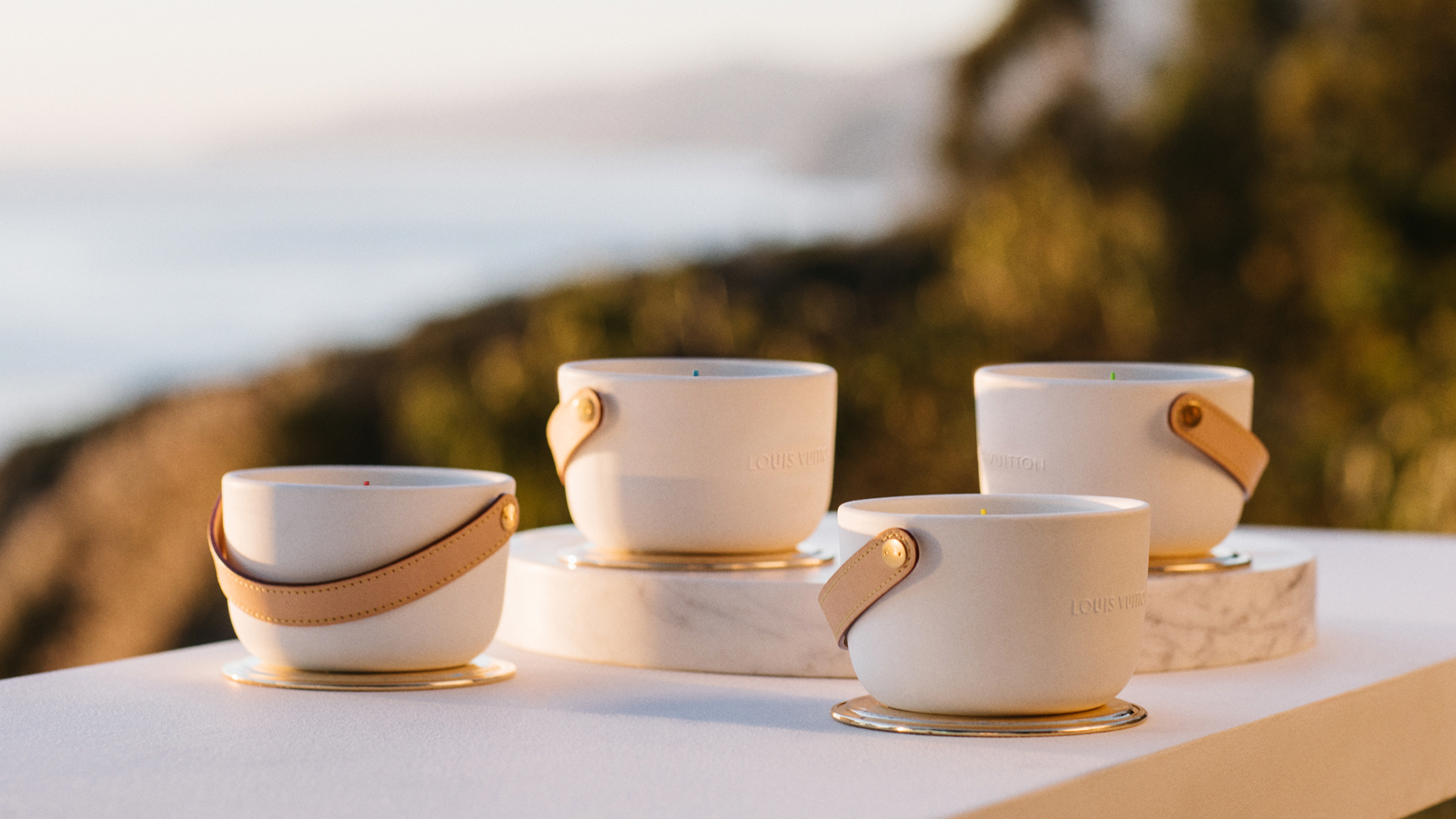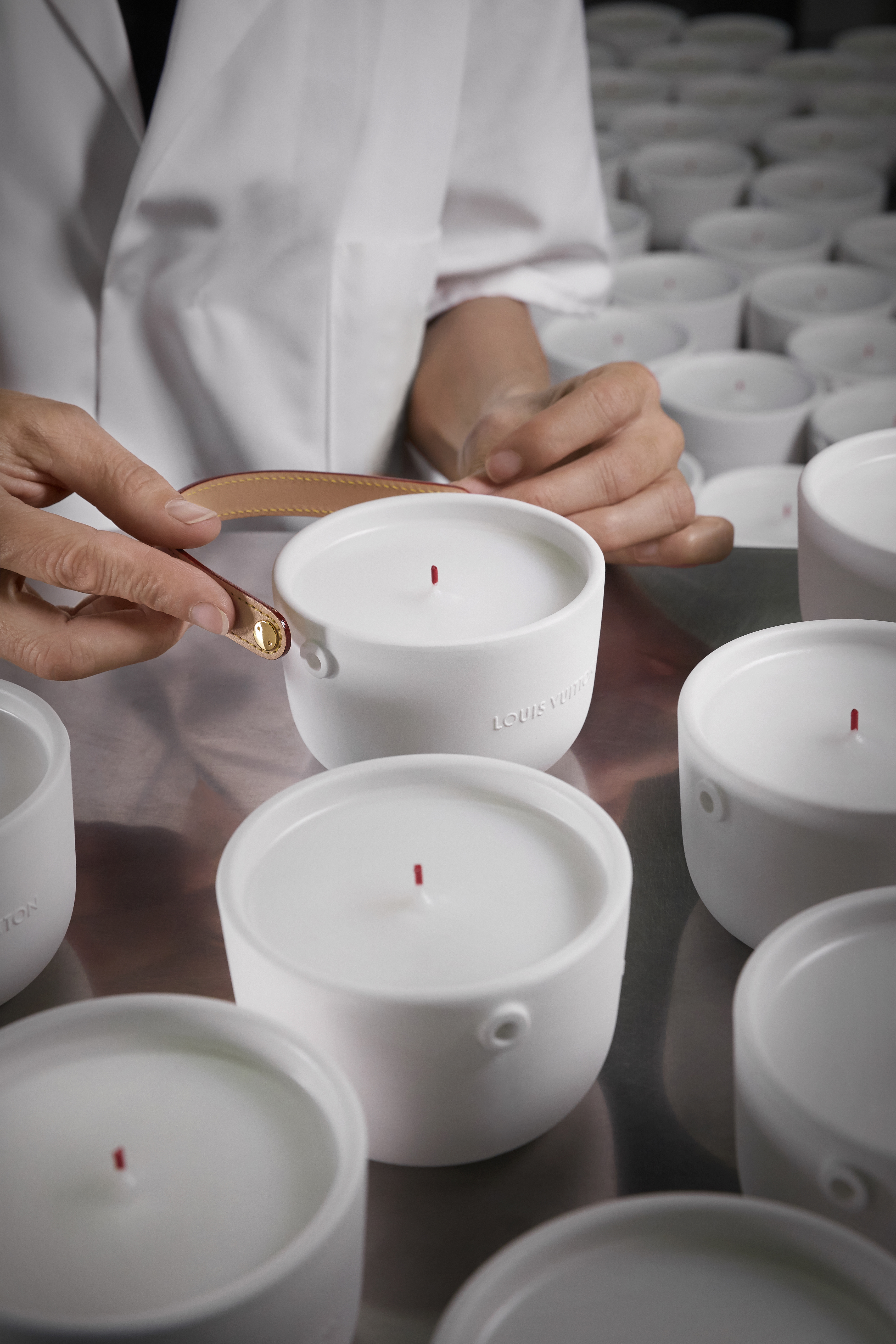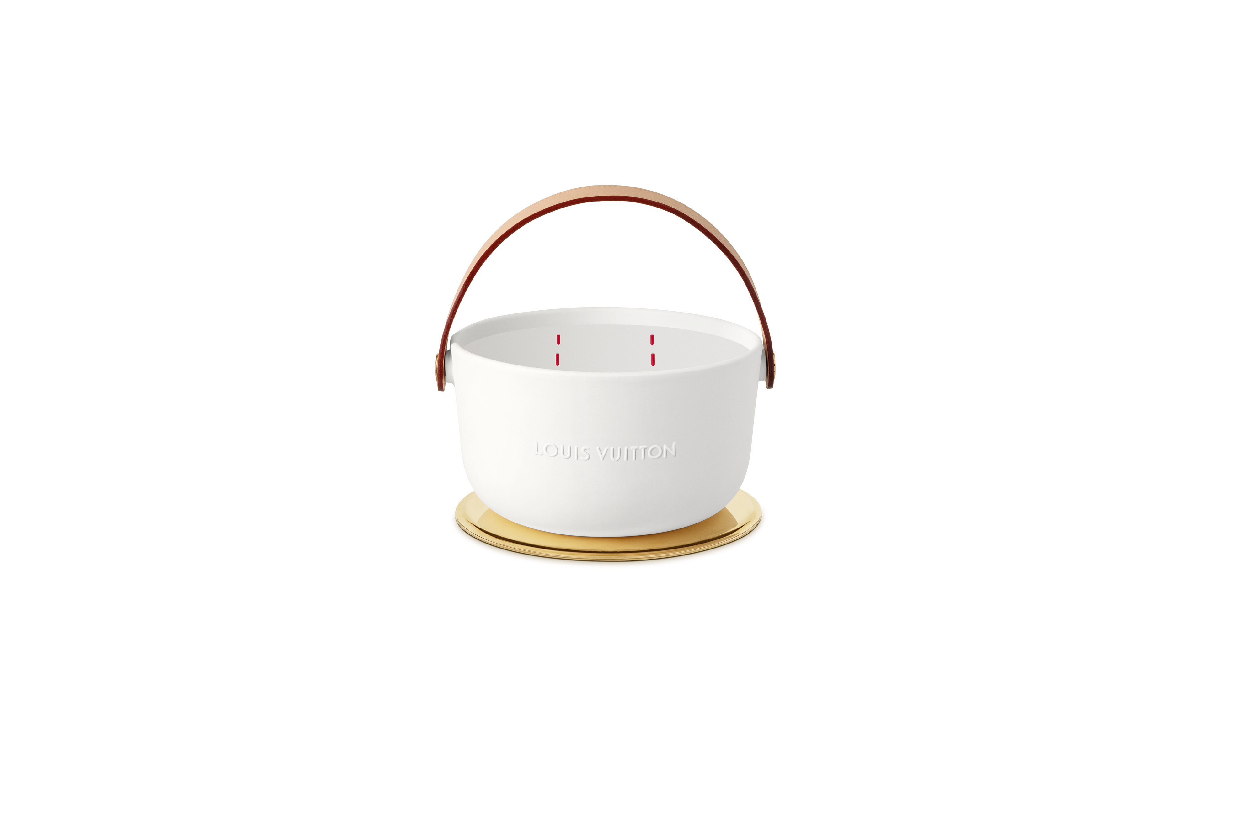 Logées dans des céramiques audacieuses signées du designer Marc Newson, ces bougies nomades à quatre mèches d’1,1kg se transportent aisément d’une pièce à l’autre grâce à leur anse en cuir naturel piqué à la main et accroché par un rivetage en métal. Confectionnée dans les ateliers de la Maison, l’anse en cuir naturel, signature emblématique de Louis Vuitton, vient donner son caractère nomade au produit sous sa forme première. Témoin de l’histoire du produit, ce cuir délicat acquiert une patine ambrée unique, propre à chacun, ainsi qu’une main plus souple avec le temps. Pour faire l’expérience du voyage olfactif, il faut soulever le couvercle de métal doré qui recouvre la bougie puis le placer en-dessous en guise de socle. On découvre alors la cire parfumée ainsi que les quatre mèches colorées à la main chez un artisan cirier, à Grasse.