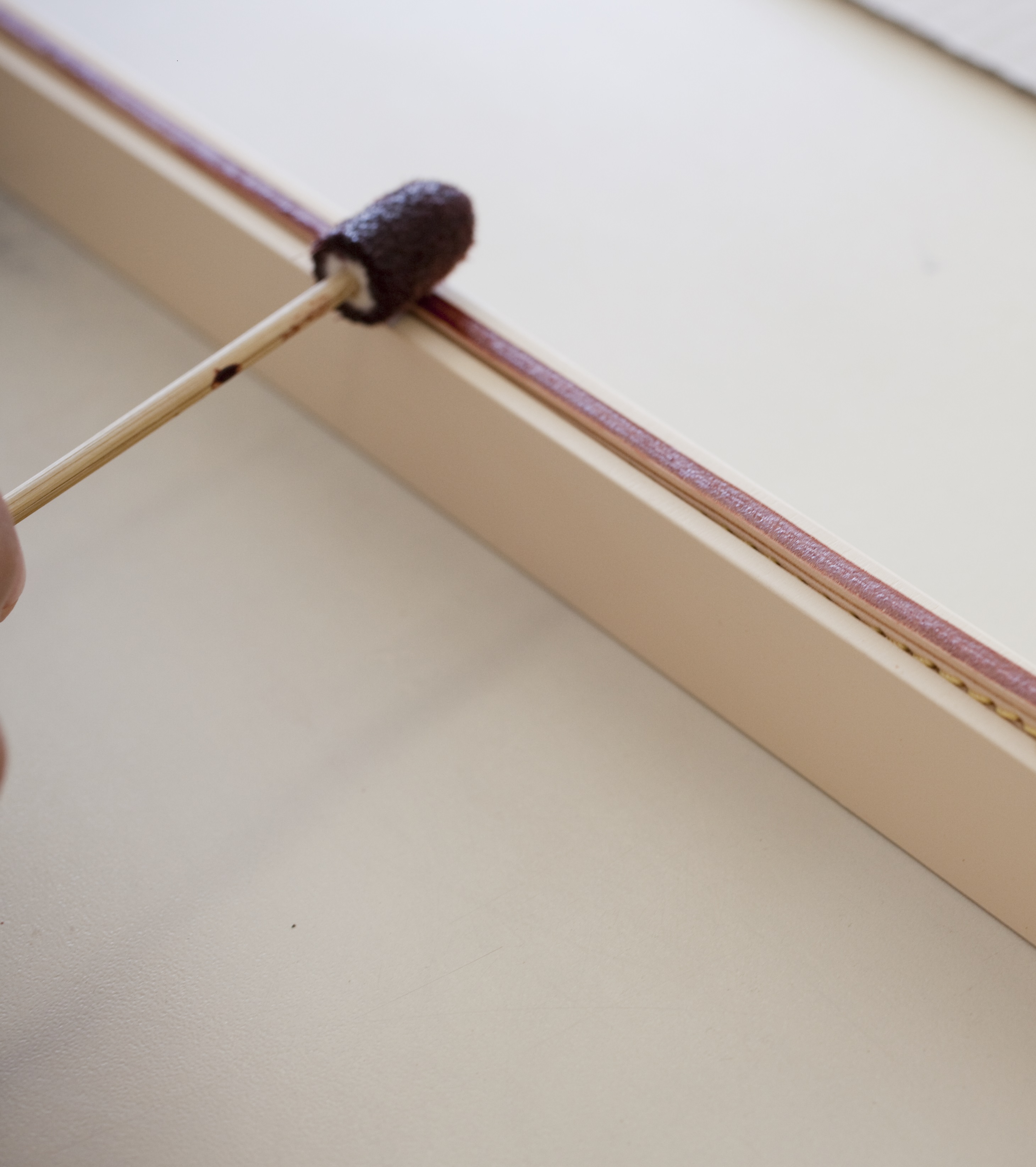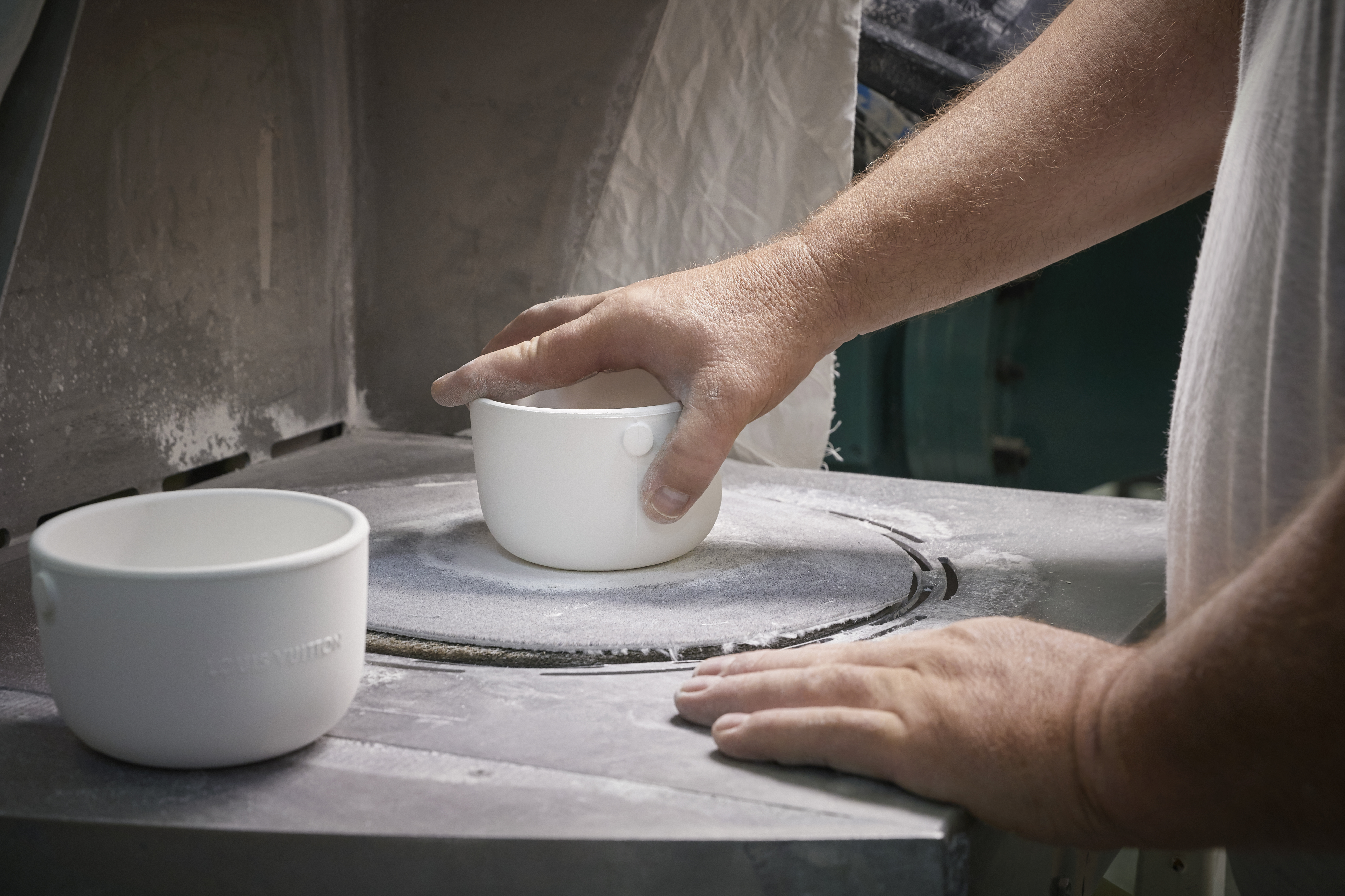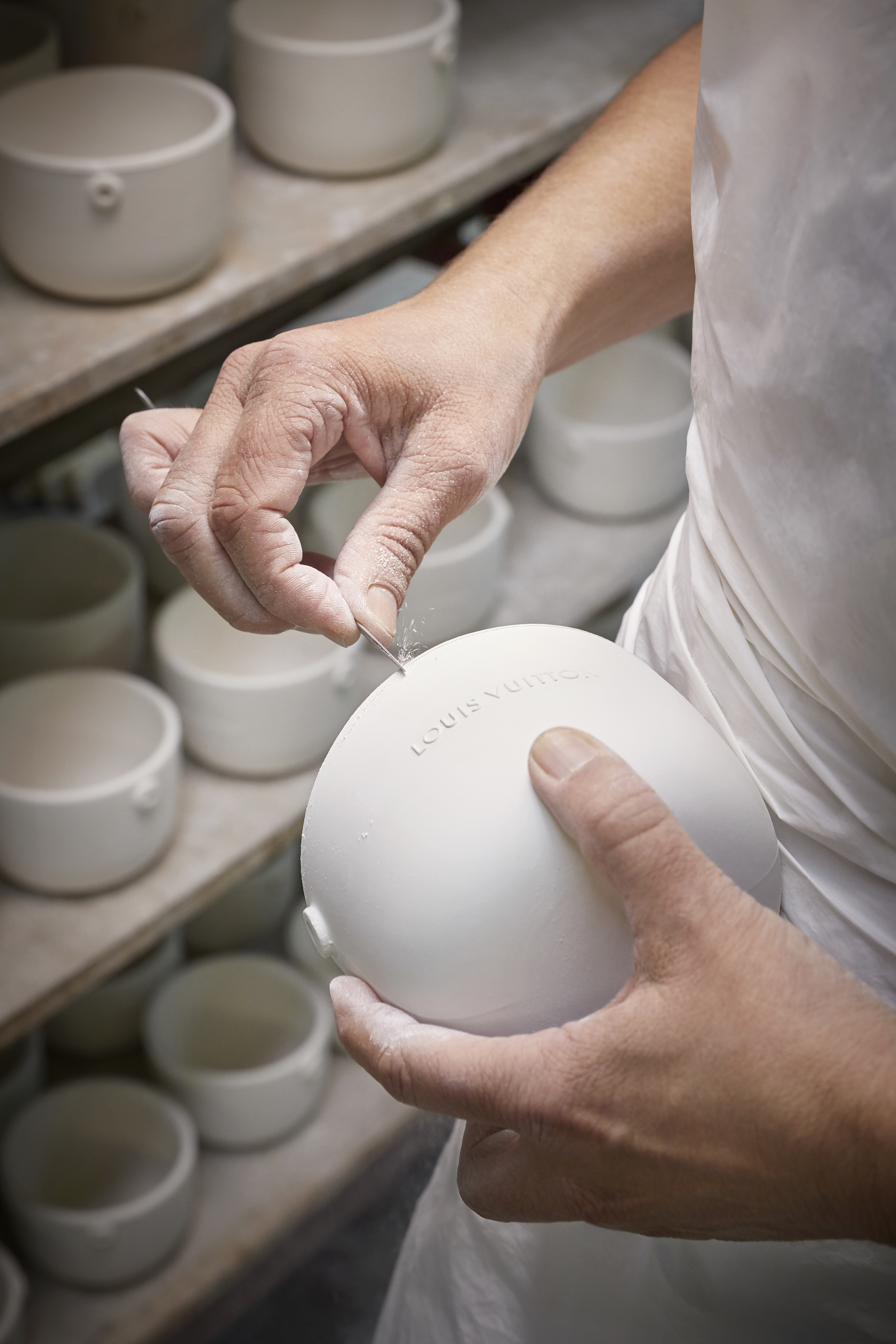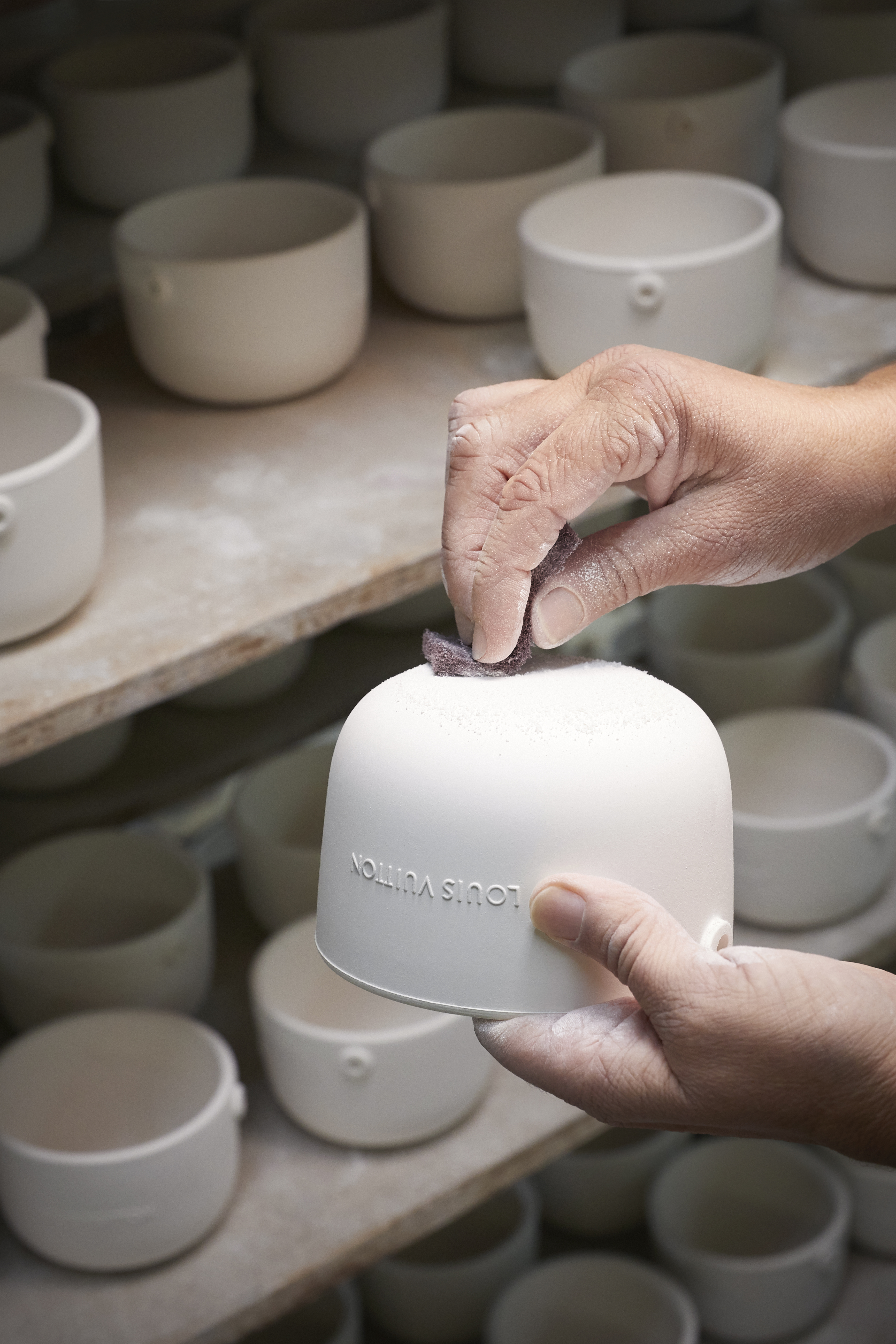 Logées dans des céramiques audacieuses signées du designer Marc Newson, ces bougies nomades à quatre mèches d’1,1kg se transportent aisément d’une pièce à l’autre grâce à leur anse en cuir naturel piqué à la main et accroché par un rivetage en métal. Confectionnée dans les ateliers de la Maison, l’anse en cuir naturel, signature emblématique de Louis Vuitton, vient donner son caractère nomade au produit sous sa forme première. Témoin de l’histoire du produit, ce cuir délicat acquiert une patine ambrée unique, propre à chacun, ainsi qu’une main plus souple avec le temps. Pour faire l’expérience du voyage olfactif, il faut soulever le couvercle de métal doré qui recouvre la bougie puis le placer en-dessous en guise de socle. On découvre alors la cire parfumée ainsi que les quatre mèches colorées à la main chez un artisan cirier, à Grasse.