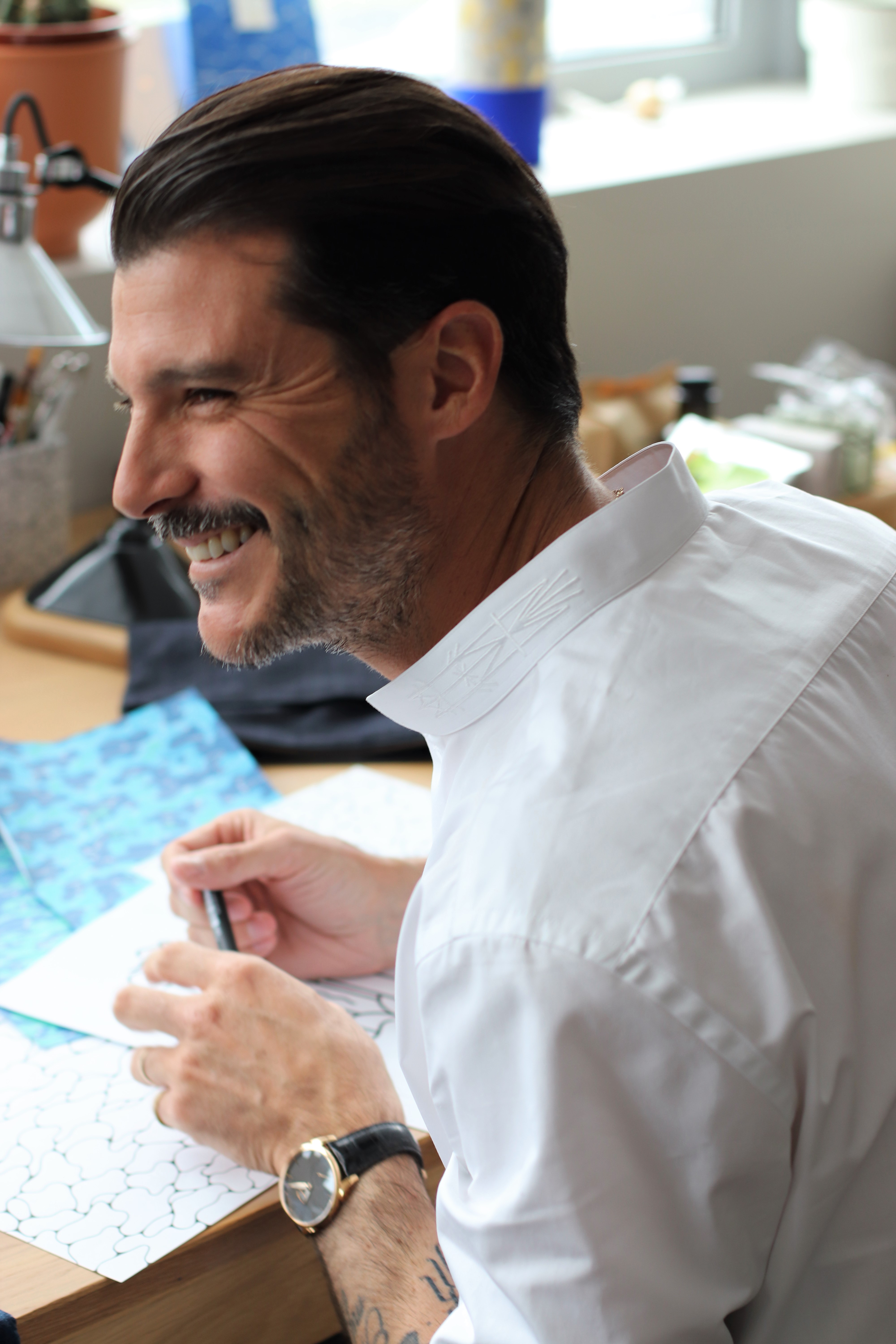 C’est à l’artiste peintre et tatoueur Supakitch que le maitre chemisier a ouvert ses portes. Il signe pour la maison dix modèles inédits de dessins « tatouages » à broder et une collection exclusive mixte de quinze pièces.