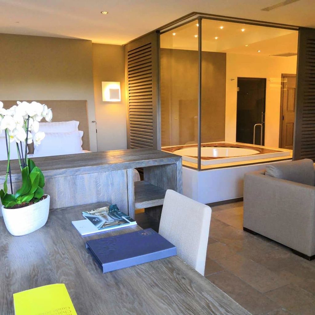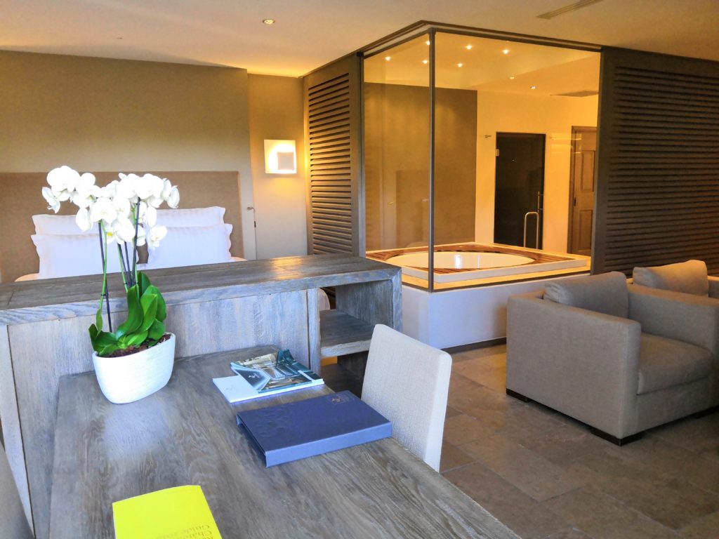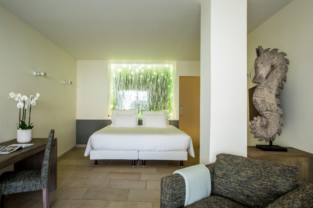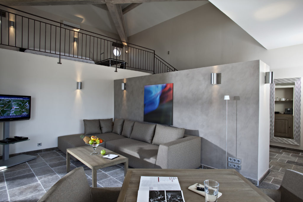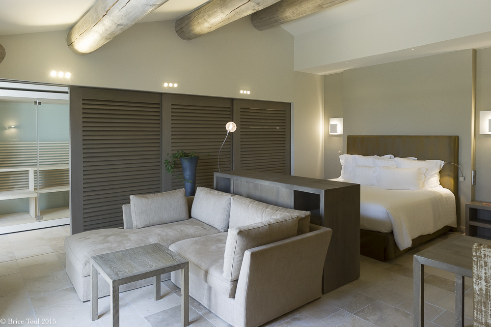 A l’intérieur, une salle de séjour spacieuse et lumineuse, un lit King Size en mezzanine – le tout dans une atmosphère contemporaine aux couleurs chaudes de la Provence. Pour des moments d’ultime détente, la Suite de Luxe Piscine dispose également d’une cabine hammam deux places, d’une baignoire balnéo et d’une douche double à l’italienne