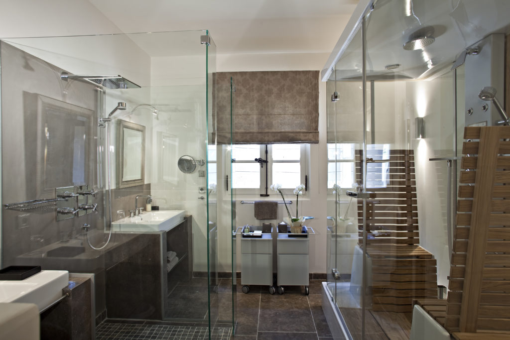 Feutrés et intimes, l’aménagement et la décoration ont été étudiés avec soin – Starck pour les sanitaires, des artisans locaux pour les boiseries et la pierre naturelle et les tissus sélectionnés auprès de grands éditeurs tels que Frey, Manuel Canovas, Rubelli, Zimmer, Rohde etc.C