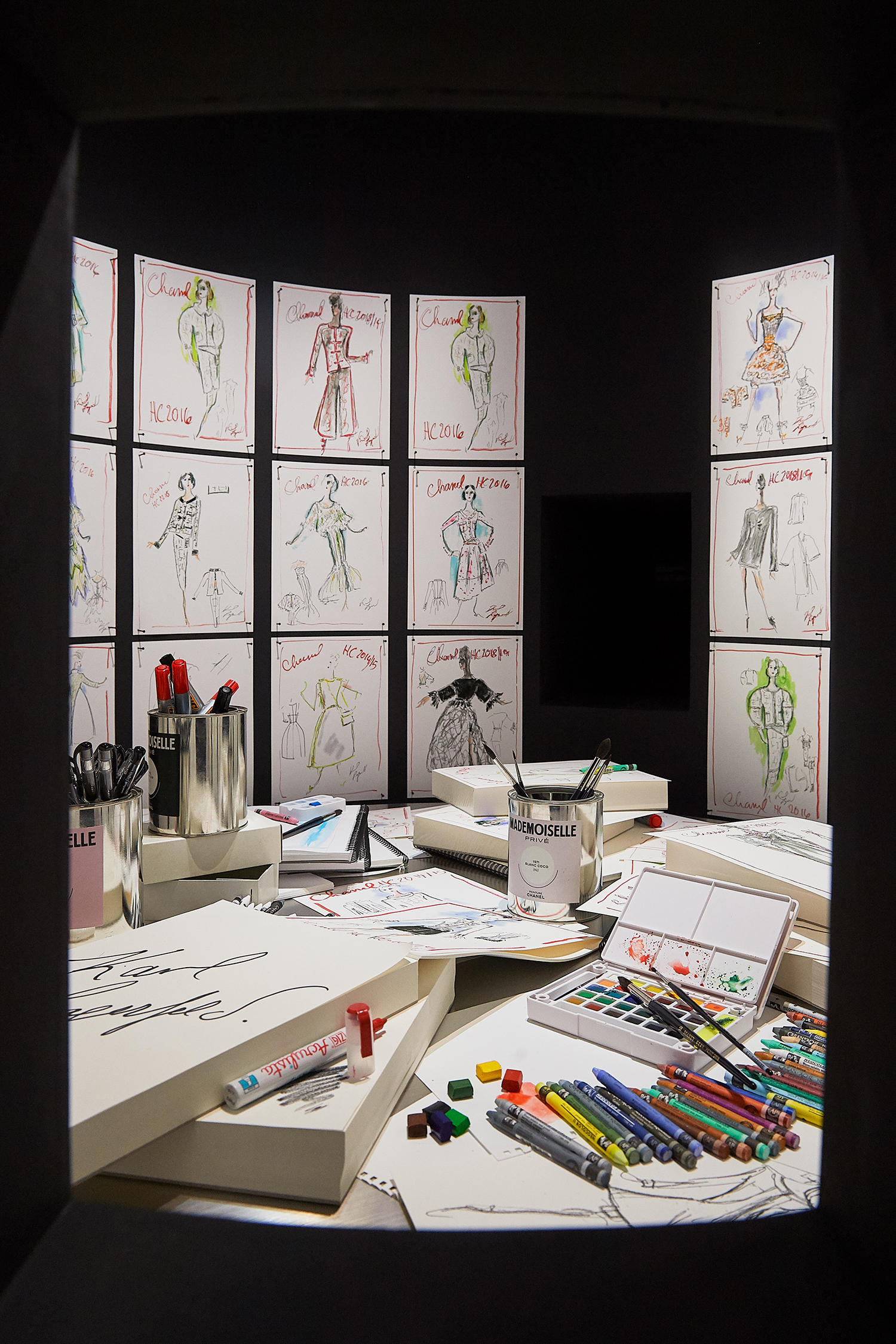 Au centre de la maison consacrée à la Haute Couture, l’exposition permet de découvrir la table de travail de Karl Lagerfeld dans le Studio de création du 31 rue Cambon. Ses croquis mettent à jour la ligne, l’allure et les détails, révèlent la richesse du processus créatif et dévoilent l’aspiration constante et indéfectible à la beauté.