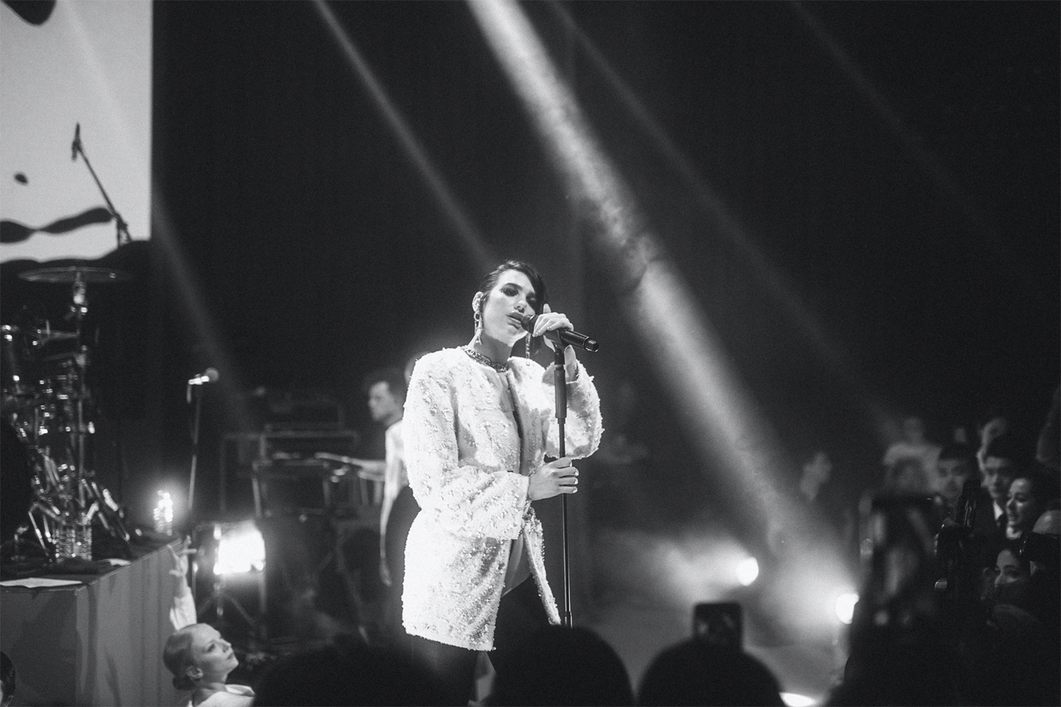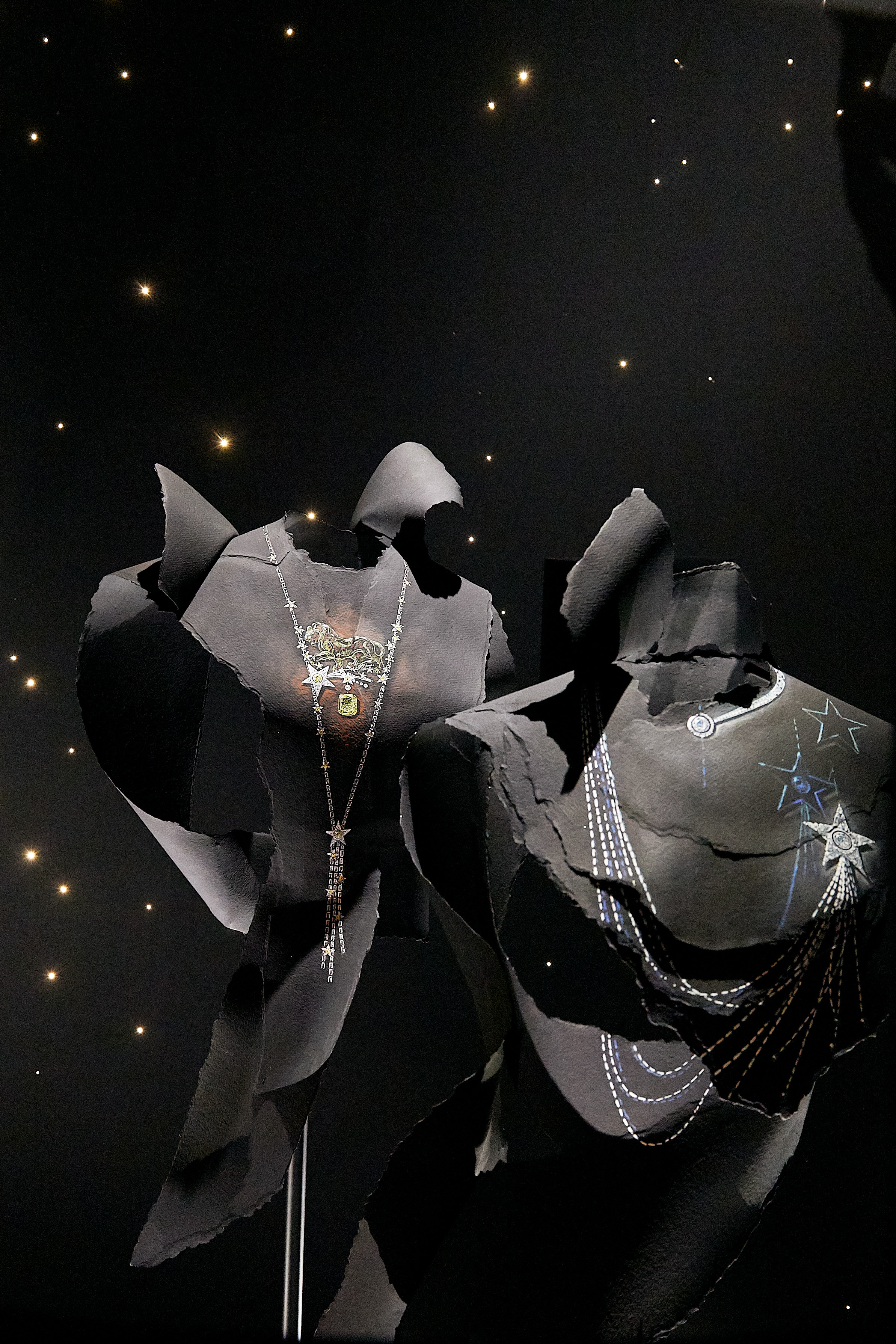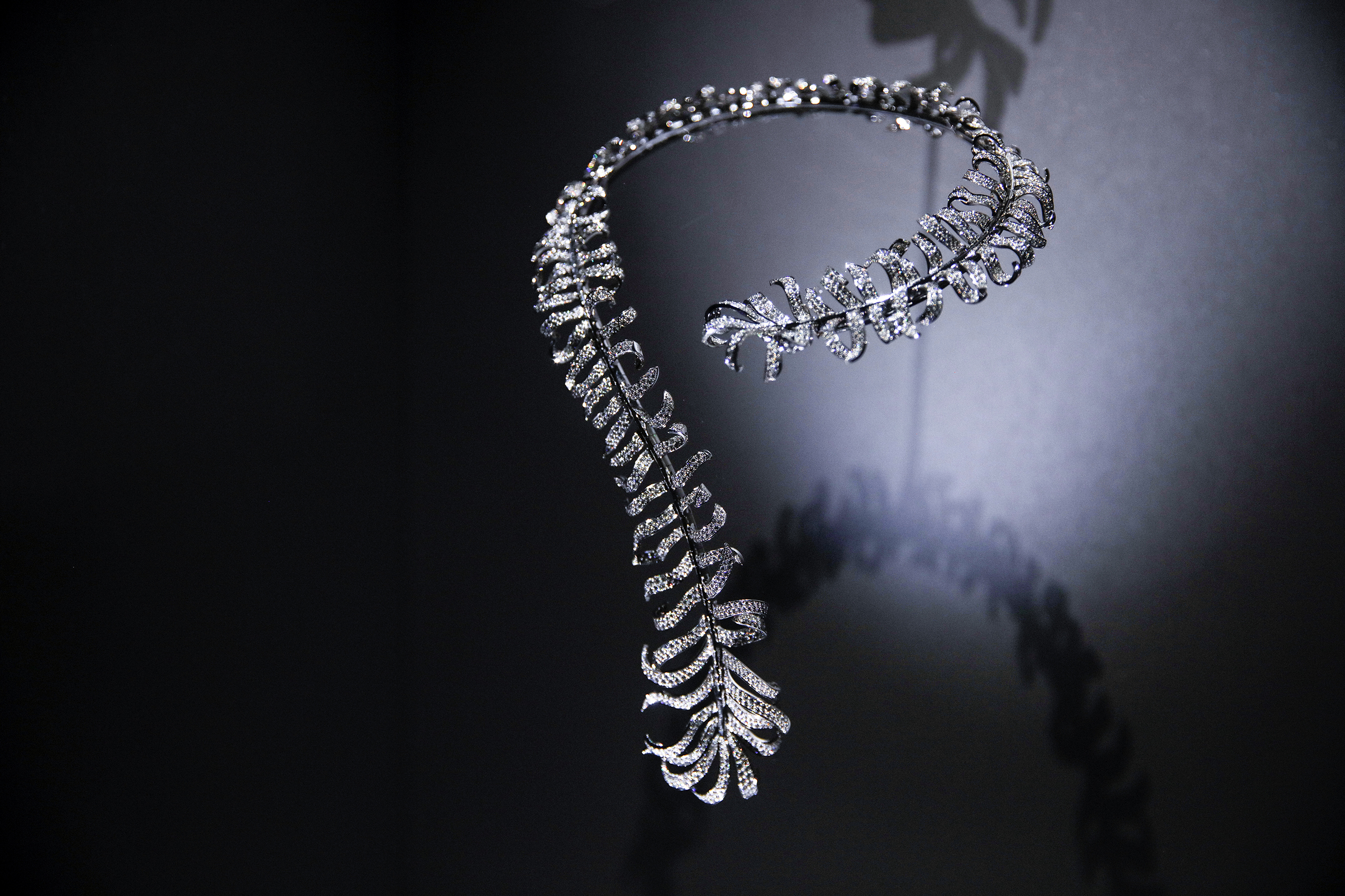 Une « Comète » de diamant se drape au creux du cou comme une écharpe, une bague ouverte laisse entrevoir un peu de peau entre deux diamants imposants, une grande broche plume articulée chevauche une épaule, des bracelets souples se lovent au poignet, des « Franges » de diamant se portent en diadème, tandis qu’une pluie d’étoile ruisselle sur un décolleté…