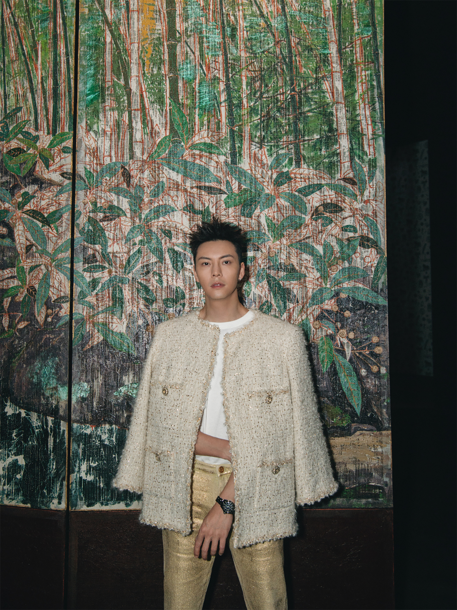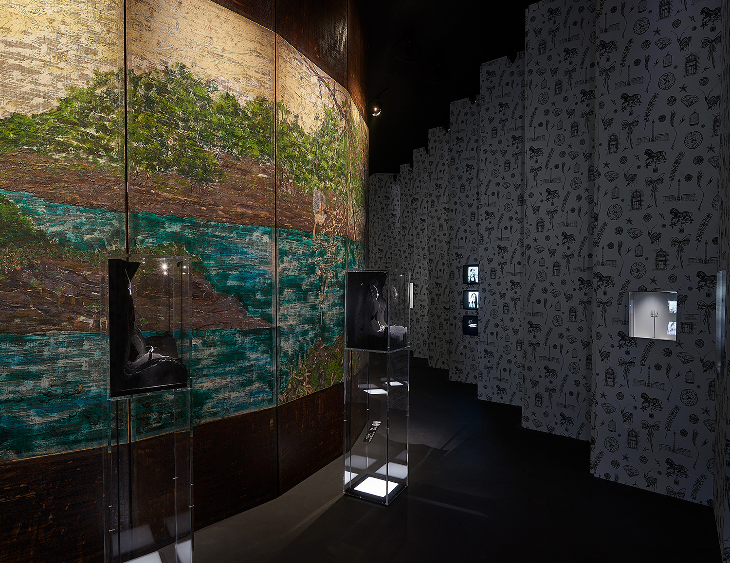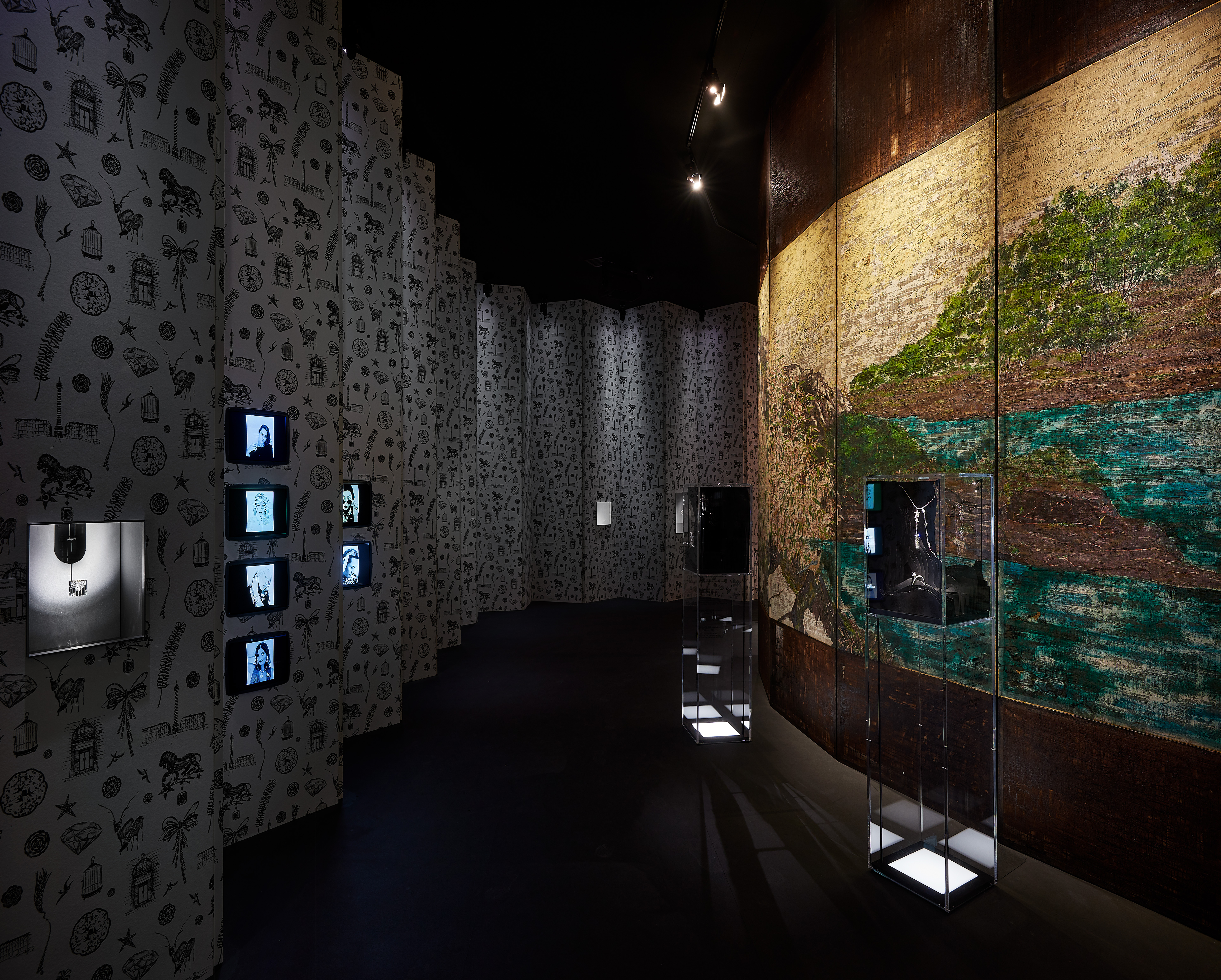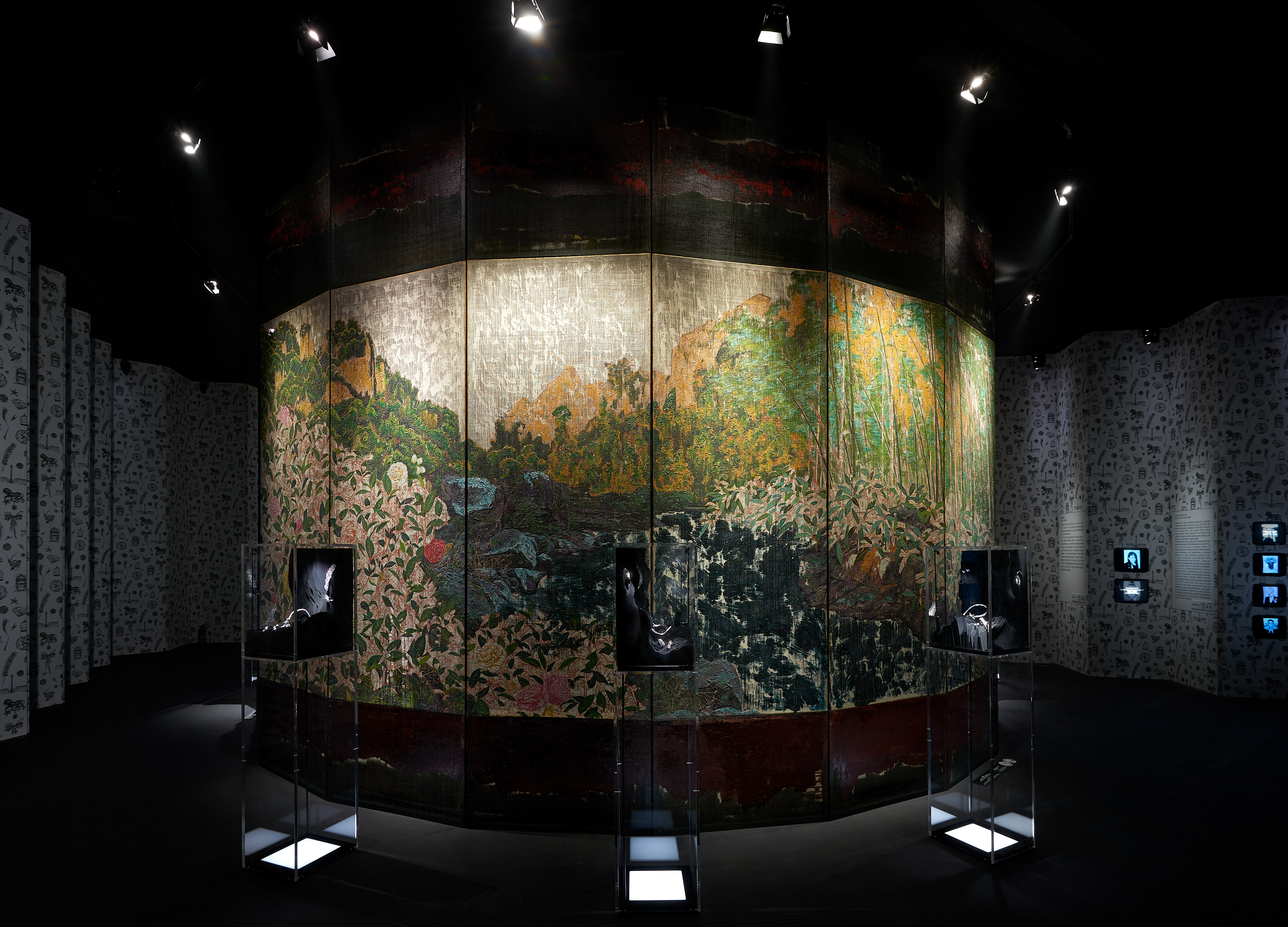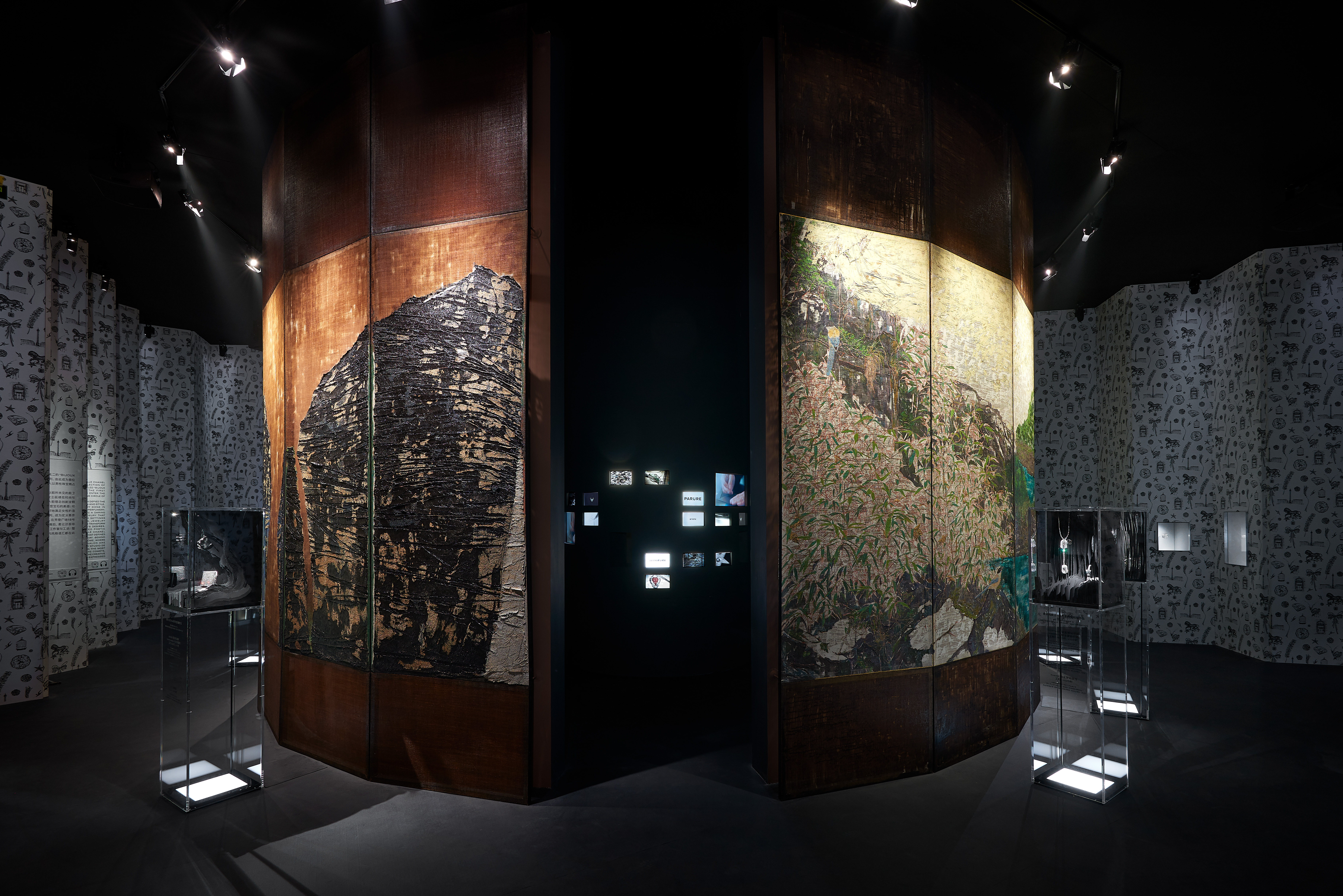 Leurs motifs de fleurs et d’oiseaux, le contraste subtil entre le noir profond de la laque, les couleurs chatoyantes et les touches d’or font écho à son vocabulaire esthétique et à sa sensibilité. À l’occasion de cette exposition, les paravents de Coromandel de Mademoiselle Chanel sont réinterprétés dans une version contemporaine par l’artiste chinois Wu Guanzhen qui a imaginé trois paravents de laque intitulés « Lofty Mountain », « Early Spring » et « Garden of Pleasure ». Chacun d’eux met en scène les motifs du répertoire traditionnel : la montagne, les oiseaux, les fleurs tels que les voit un artiste aujourd’hui.