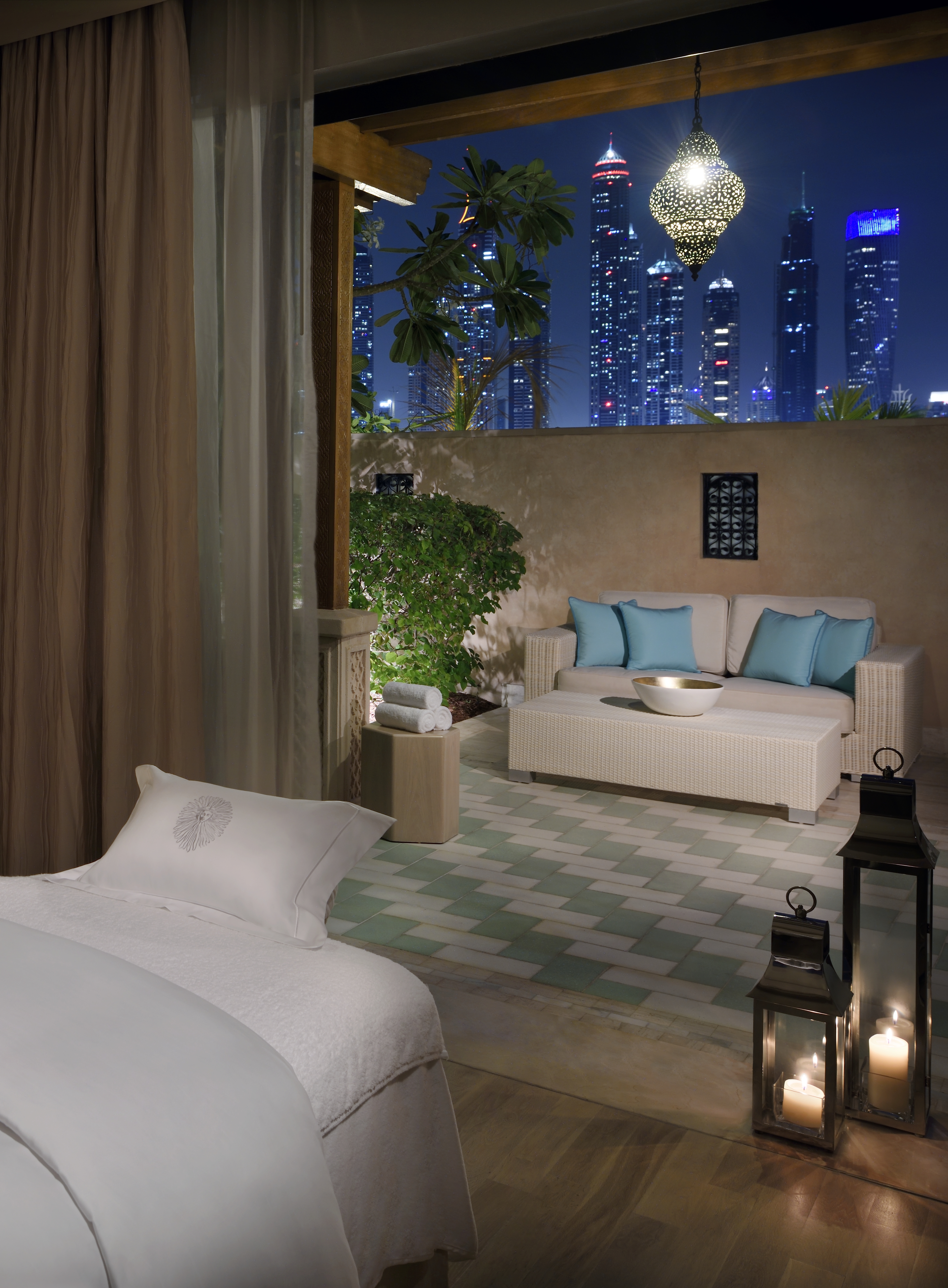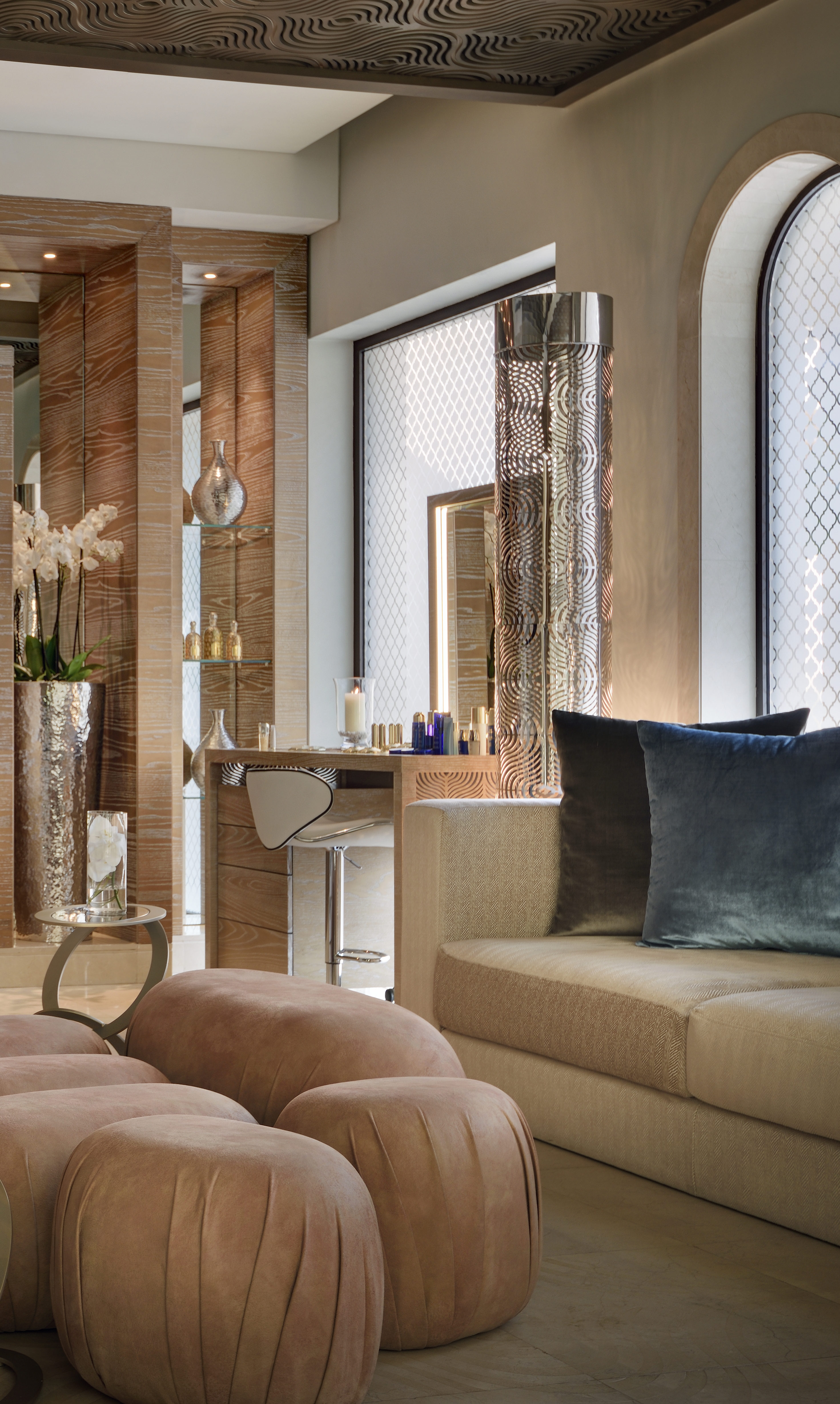 Seul Spa Guerlain aux Émirats Arabes Unis, le spa du One&Only The Palm est un réel havre de paix auquel on accède par une cour aux inspirations mauresques avec des arcades en pierre et des allées bordées de fontaines. Proposant des soins exclusivement conçus pour le One&Only The Palm par la Maison Guerlain, le spa dispose de cabines de soins individuelles, d’une cabine pour les couples, d’une cabine équipée d’un hammam privé ainsi que d’une salle de relaxation et une piscine privée.