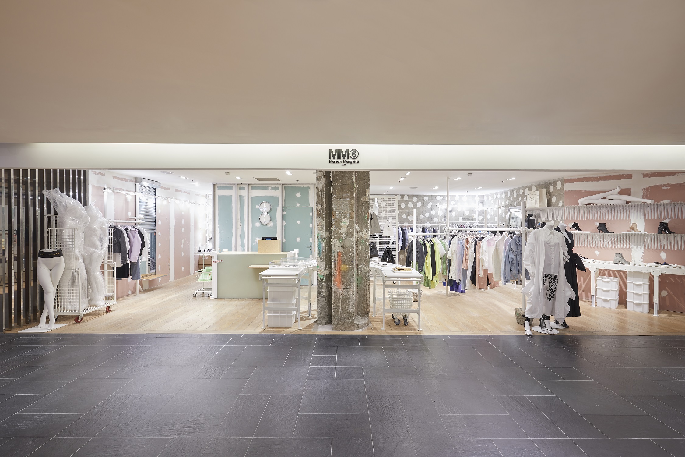 Se fondre dans l’anonymat le plus total tout en assumant son identité singulière… La nouvelle boutique MM6 Maison Margiela du Printemps s’inscrit dans une esthétique audacieuse et un concept qui rompt avec les codes de la distribution traditionnelle. Lancée en 1997, MM6 est la ligne contemporaine de Maison Margiela. Elle propose une approche singulière des codes de la mode féminine du quotidien à travers des coupes et des imprimés déclinés en vêtements, chaussures et maroquinerie.