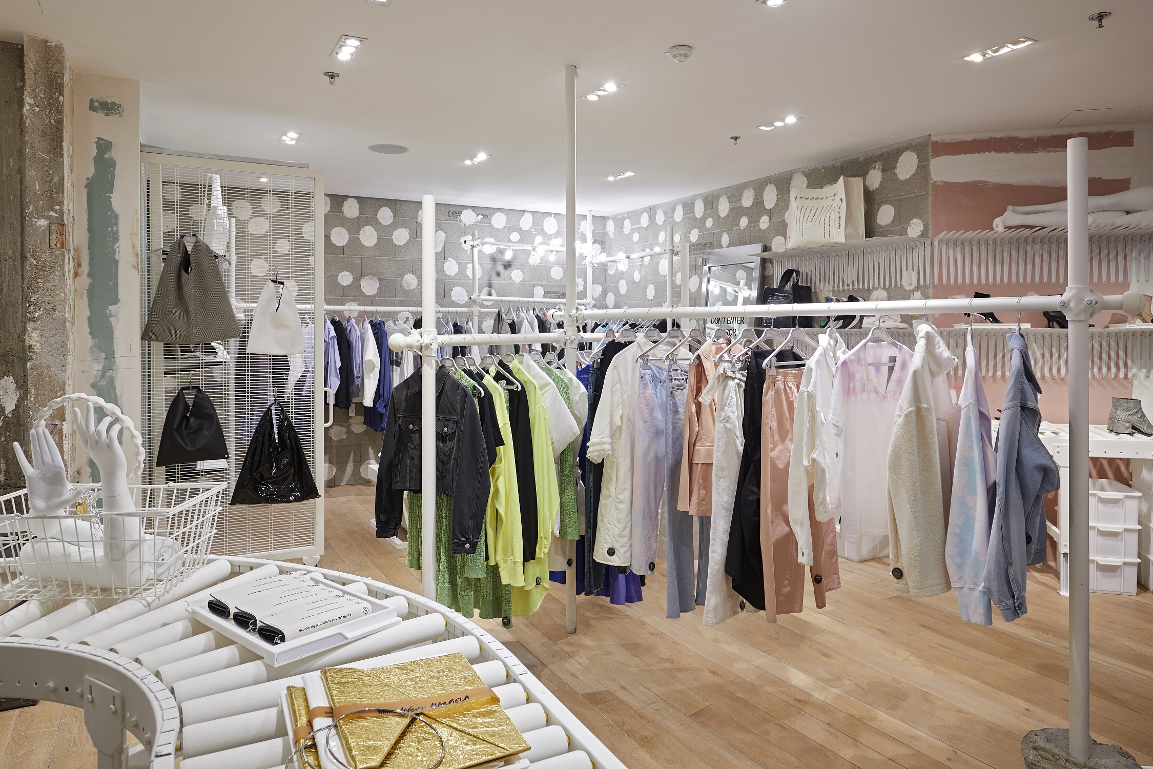 Si l’aménagement évoque surtout l’anonymat, principe fondateur de la Maison Margiela, il s’inscrit aussi dans la mobilité et le recyclage, deux valeurs cardinales de notre époque. Les miroirs sont présentés à la verticale dans leur caisse de transport ou dans des encadrements de porte et une table en bois aggloméré enchâssé dans des renforts de polystyrène verni accueille la caisse enregistreuse. La surprise se prolonge jusqu’au fond de la boutique, où la cabine d’essayage est constituée d’un étonnant mariage de soufflets de bus et de parois en toile de parachute.
