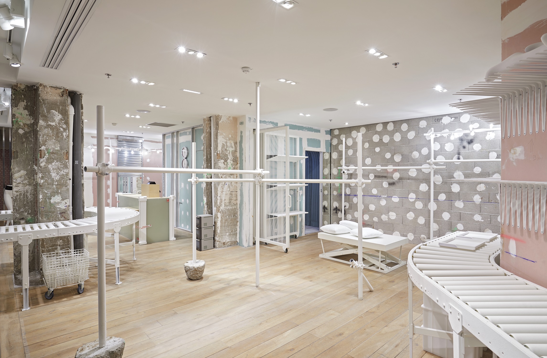 Au sein de ce nouvel espace, les équipes de MM6 ont marié l’ADN de la marque à la quintessence de notre époque. Piliers en parpaing ou murs en Placoplatre : elles ont choisi de conserver l’existant, comme s’il avait été abandonné par son dernier occupant. Les 76 m2 sont habités par un mobilier industriel en acier tubulaire floqué au spray velours blanc. Comme des ready-made abstraits, fragiles, qui contrastent avec la brutalité des lieux…