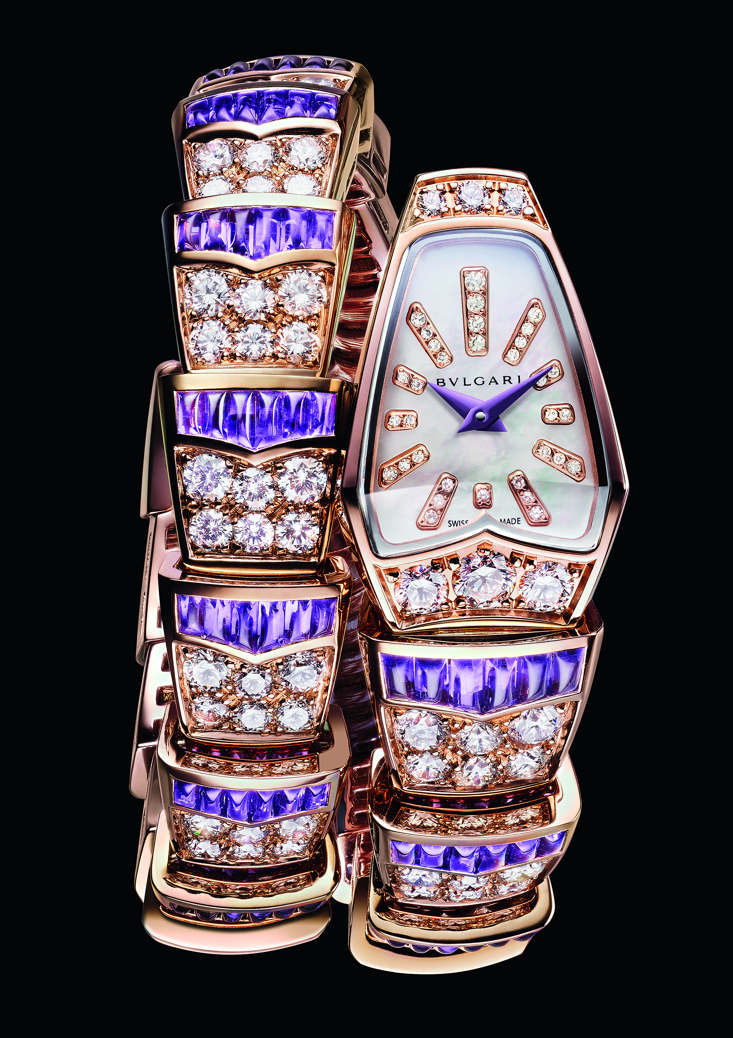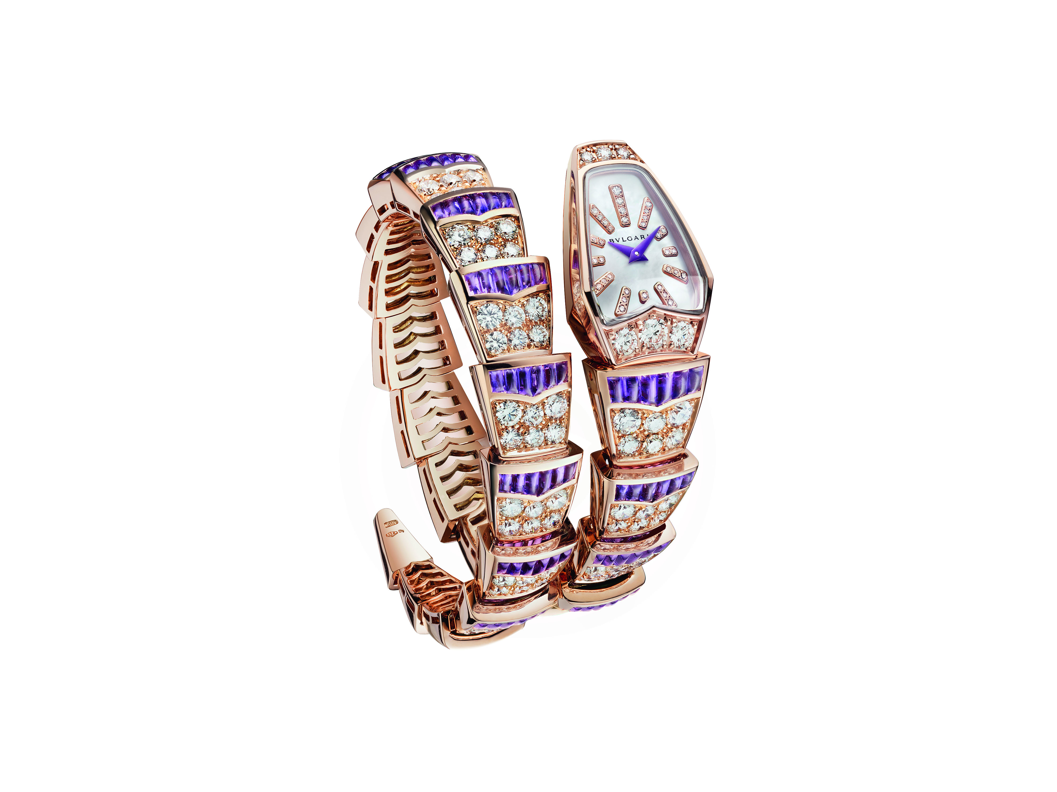 La montre Serpenti Scaglie a fait ses débuts en 2009 et a été érigée instantanément au statut d’icône grâce à son bracelet s’enroulant autour du poignet et son cadran en forme de tête de serpent. Elle est réinterprétée avec des améthystes suiffées serties sur de l’or rose et sublimées par des diamants taille brillant pour ressembler aux scaglie, le mot italien pour écailles. Les 126 améthystes représentent un poids total de 6.65 carats. Le violet des aiguilles forme un contraste saisissant avec la nacre blanche du cadran.