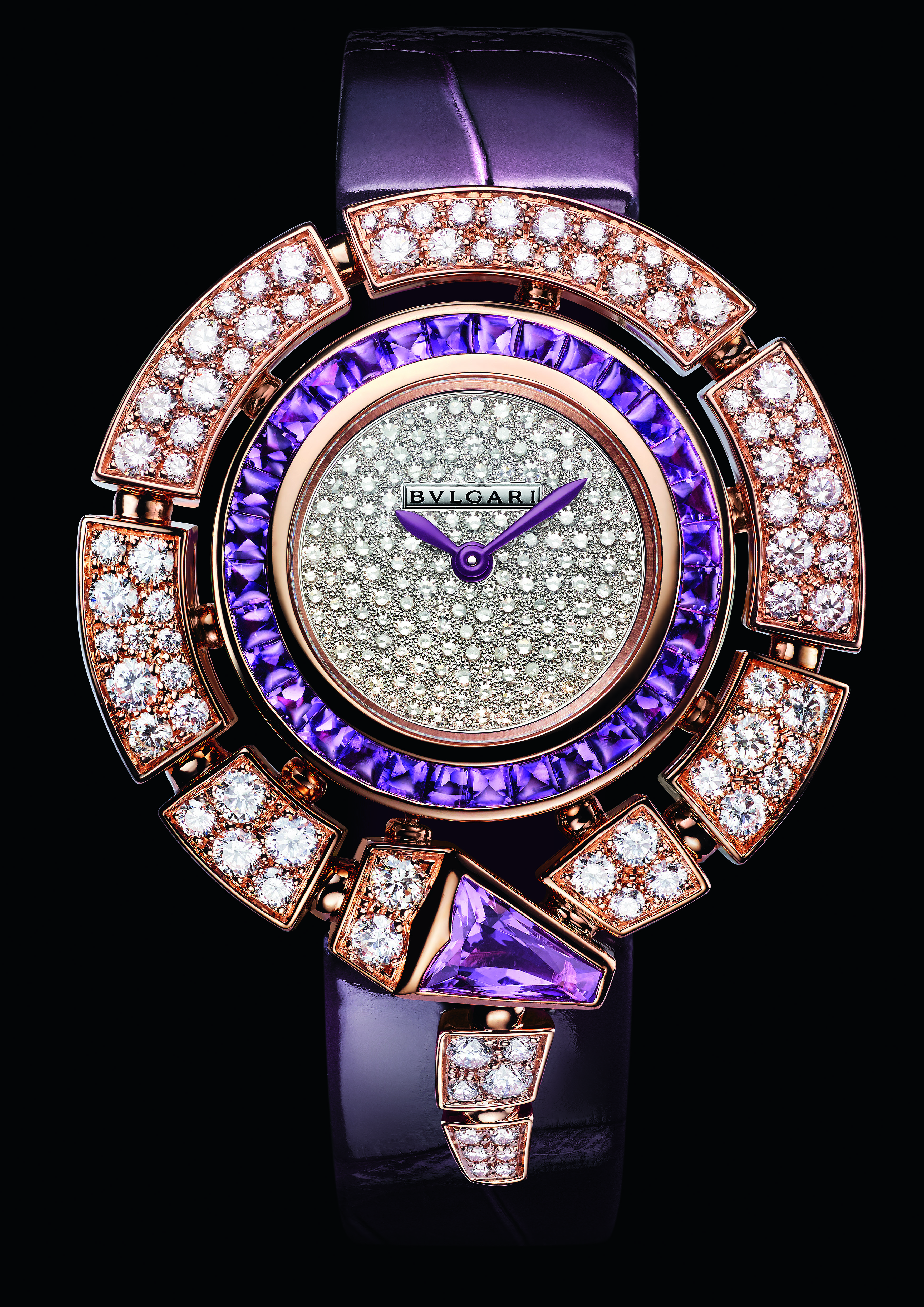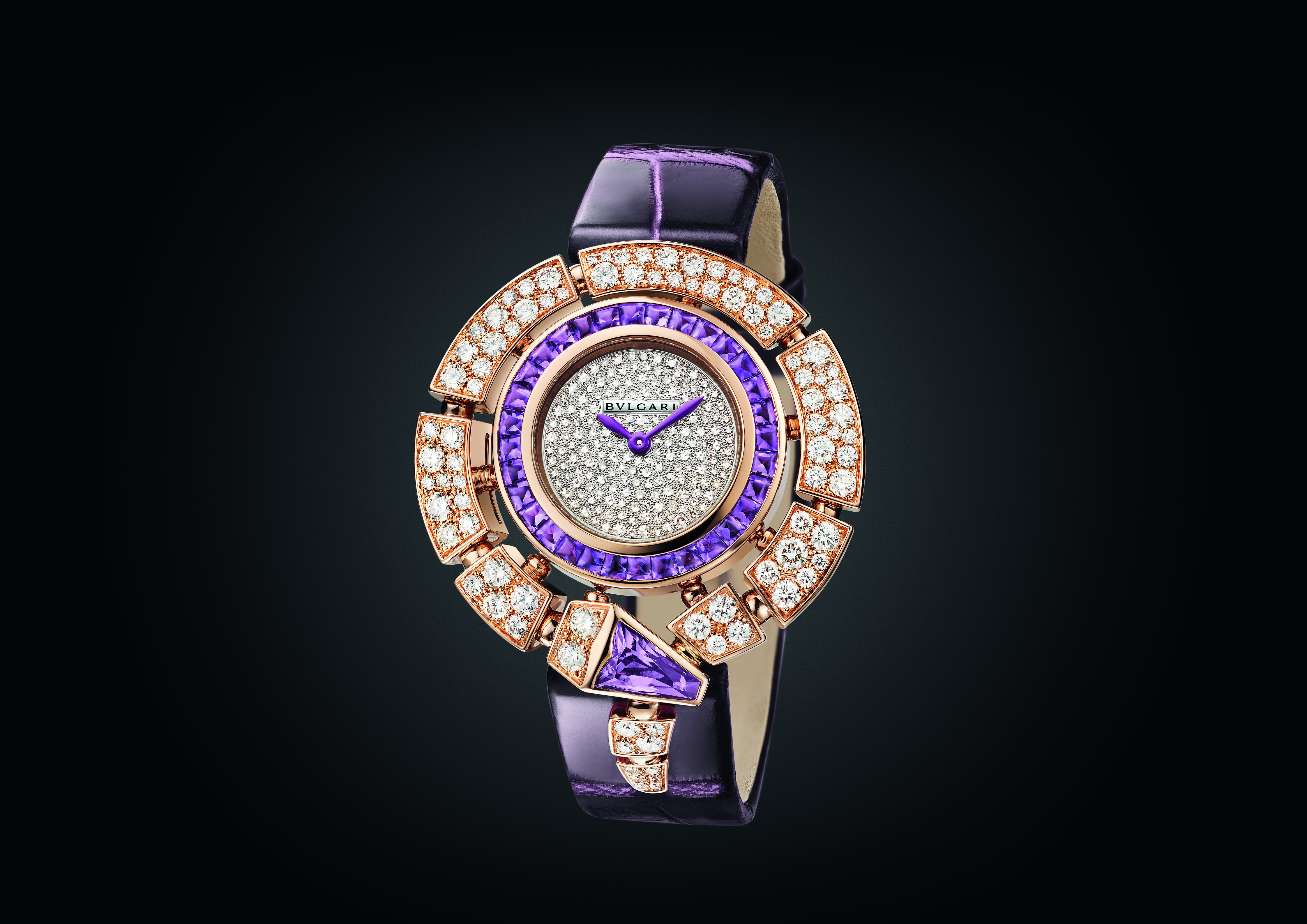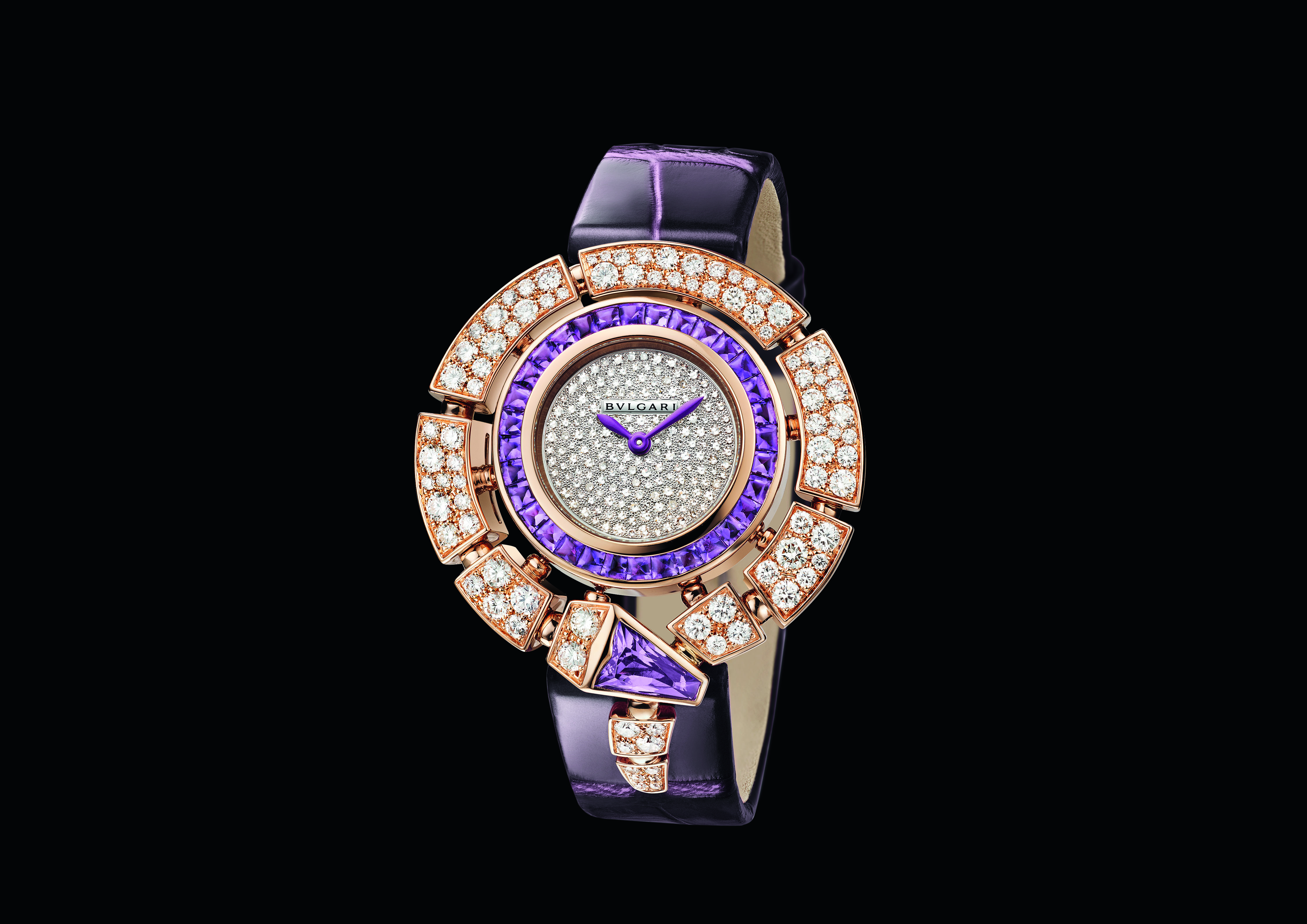 La Serpenti Incantati a été lancée en 2016. Sa nouvelle interprétation la dote d’un boîtier en or rose serti de diamants et de 33 améthystes pour un total de 2.45 carats. Le bracelet en alligator et les aiguilles sont également parées d’une teinte violette profonde et intense.