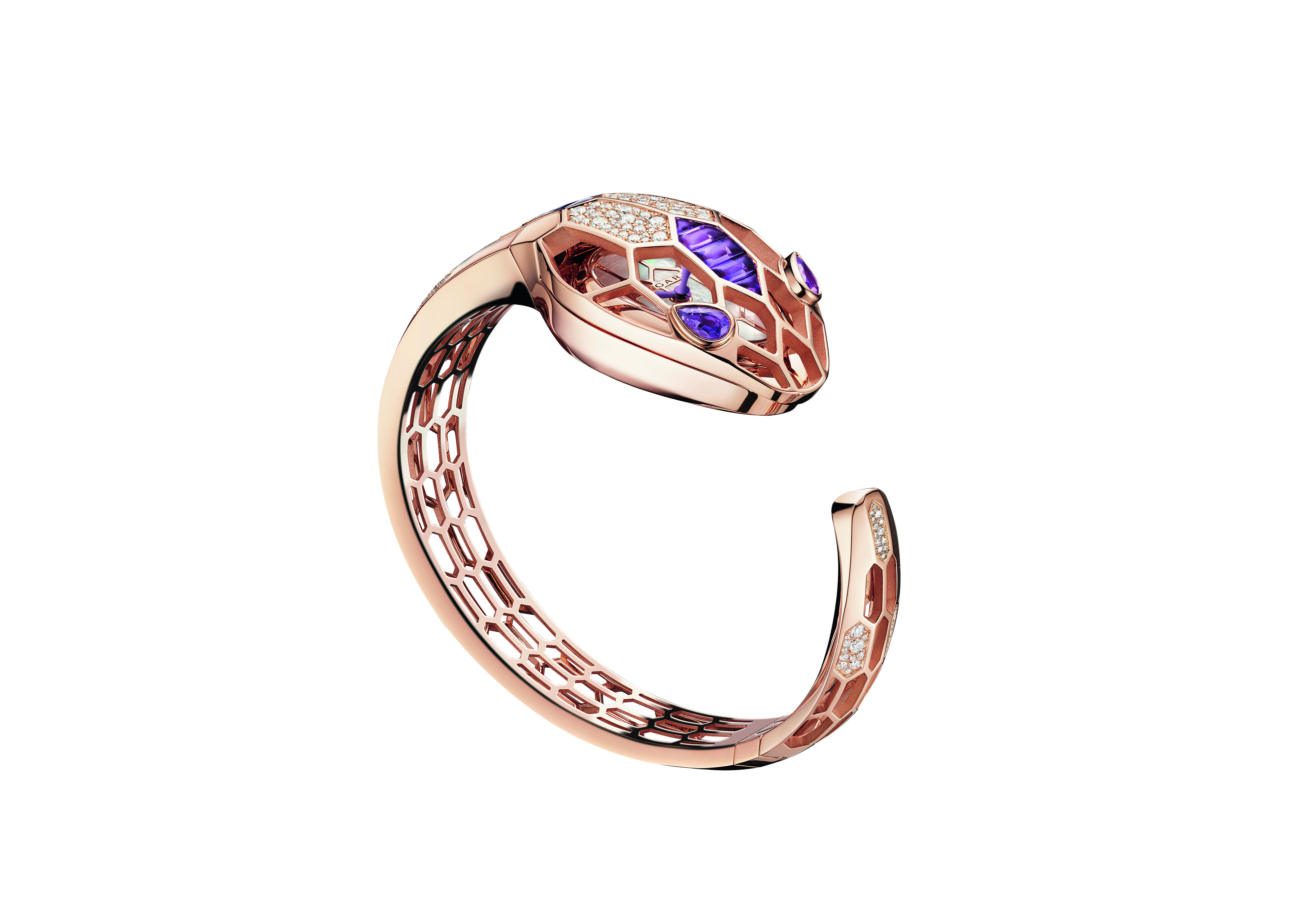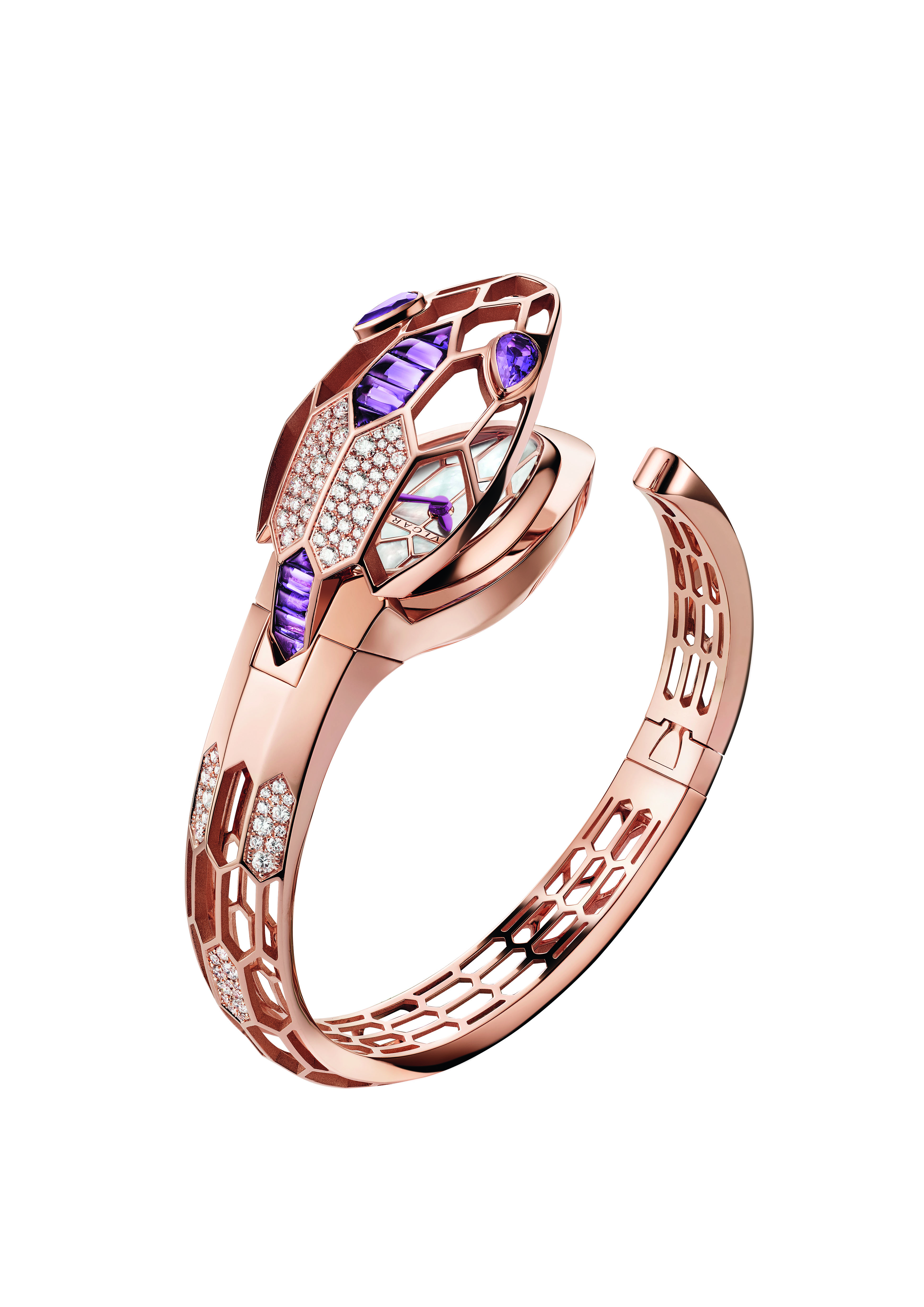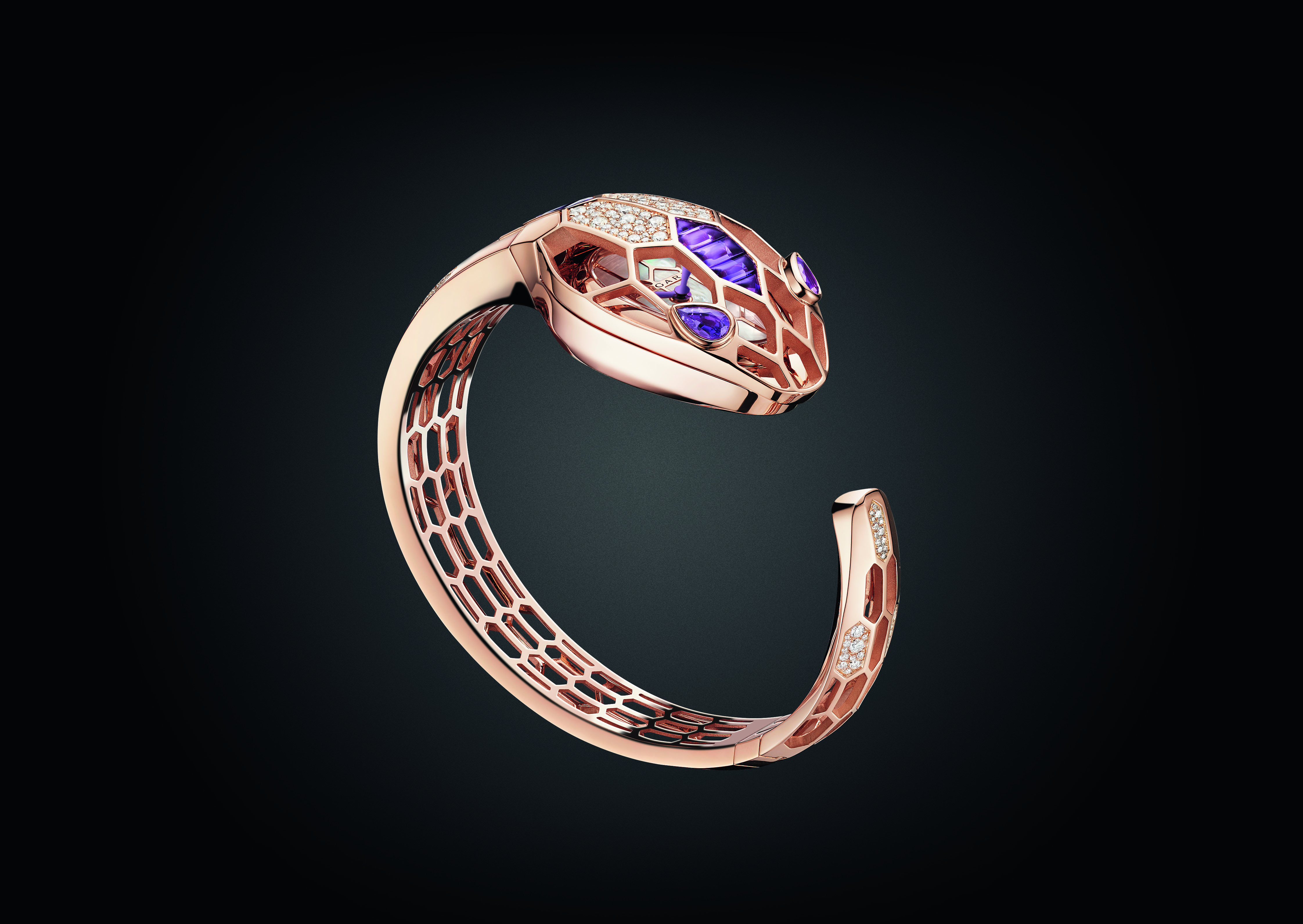 La Serpenti Misteriosi Bangle est apparue en 2016. L’édition limitée de cette année est sertie d’améthystes taille baguette pour rappeler les écailles du serpent, et d’améthystes taille poire pour les yeux.